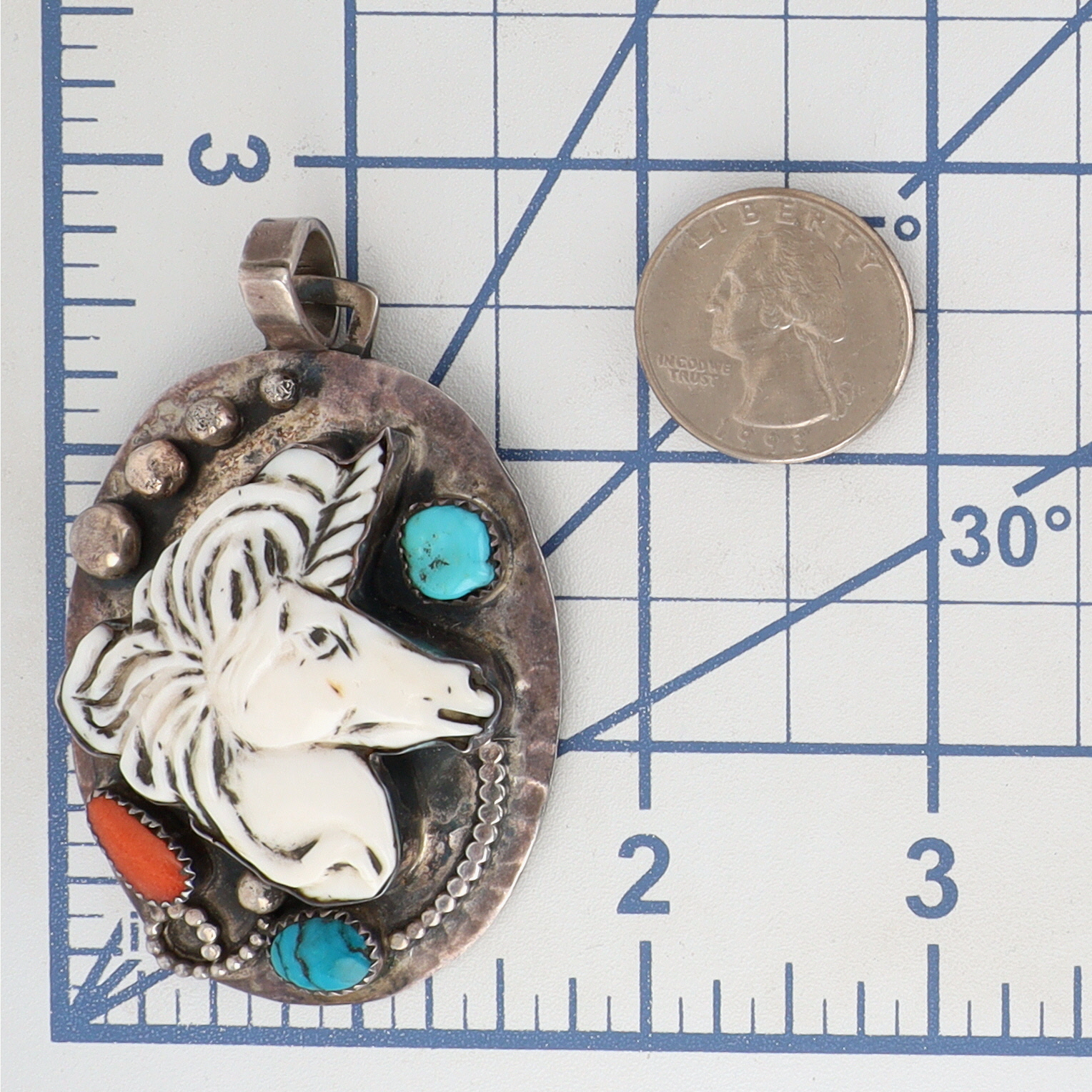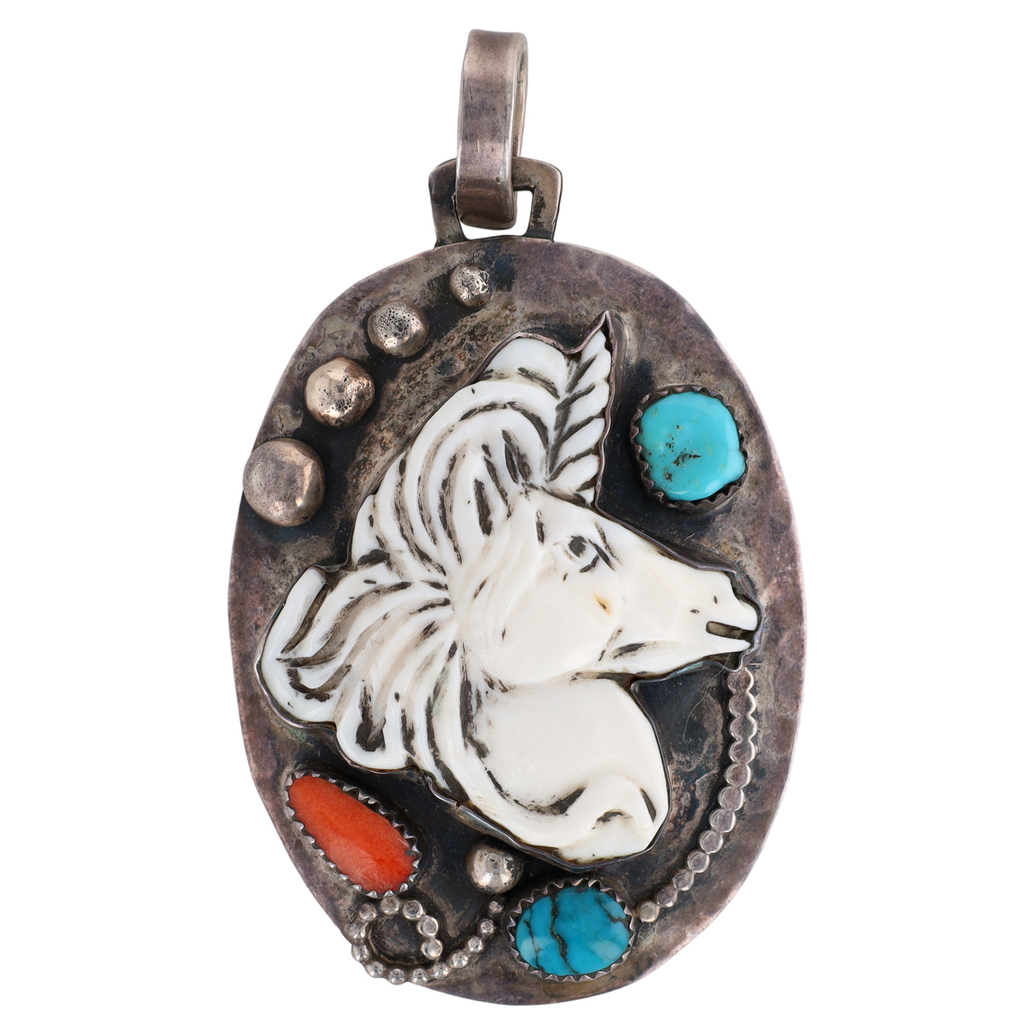 Unique, Big, Collectible! Francisco Gomez Sterling Carved Unicorn, Turquoise, & Coral Pendant – 28.9g / Made by Francisco Gomez, a Mexican lapidary artist and silversmith well known for his distinctive, detailed Native American inspired designs.