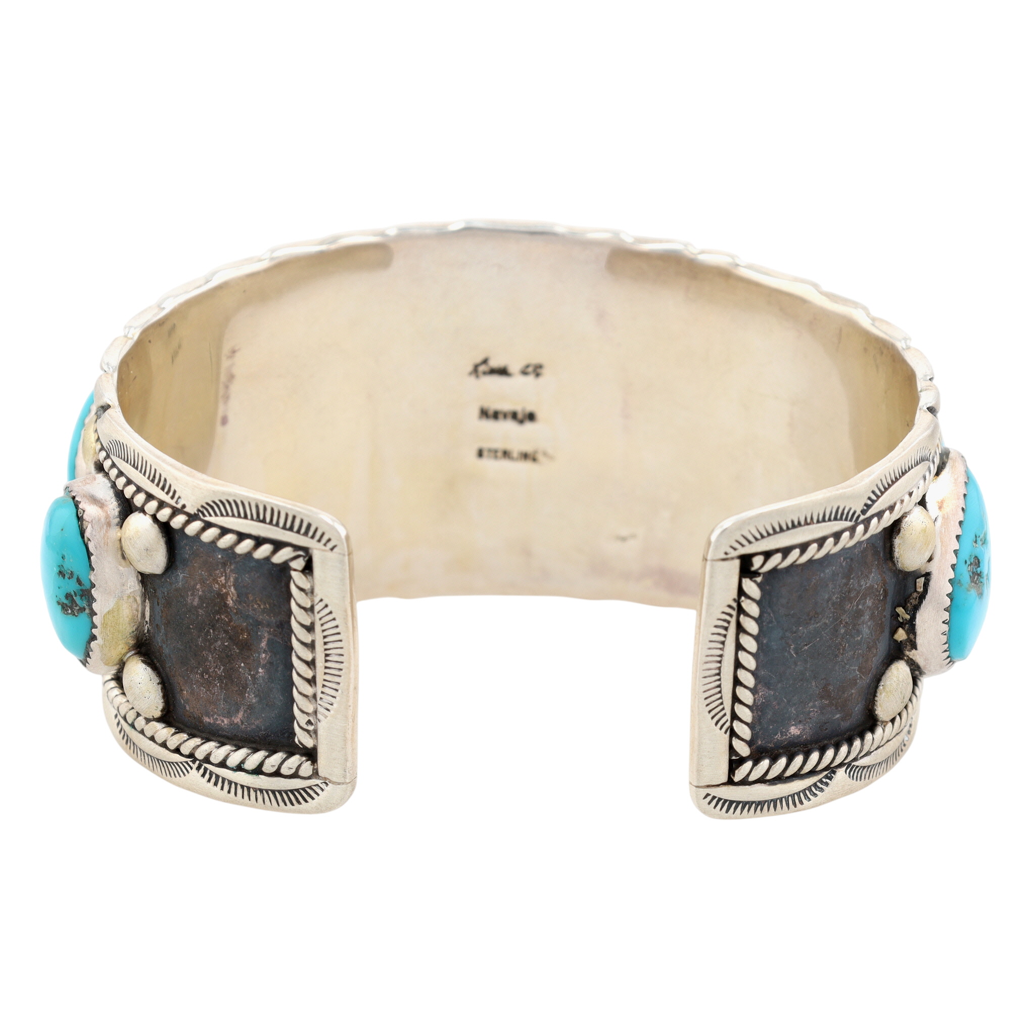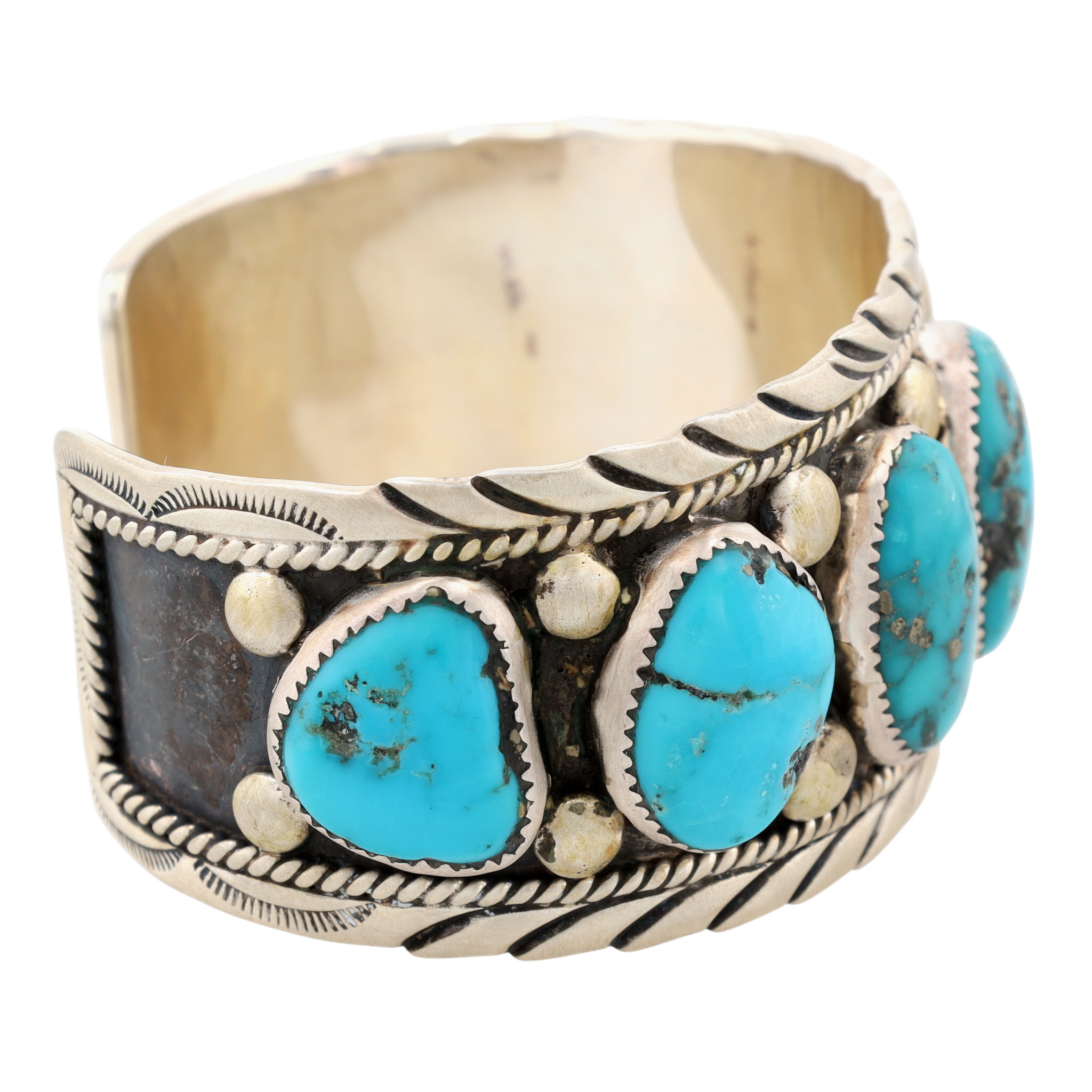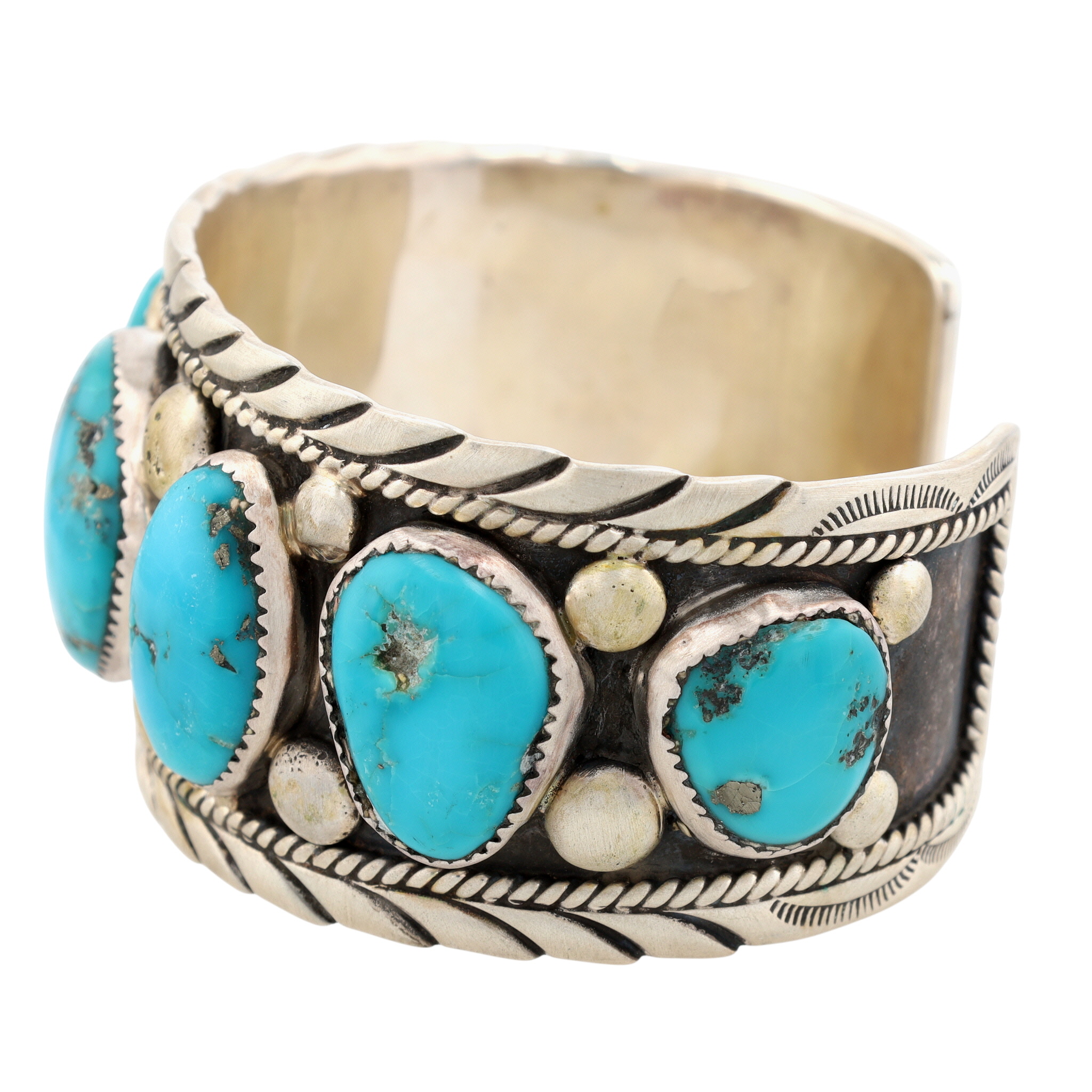 Charlene & Robert Little Navajo Sterling and Kingman Turquoise Chunk Stamped Wide Cuff Bracelet – 86.1g