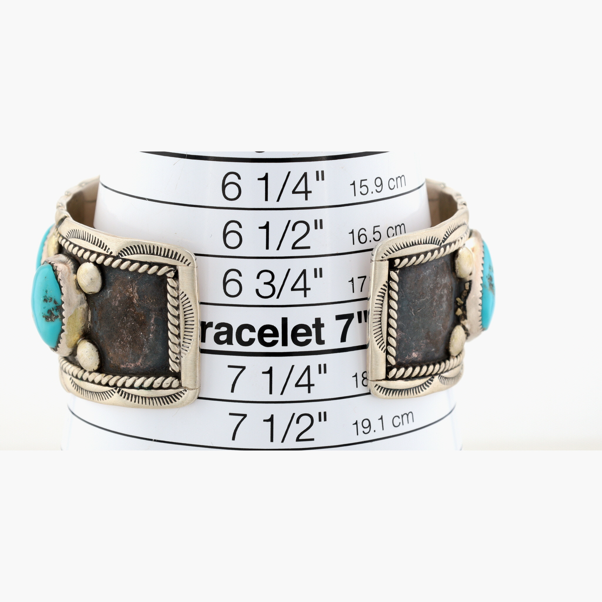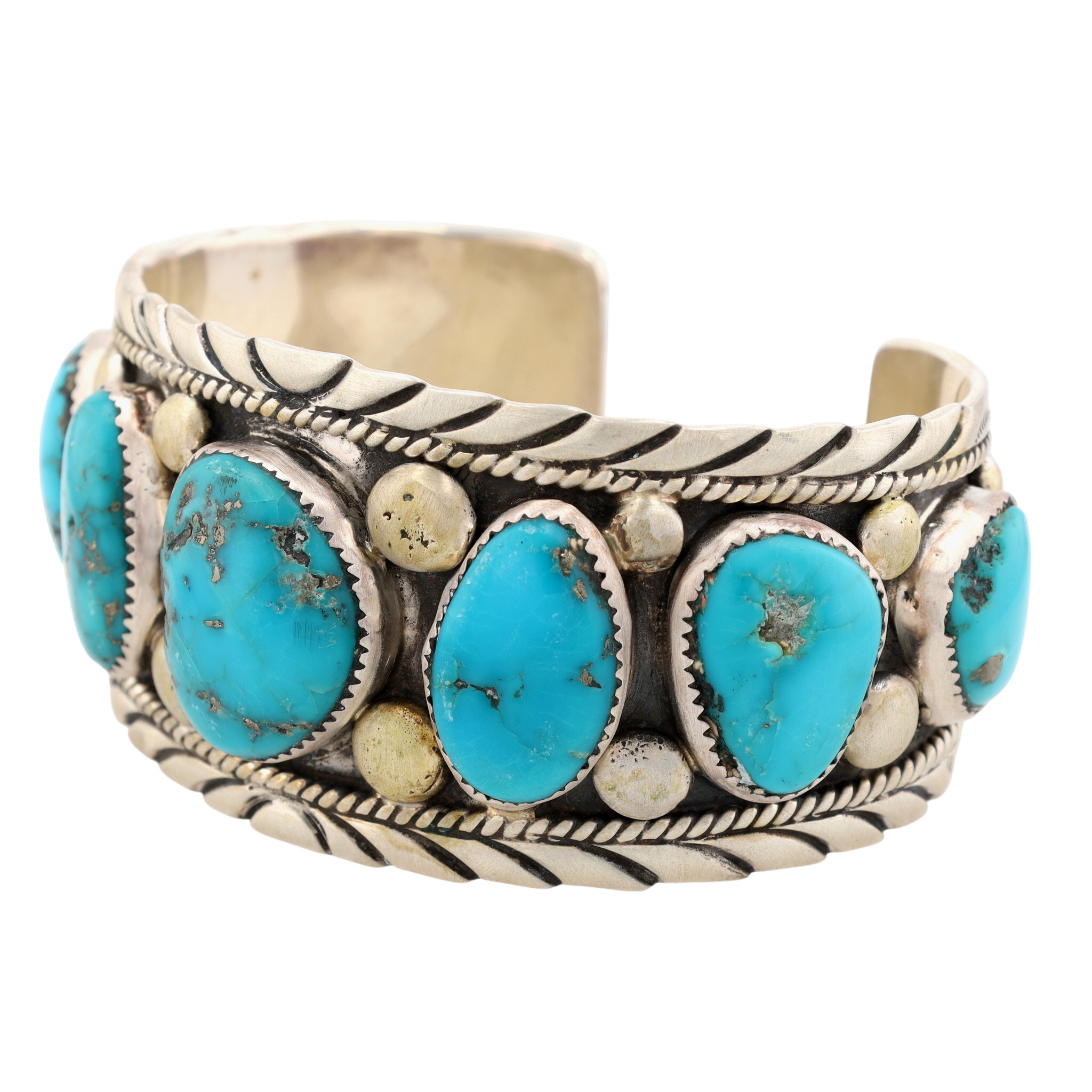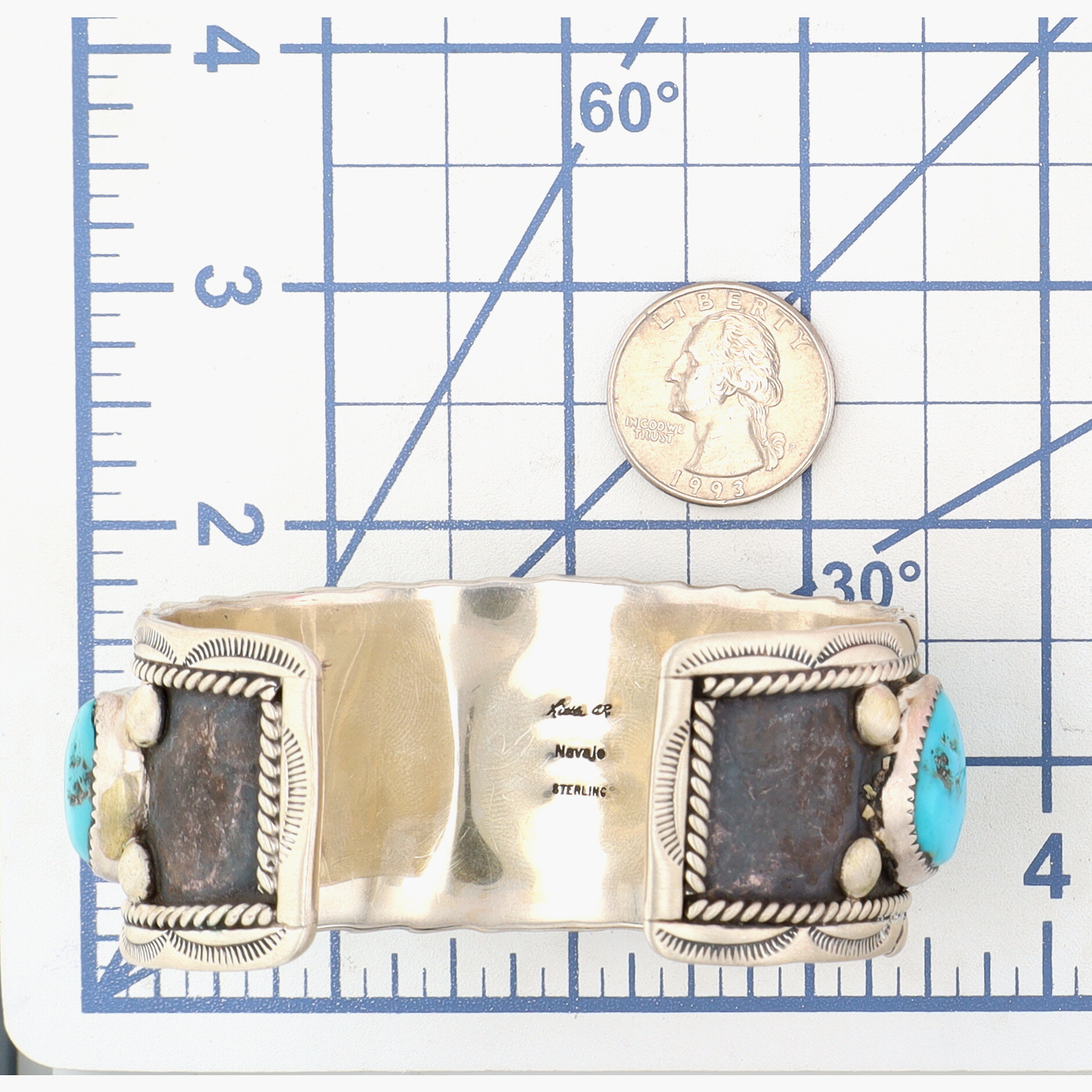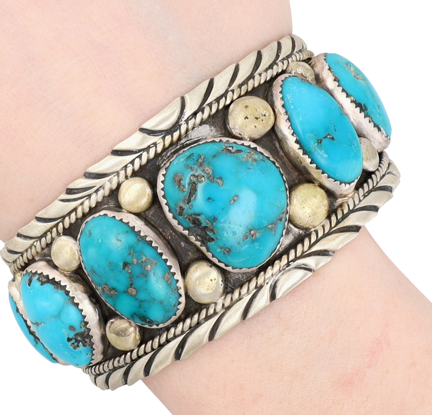 Charlene & Robert Little Navajo Sterling and Kingman Turquoise Chunk Stamped Wide Cuff Bracelet – 86.1g