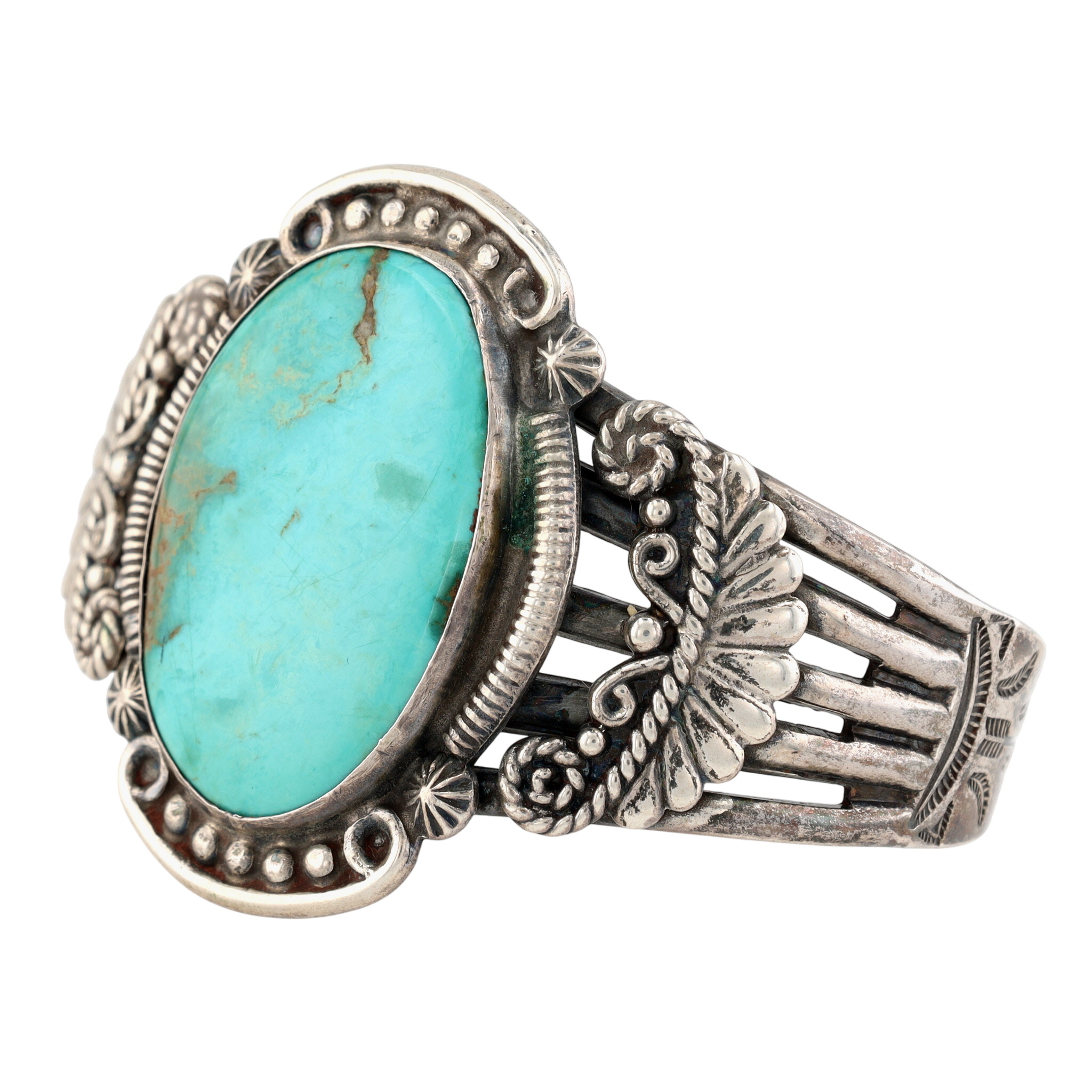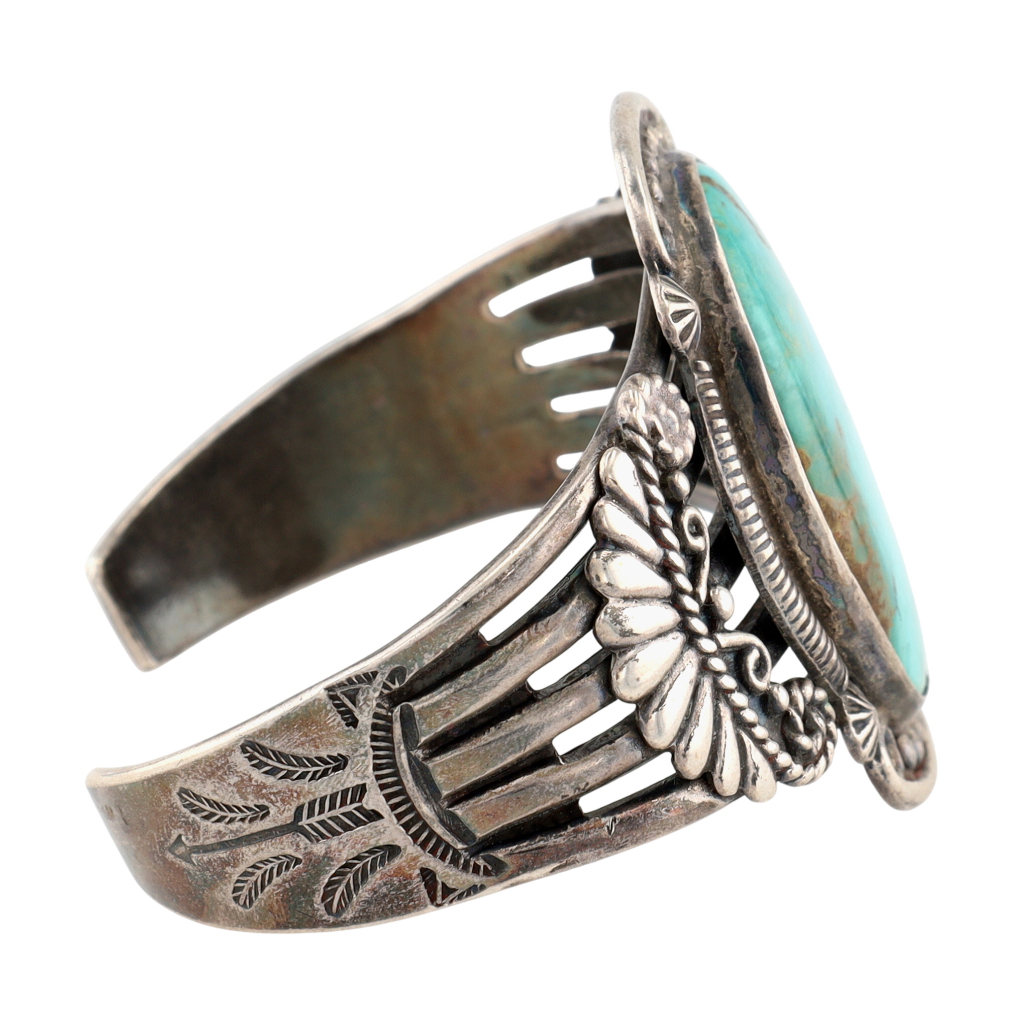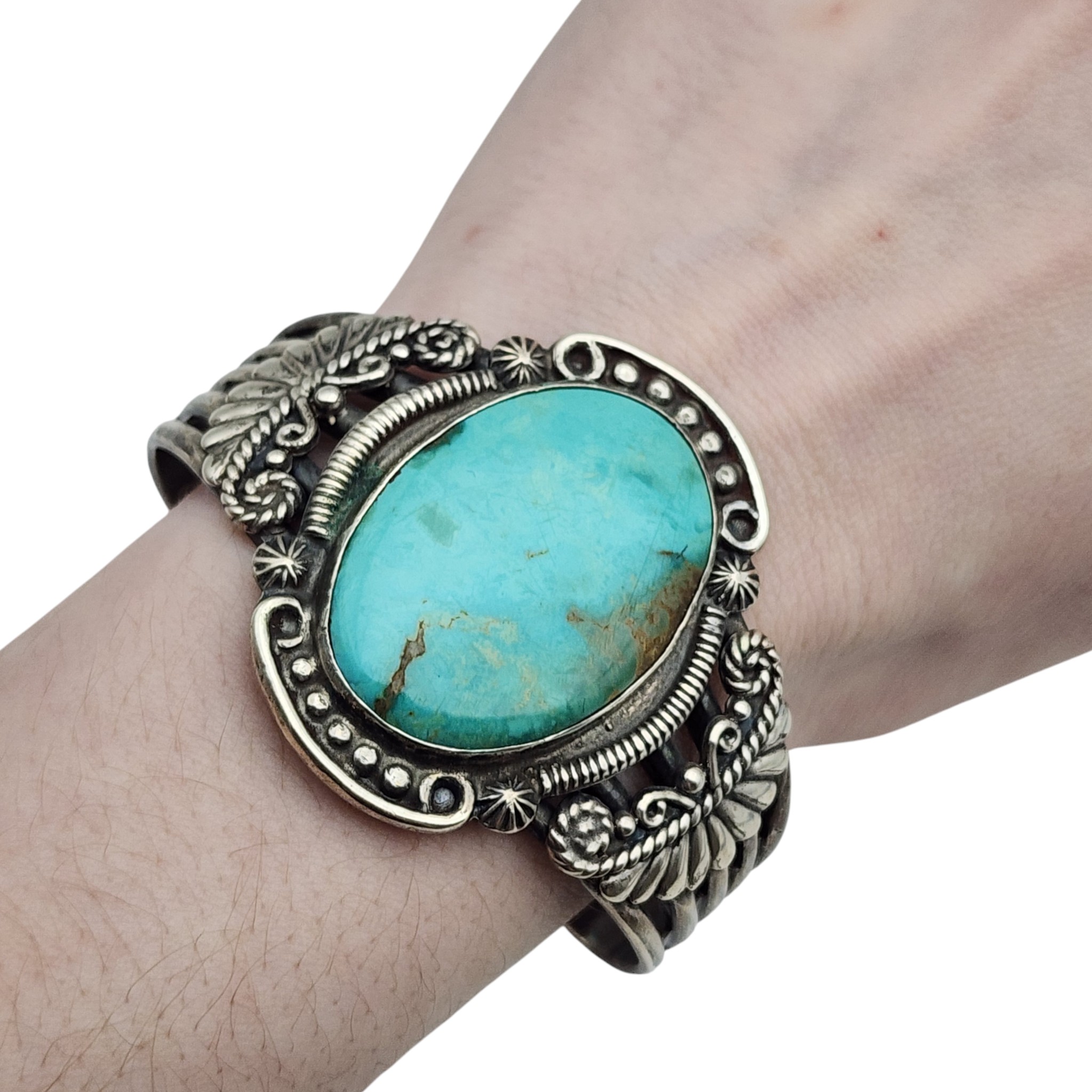 Vintage Navajo Sterling and Turquoise Stamped Cuff Bracelet – 52.4g – check out that fabulous turquoise!