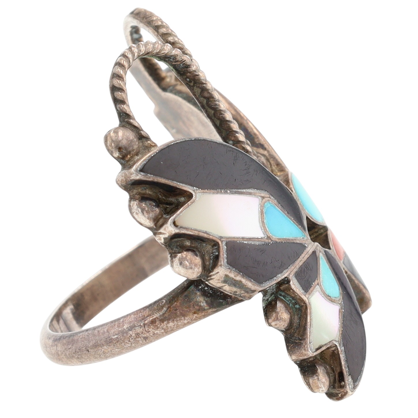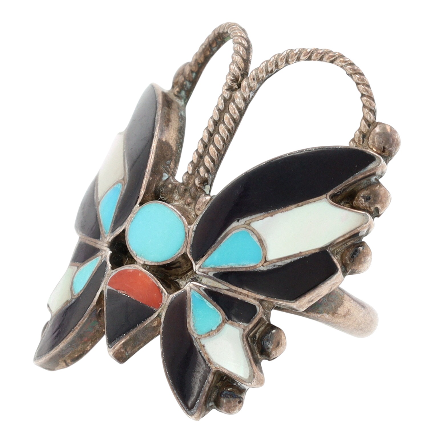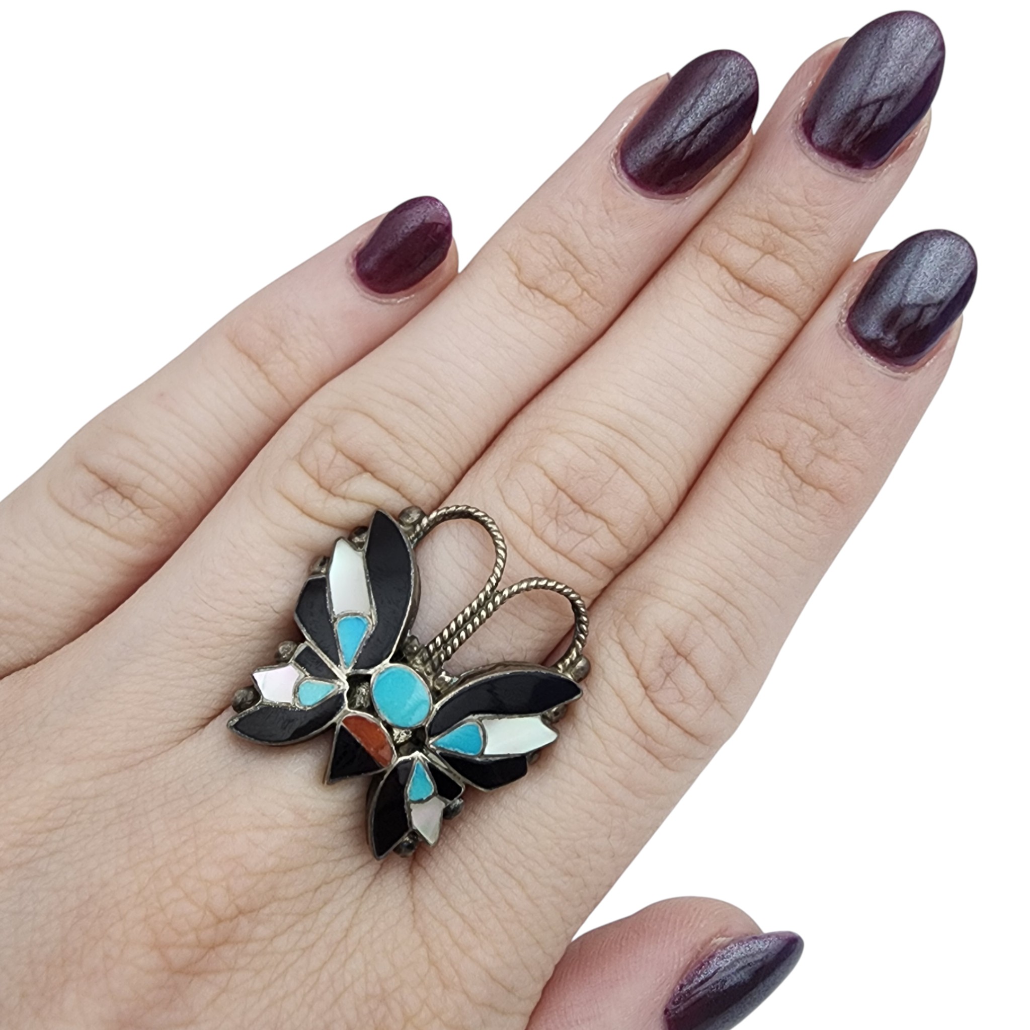 Rare Vintage Rosita Wallace Zuni Sterling Multistone (Turquoise, Coral, Jet/Onyx, Mother of Pearl) Inlay Butterfly Ring Sz 7 – 6.3g