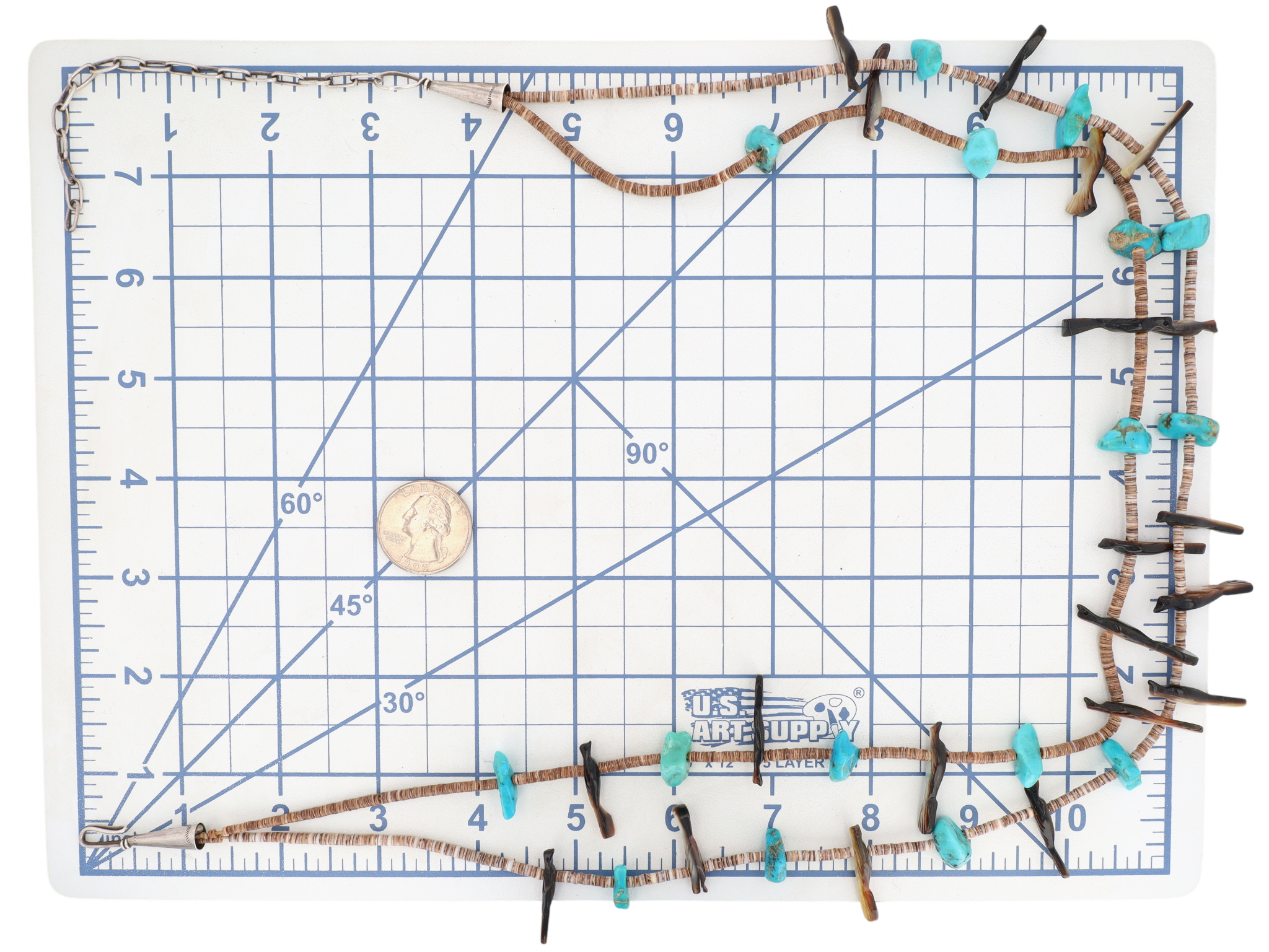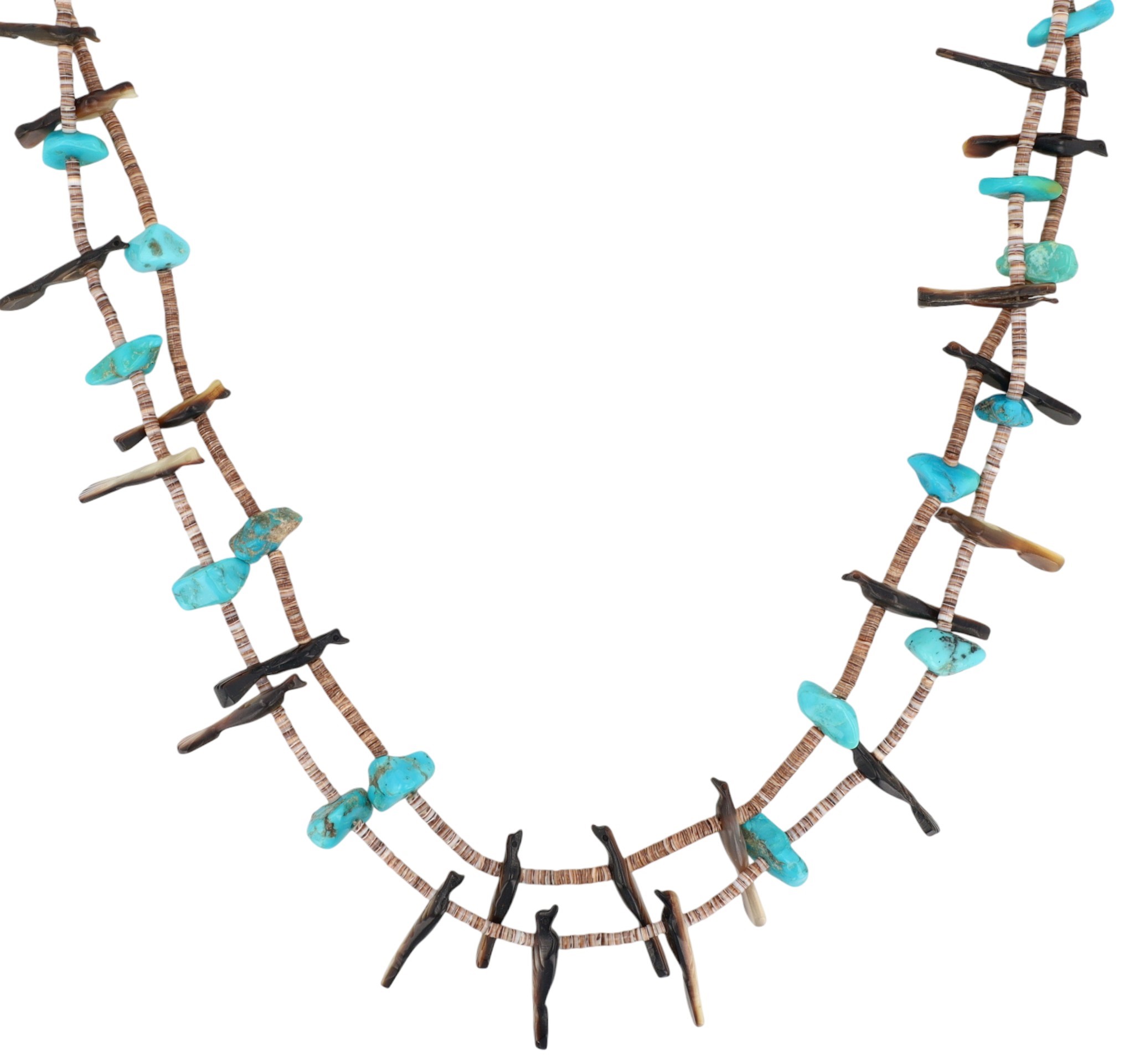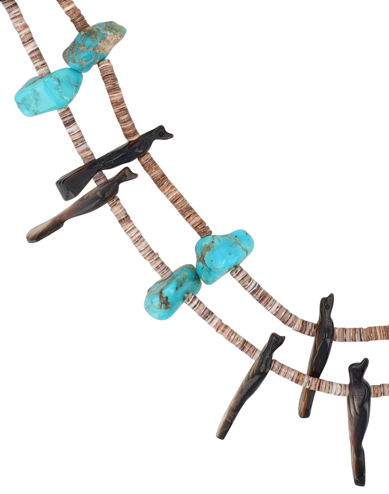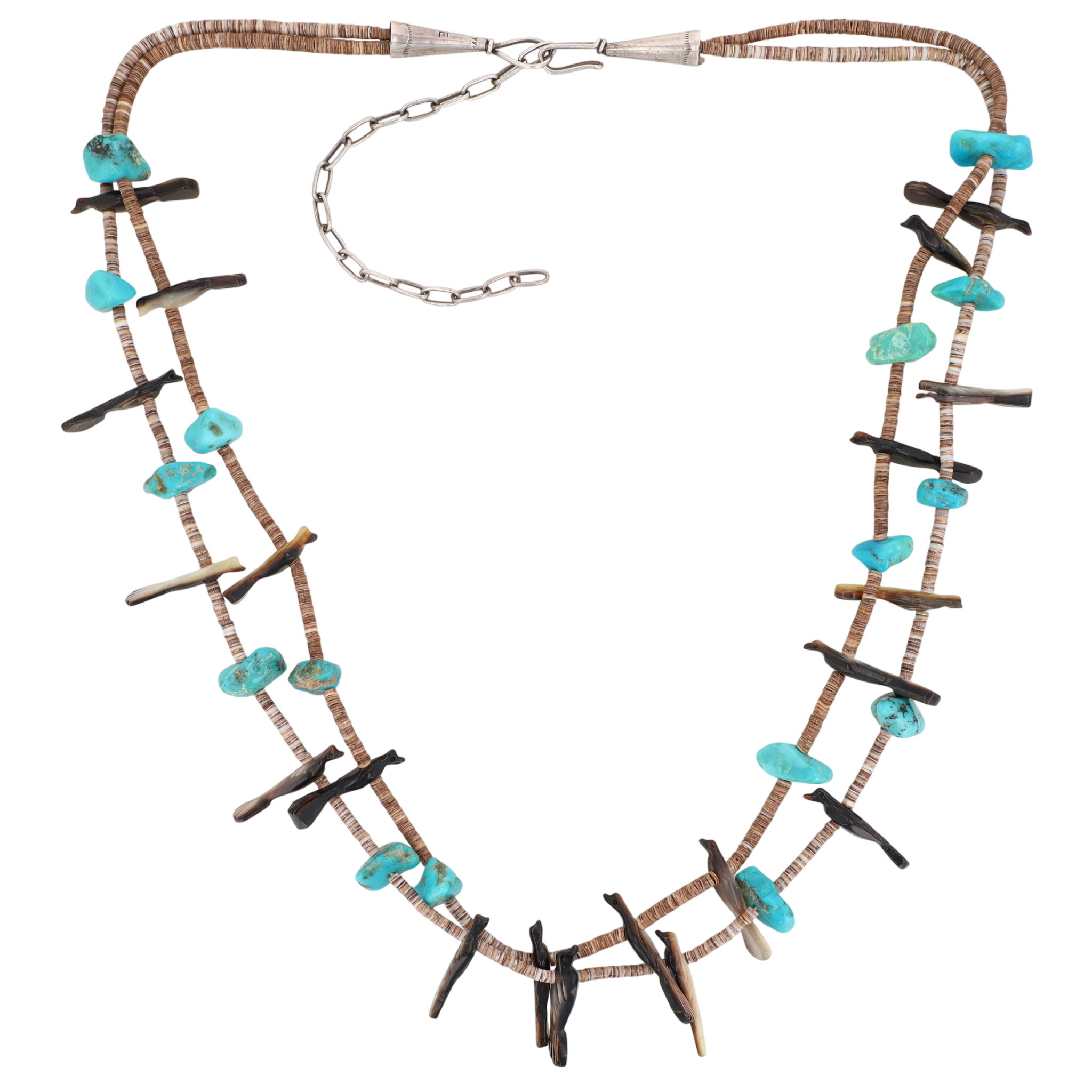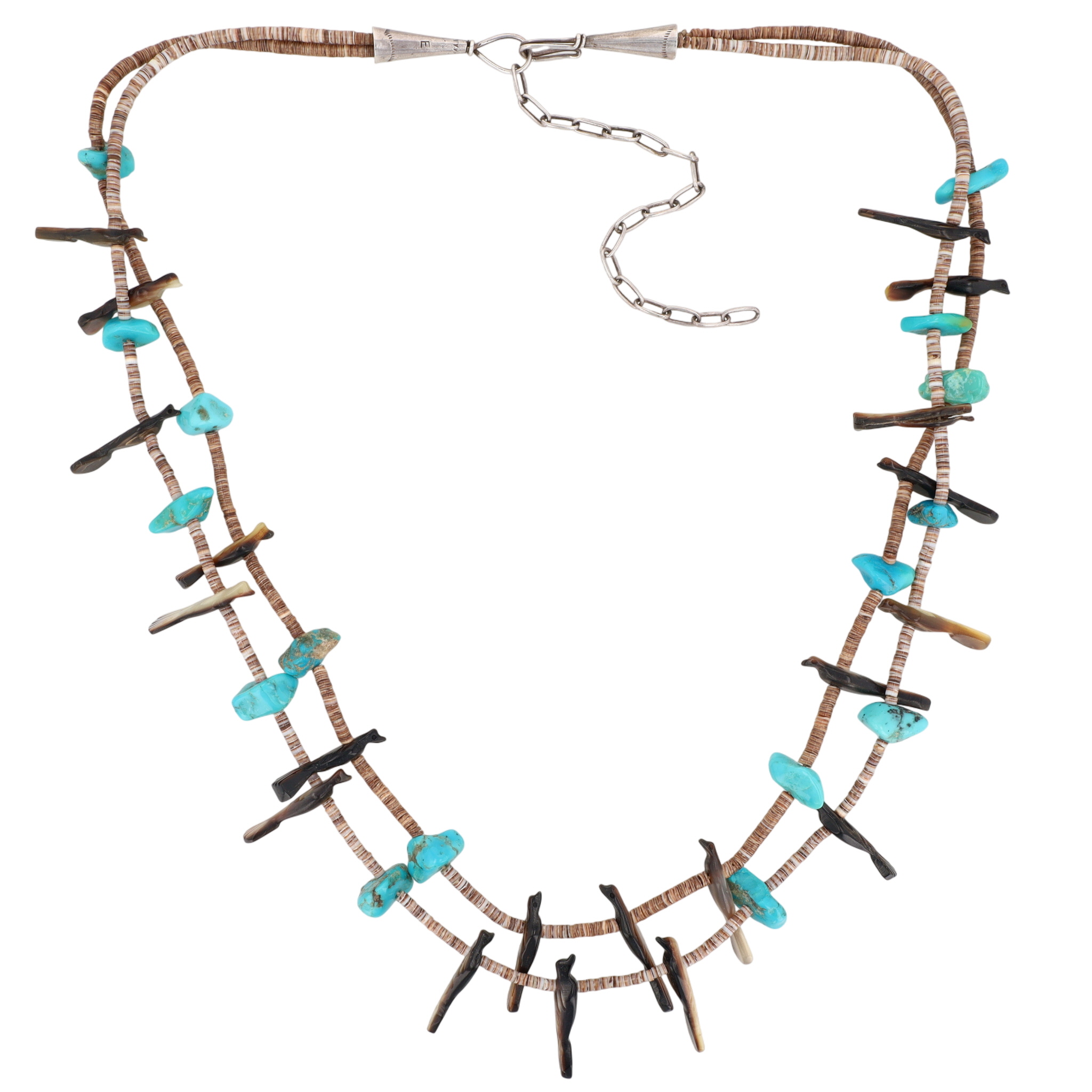 Signed Santo Domingo Kewa Vintage Sterling Cones and Carved Bird, Turquoise and Shell Heishi 2-Strand Necklace – 51g – approx. 24″ + 4.75″ extension (28.75″) – beautiful piece!