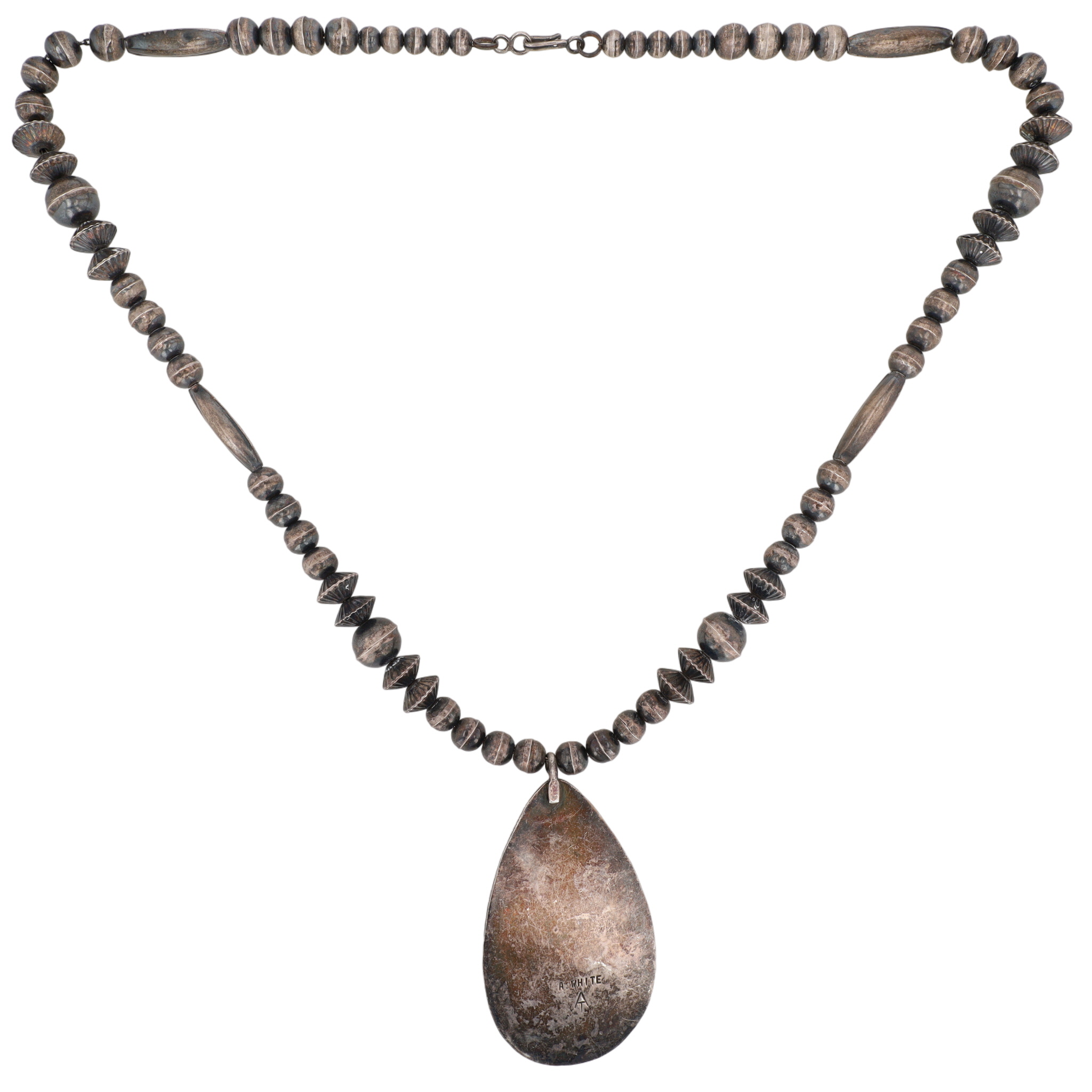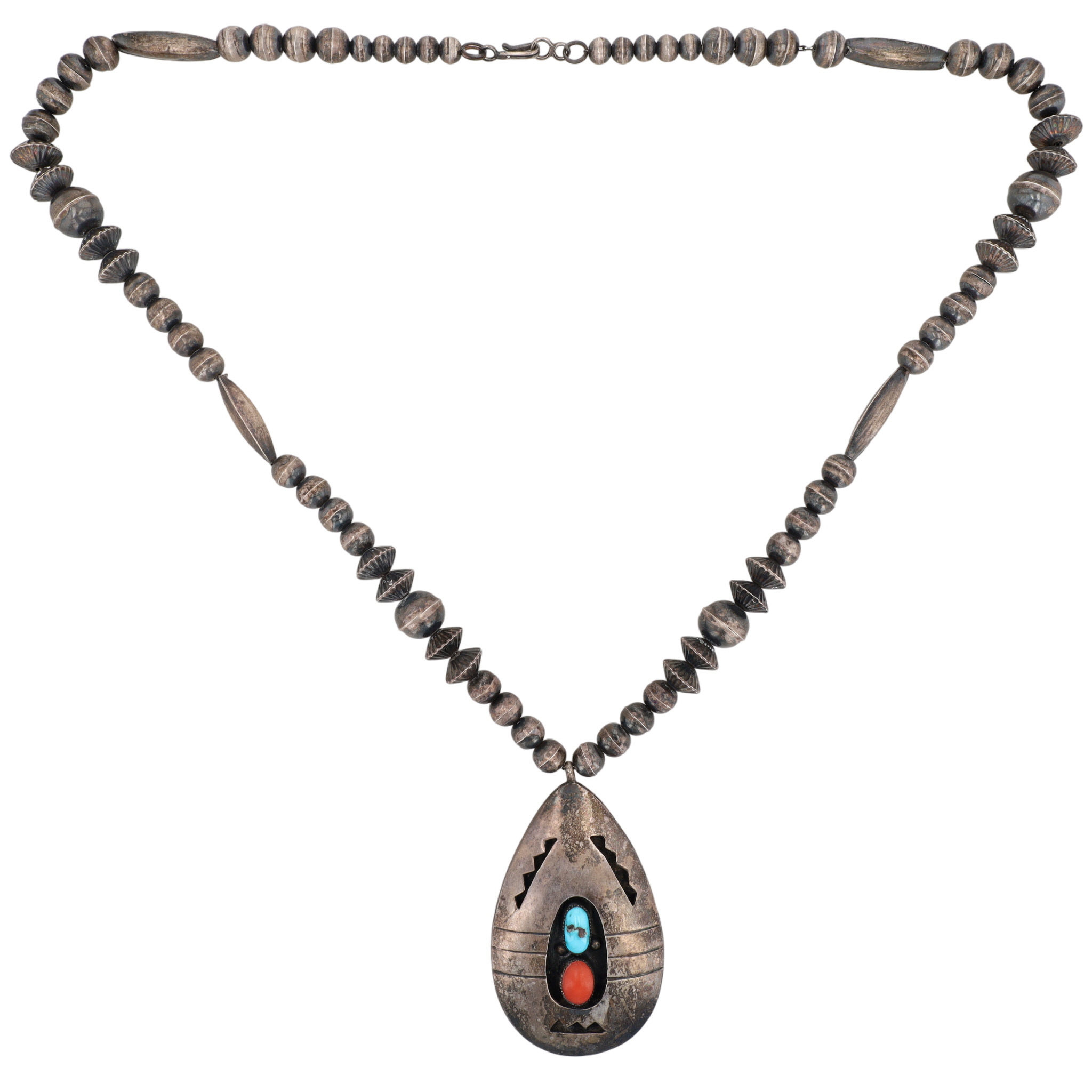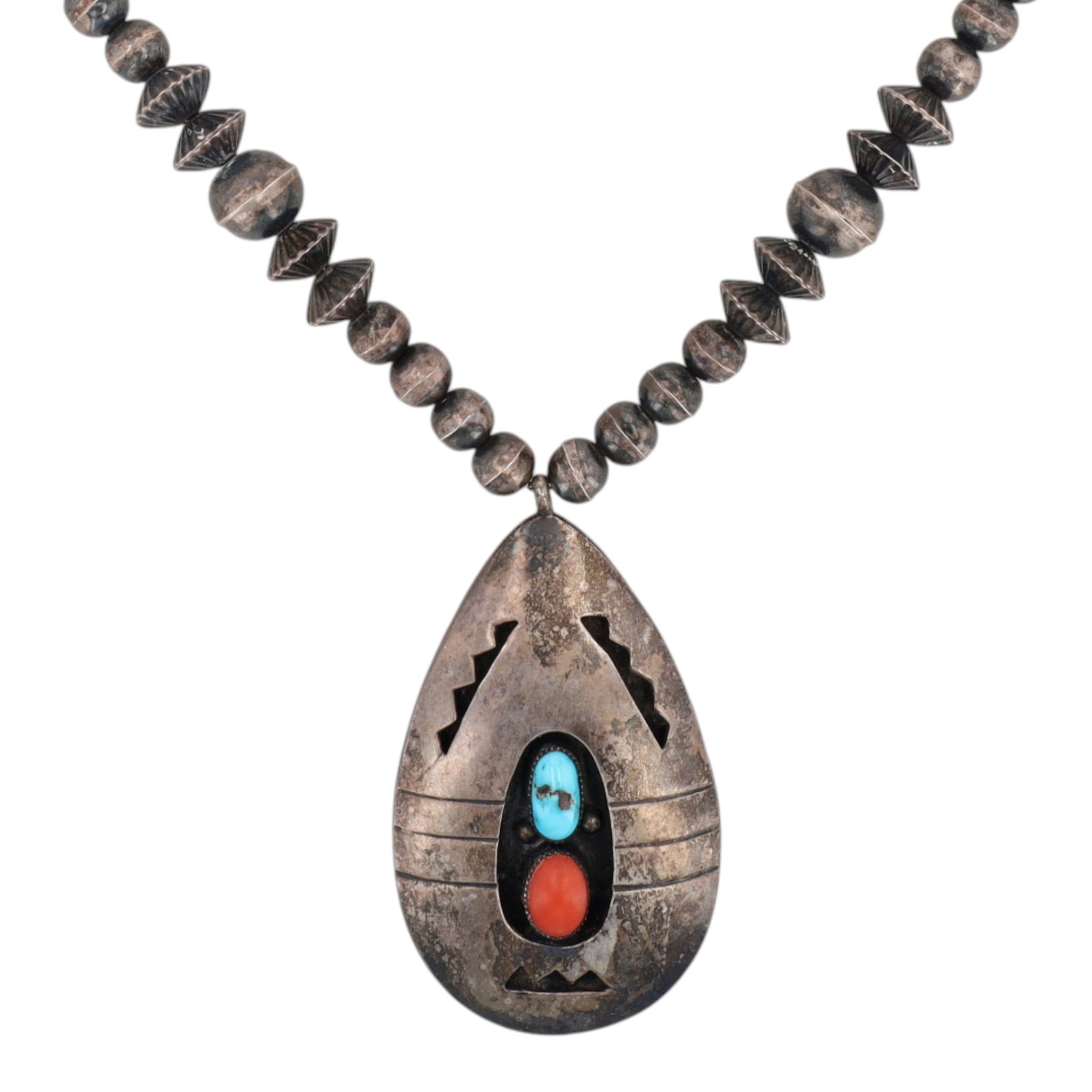 Vintage Alice White Navajo for Atkinson Trading Co. Sterling Turquoise and Coral Handmade Shadowbox Bead Necklace – 78.1g – Approx. Length: 26″ – some of the beads have wear, dimples consistent with age and use.