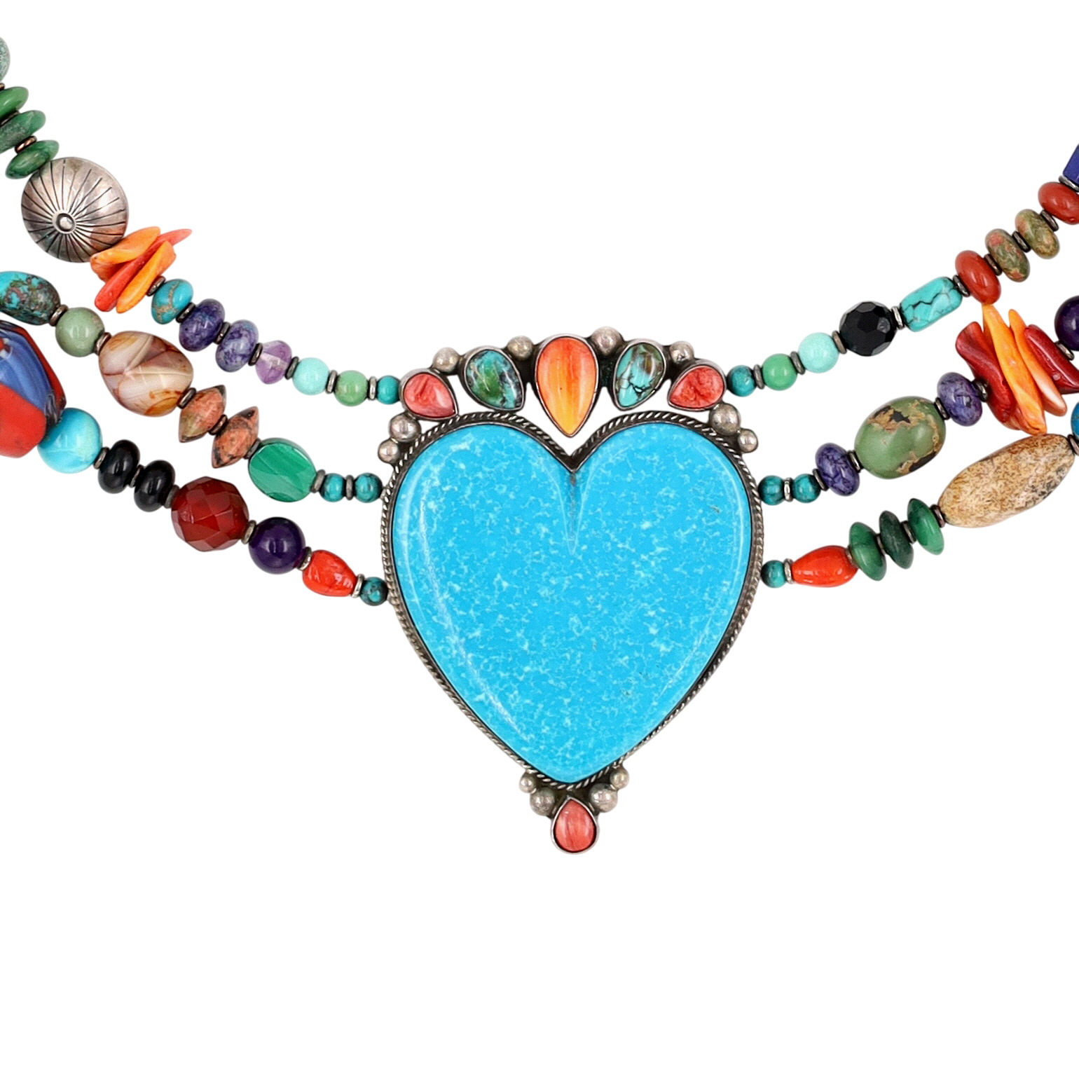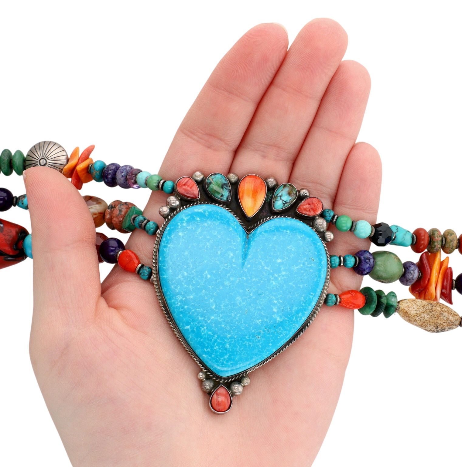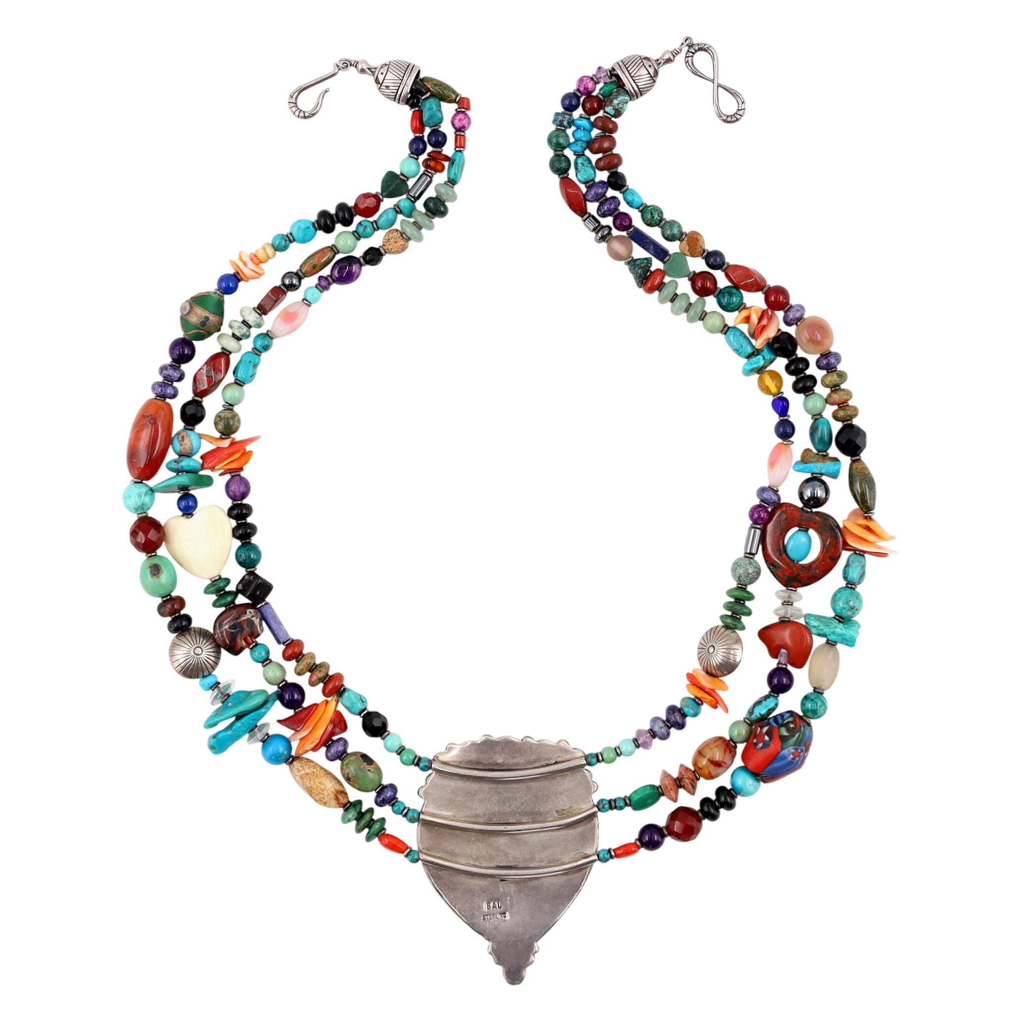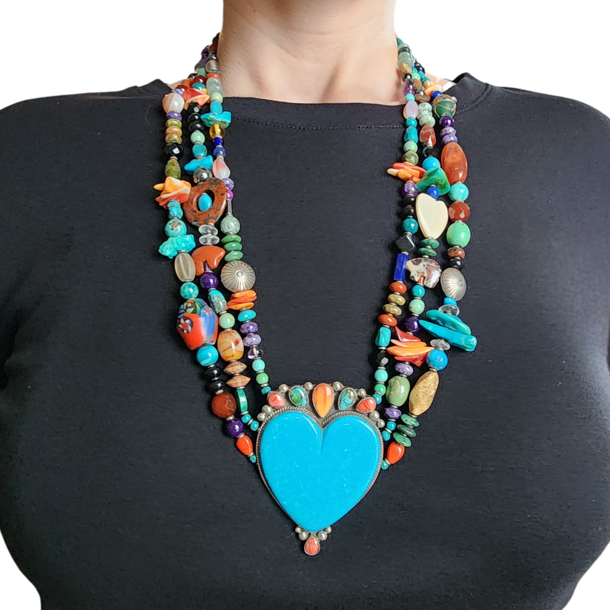 Unique, one-of-a-kind – Huge Betty Ann Lee Navajo Sterling Multistone Heart Necklace – 238g! – approx. 27.5″ end to end, center piece is 2.9″ tall x 2.1″ wide / This is a fabulous necklace with so many different materials including turquoise, spiny oyster, coral, spiny oyster, amethyst, jasper, malachite, charoite, sugilite, unakite, carnelian, amber, jade, lapis lazuli, sodalite, hematite, onyx, glass, agate, and much more!! So many amazing shapes, colors, textures – don’t miss out on this unique piece! A showstopper!