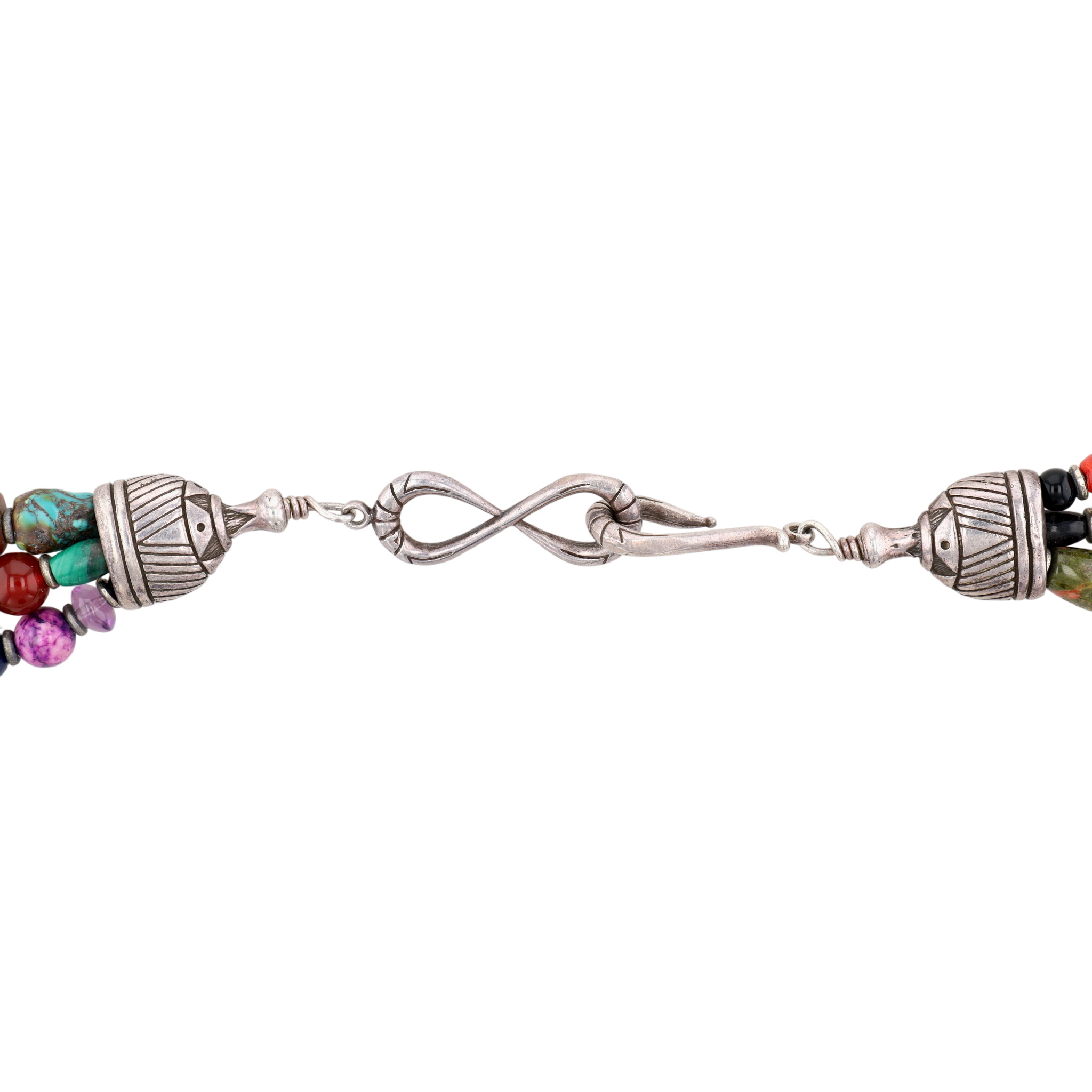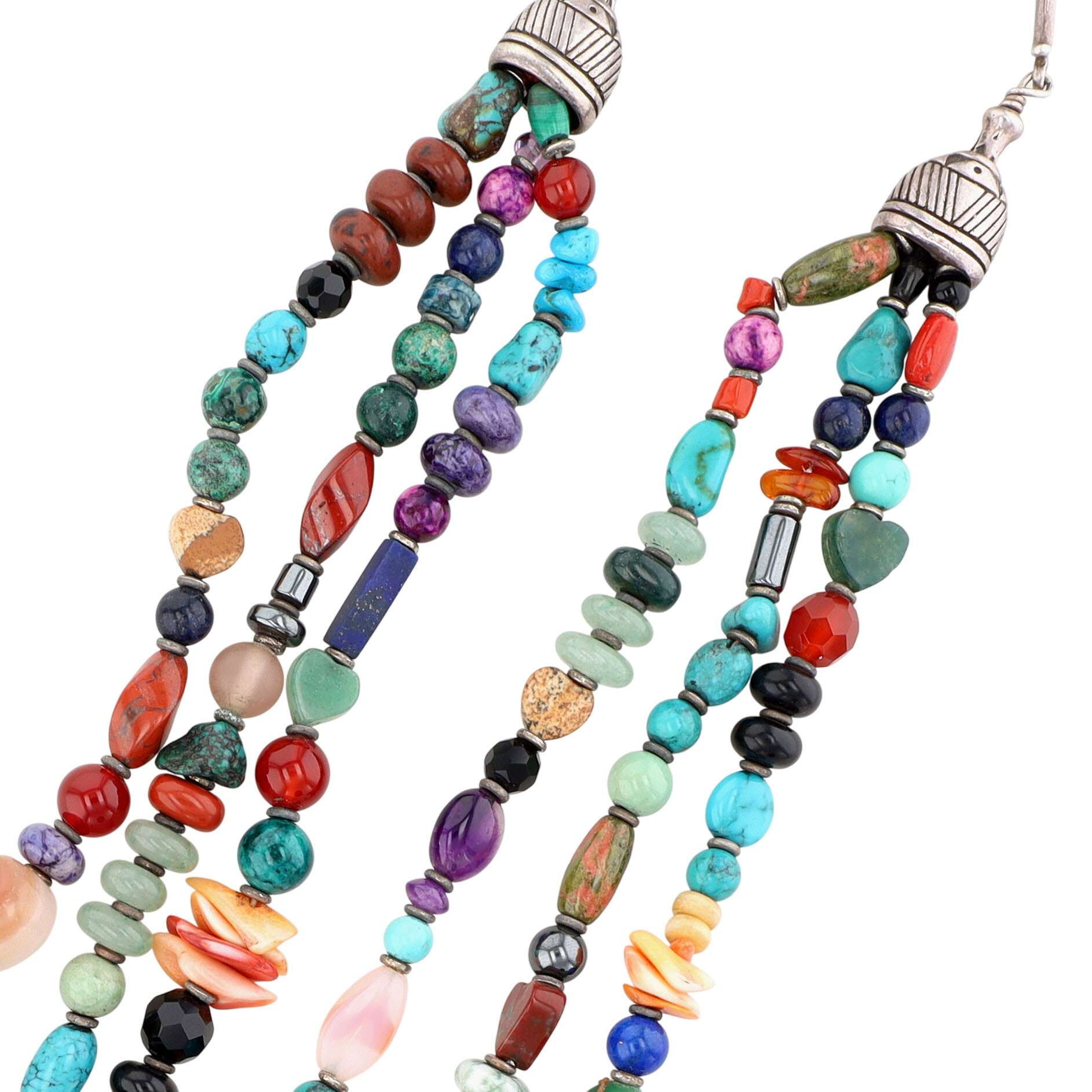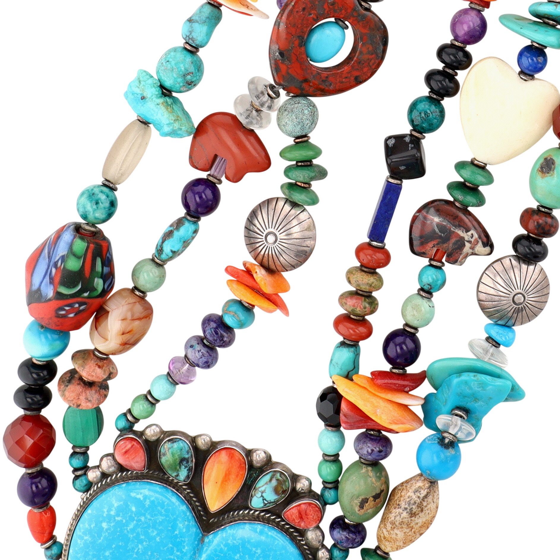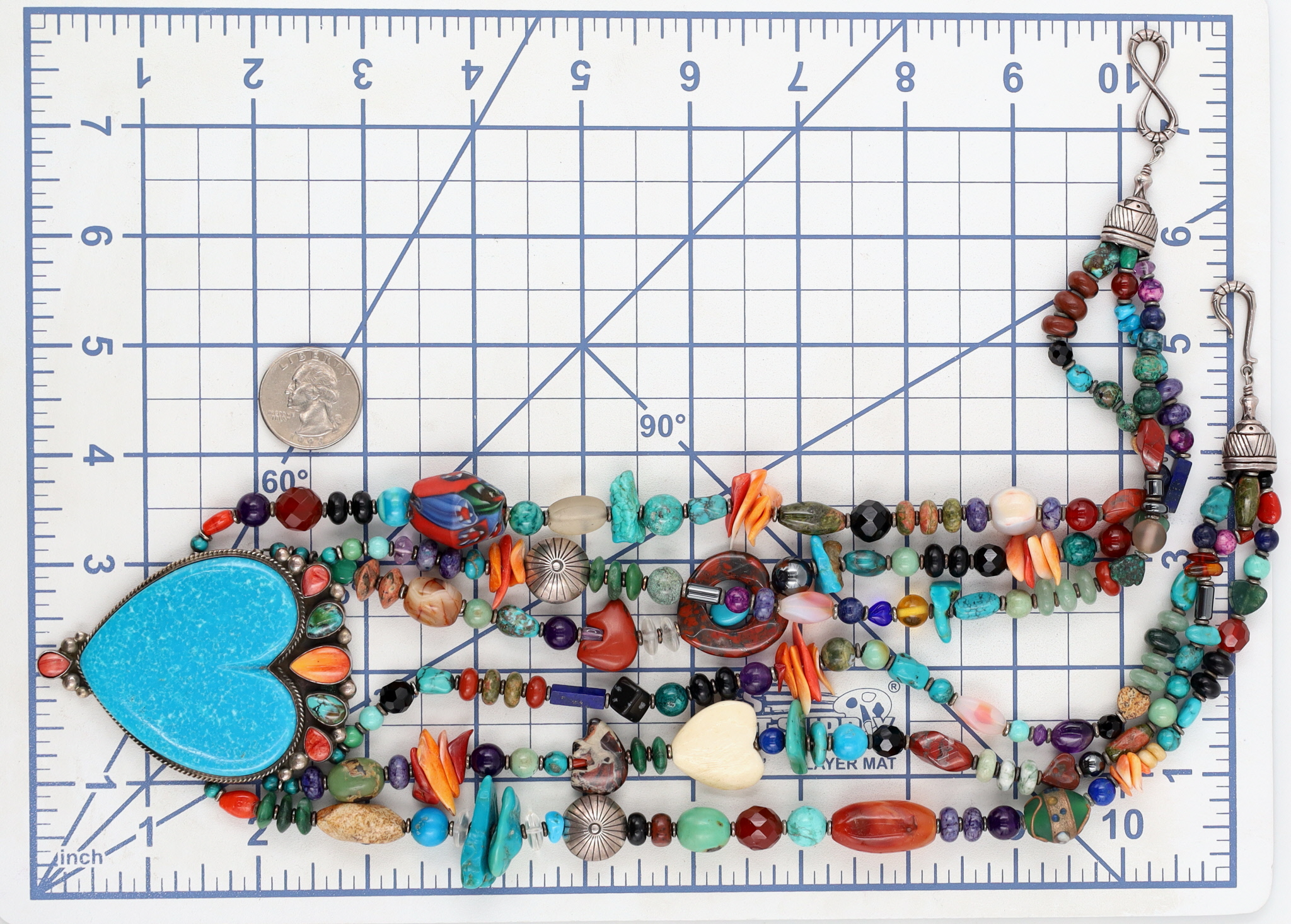 Unique, one-of-a-kind – Huge Betty Ann Lee Navajo Sterling Multistone Heart Necklace – 238g! – approx. 27.5″ end to end, center piece is 2.9″ tall x 2.1″ wide / This is a fabulous necklace with so many different materials including turquoise, spiny oyster, coral, spiny oyster, amethyst, jasper, malachite, charoite, sugilite, unakite, carnelian, amber, jade, lapis lazuli, sodalite, hematite, onyx, glass, agate, and much more!! So many amazing shapes, colors, textures – don’t miss out on this unique piece! A showstopper!