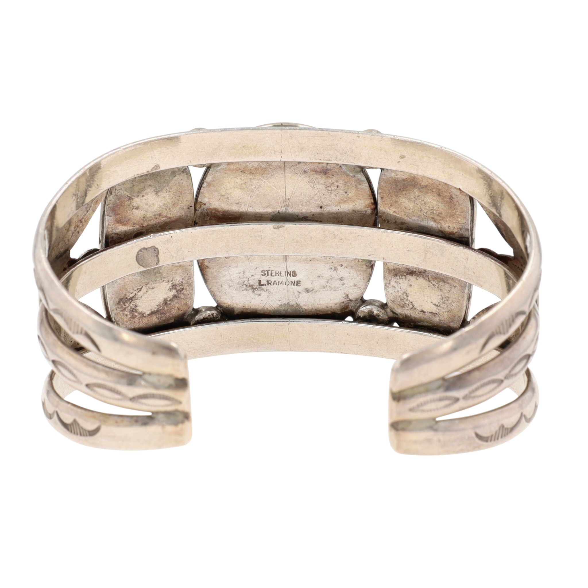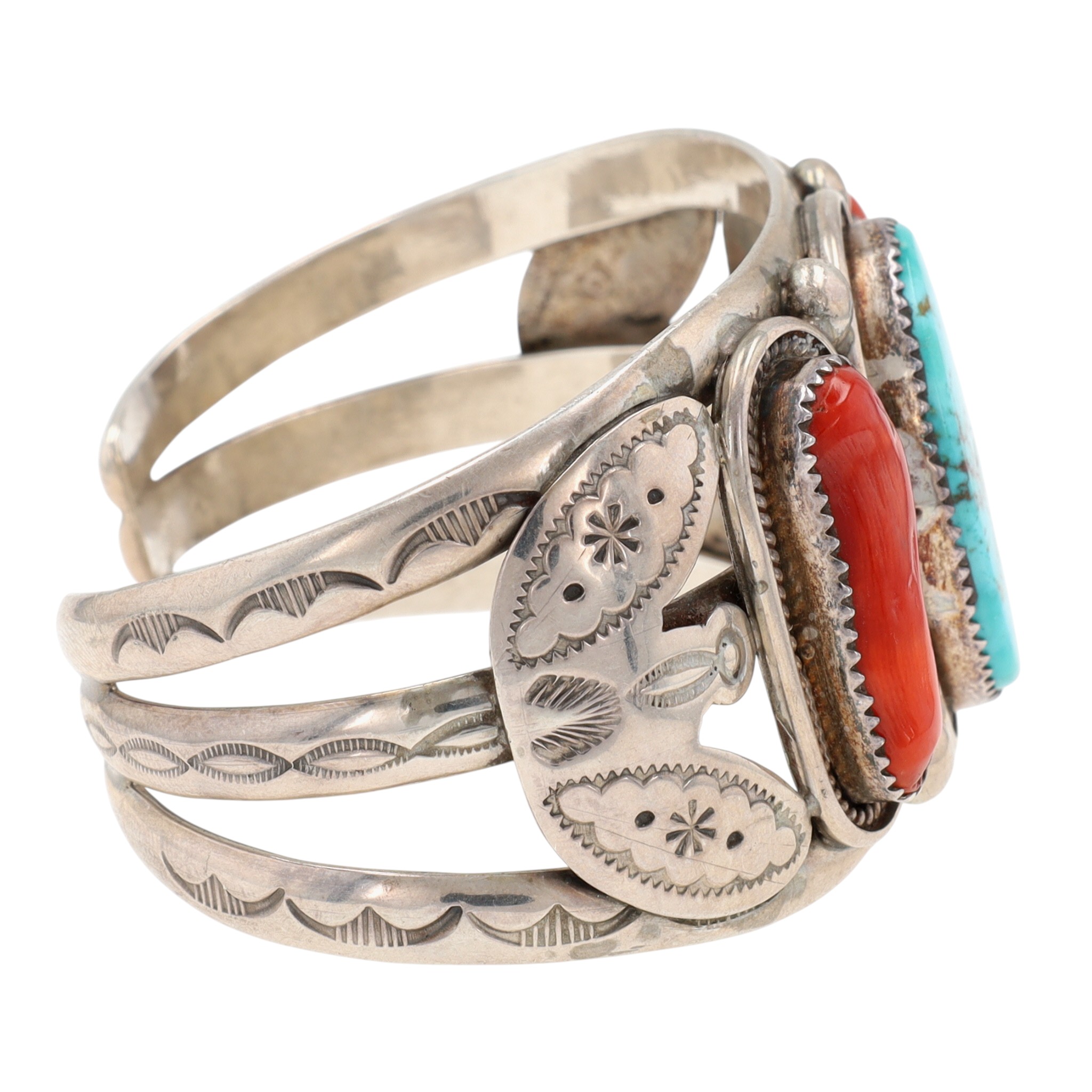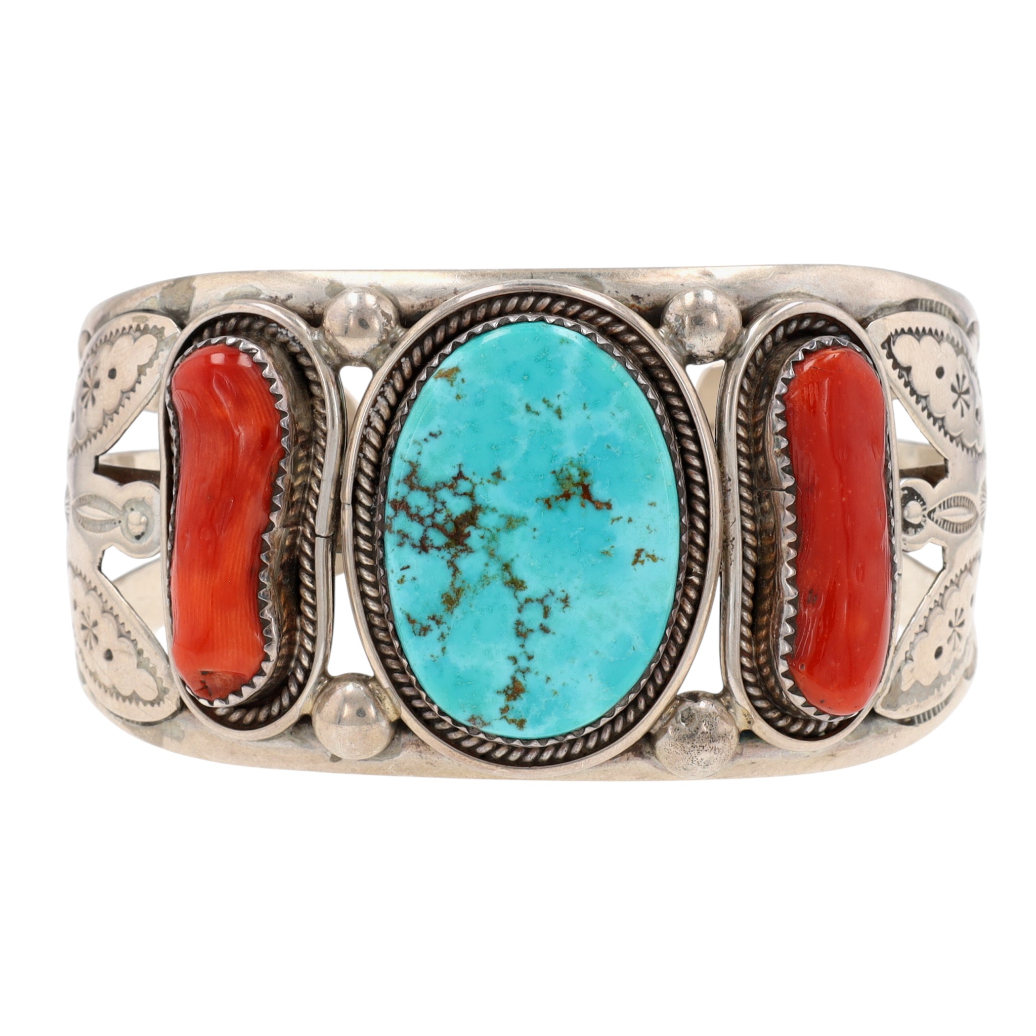 L. Ramone Navajo Turquoise and Coral Stamped Cuff Bracelet