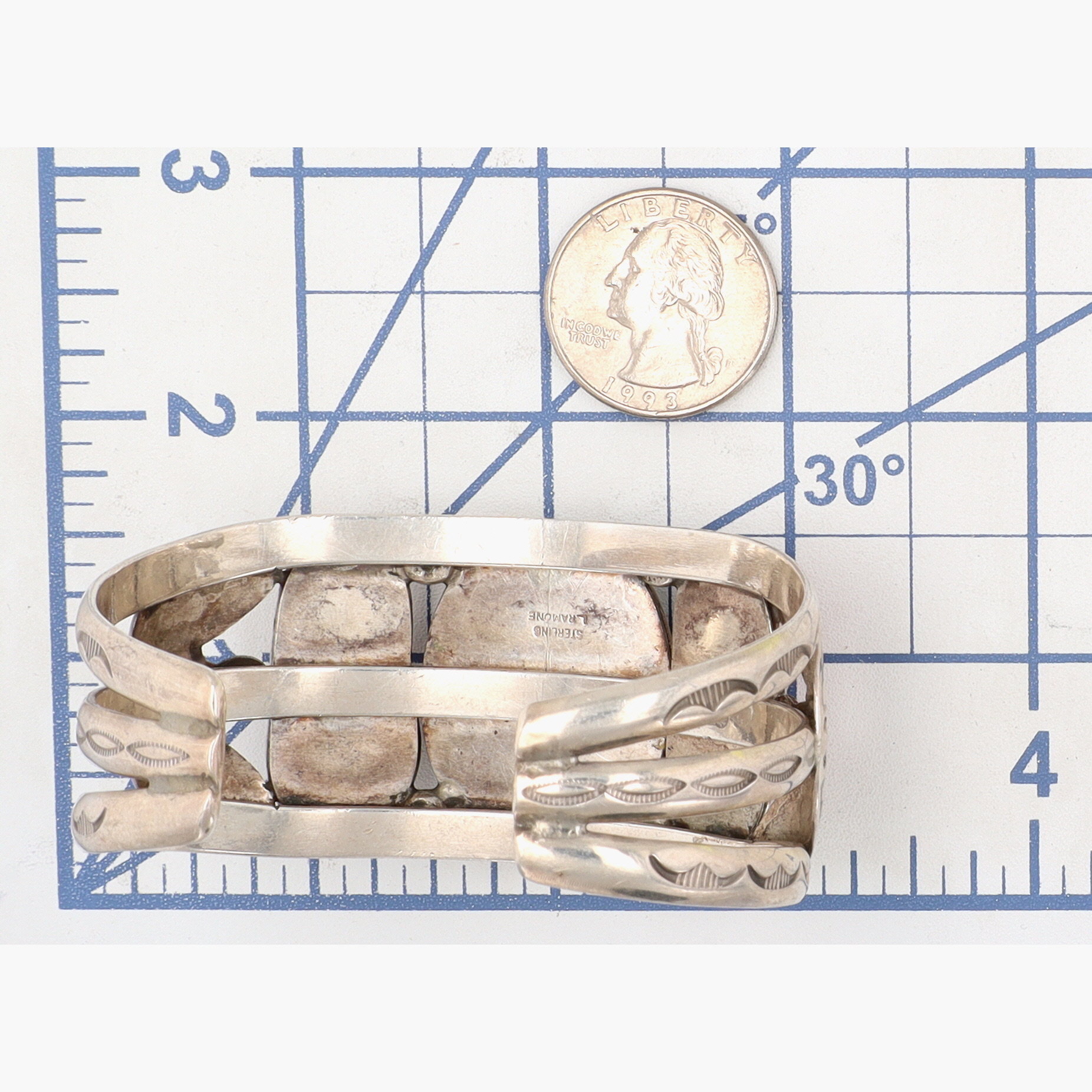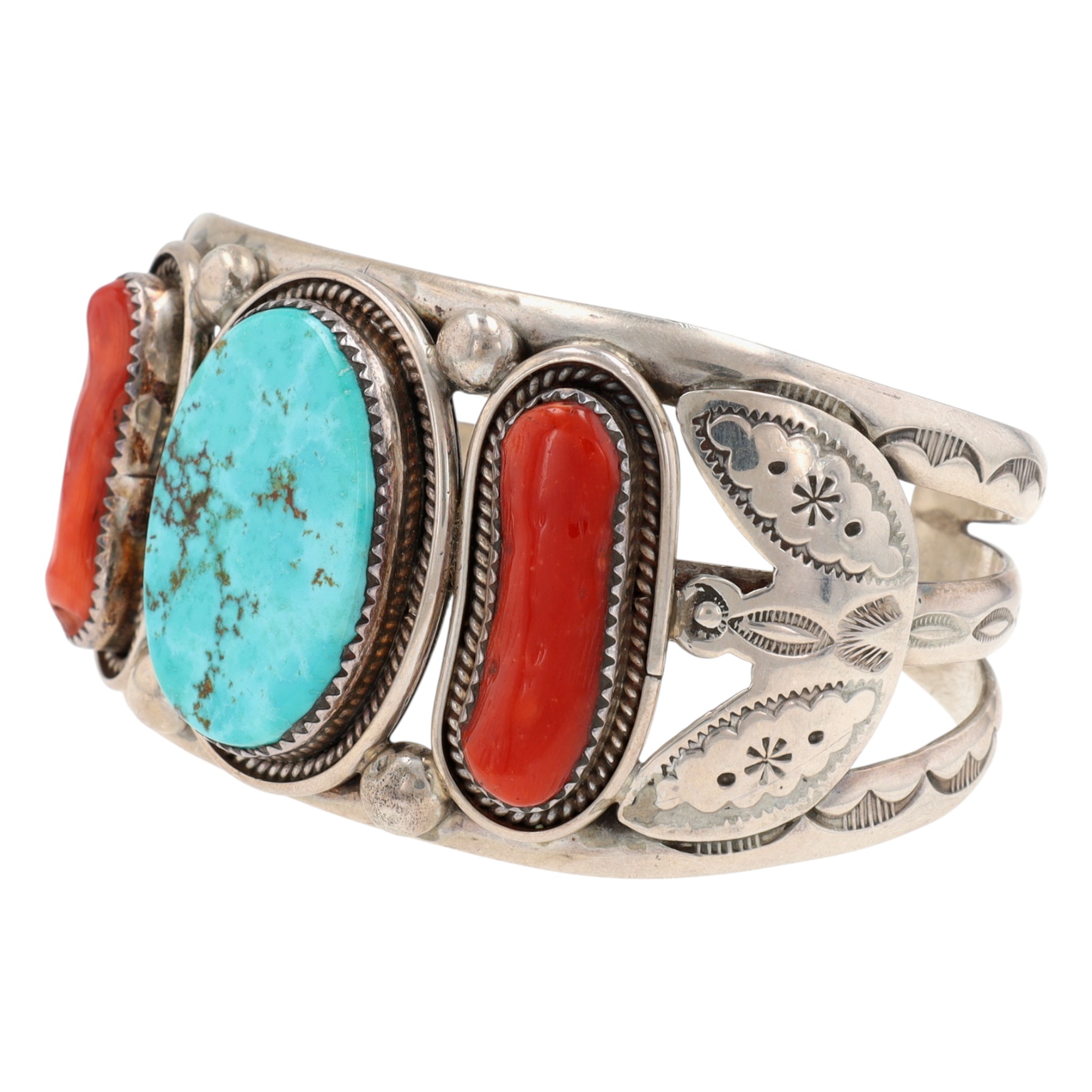 L. Ramone Navajo Sterling Turquoise and Branch Coral Stamped Cuff Bracelet – Stunning! – 68.4g