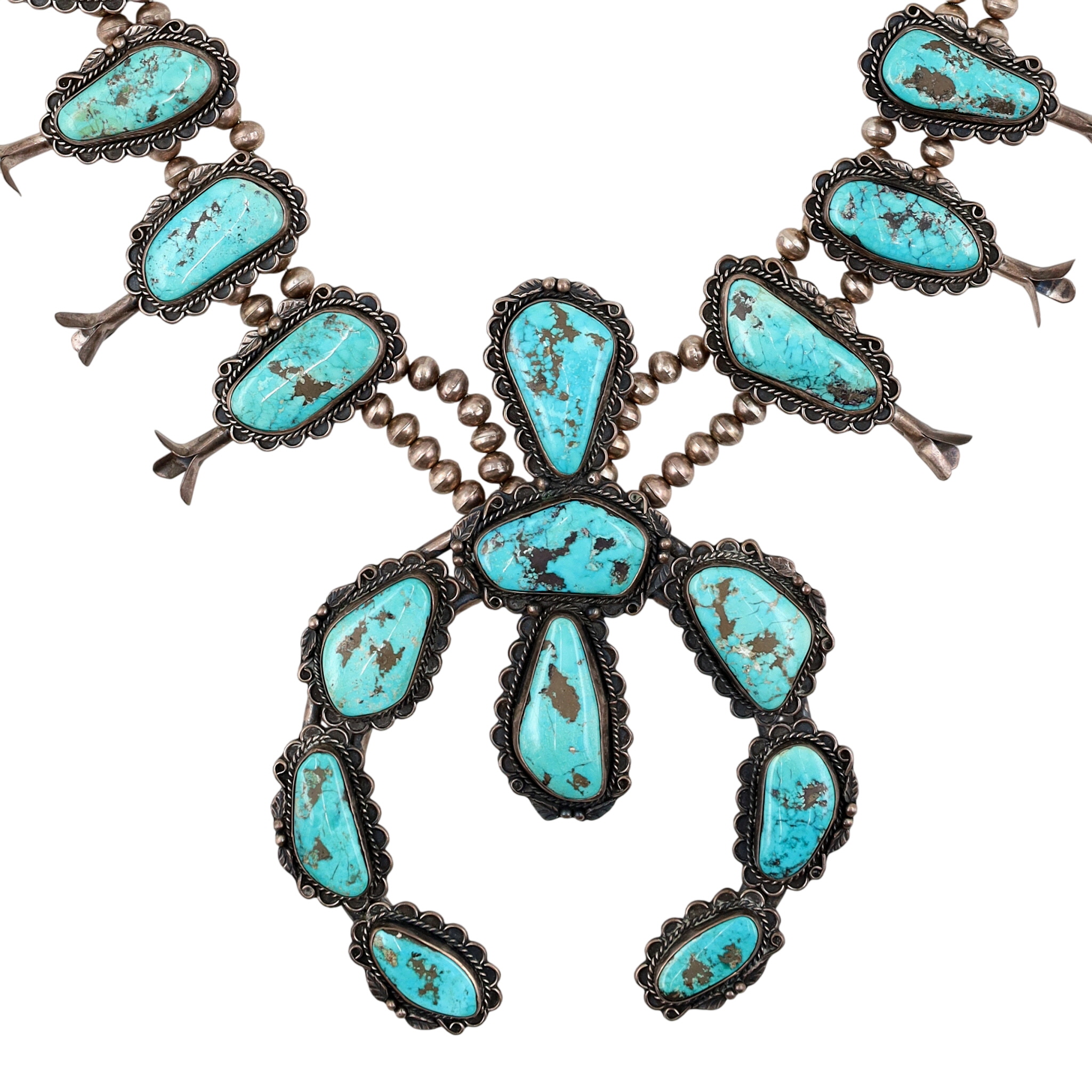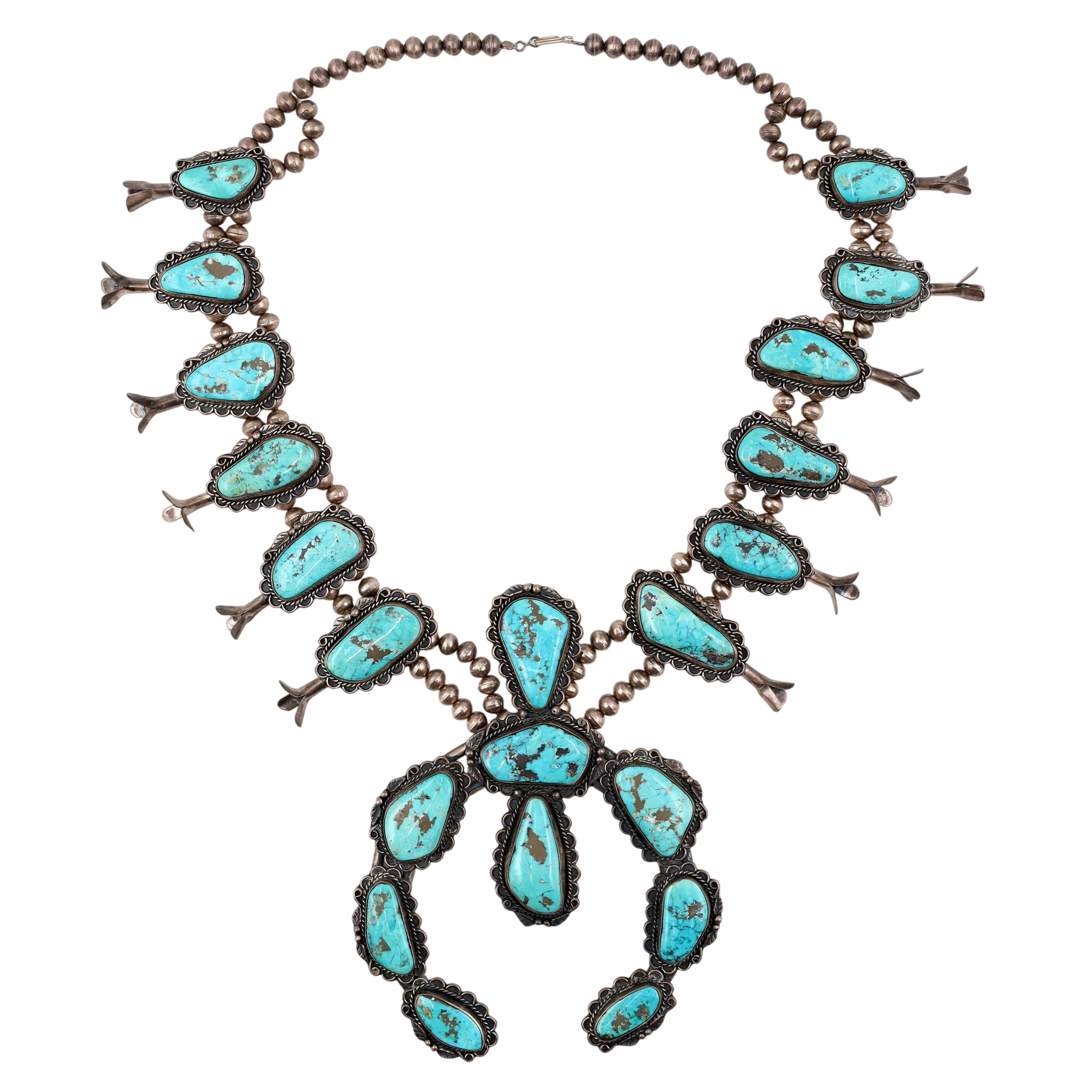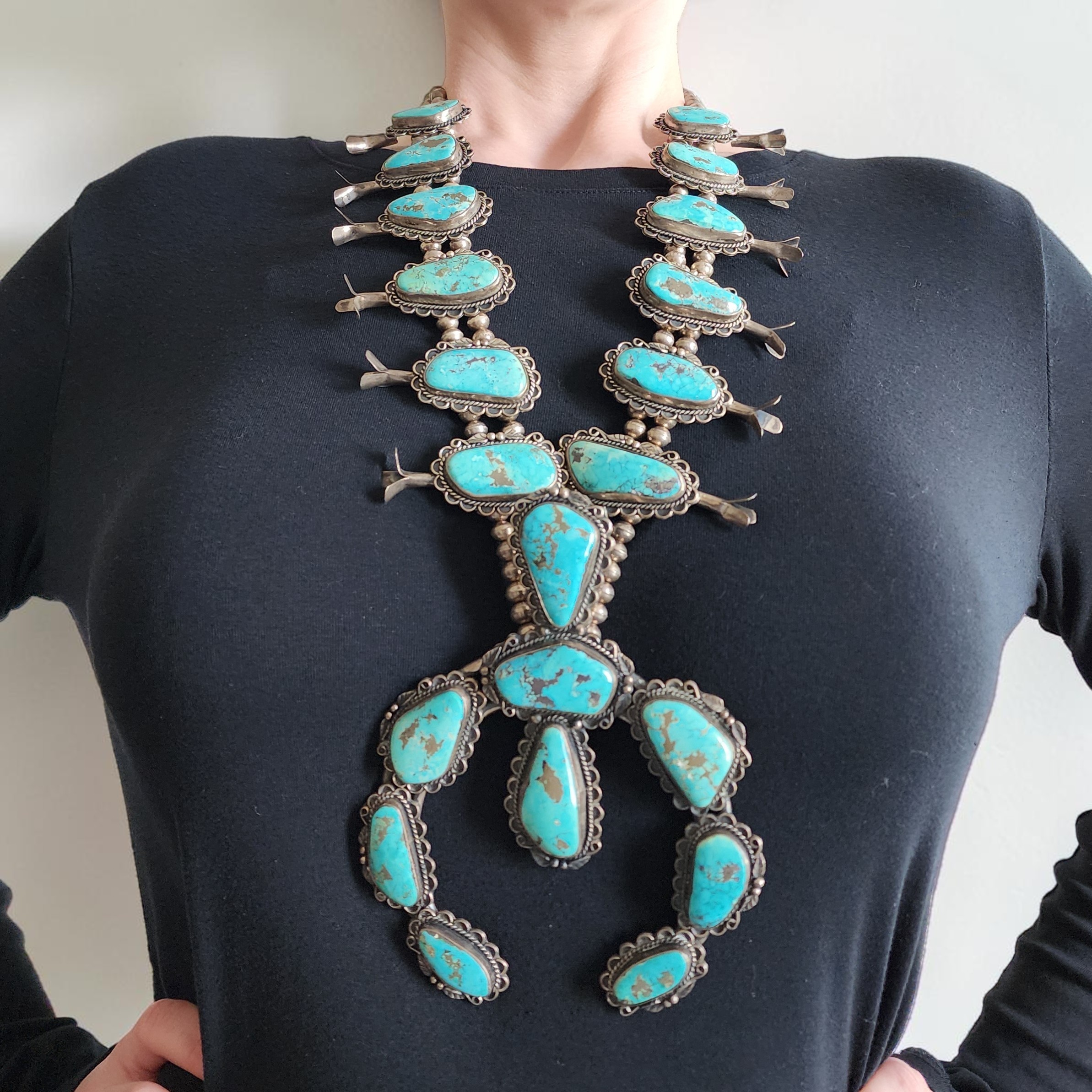 HUGE Signed Navajo Turquoise Squash Blossom Necklace 465g!