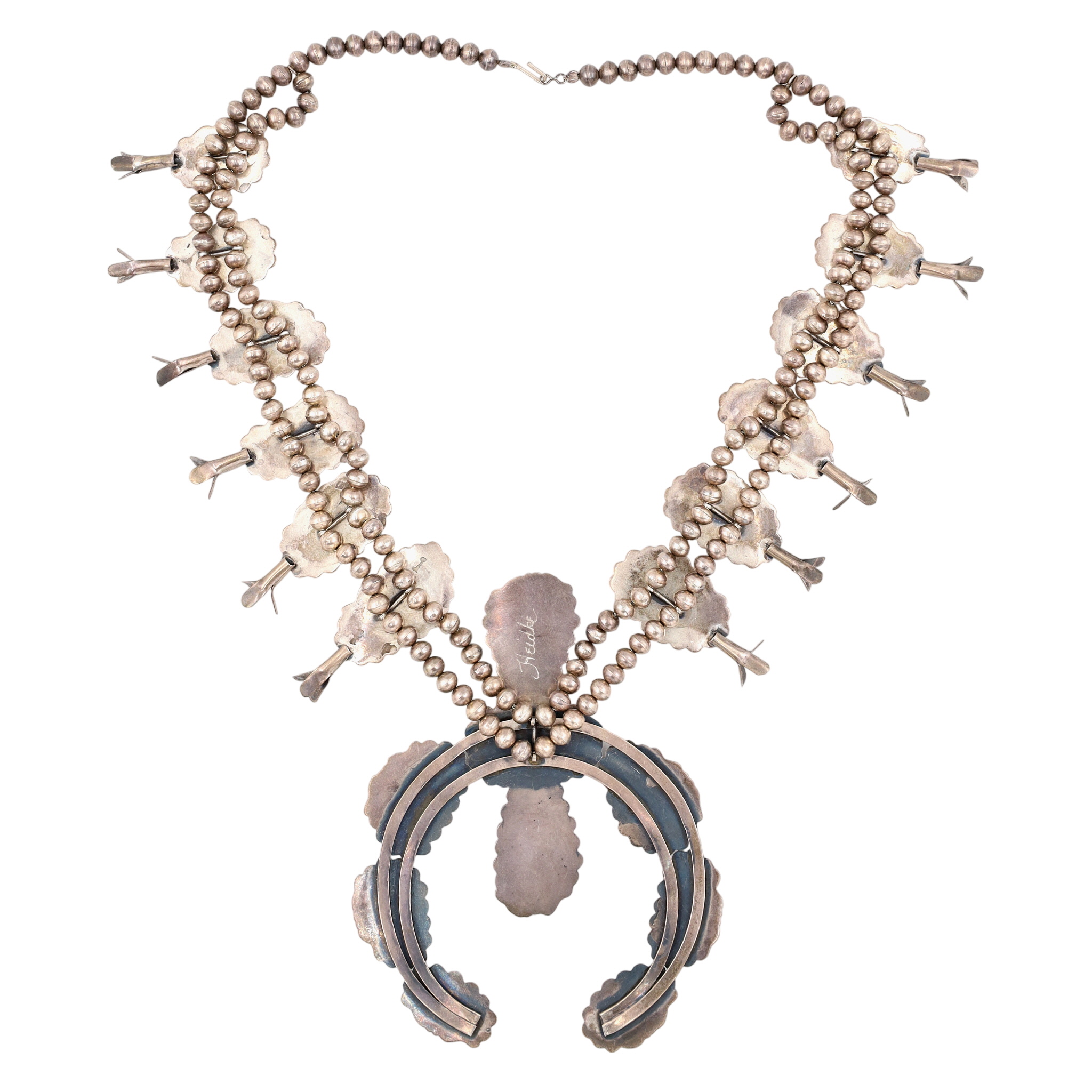 Beyond HUGE! 465g! Hand Signed ‘Heidke’ Vintage Navajo Sterling and Morenci? Turquoise Squash Blossom Necklace – Museum Worthy! / Approximately 465 GRAMS!! / MEASUREMENTS: The necklace is approx. 30″ long from end to end (this does not include the length/drop of the naja) / The naja is approximately 6.5 inches long x 5 inches wide / The blossom pieces average (some slightly smaller, some bigger) approx. 2.5 inches long and 1.1 inches wide