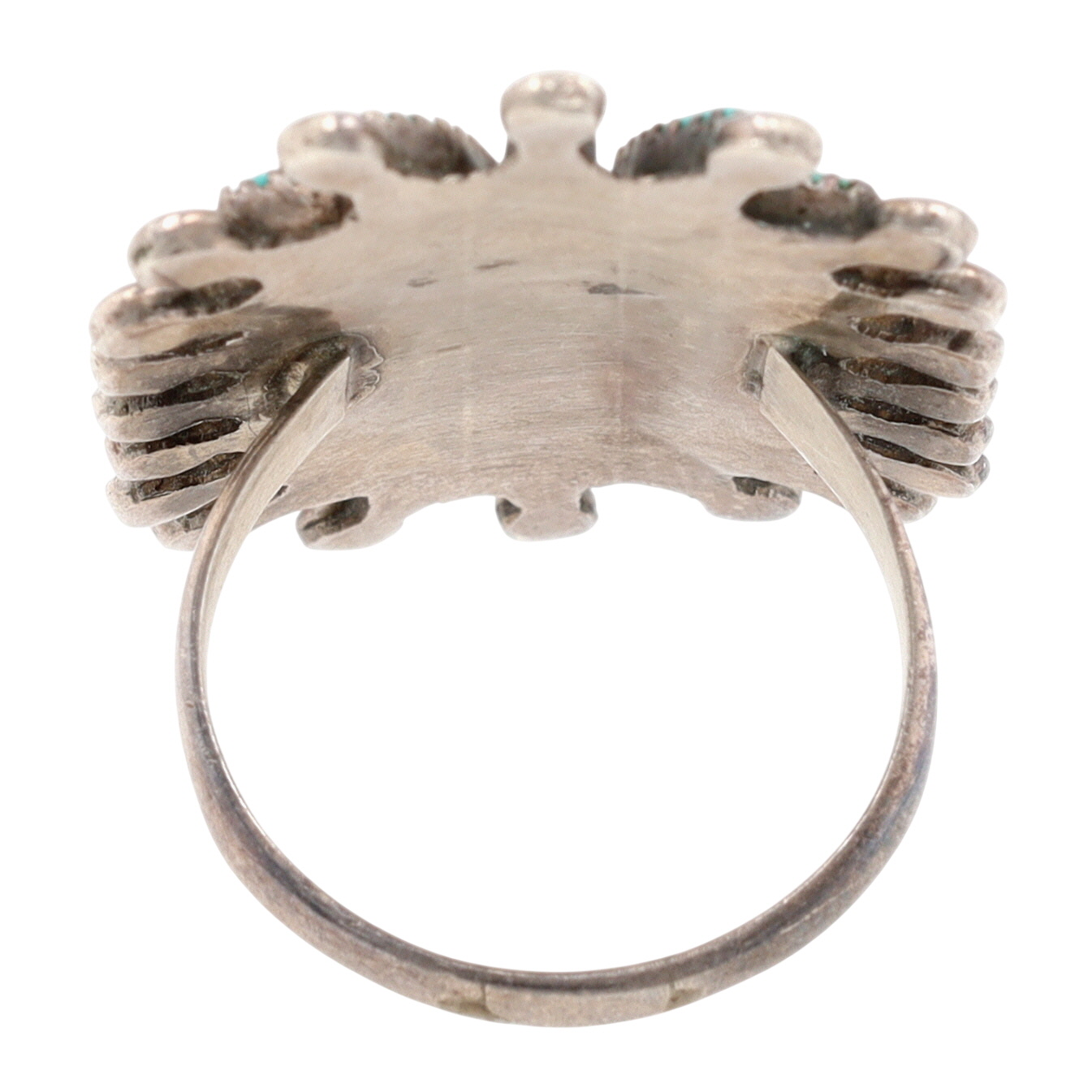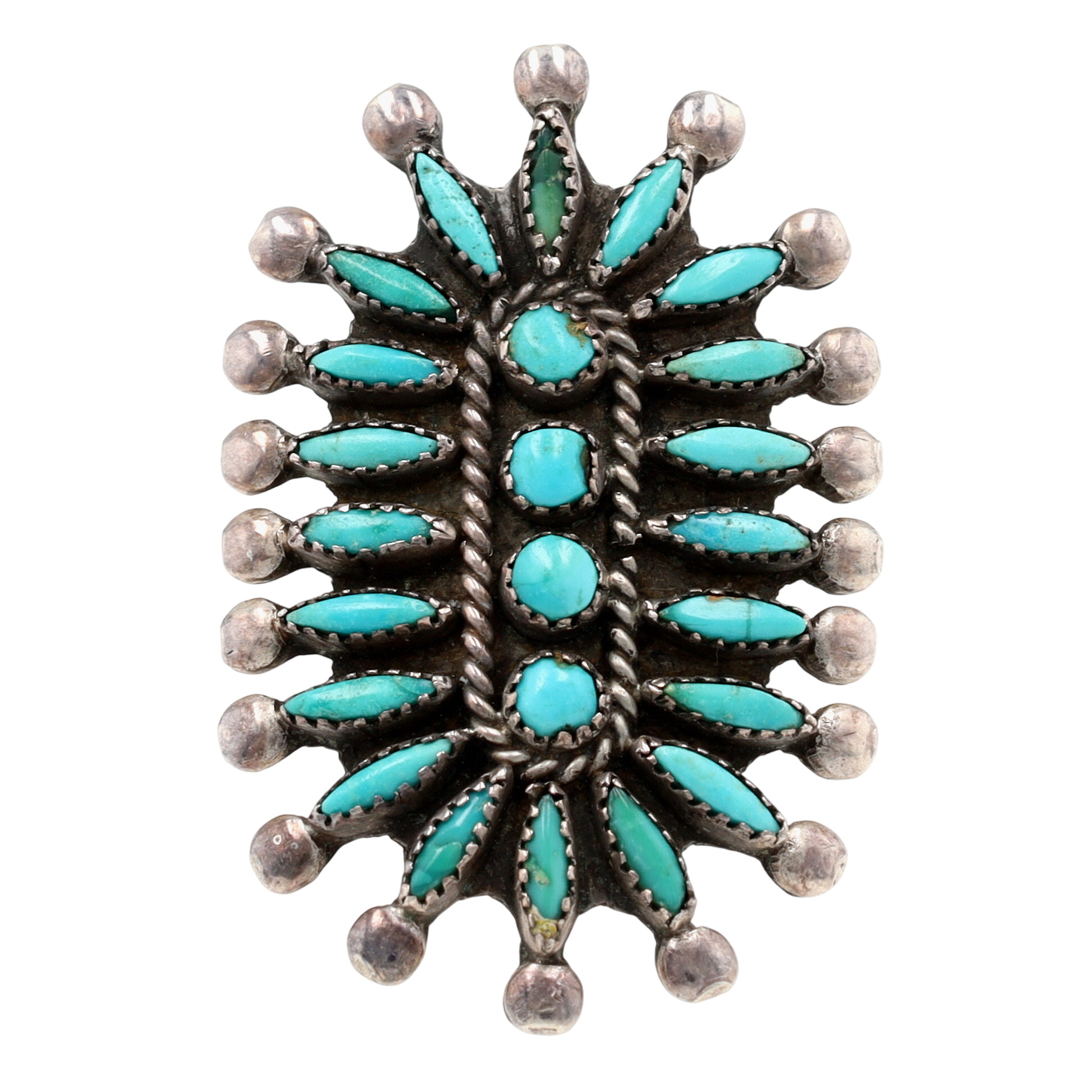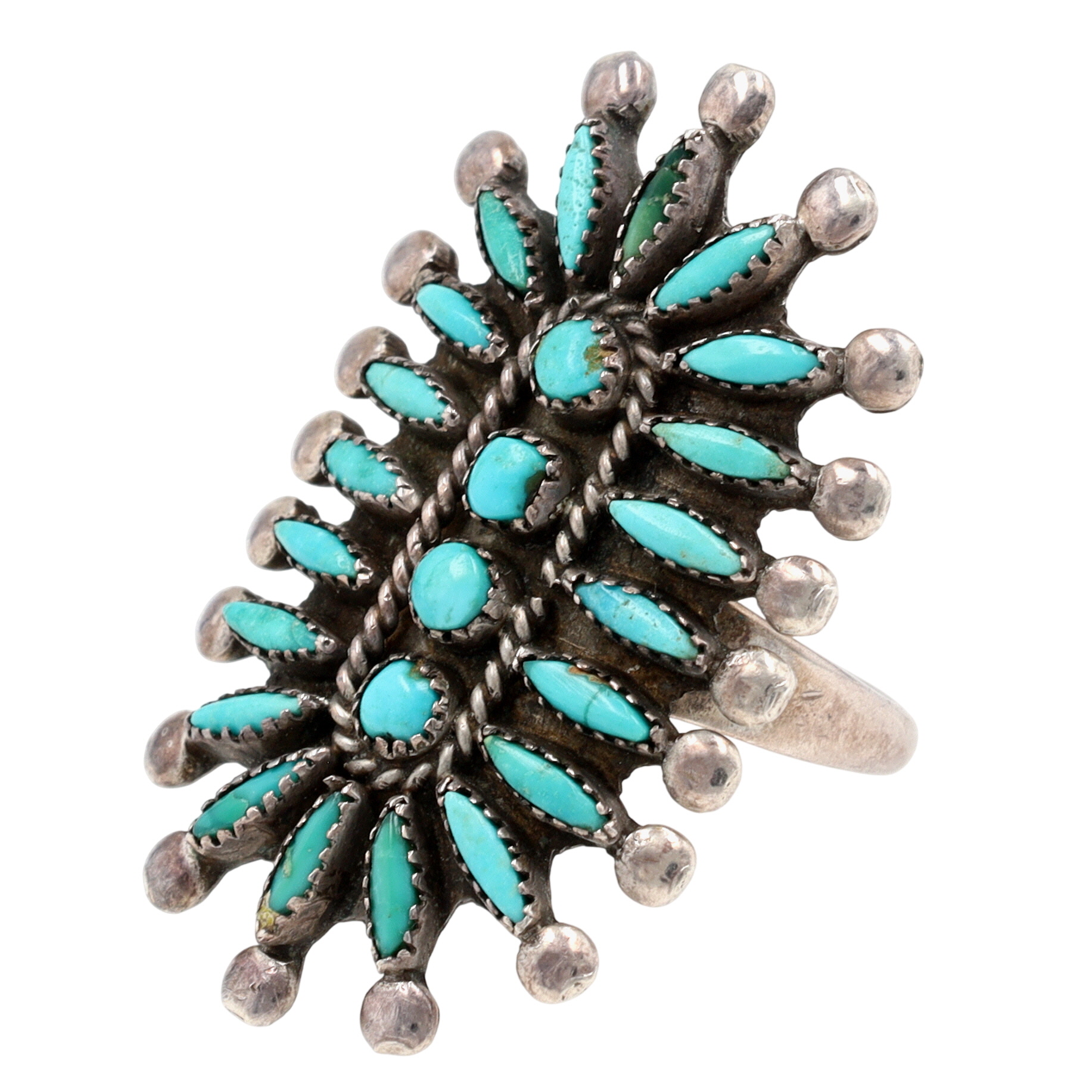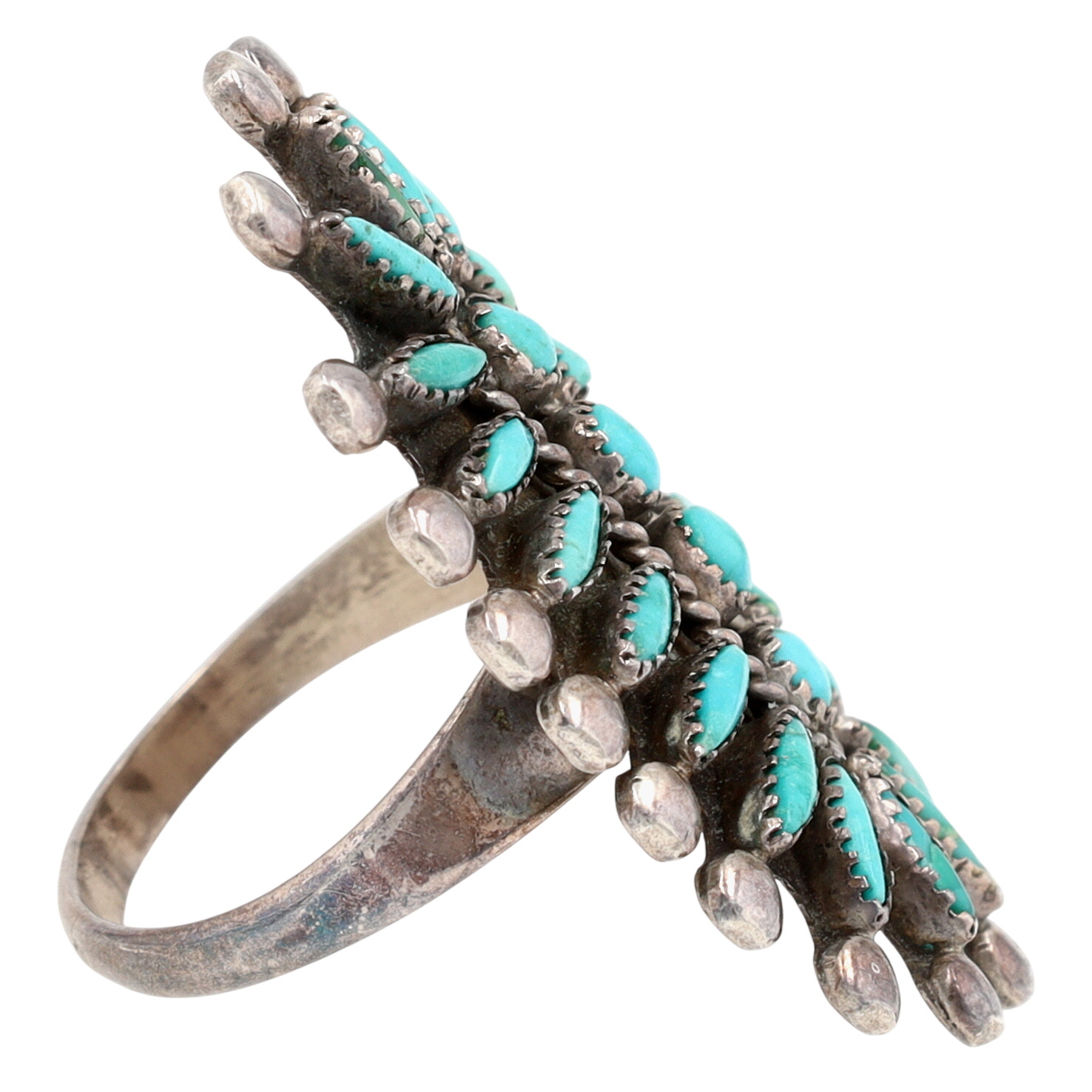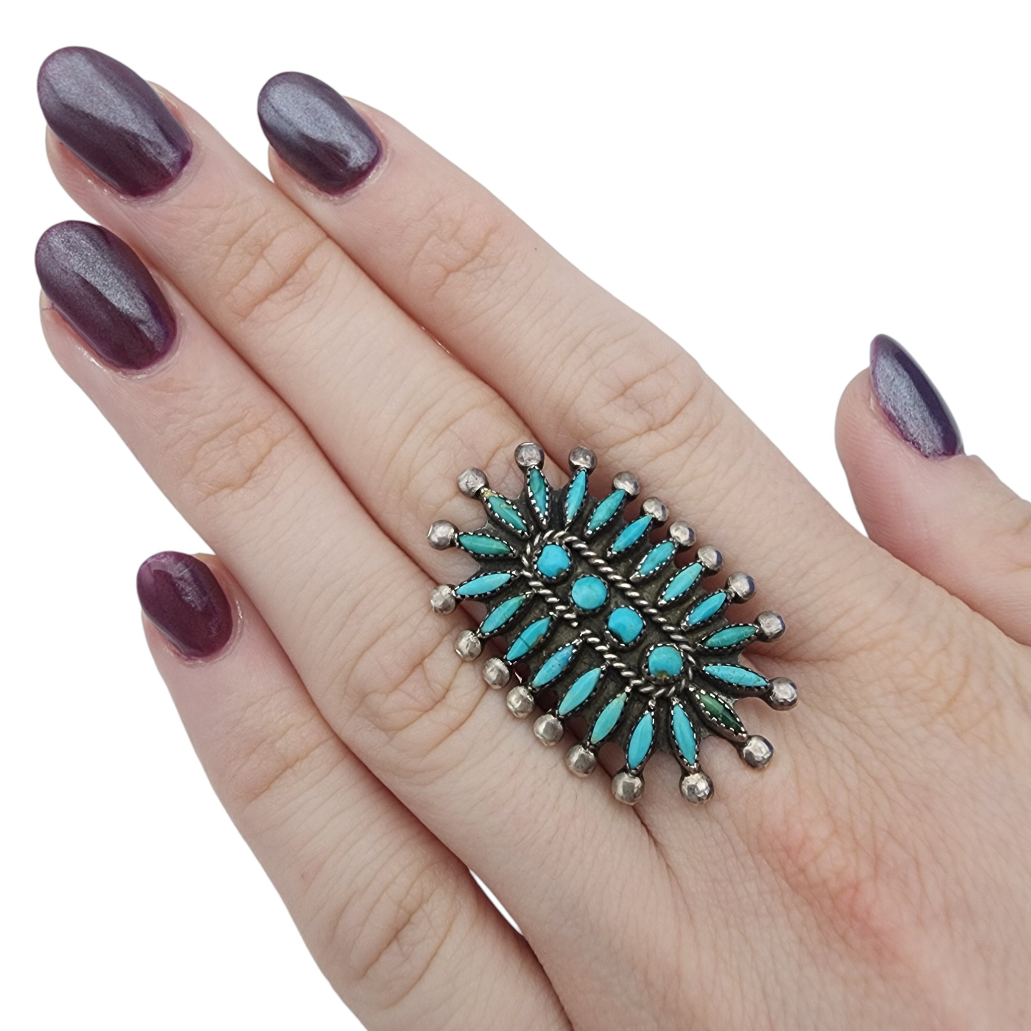Vintage Zuni Sterling Turquoise Needlepoint Cluster Ring Sz 8 – 6.7g – ring face measures approx. 1.5″ x 1″