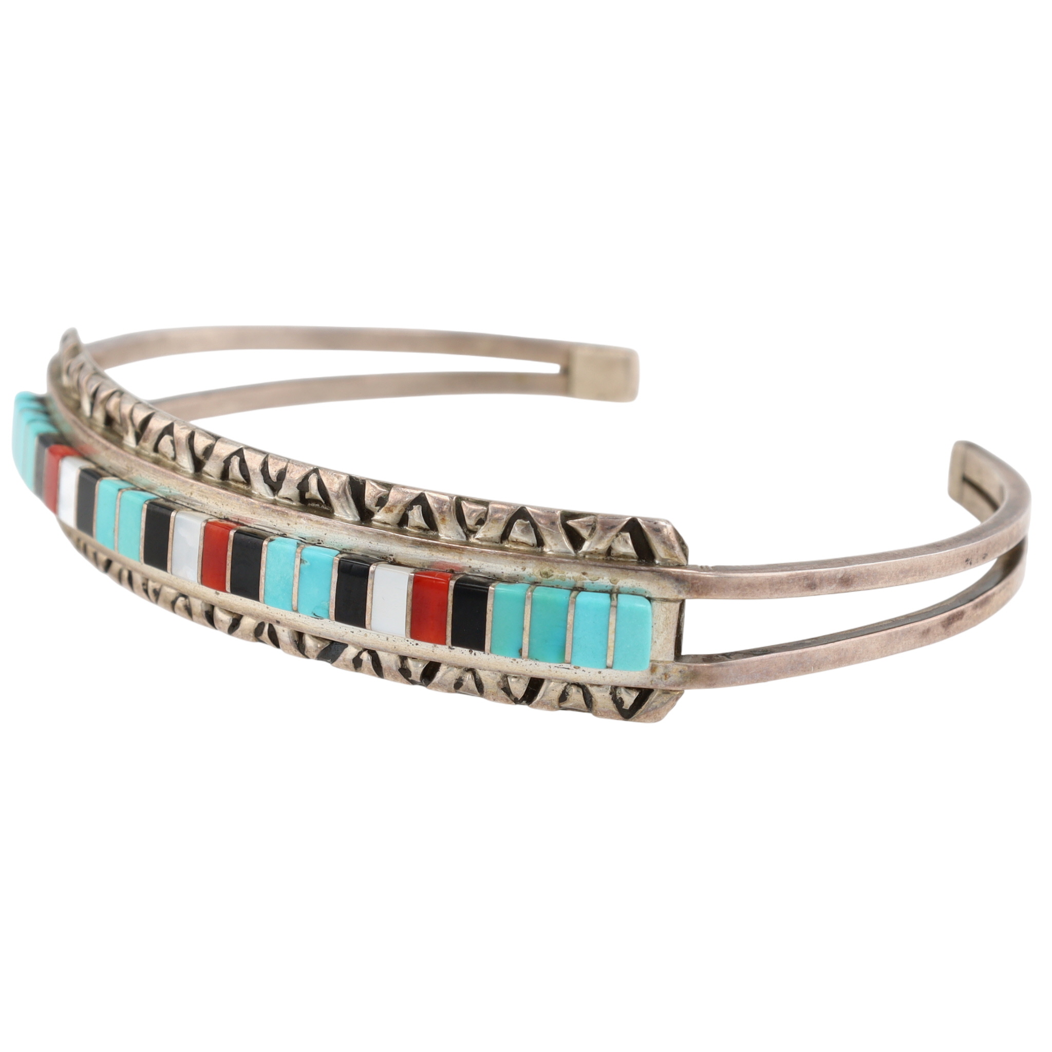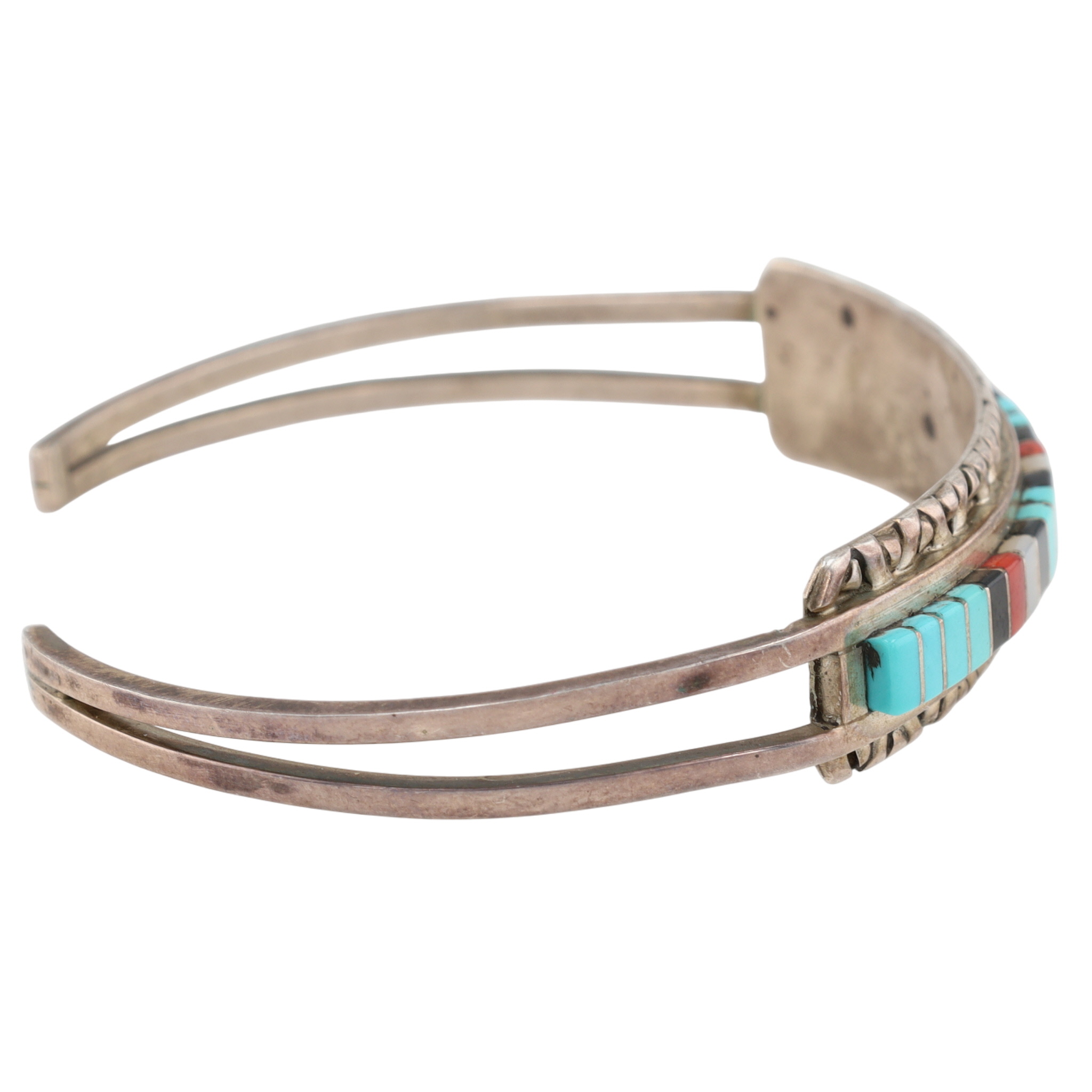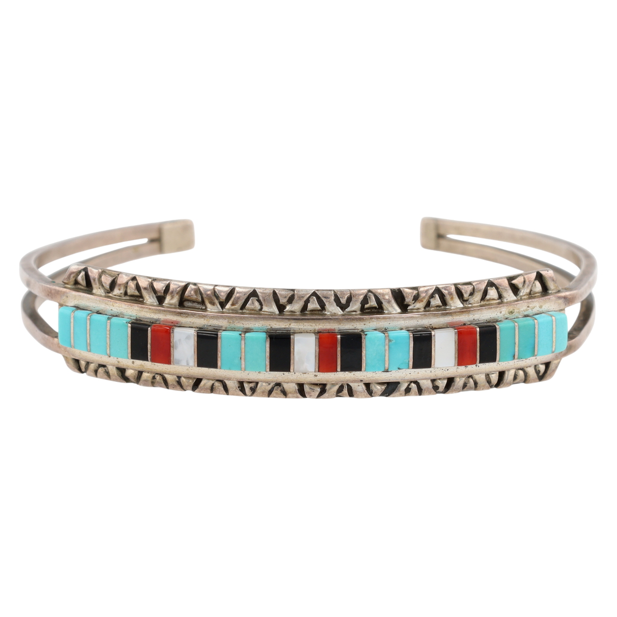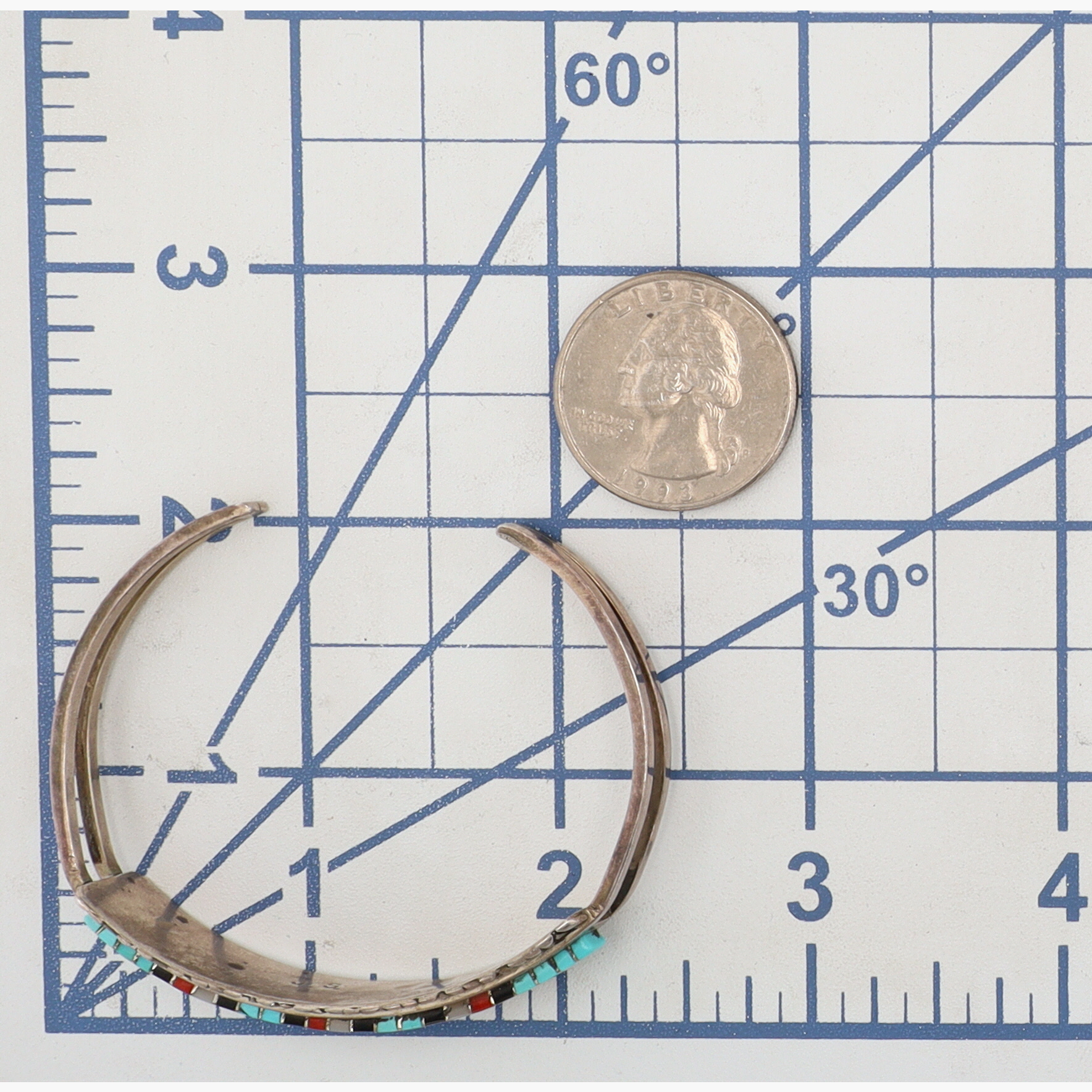 Janelle Shebola Zuni Sterling Multistone (Turquoise, Jet, Coral, Mother of Pearl) Inlay Cuff Bracelet – 13.1g
