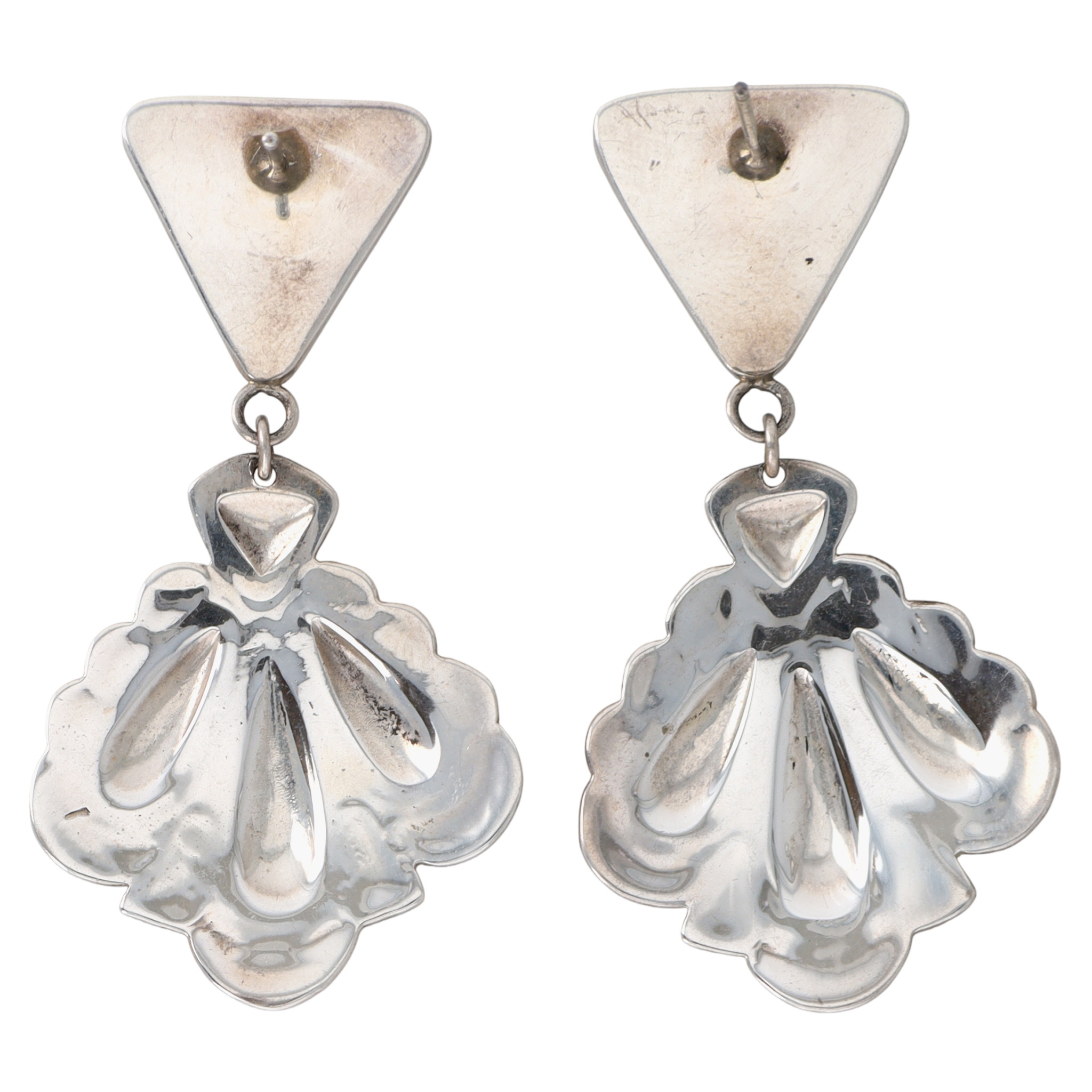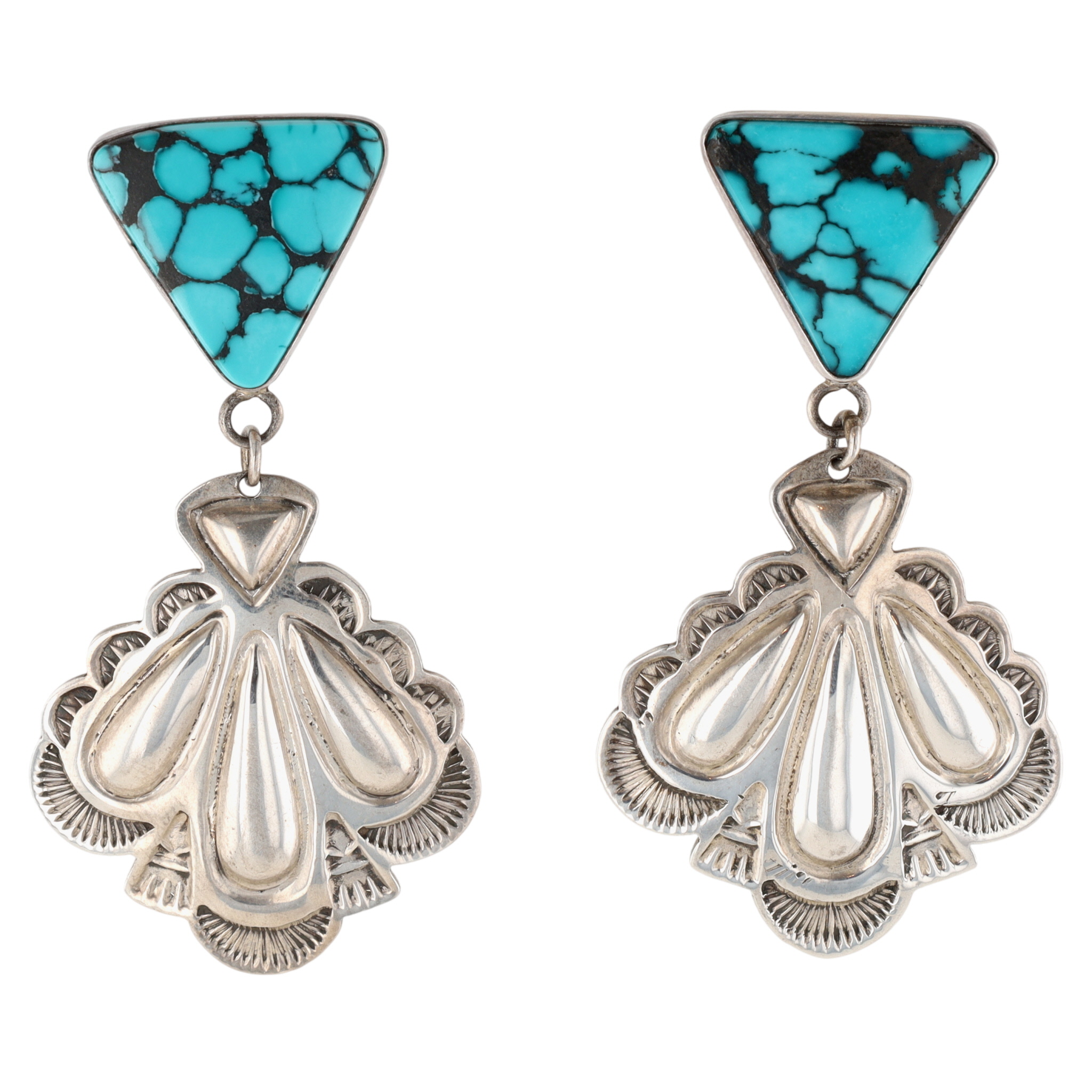 Navajo Sterling Spiderweb Turquoise Stamped Repousse Dangle Earrings – 16.2g