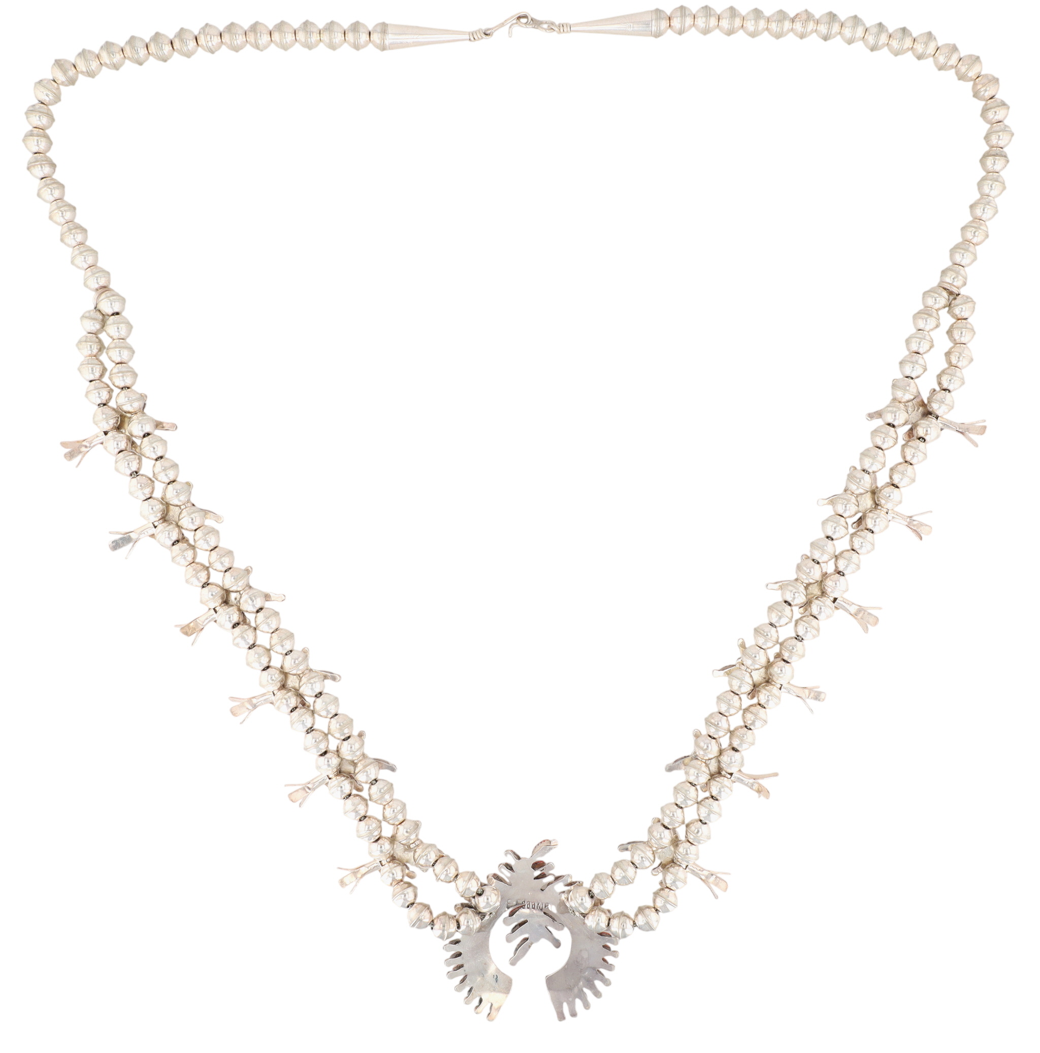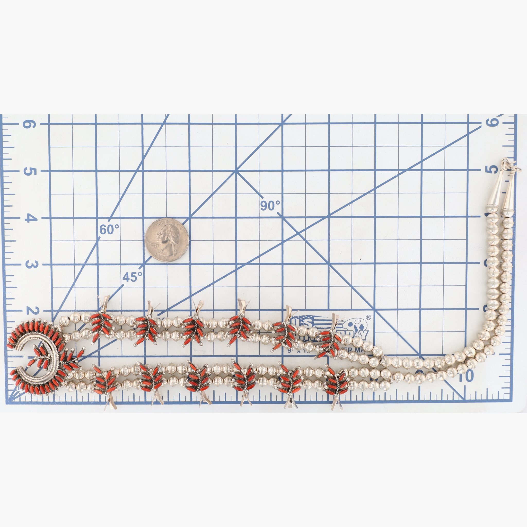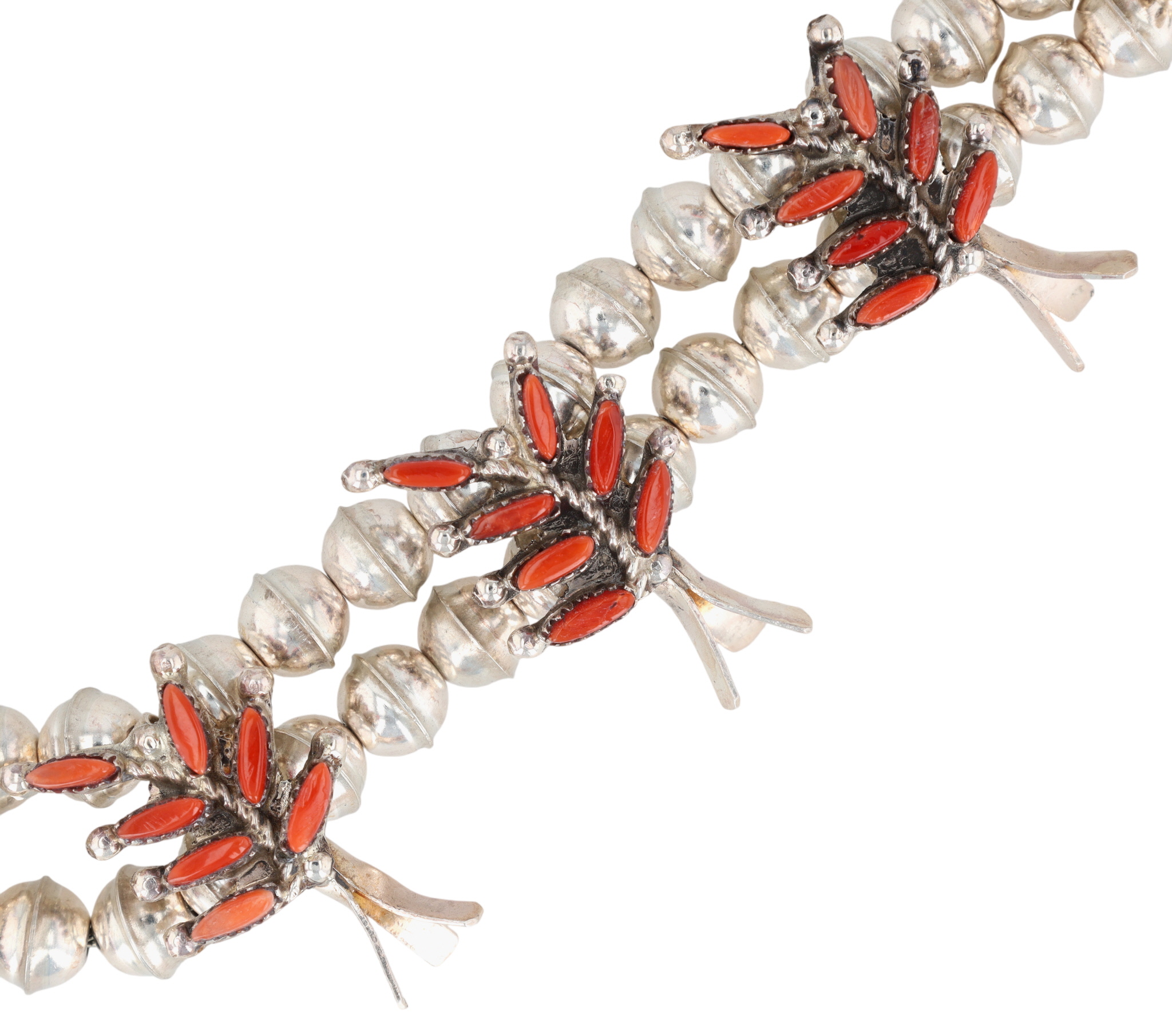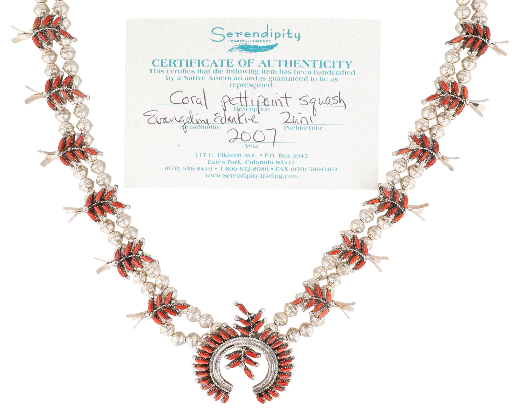 Evangeline Edaakie Zuni Sterling Coral Needlepoint Squash Blossom Necklace – 69.3g – Comes with a ‘Certificate of Authenticity’ that the consignor received when purchasing the necklace in 2007.