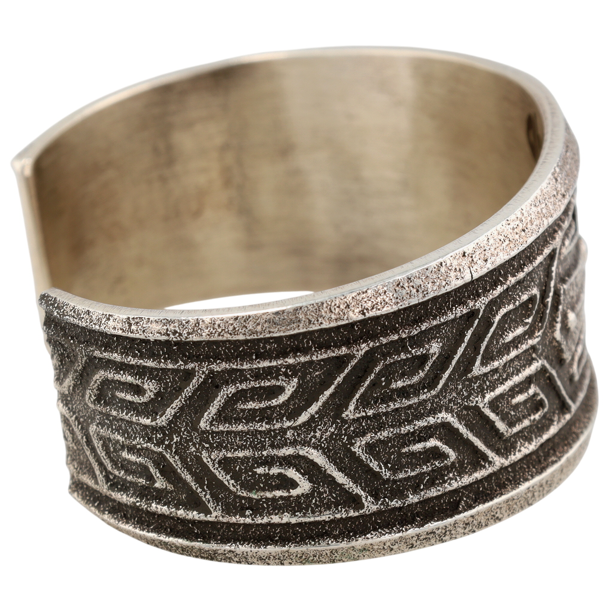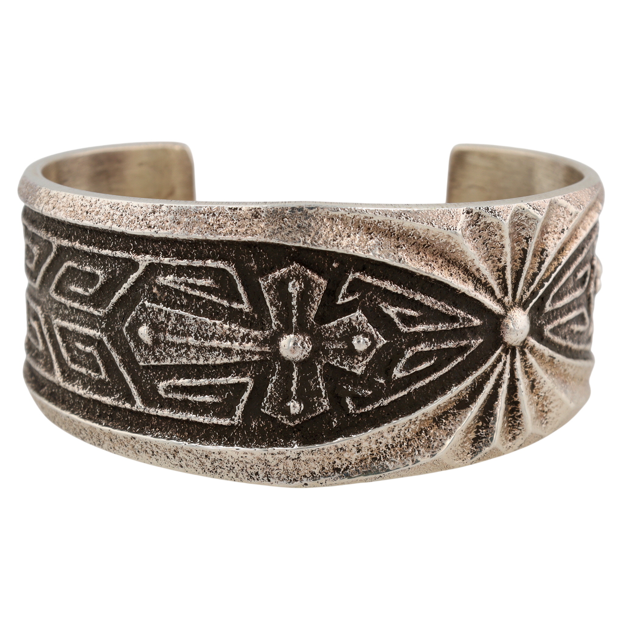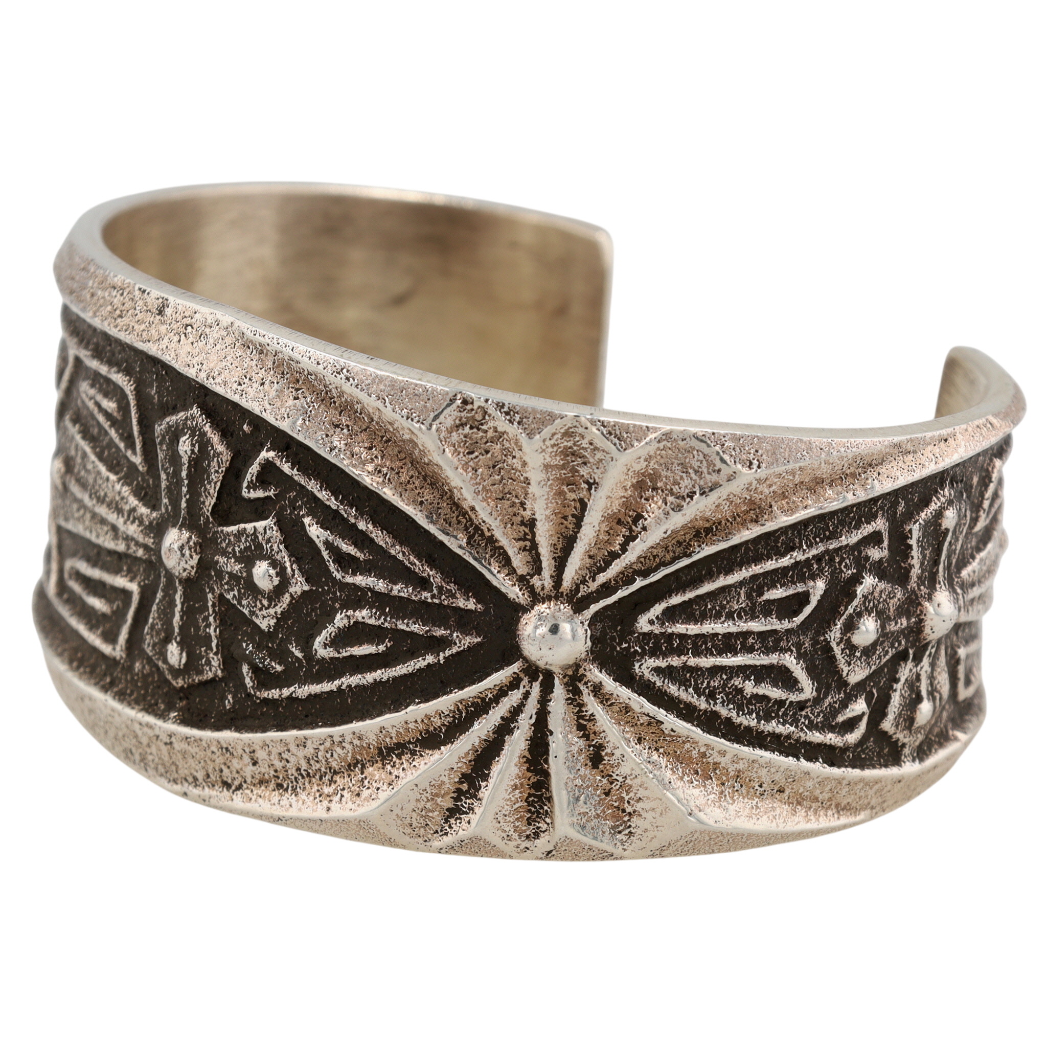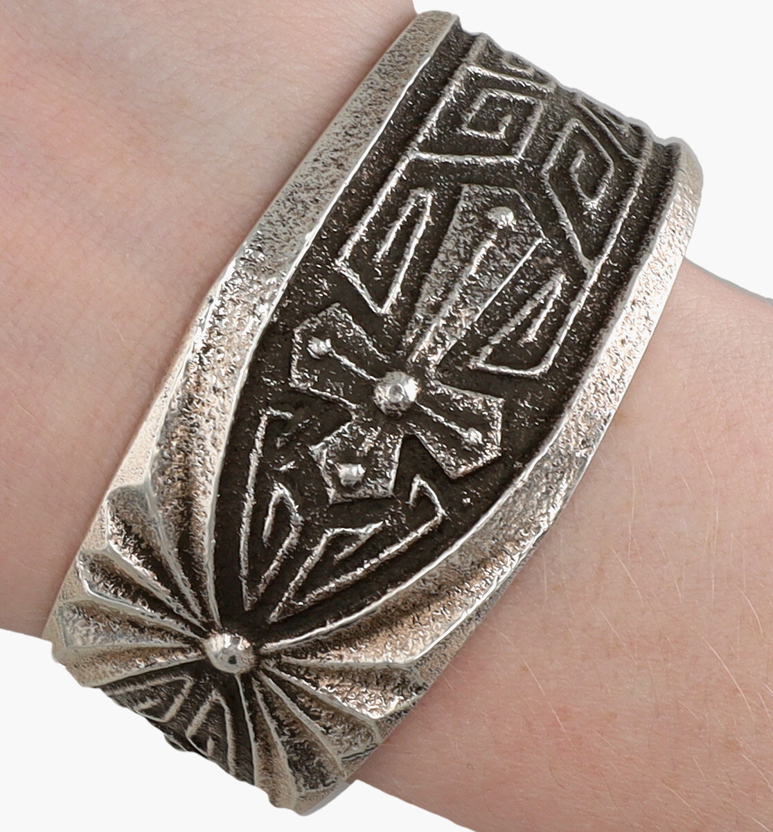 Lawrence Baca Hispanic/Native American Sterling Tufa Cast Cross Cuff Bracelet – 76.4g – solid cuff, amazing design work! Retail $640 / Lawrence Baca, a multi-talented and award-winning jewelry designer, was born and raised in Santa Fe, New Mexico. His work drew inspiration from both Hispanic and Native American traditions with designs blending Spanish Colonial ecclesiastical art with early Navajo jewelry traditions. Lawrence Baca passed away in 2024.