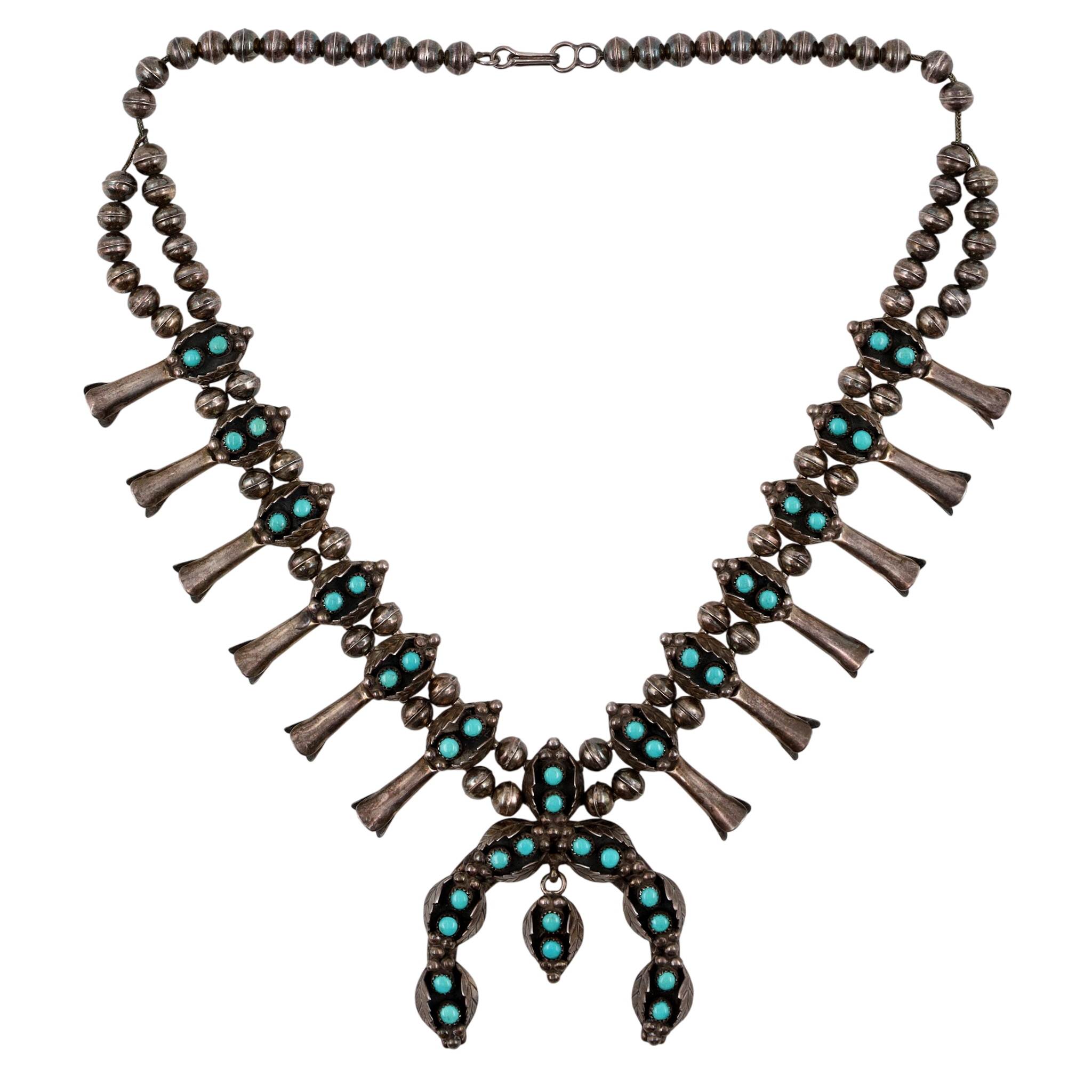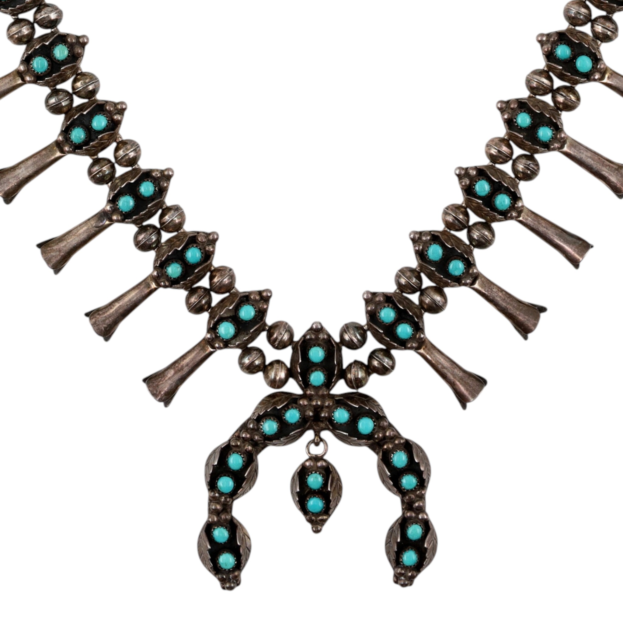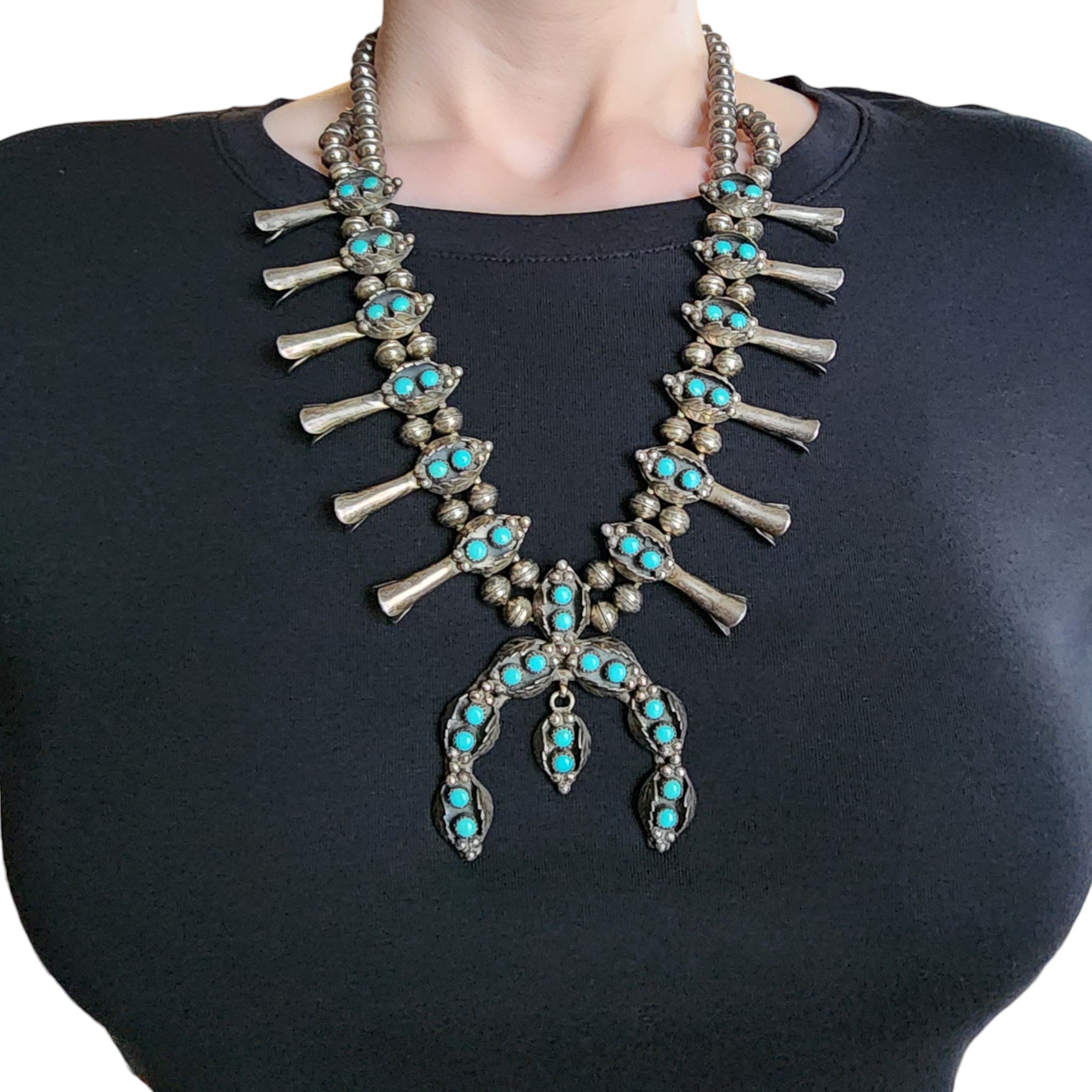 Hand Signed Navajo Sterling Turquoise Snake Eye Squash Blossom Necklace – 140g – approx. 23.5″
