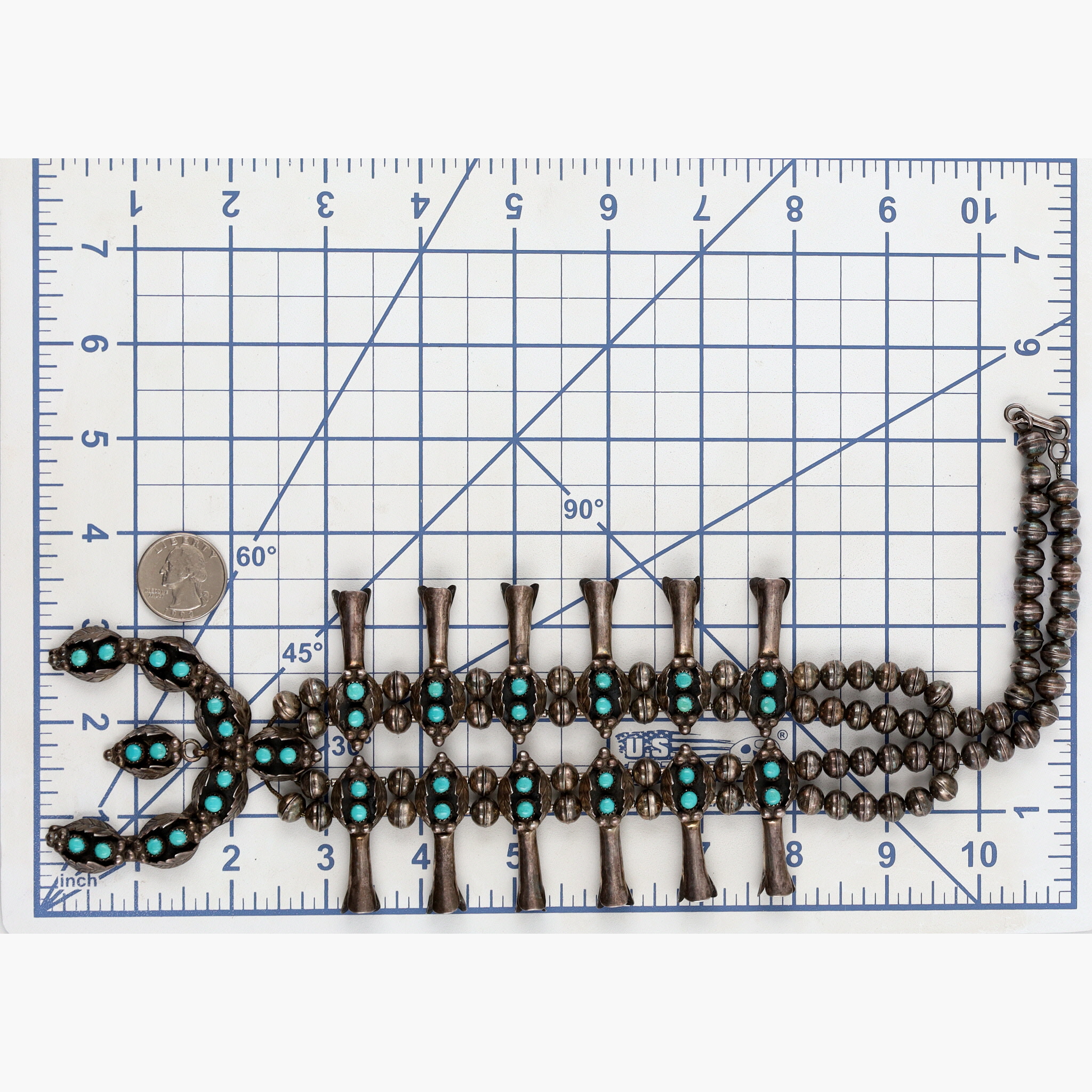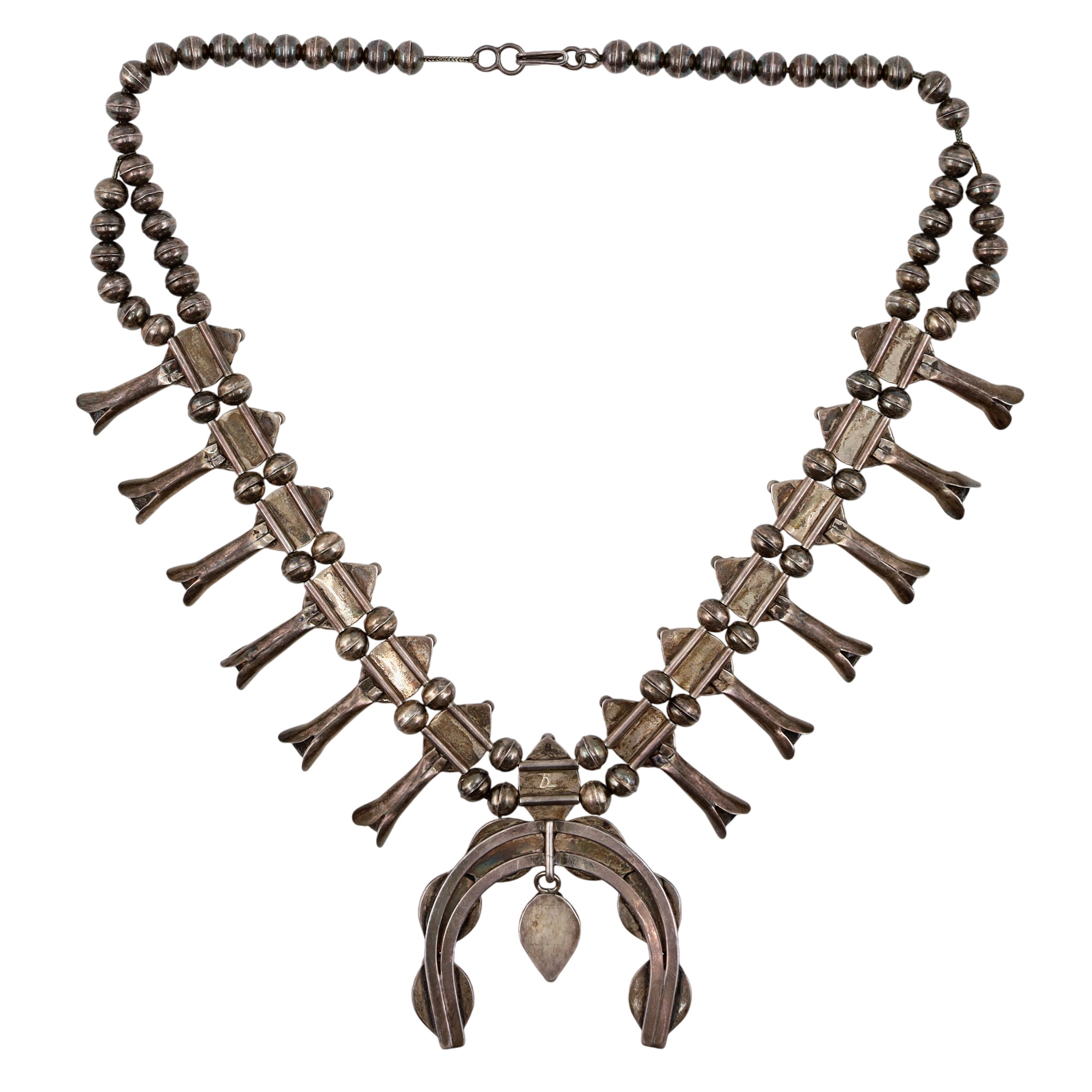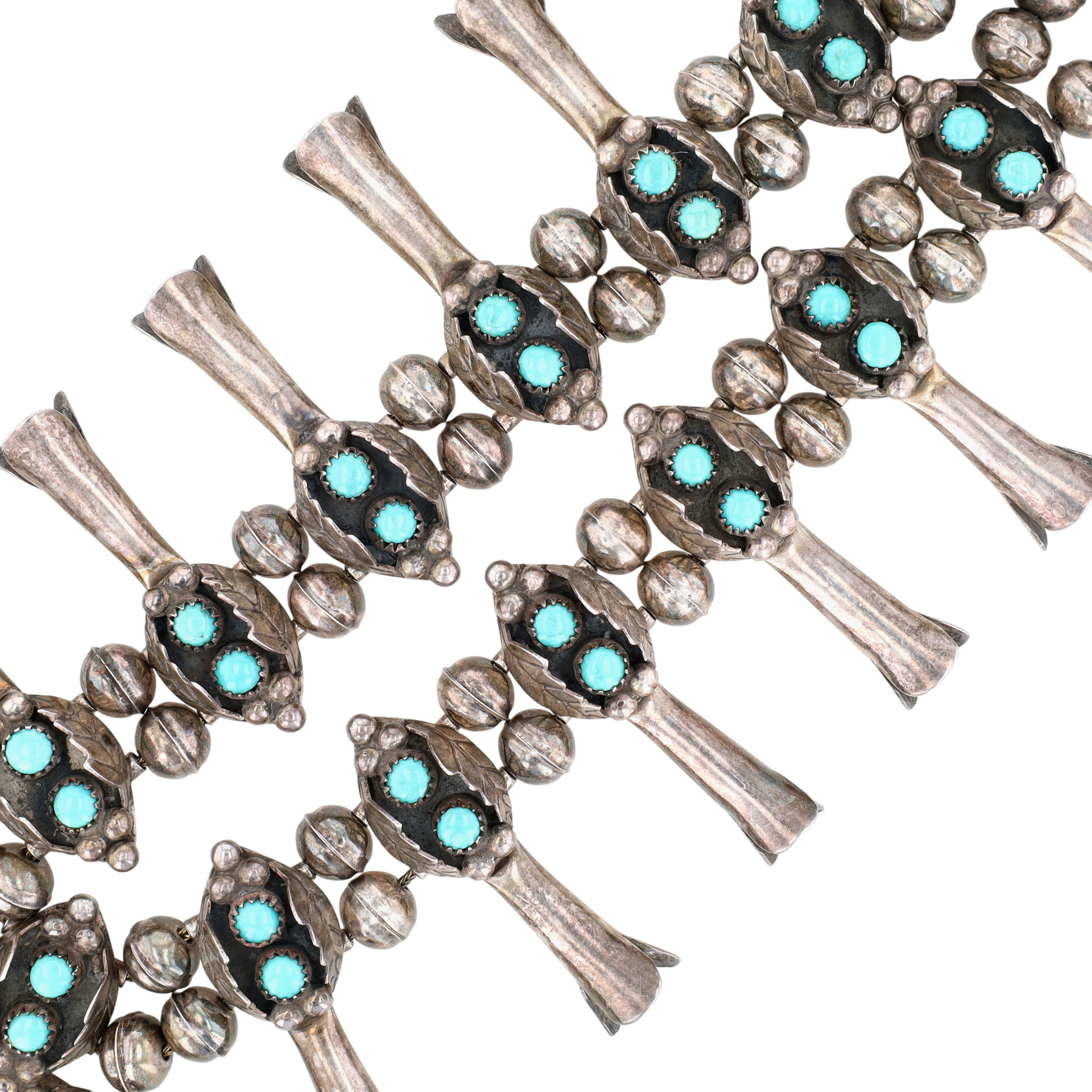 Hand Signed Navajo Sterling Turquoise Snake Eye Squash Blossom Necklace – 140g – approx. 23.5″