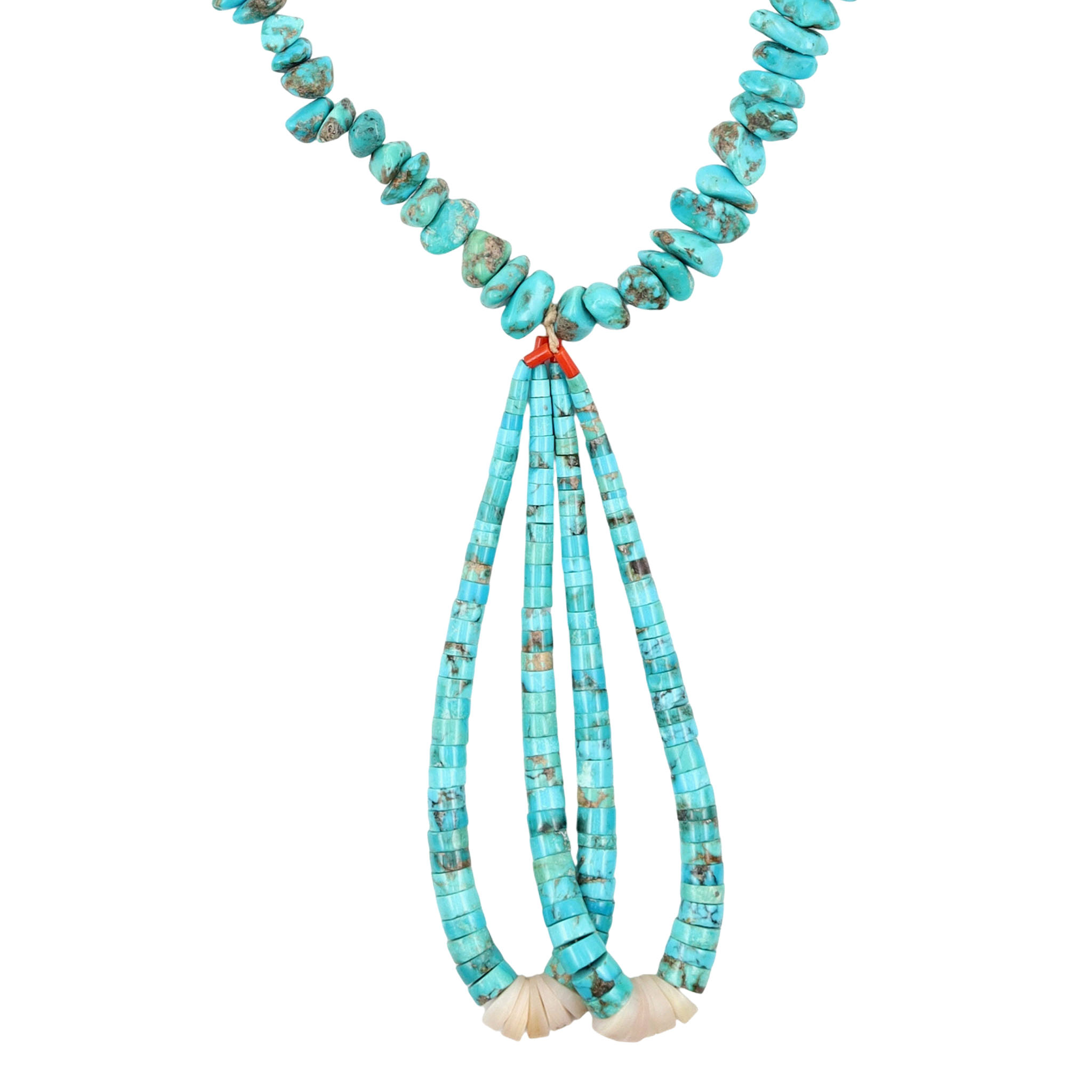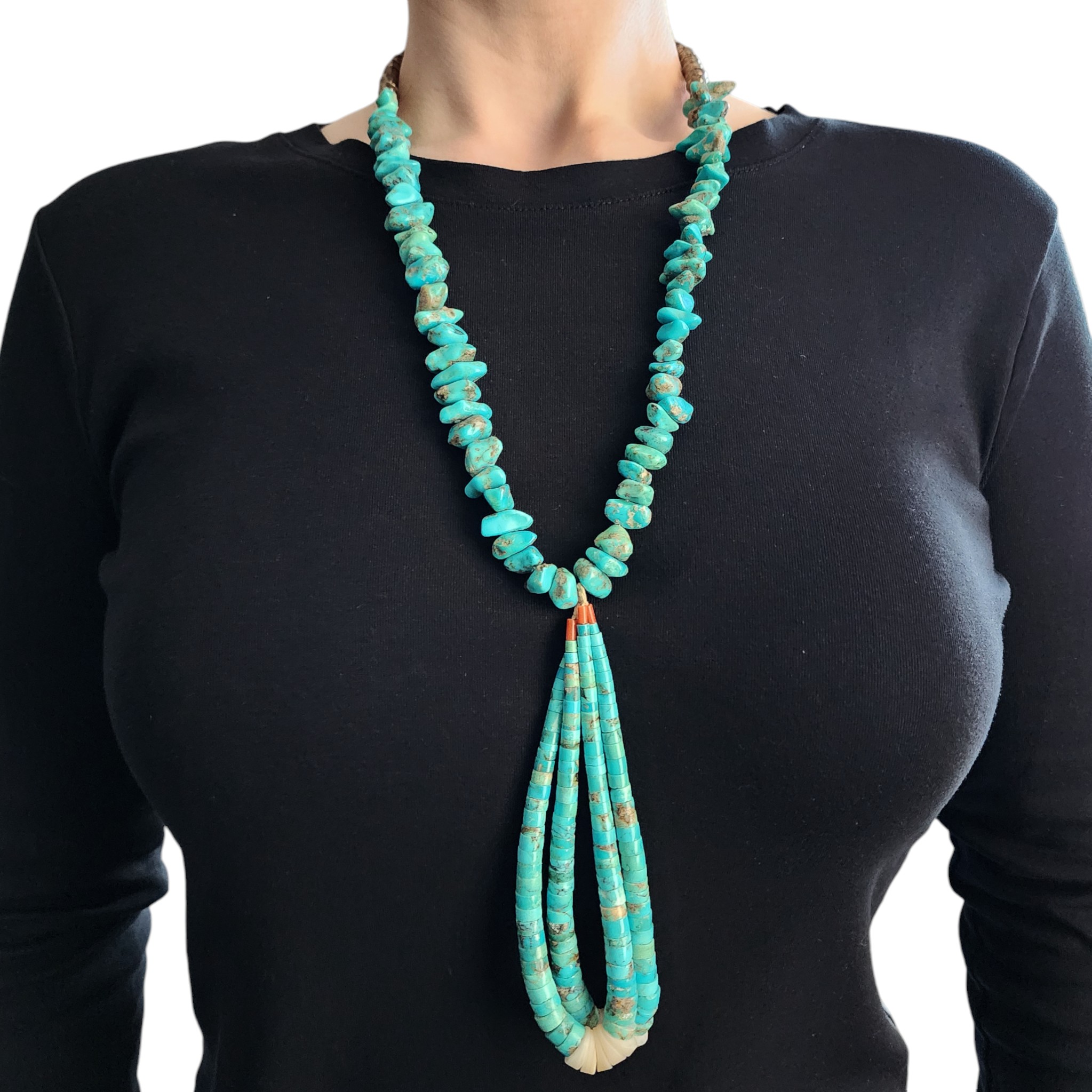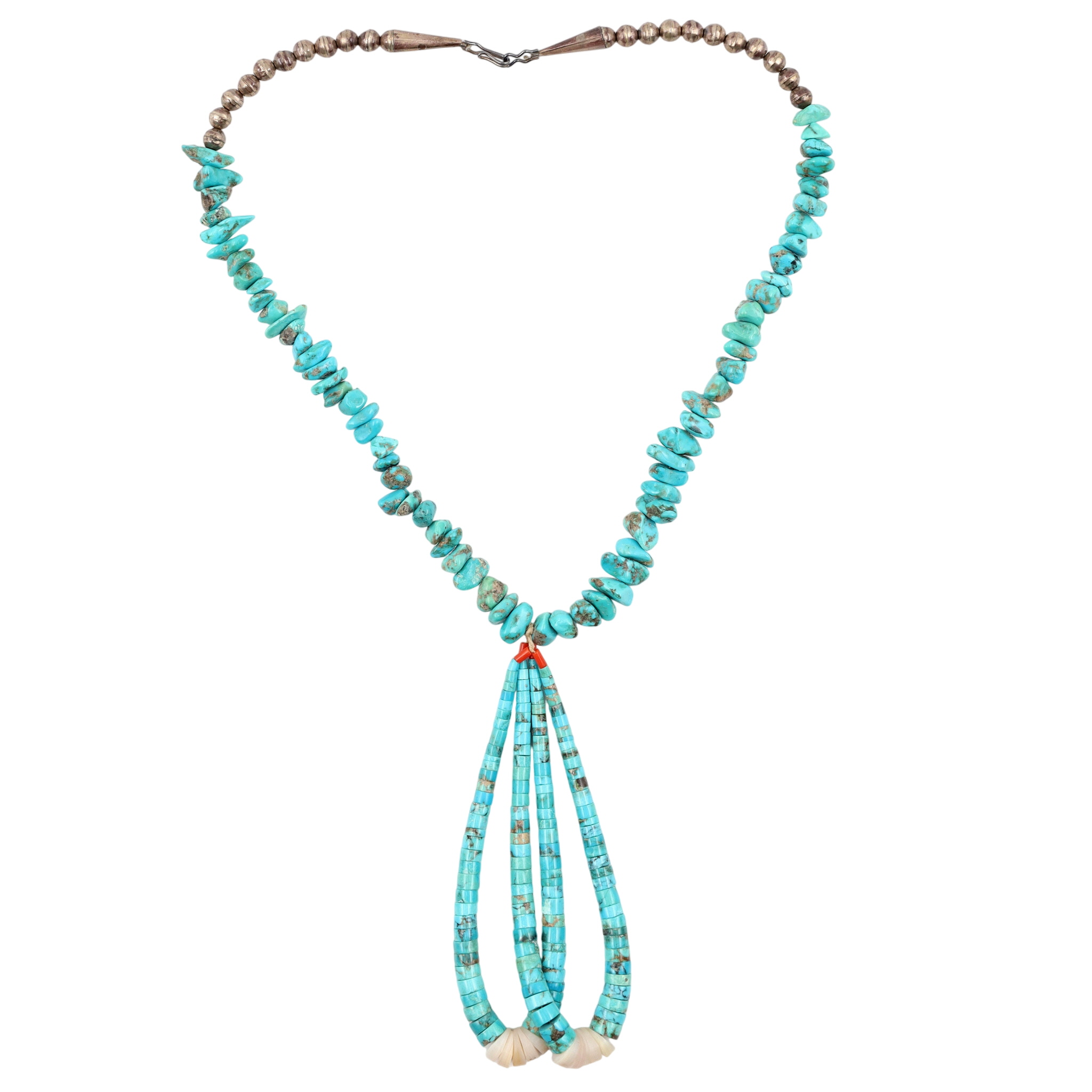 Vintage, Large Santo Domingo Sterling and Turquoise Chunk Necklace and Shell, Turquoise, and Coral Heishi Jaclas – 156g – 26.5″ from end to end (excludes the jaclas), jaclas drop approx 6″ down from necklace. This necklace originates from an estate collection of Native American collectibles and was purchased in approximately 1974-1975.