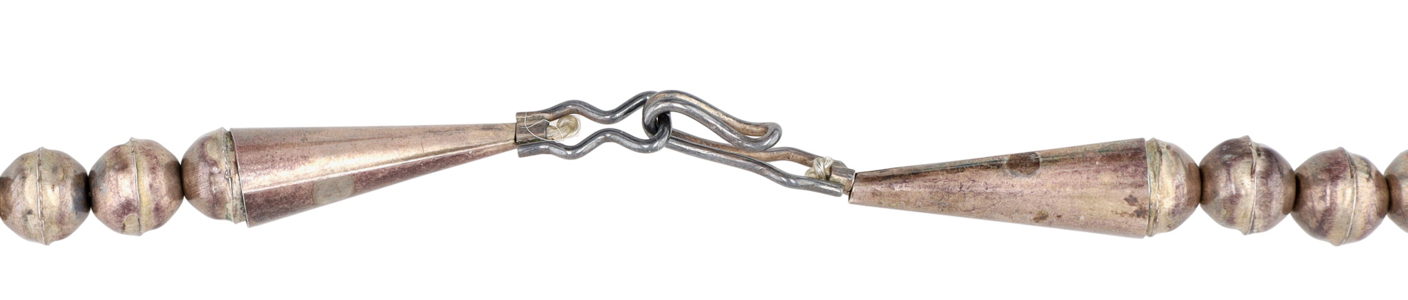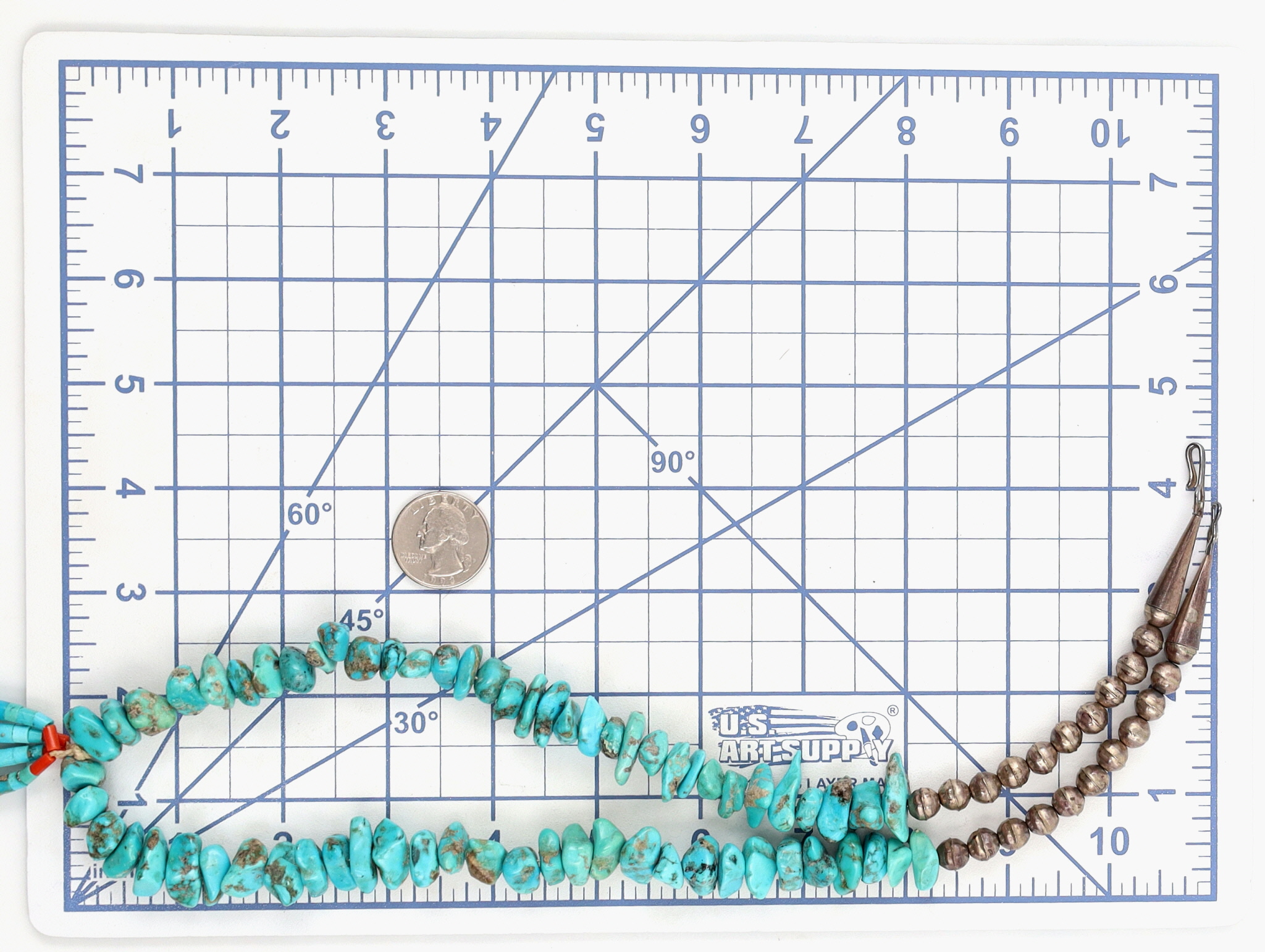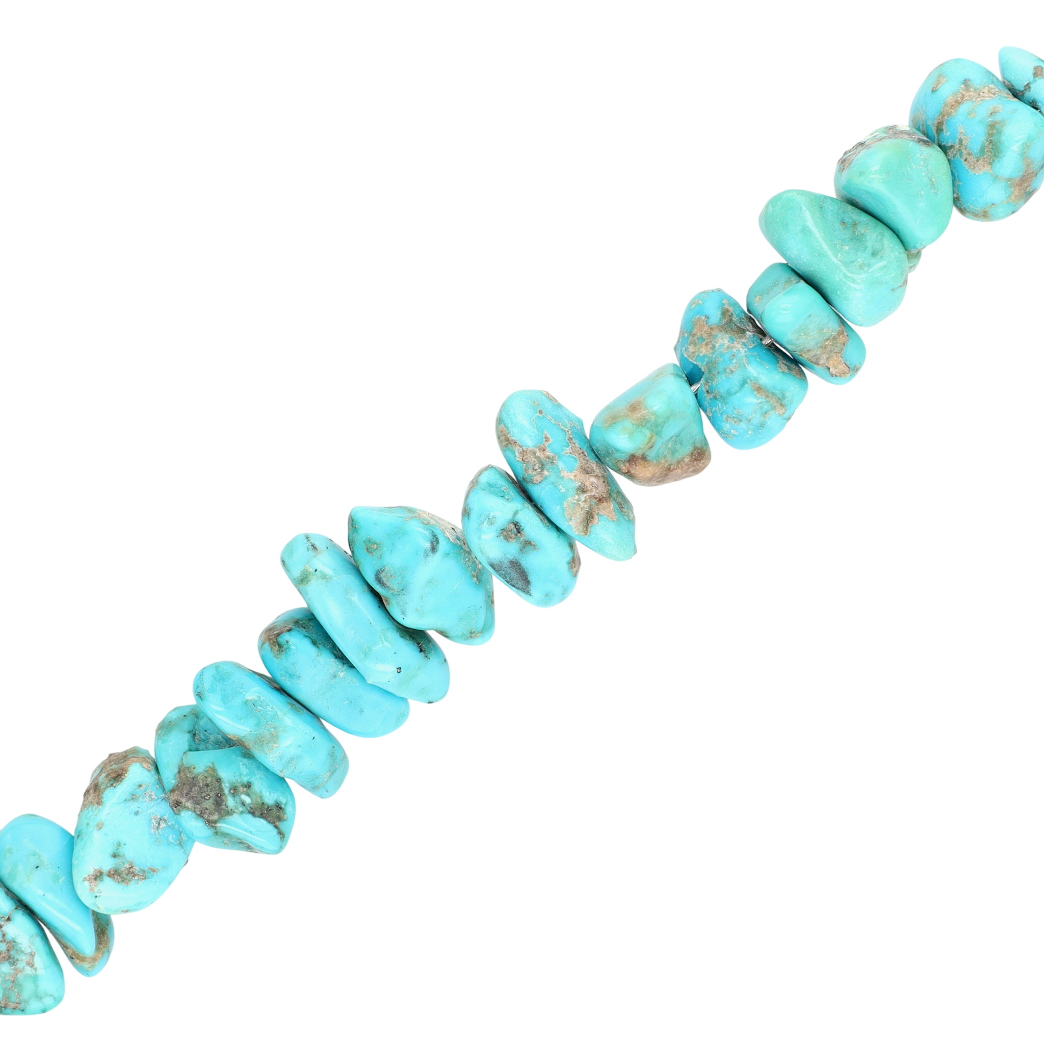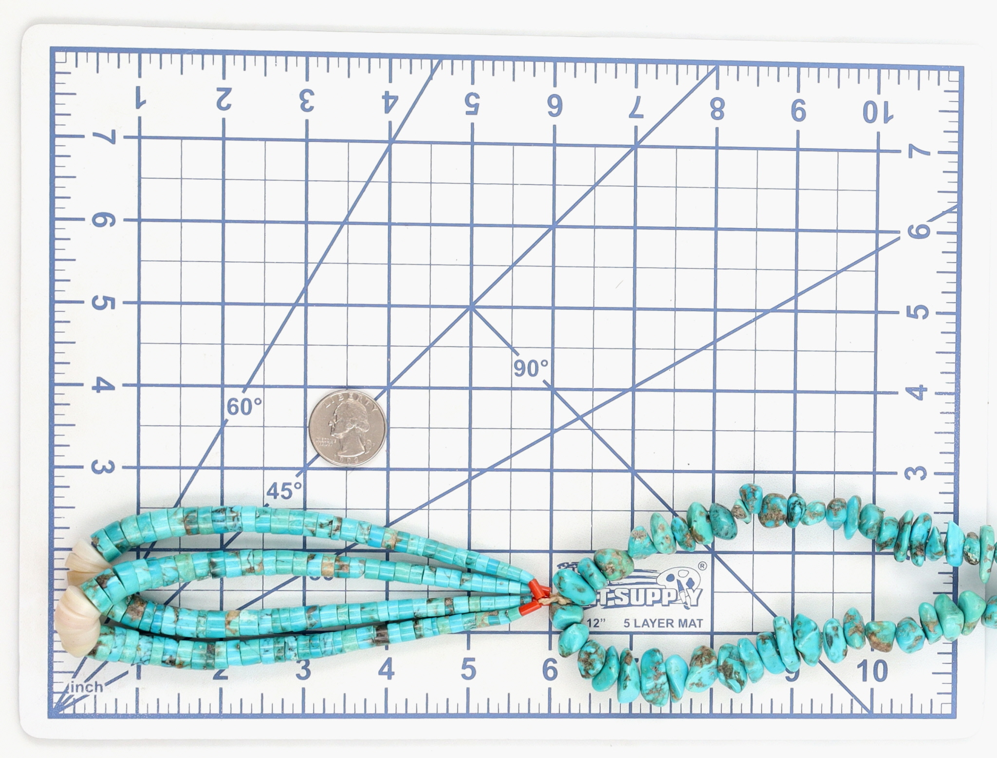 Vintage, Large Santo Domingo Sterling and Turquoise Chunk Necklace and Shell, Turquoise, and Coral Heishi Jaclas – 156g – 26.5″ from end to end (excludes the jaclas), jaclas drop approx 6″ down from necklace. This necklace originates from an estate collection of Native American collectibles and was purchased in approximately 1974-1975.