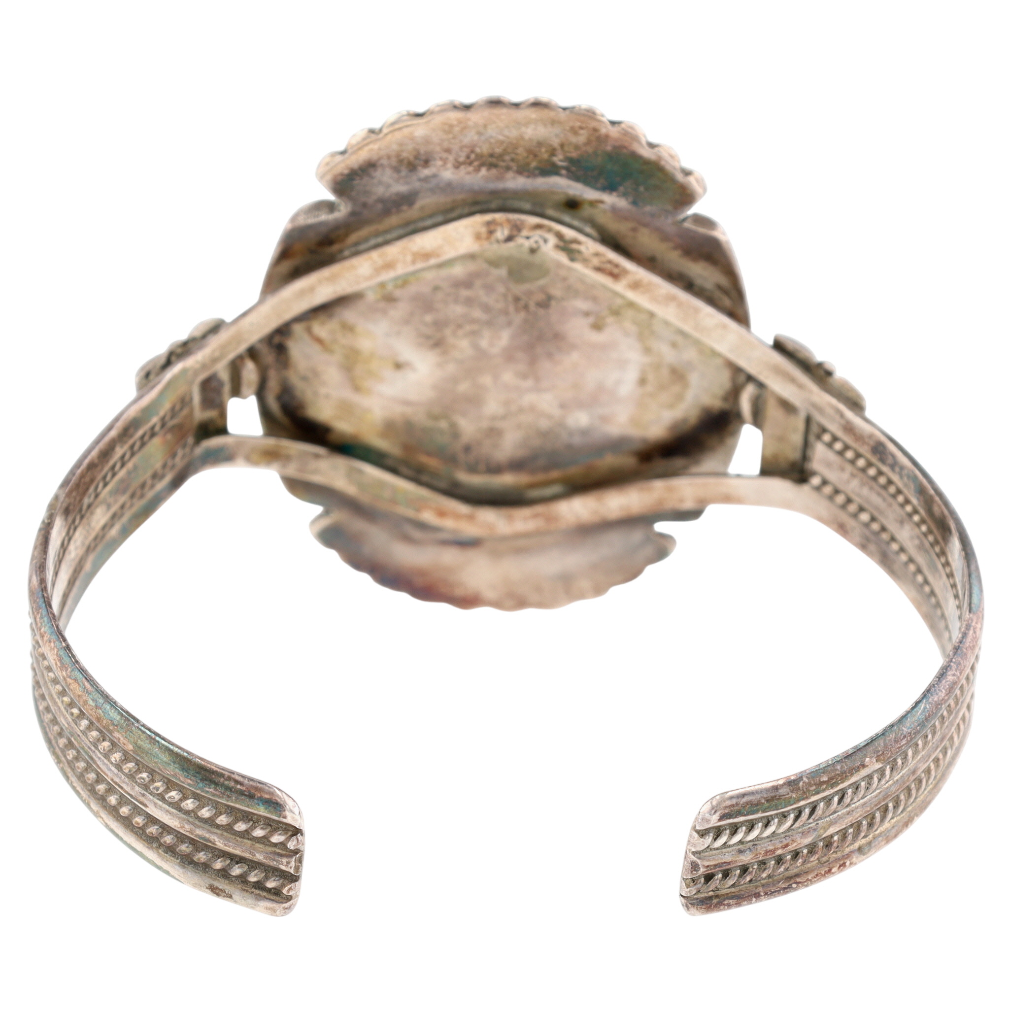 Beverly Etsate Vintage Zuni Sterling and Multistone (Coral, Turquoise, Jet, Shell) Raised Inlay Mudhead Dancer Cuff Bracelet – 30.9g – Note: Cuff is hand signed – able to make out Etsate and Zuni, but unable to decipher the writing that is before ‘Etsate’ – believed to be Beverly Etsate based on the signature design of cuff and writing – see photos.