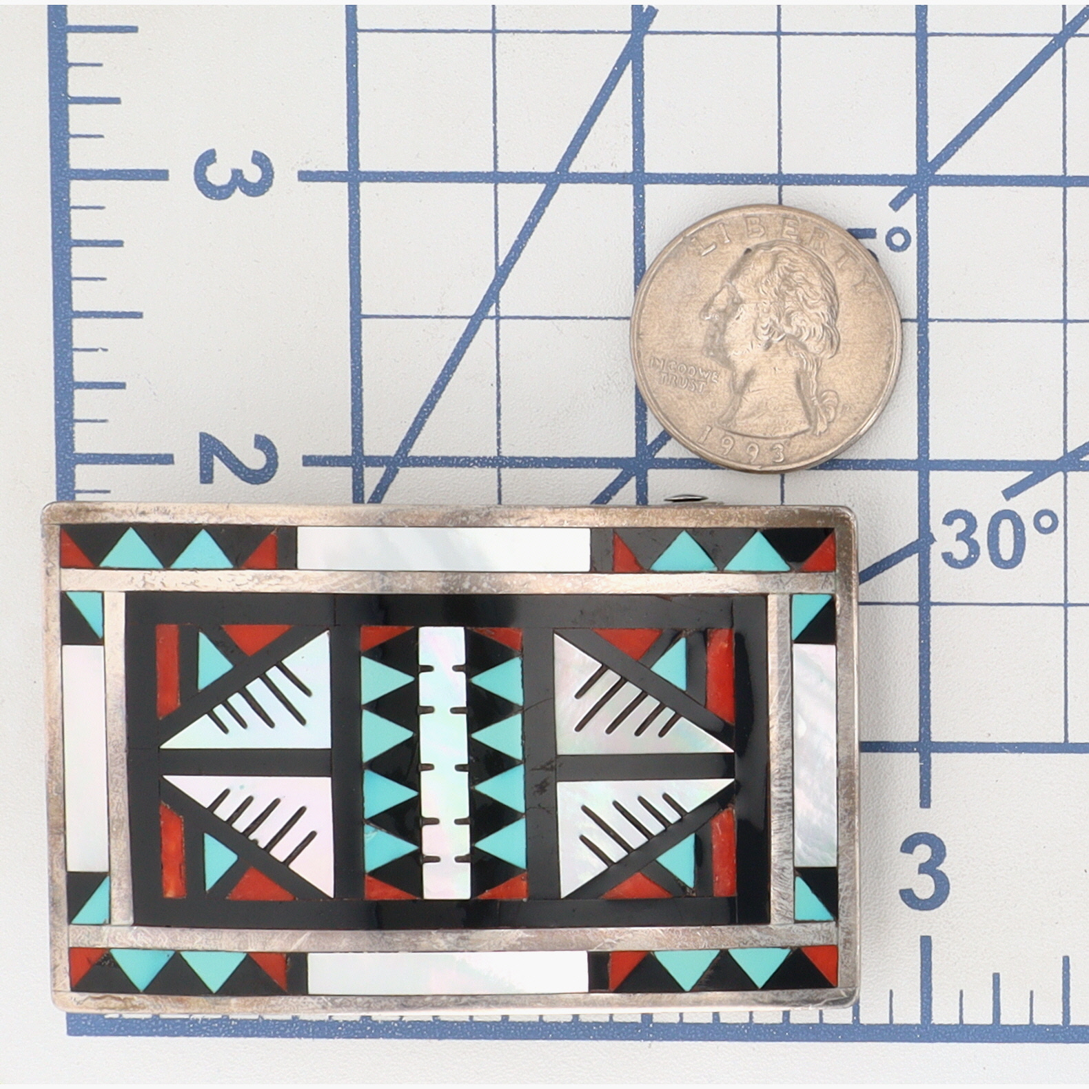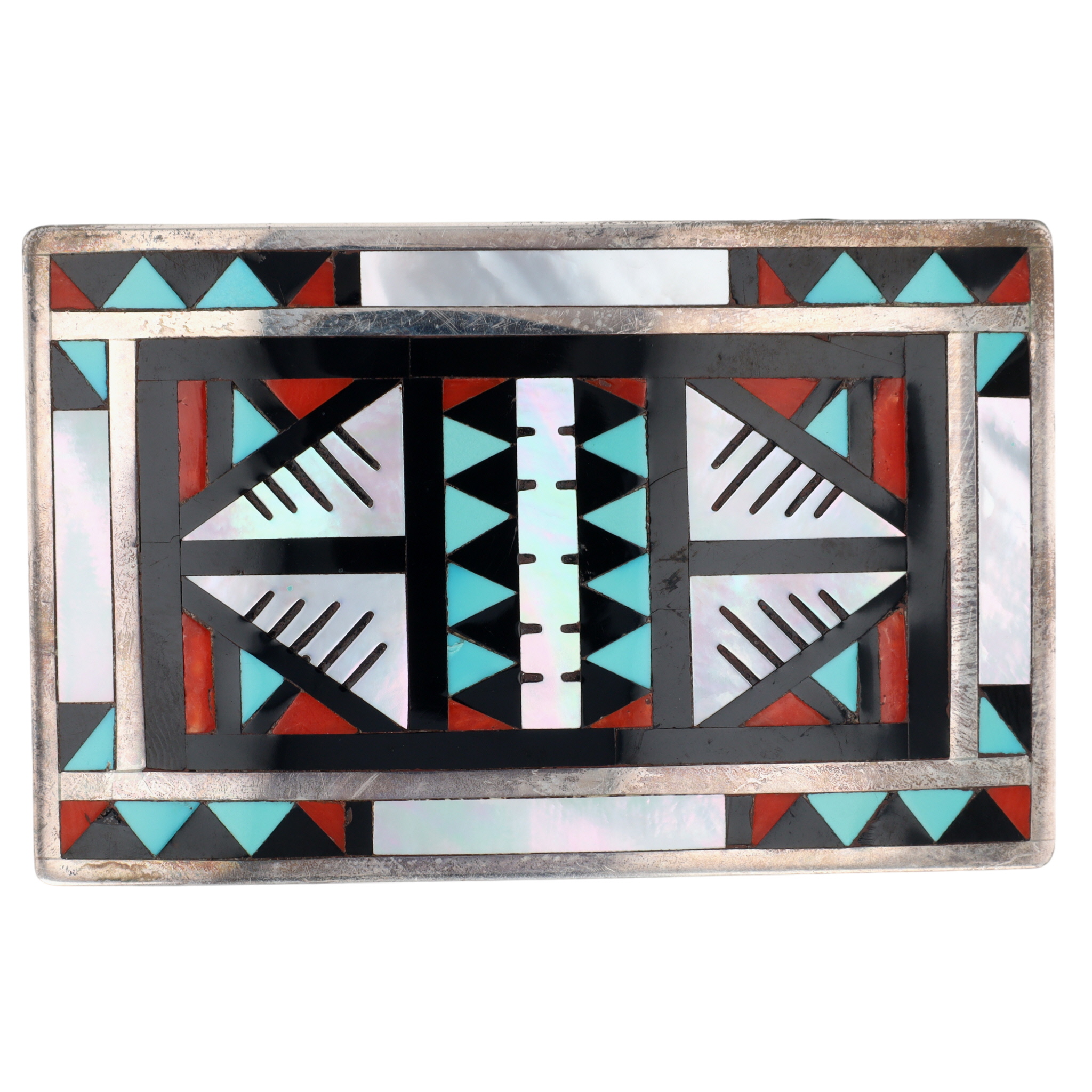 Alex & Marylita Boone Zuni Sterling Multistone (Turquoise, Coral, Mother of Pearl, Jet) Mosaic Inlay Belt Buckle – 36.1g