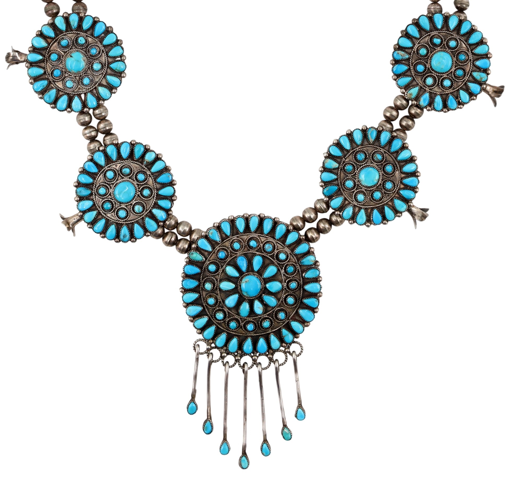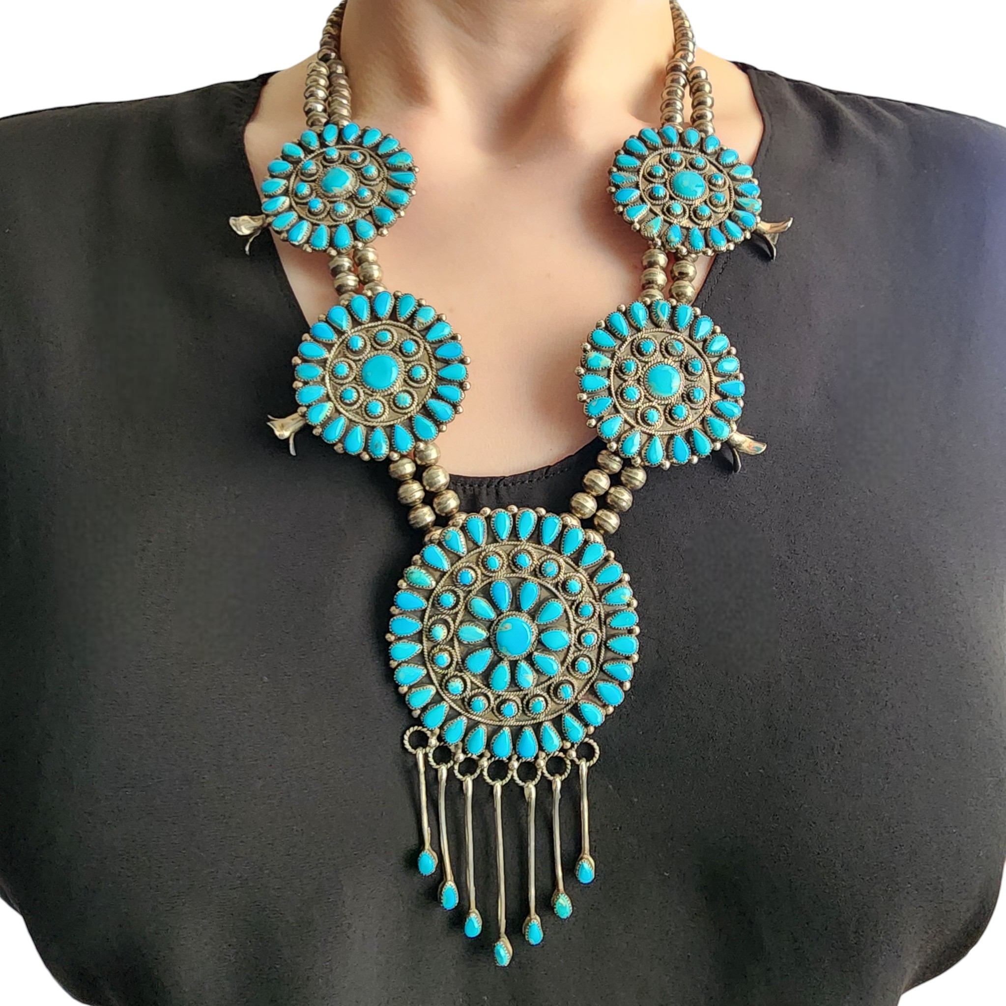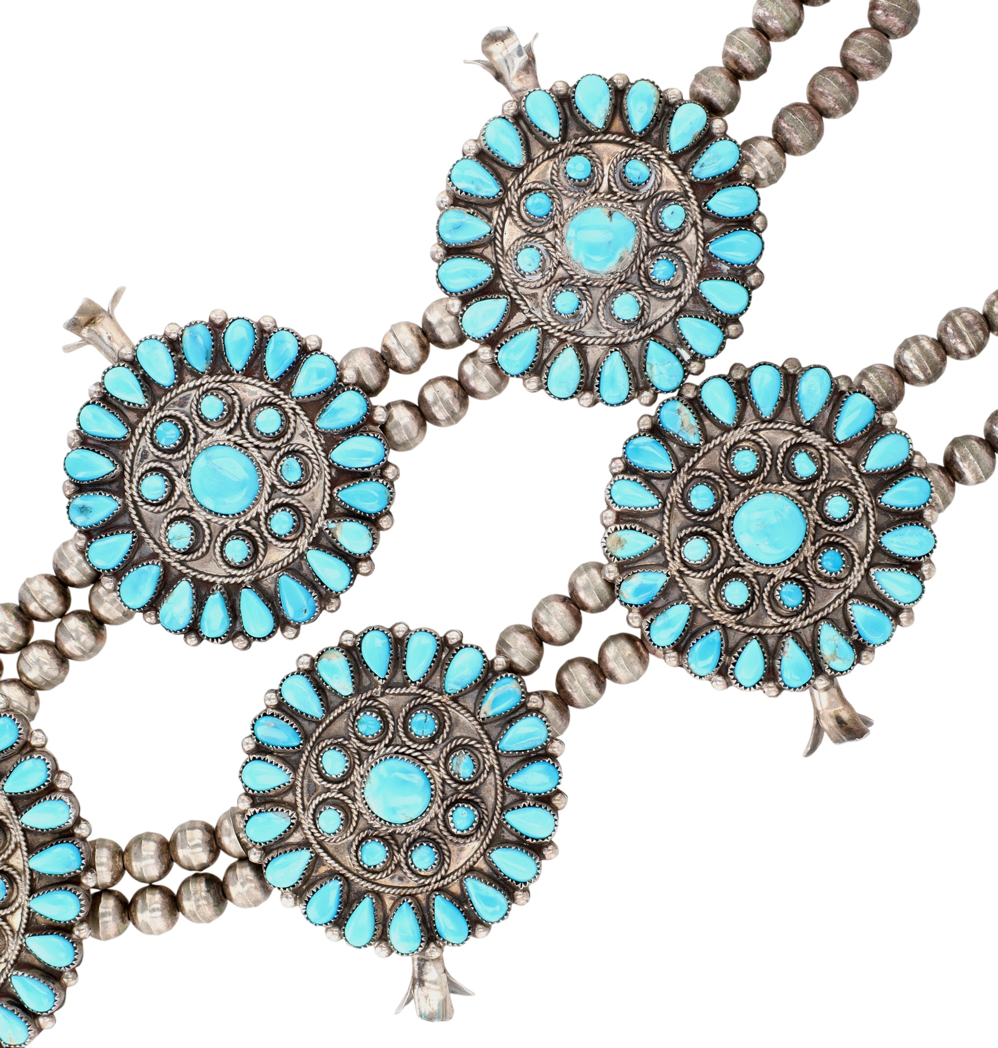 Victor Moses Begay Navajo Sterling Turquoise Cluster Station Squash Blossom Necklace – 134g – approx. 24″ from end to end – center cluster has approx. 2.54″ diameter with longest dangles at 2″.