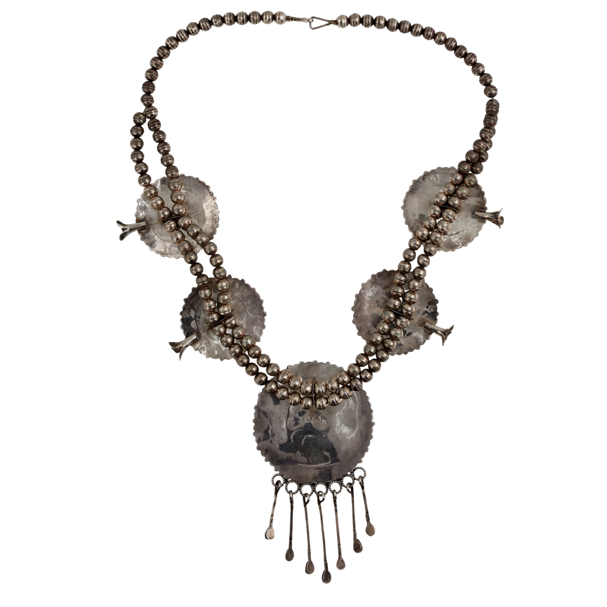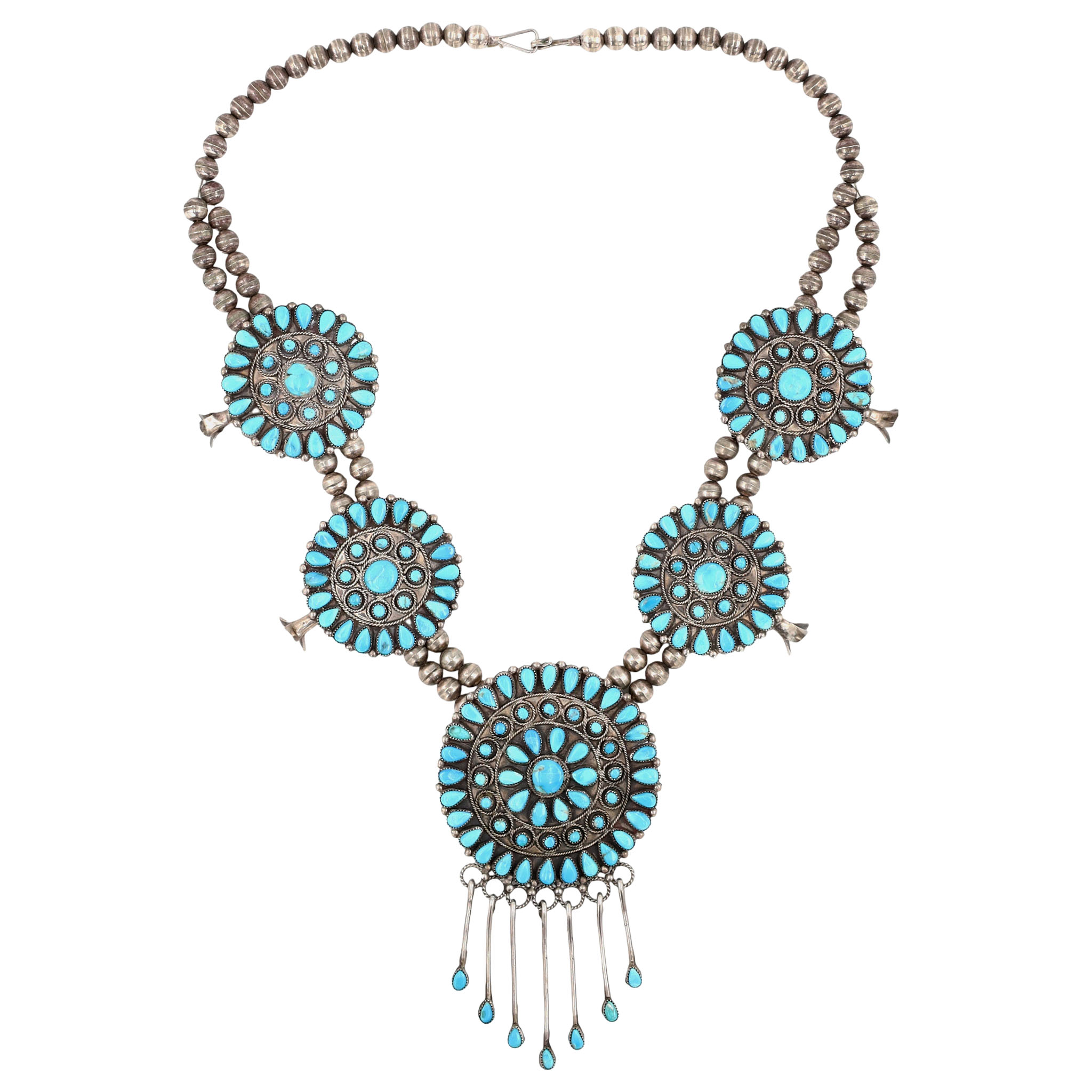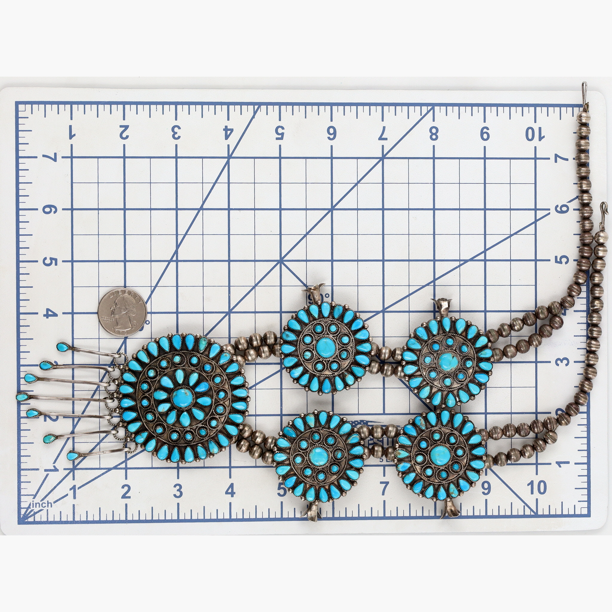 Victor Moses Begay Navajo Sterling Turquoise Cluster Station Squash Blossom Necklace – 134g – approx. 24″ from end to end – center cluster has approx. 2.54″ diameter with longest dangles at 2″.