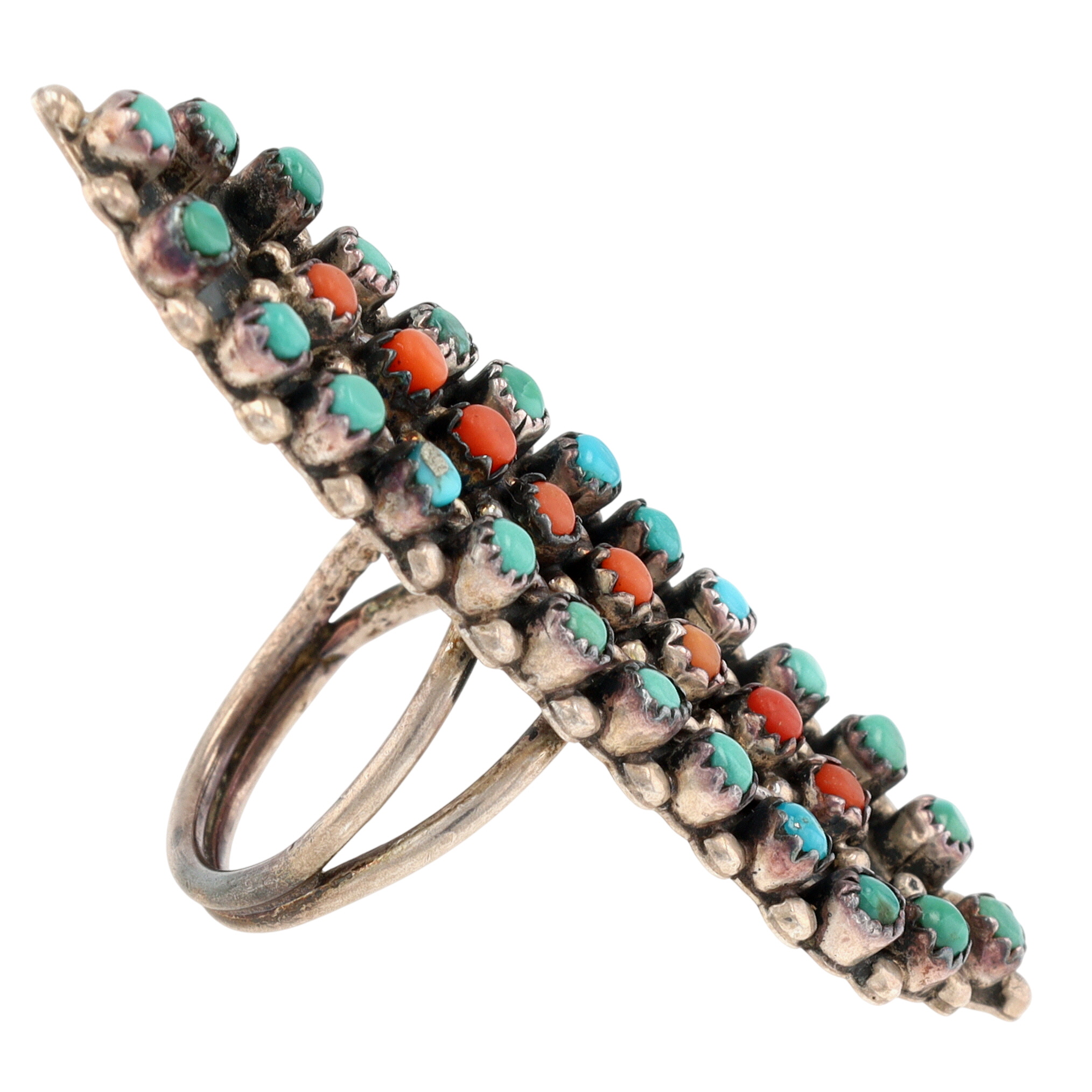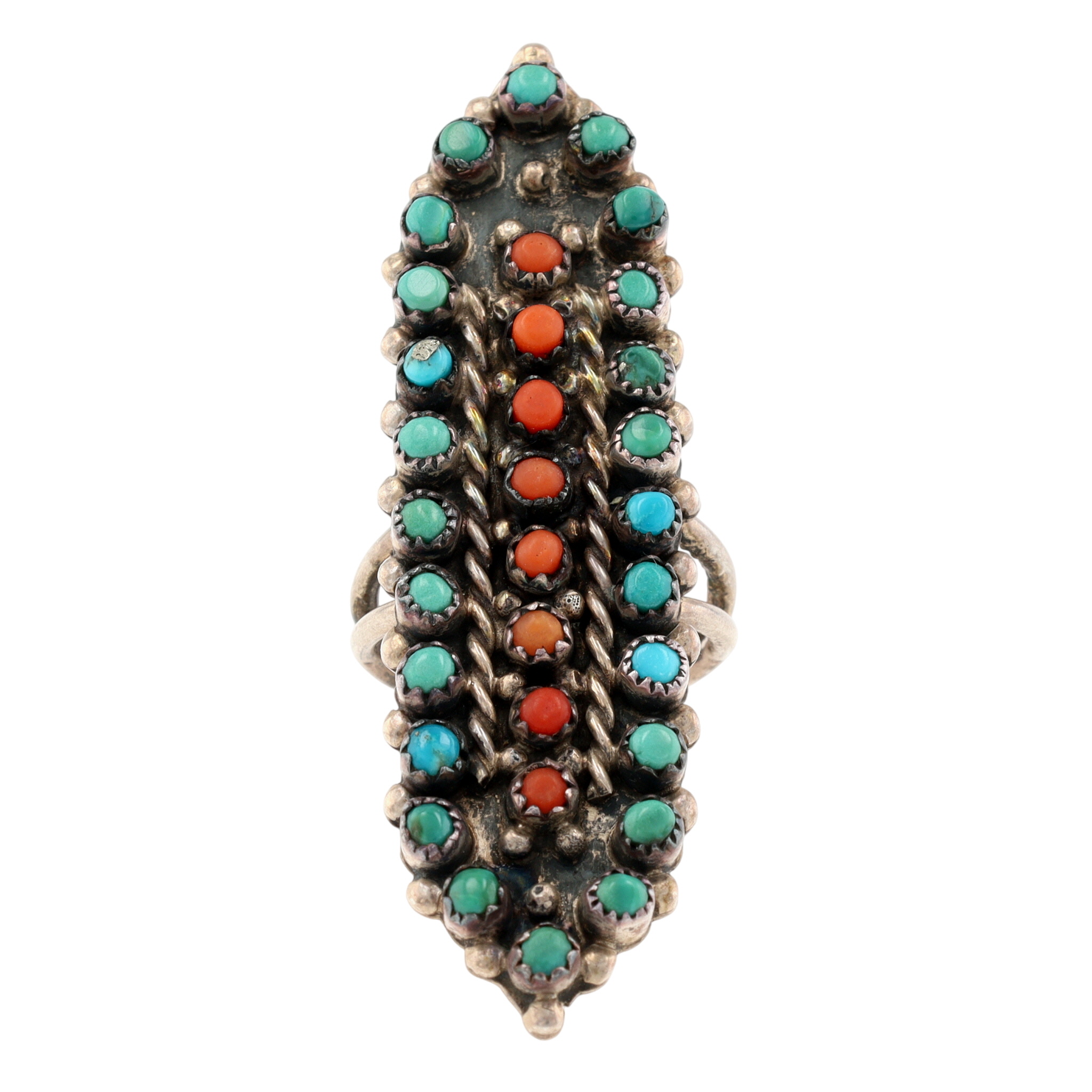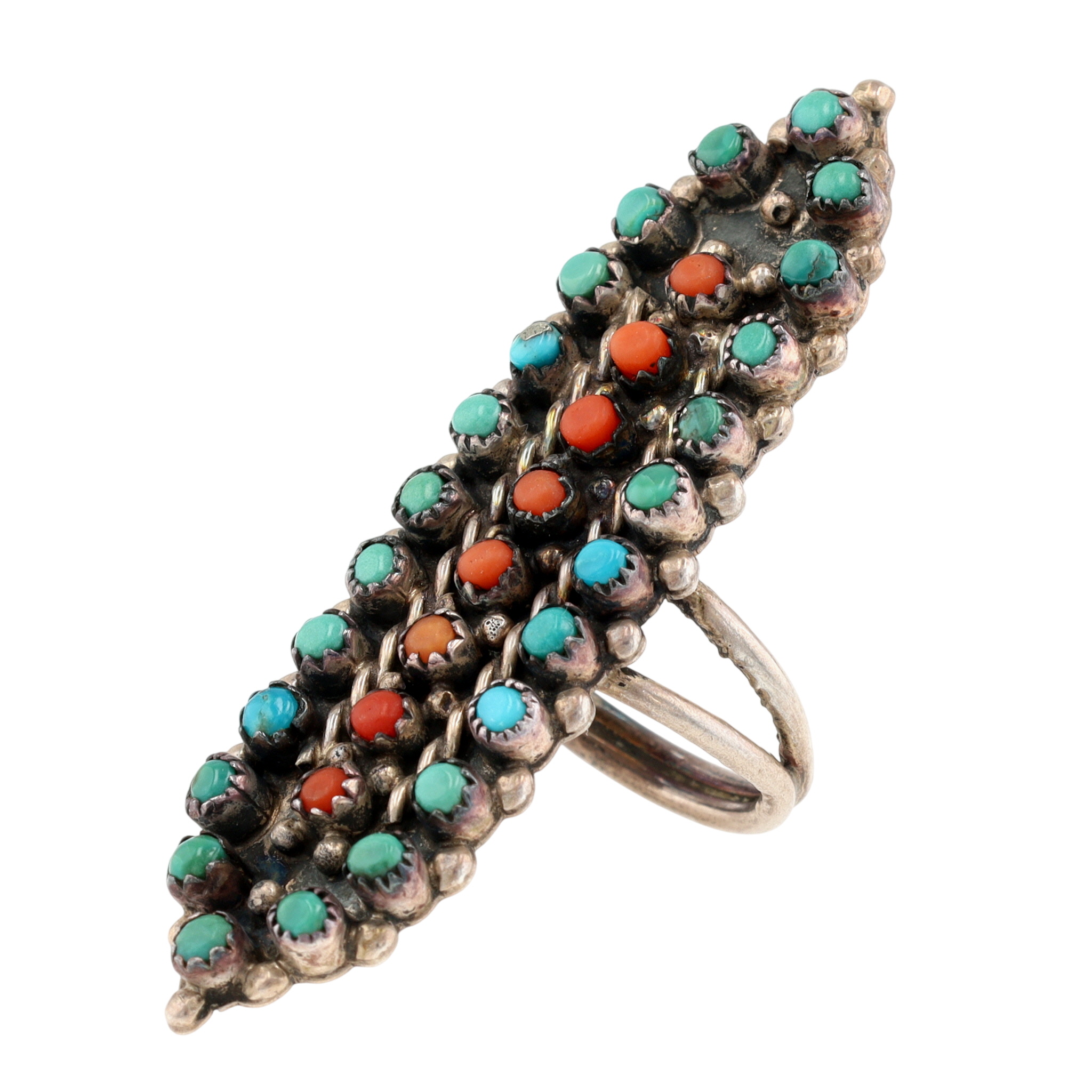 Fred Yazzie Navajo Sterling Turquoise Coral Long Cluster Ring Sz 7.5 – 12.3g – approx 2.3″ long – Hand signed “Made By Fred Yazzie”