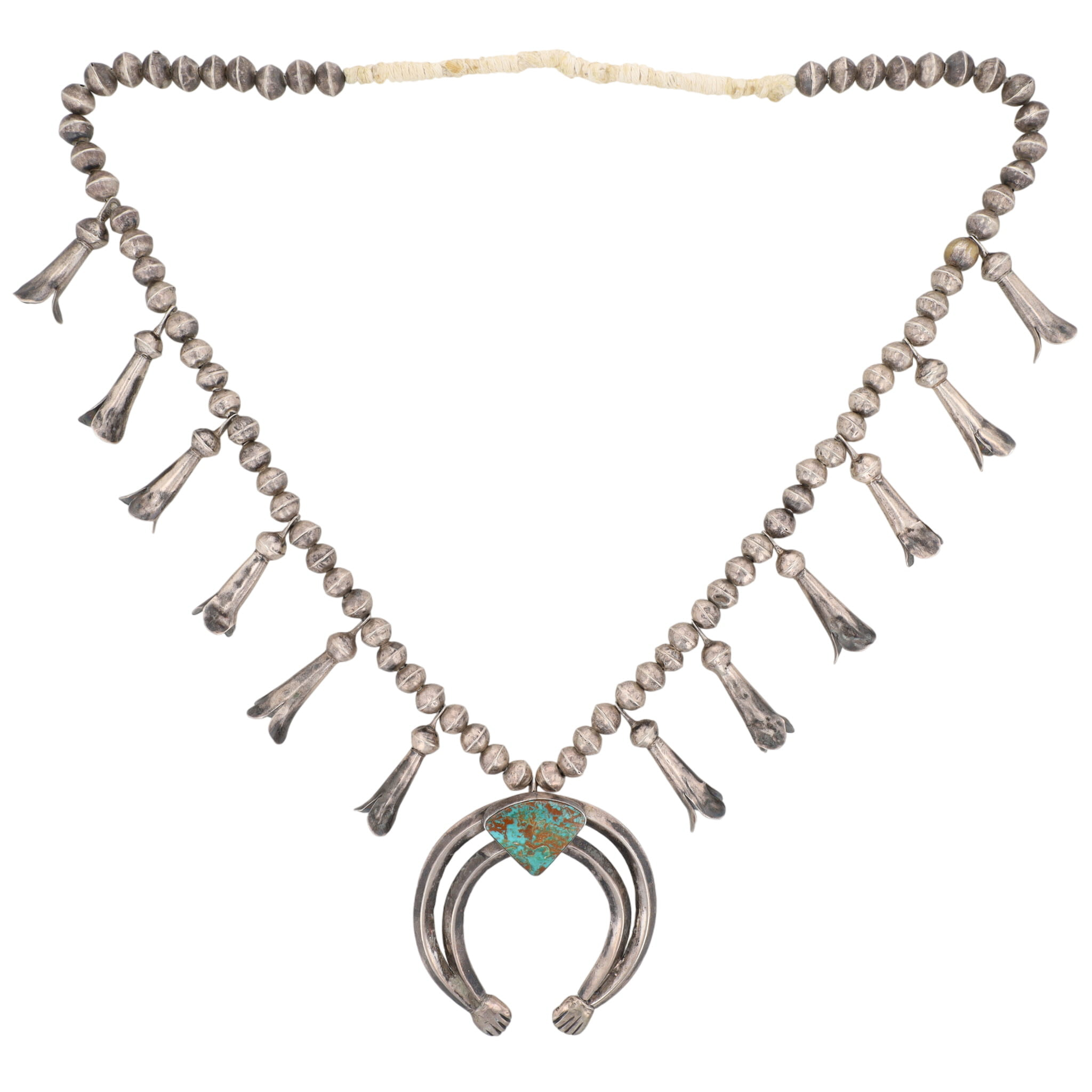 Vintage, Old Navajo Sterling Turquoise Squash Blossom Necklace – 83g – approx. 26″ from end to end – Note: Necklace is strung on twine/string, nice movement, beautiful chocolate brown matrix in the turquoise.
