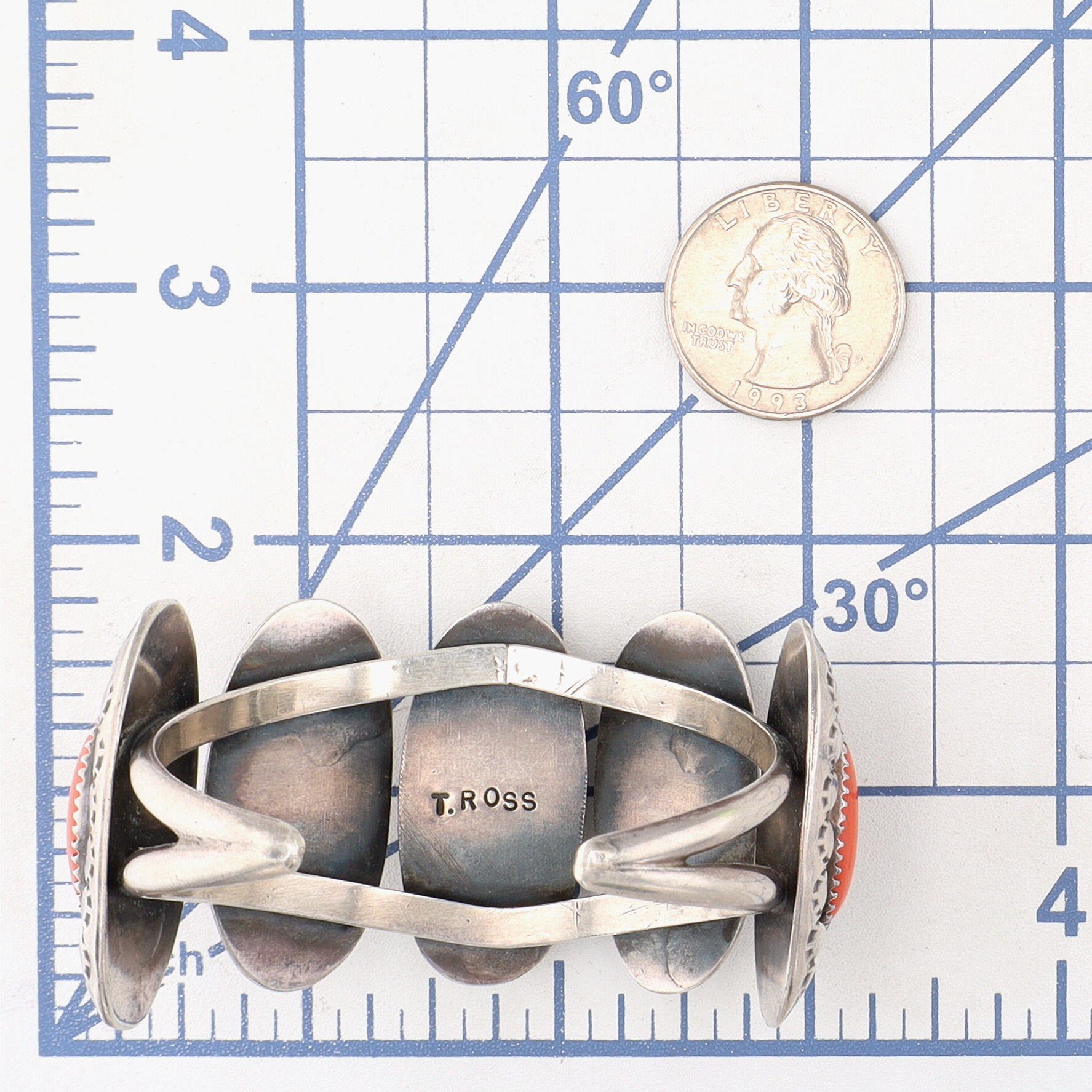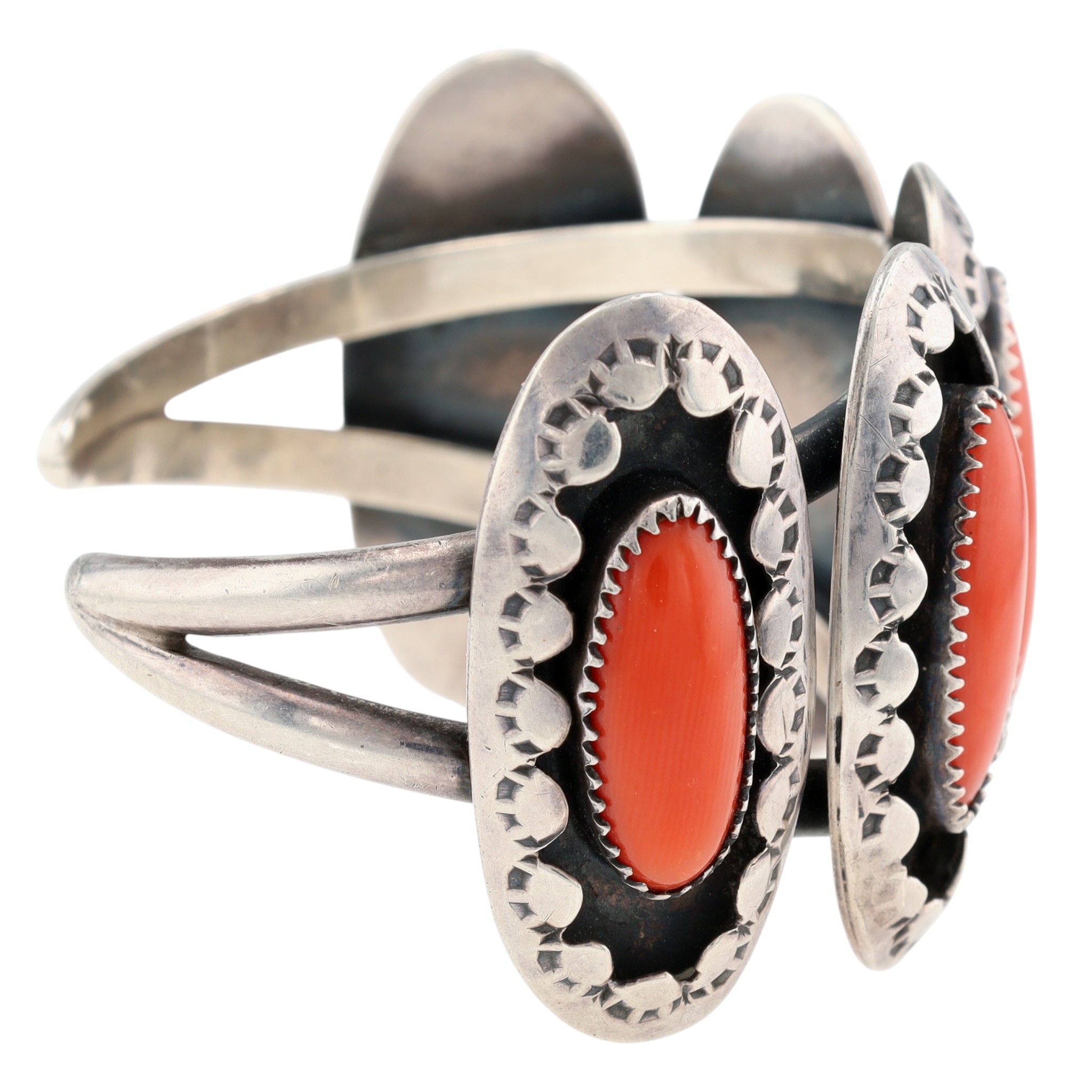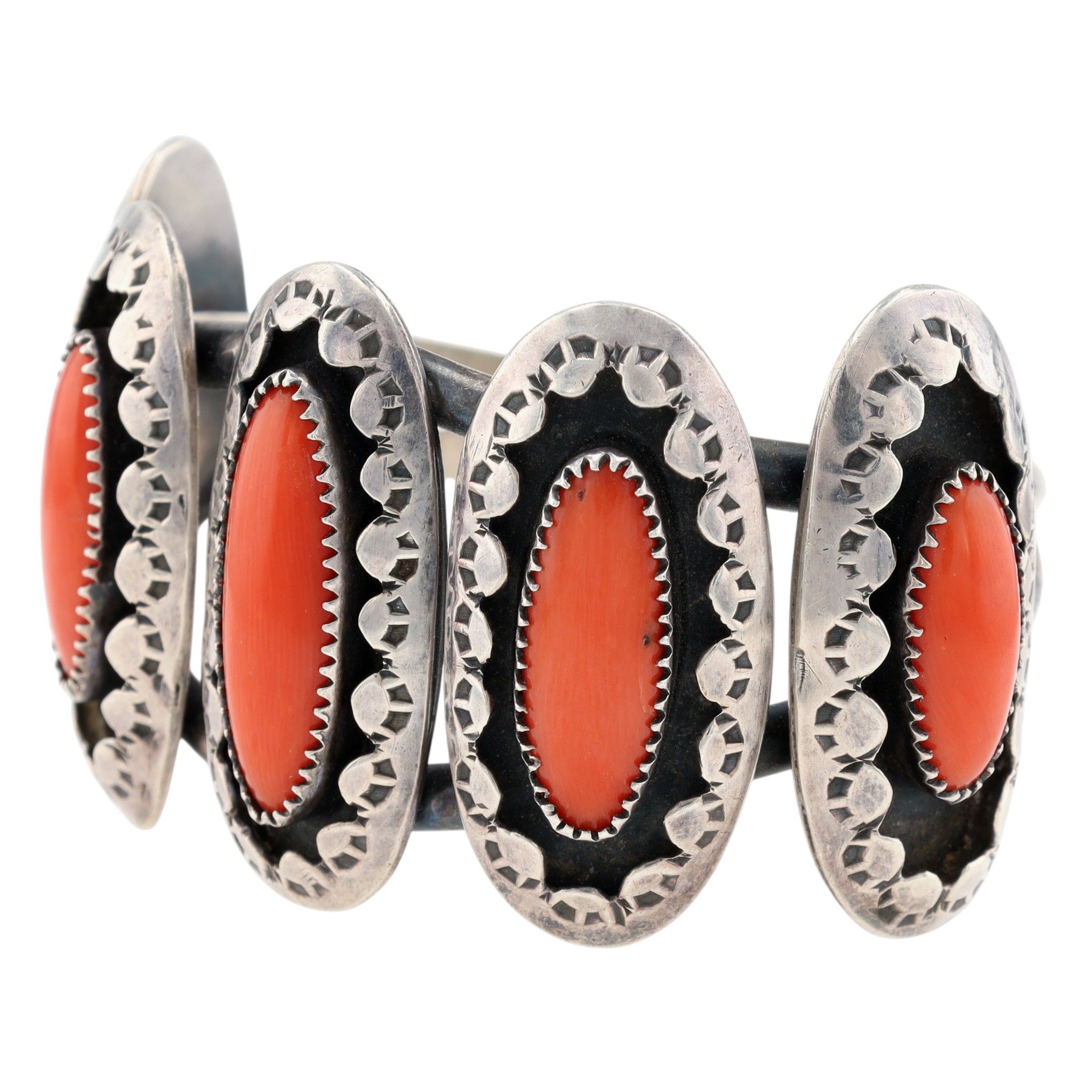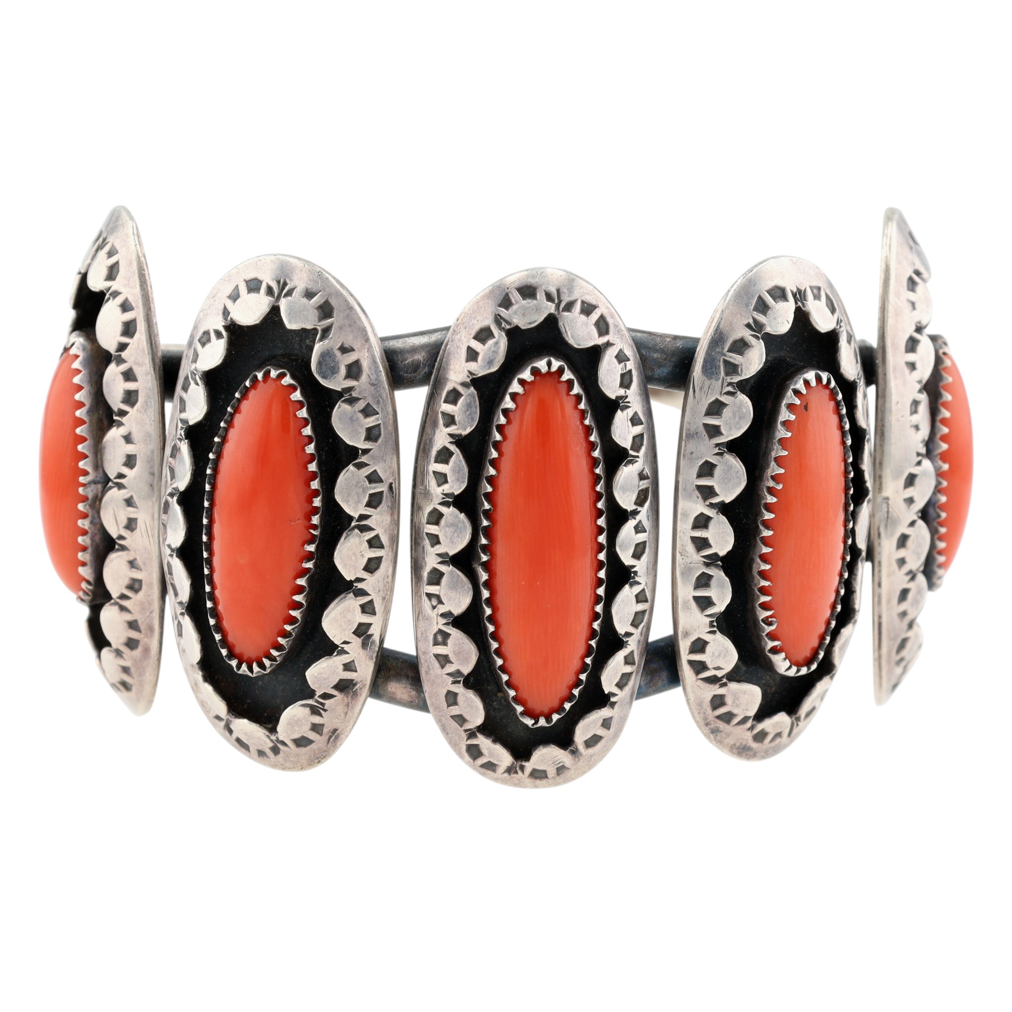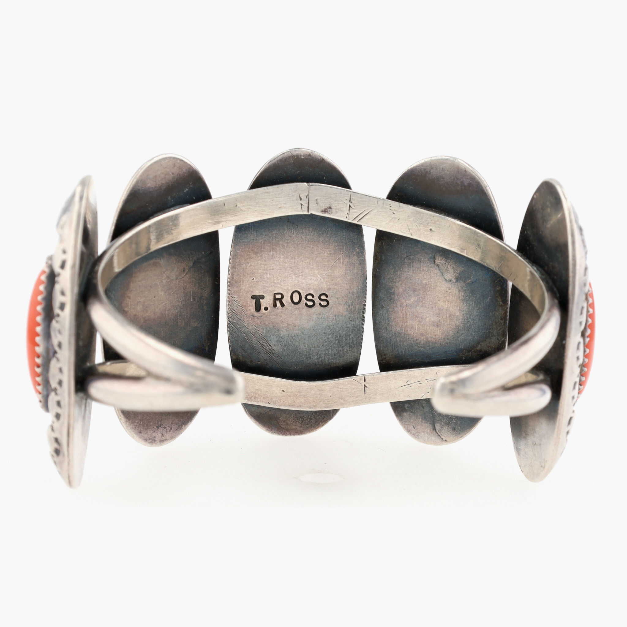 T. Ross Navajo Sterling Coral Stamped Shadowbox Cuff Bracelet – 51.3g