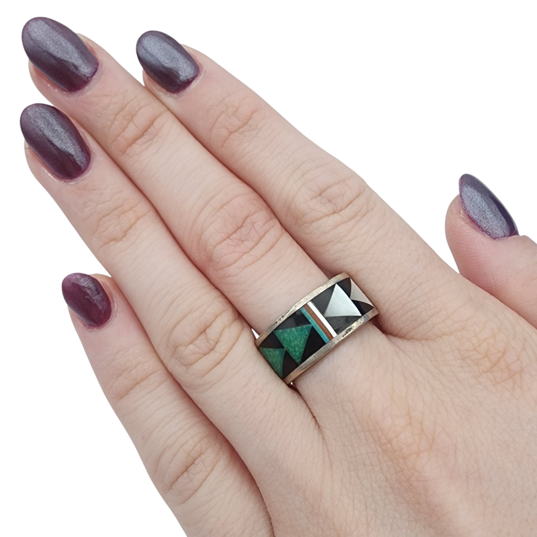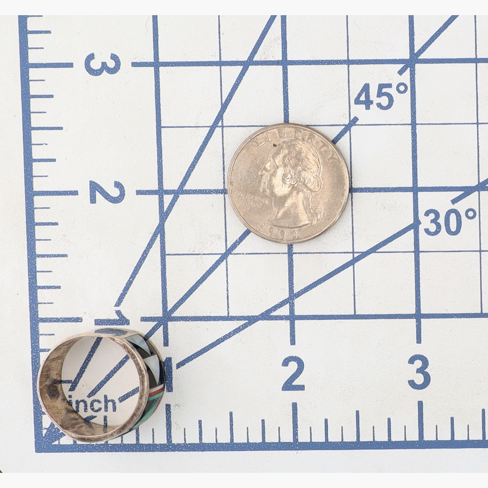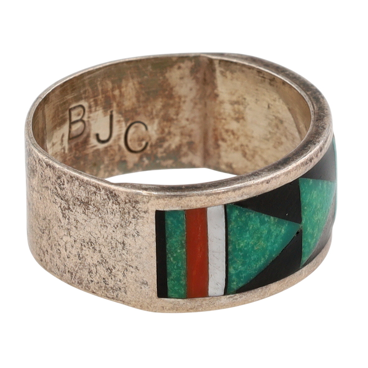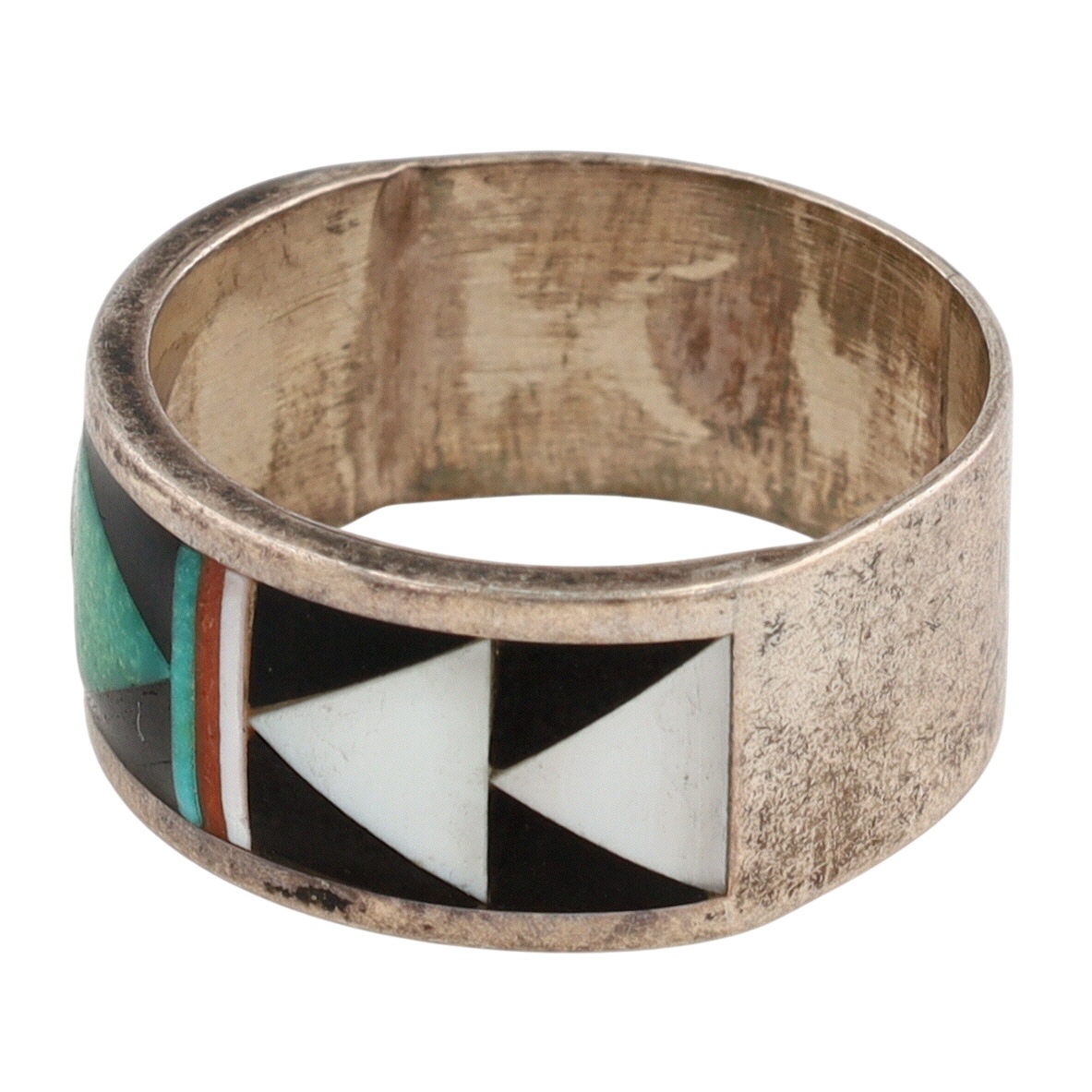 Bernard Cachini Zuni Sterling Multistone (Turquoise, Coral, Mother of Pearl, Jet/Onyx) Inlay Ring Sz 9.5 – 4.4g