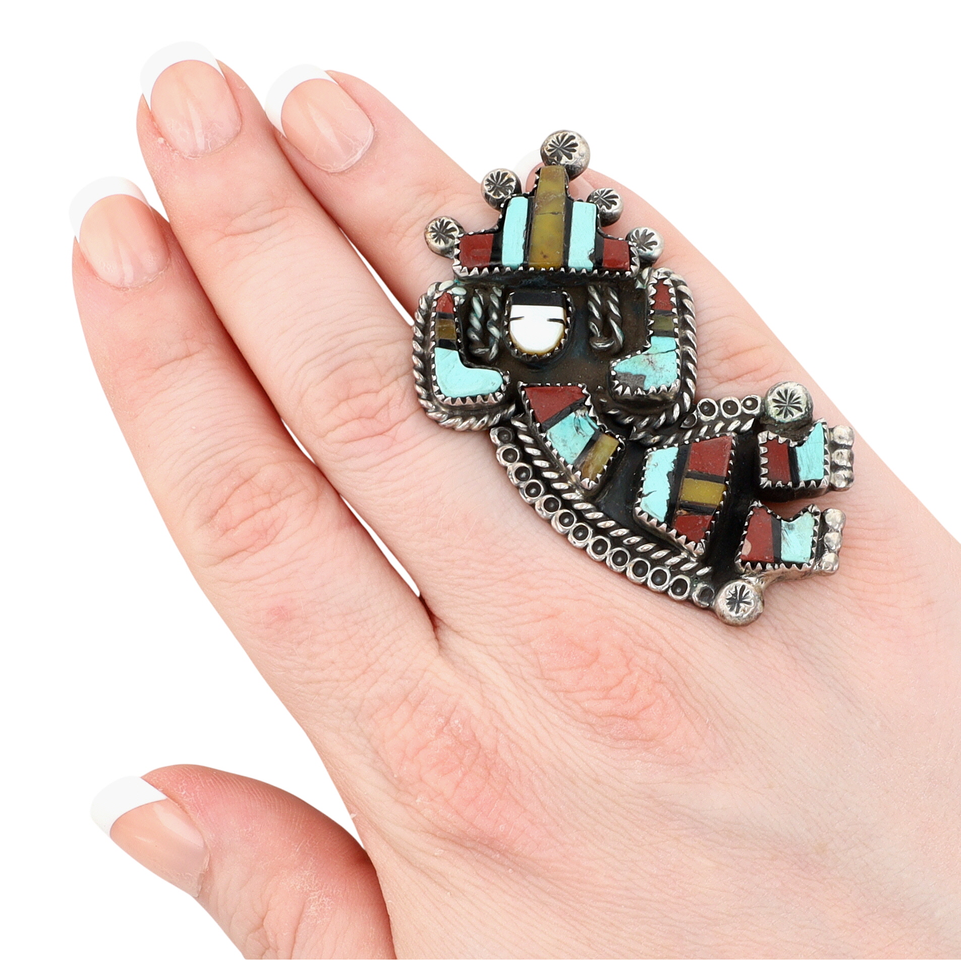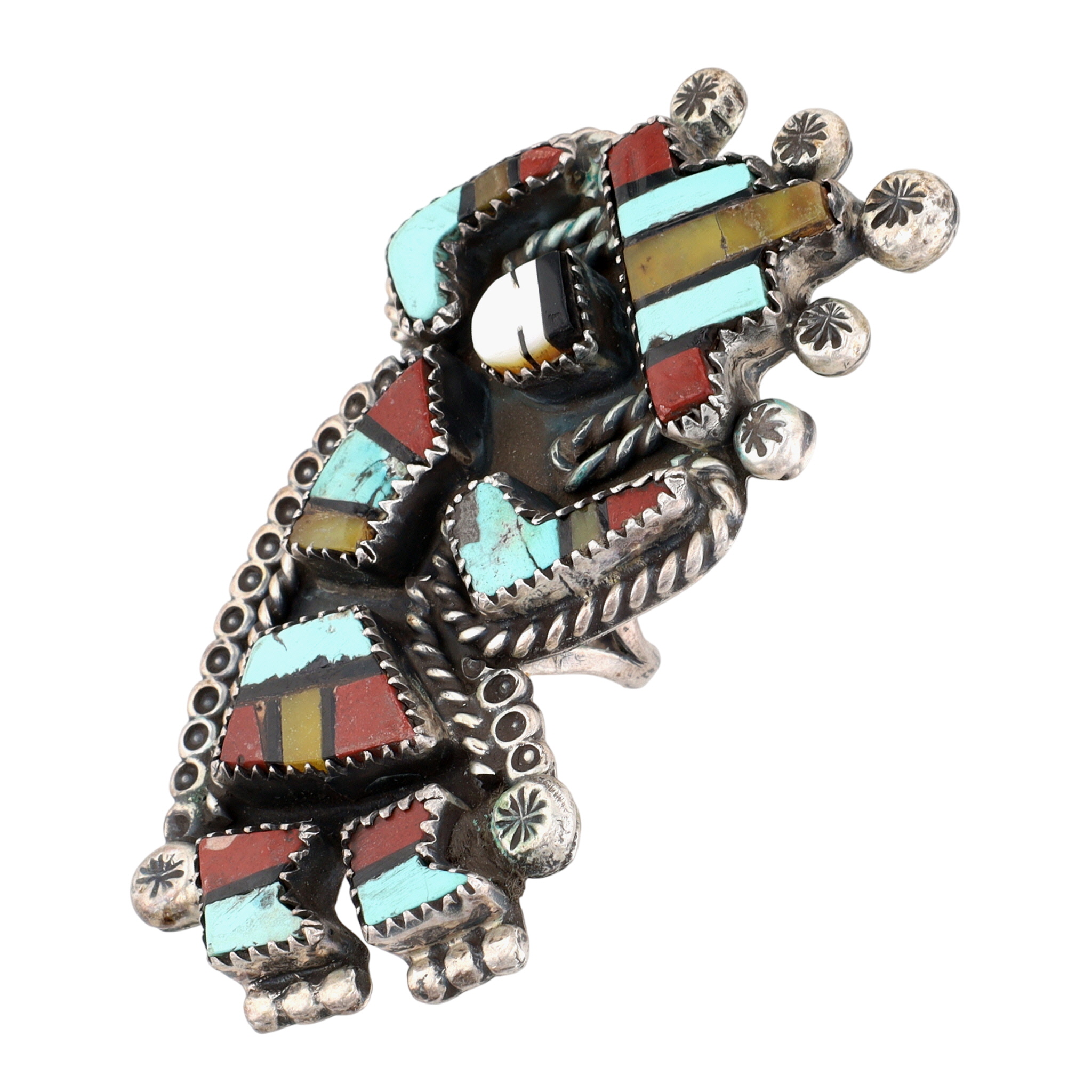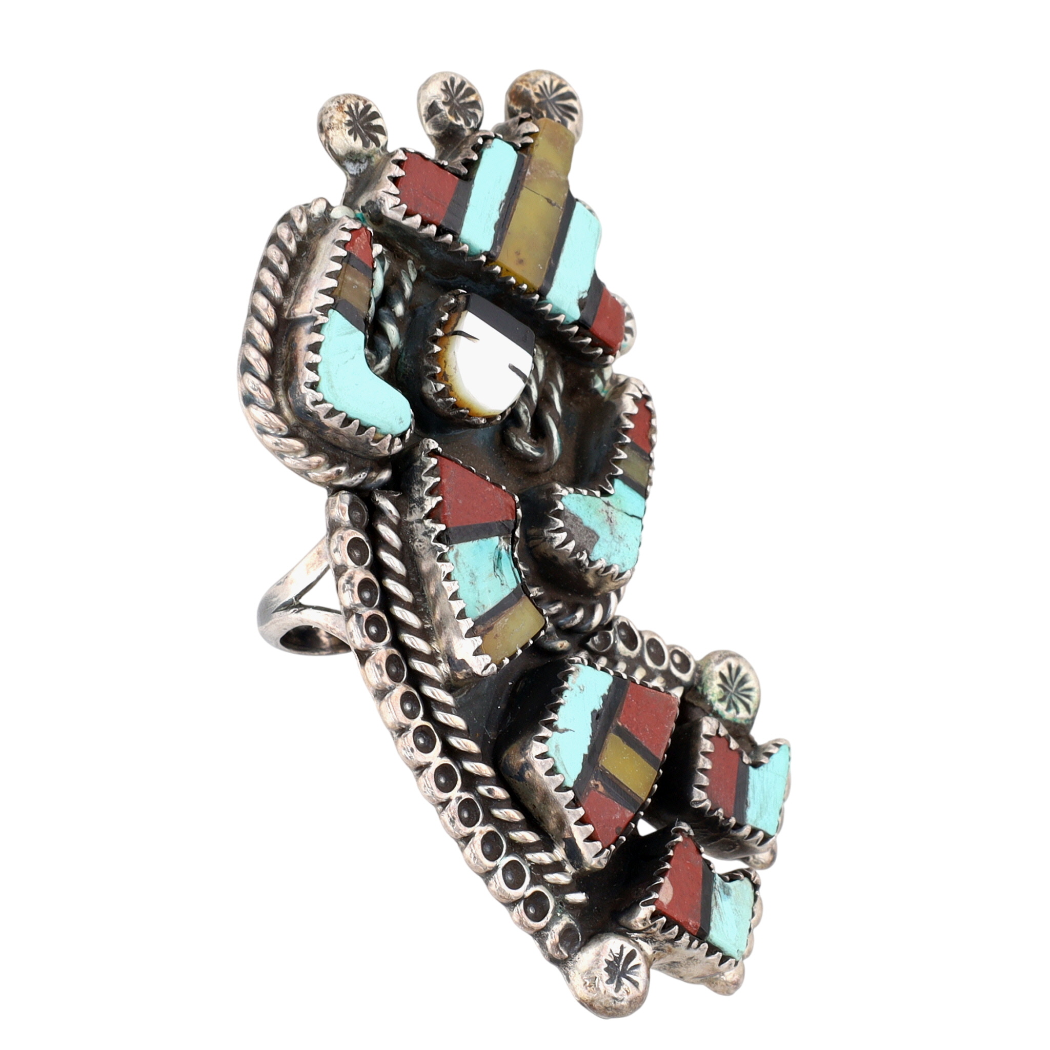 BIG Vintage Zuni Sterling Multistone (Turquoise, Pipestone, Serpentine, Mother of Pearl, Jet) Inlay Rainbow Man Ring Sz 6.25 | Weight: 24.4g – Rainbow Man Measures approx. 2.5″ tall | Here we have an absolutely phenomenal piece of history and wearable art. Both the ring and coordinating cuff bracelet (found in lot 349) originates from an estate collection of Native American collectibles. The ring will come with a copy of the original receipt and original certificate of guarantee from a now-closed trading post in Nevada. The cuff/ring set was purchased in December 1975 for $735, which is equivalent to over $4,300 in today’s value (2025)!