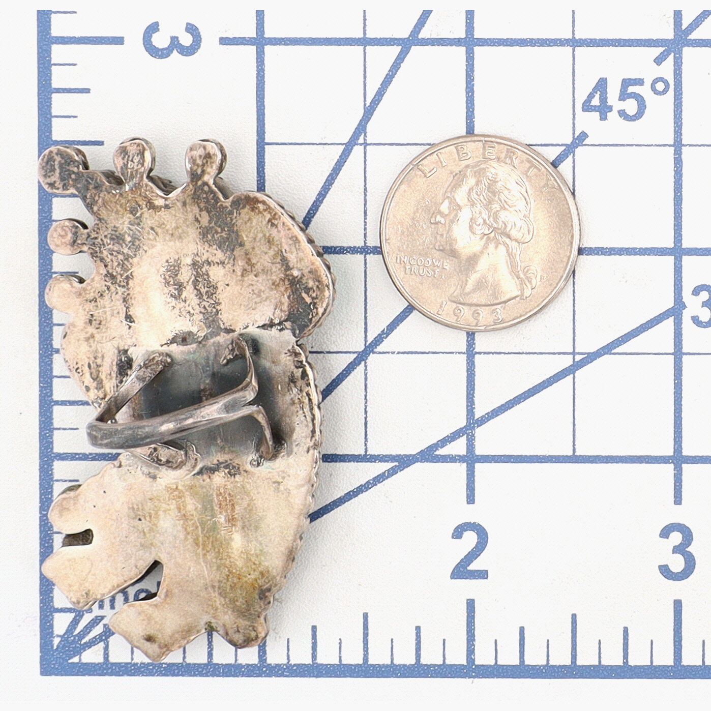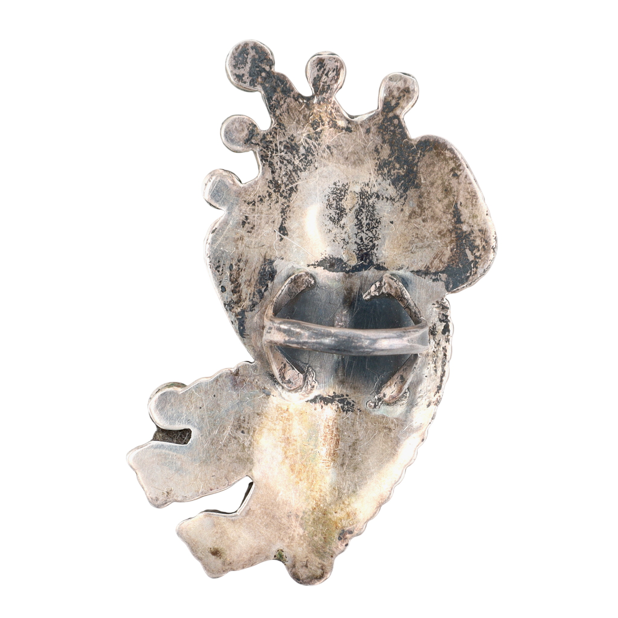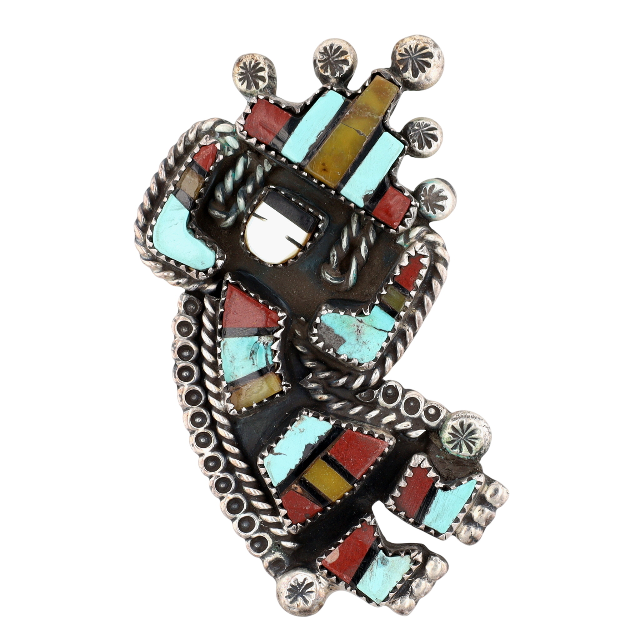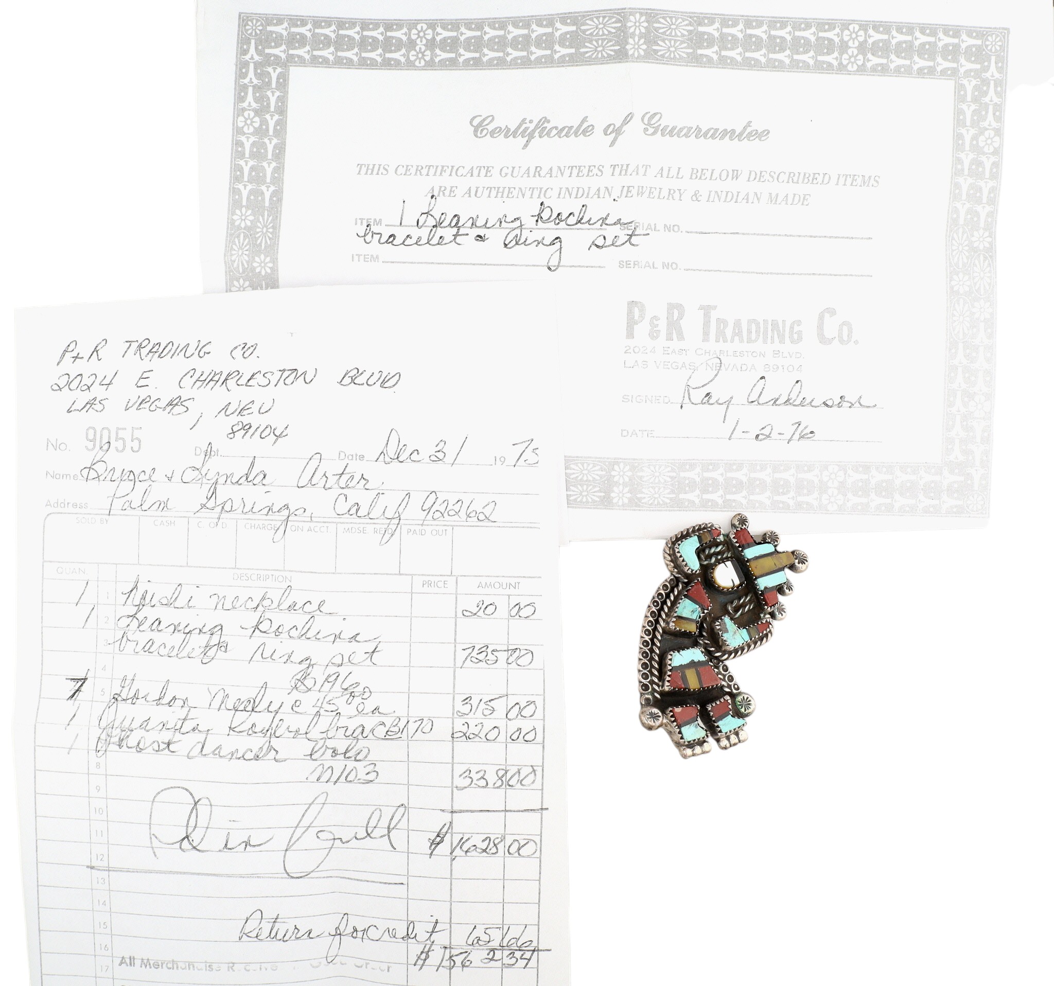 BIG Vintage Zuni Sterling Multistone (Turquoise, Pipestone, Serpentine, Mother of Pearl, Jet) Inlay Rainbow Man Ring Sz 6.25 | Weight: 24.4g – Rainbow Man Measures approx. 2.5″ tall | Here we have an absolutely phenomenal piece of history and wearable art. Both the ring and coordinating cuff bracelet (found in lot 349) originates from an estate collection of Native American collectibles. The ring will come with a copy of the original receipt and original certificate of guarantee from a now-closed trading post in Nevada. The cuff/ring set was purchased in December 1975 for $735, which is equivalent to over $4,300 in today’s value (2025)!