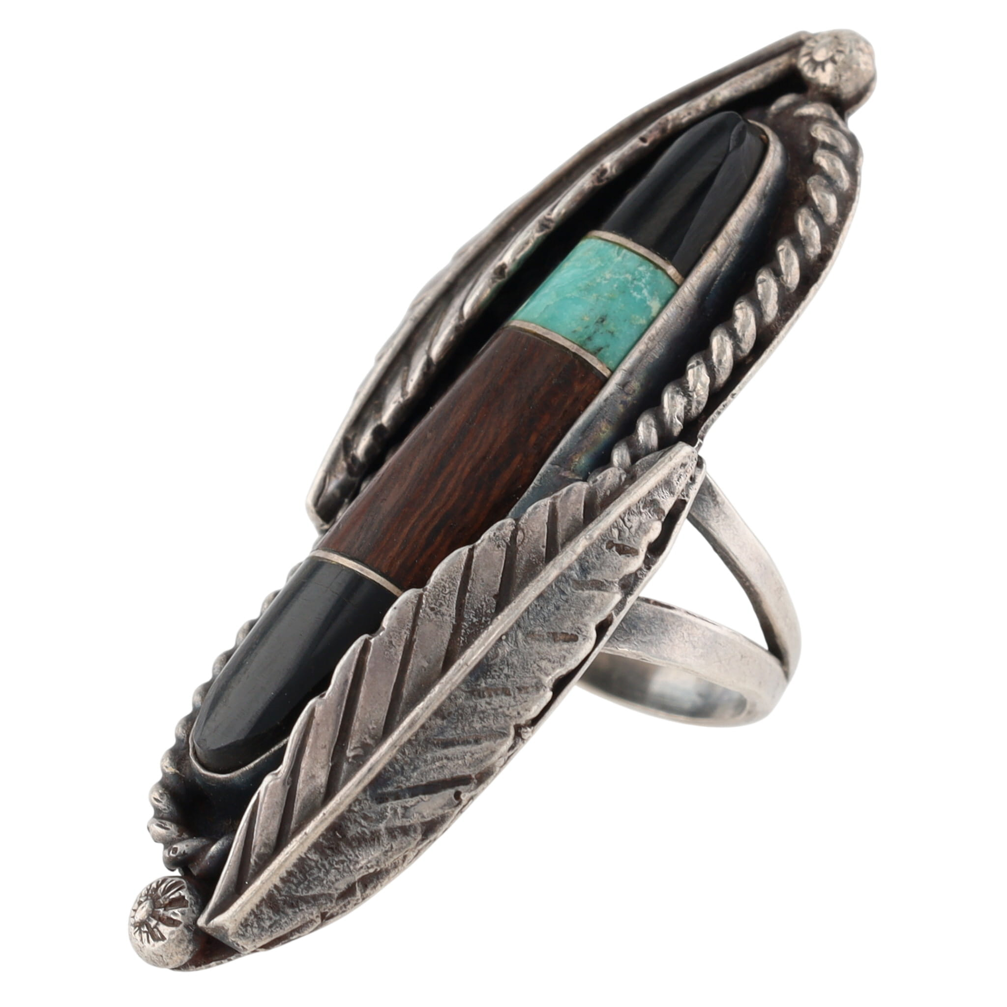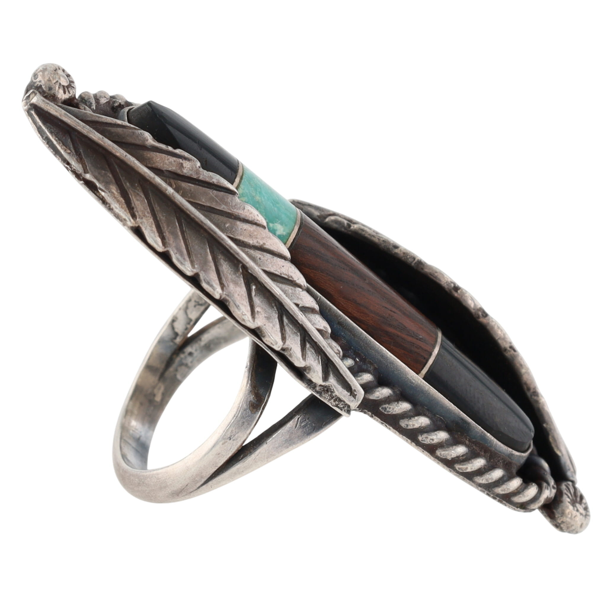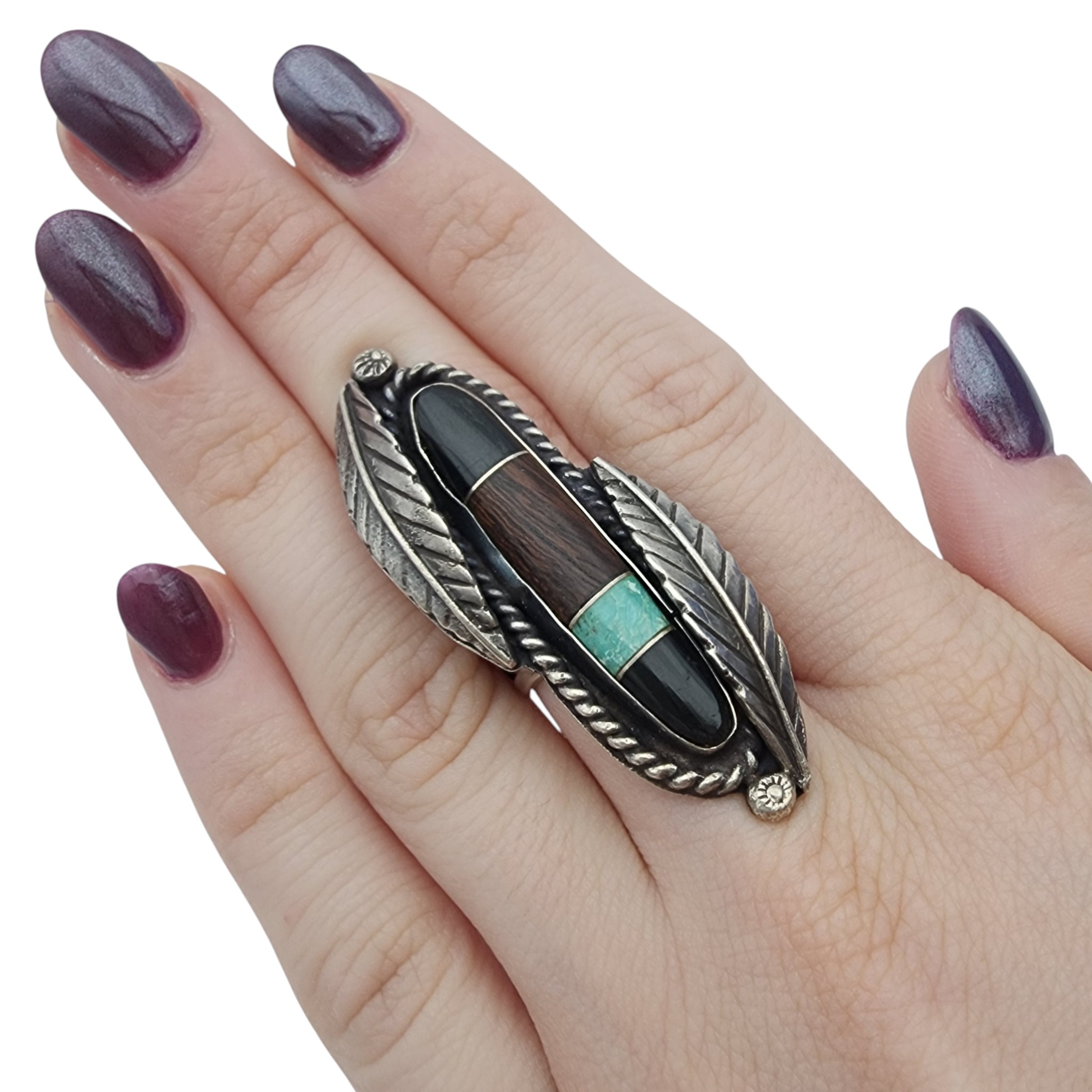 Vintage Leonard Burnside Navajo Sterling Long Multistone (Turquoise, Wood?, Onyx/Jet) Inlay and Leaf Ring Sz 6.5 – 14.5g – approx. 2.1″ long