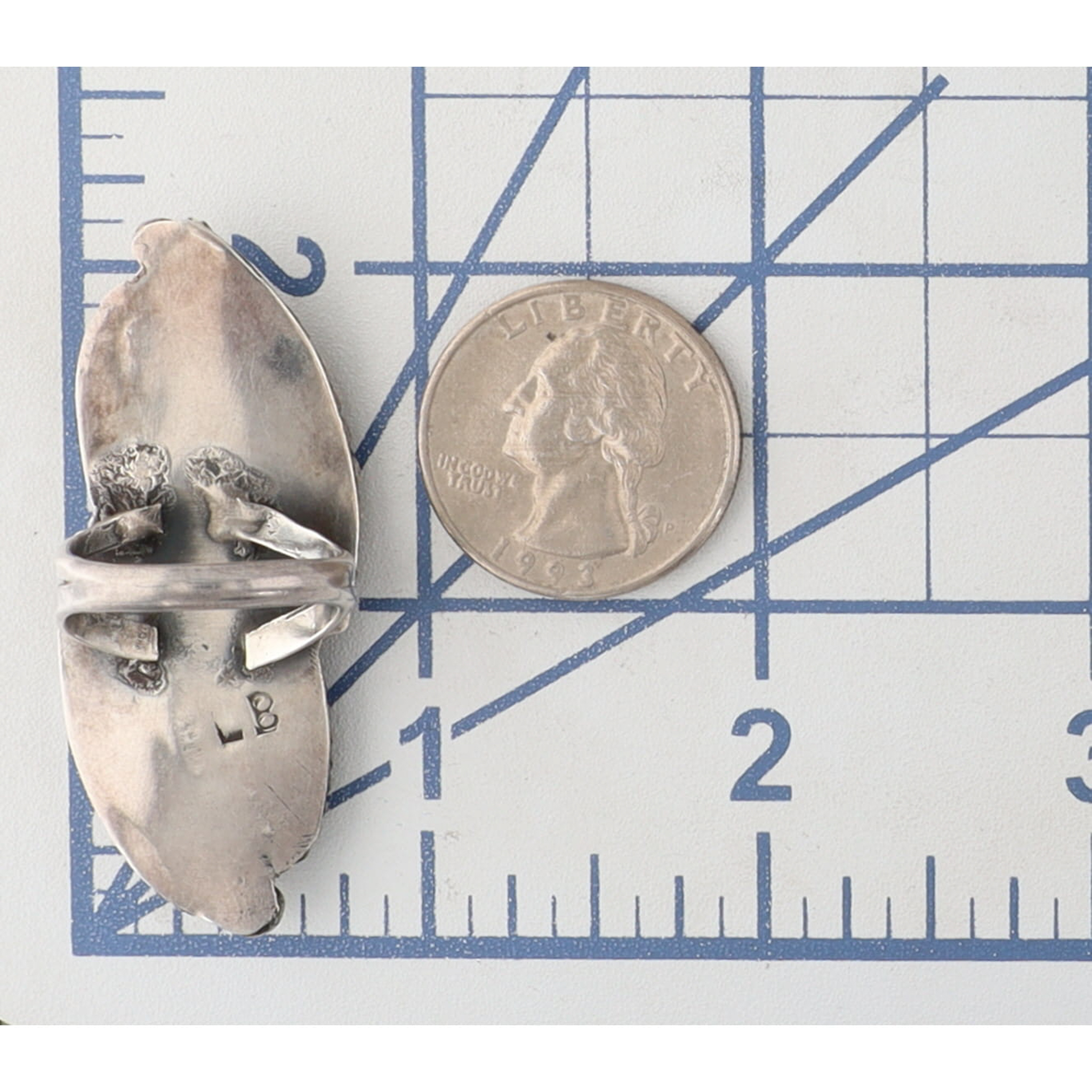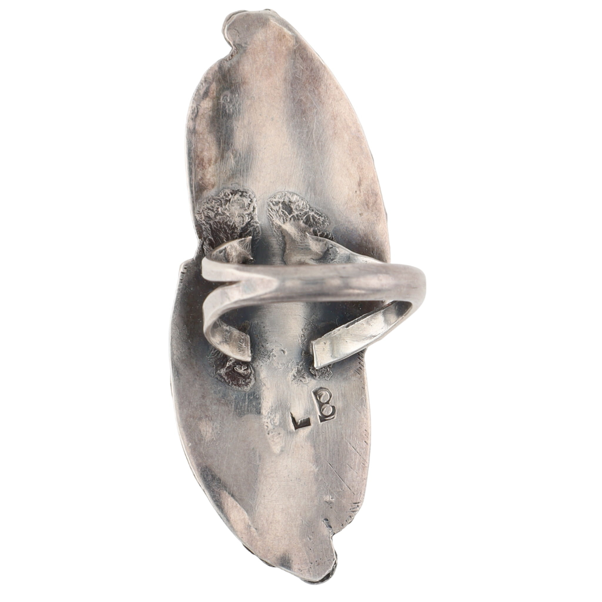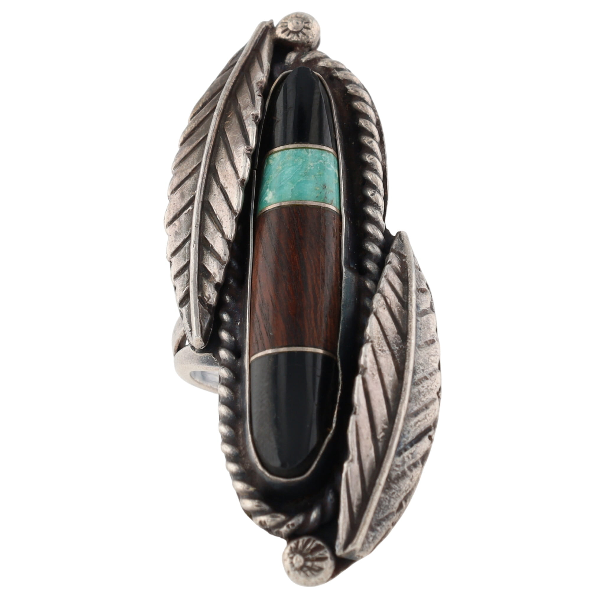 Vintage Leonard Burnside Navajo Sterling Long Multistone (Turquoise, Wood?, Onyx/Jet) Inlay and Leaf Ring Sz 6.5 – 14.5g – approx. 2.1″ long