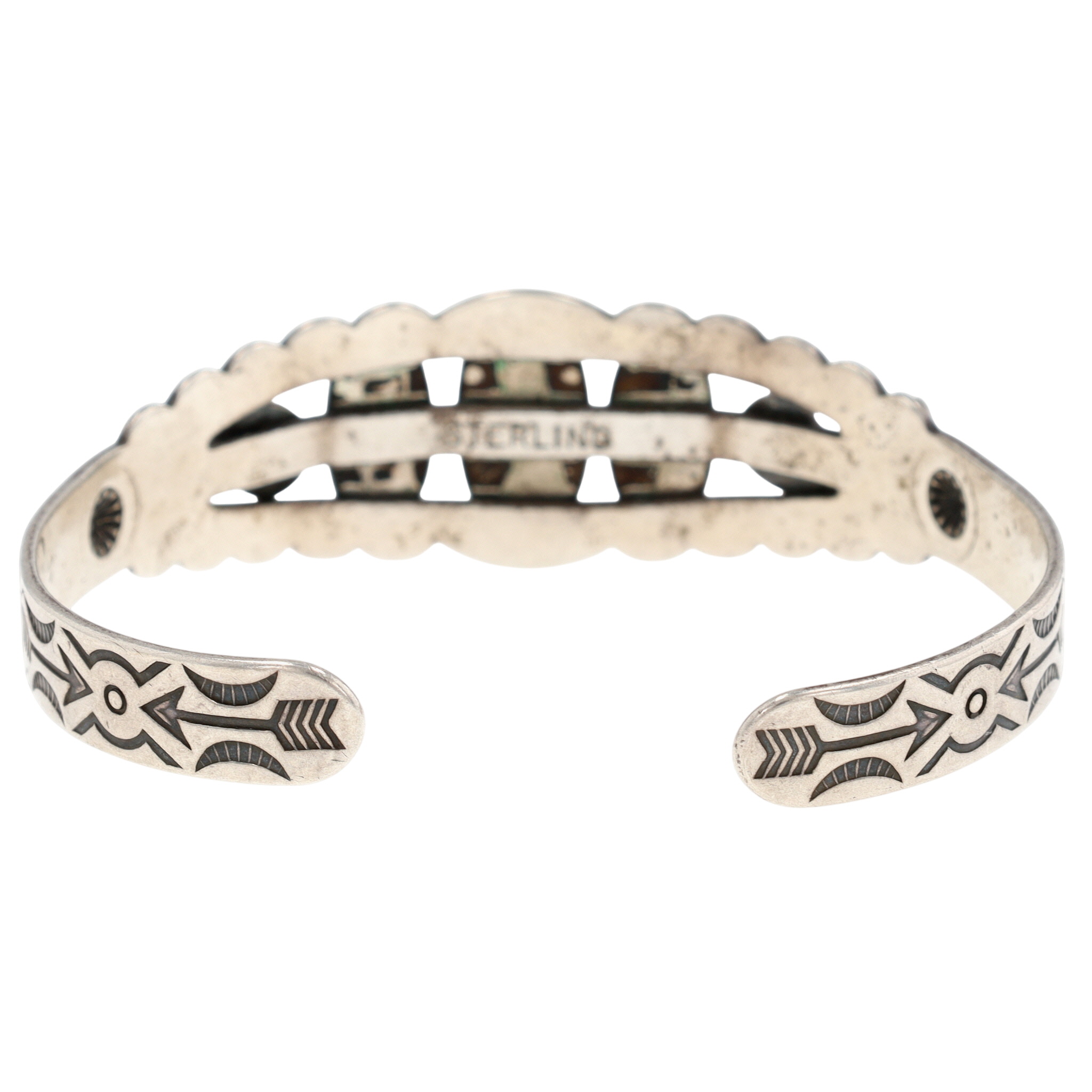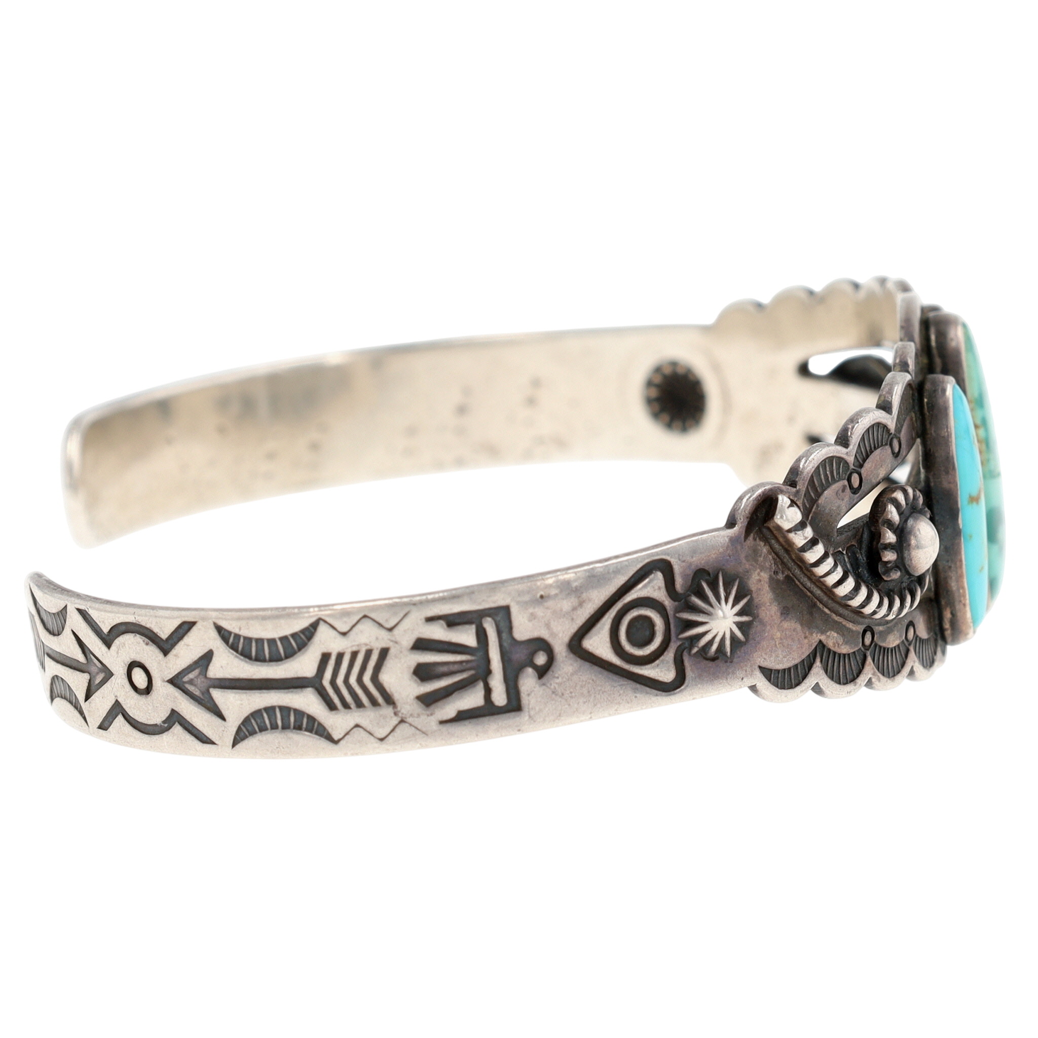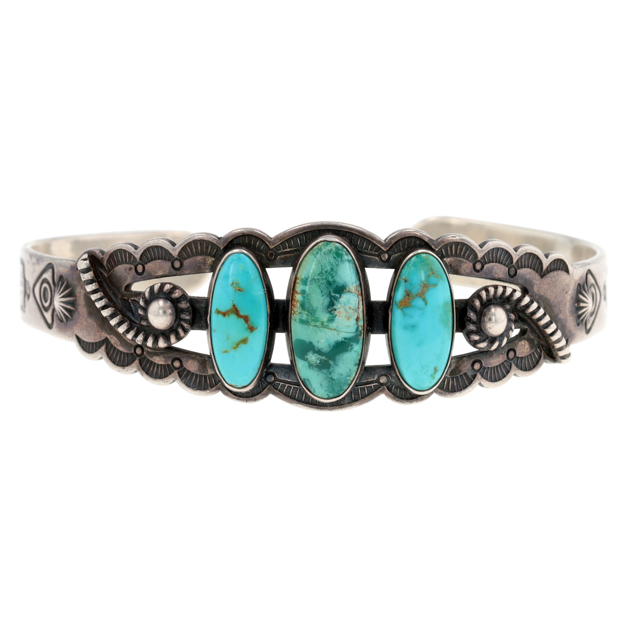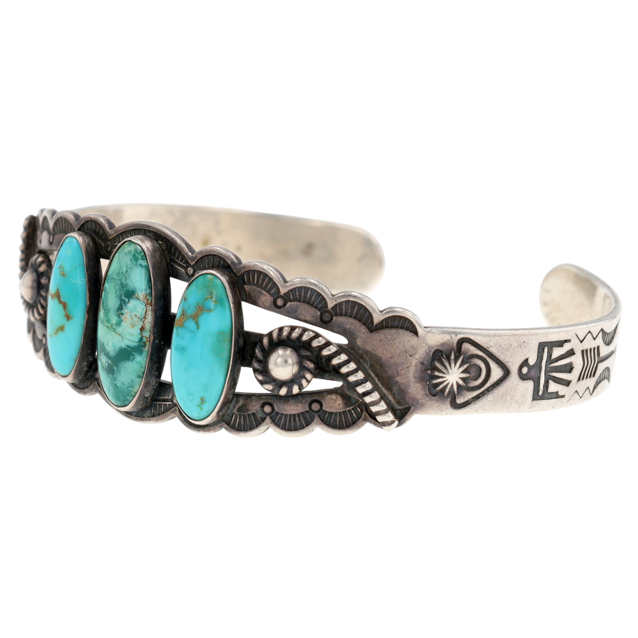 Vintage Fred Harvey Era Navajo Sterling Stamped Turquoise Cuff Bracelet – 13.9g – Note: middle turquoise stone has a crack but stone is secure, stable in setting.