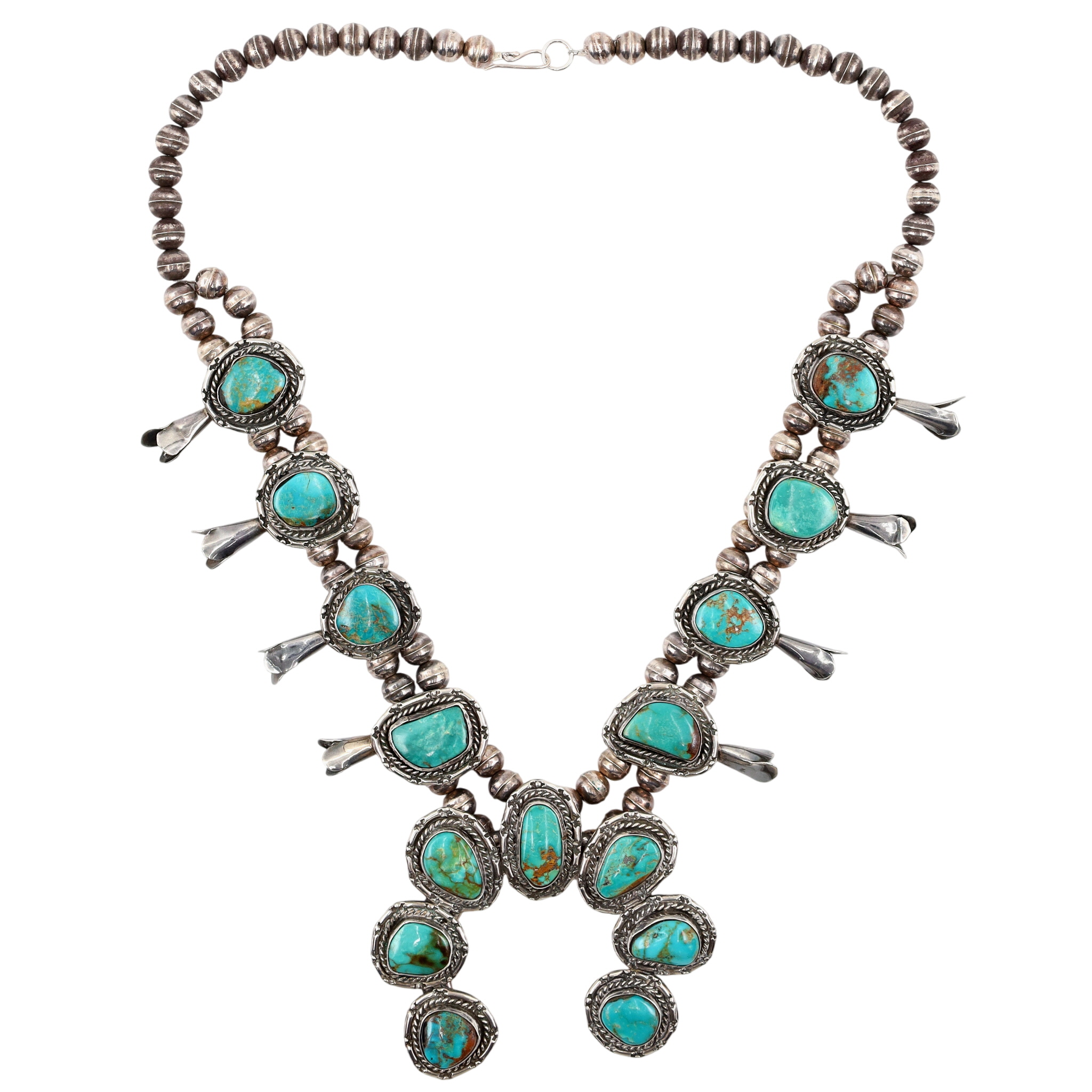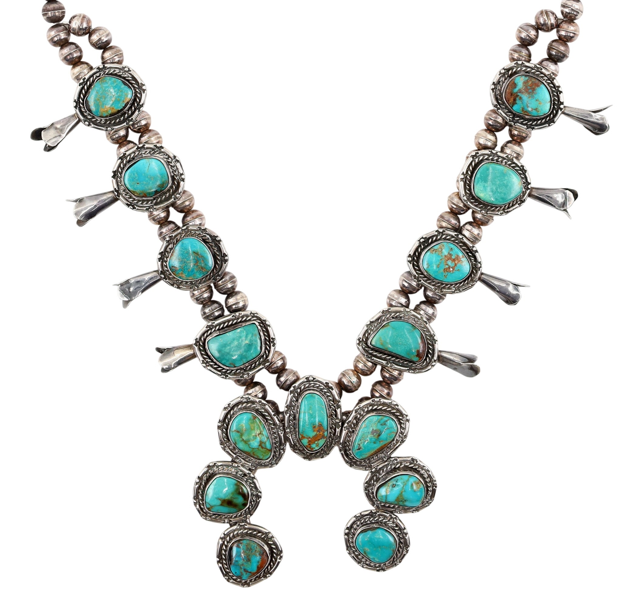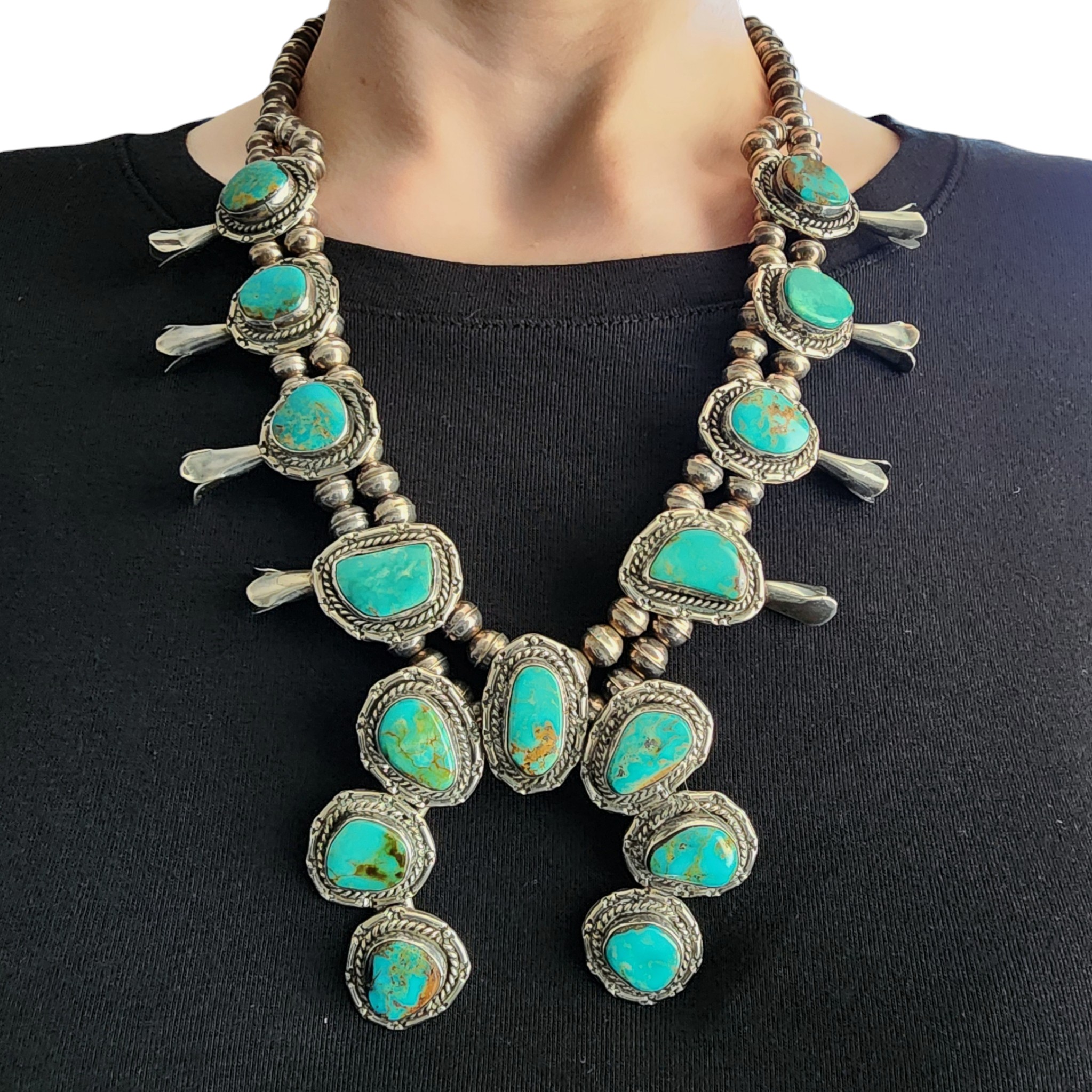 Vintage Navajo Sterling and (Possibly Royston/King’s Manassa?) Turquoise Squash Blossom Necklace – 142g – approx. 23″ long from end to end