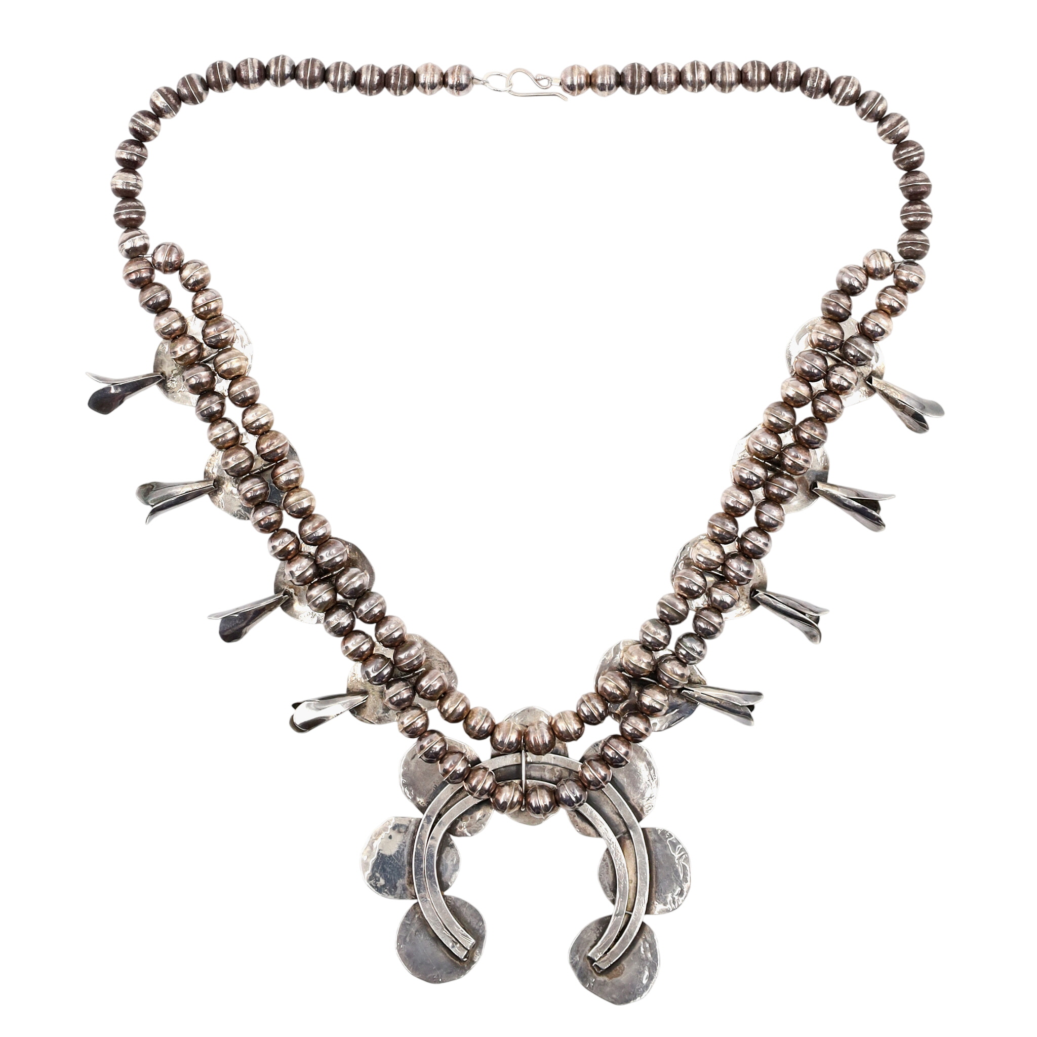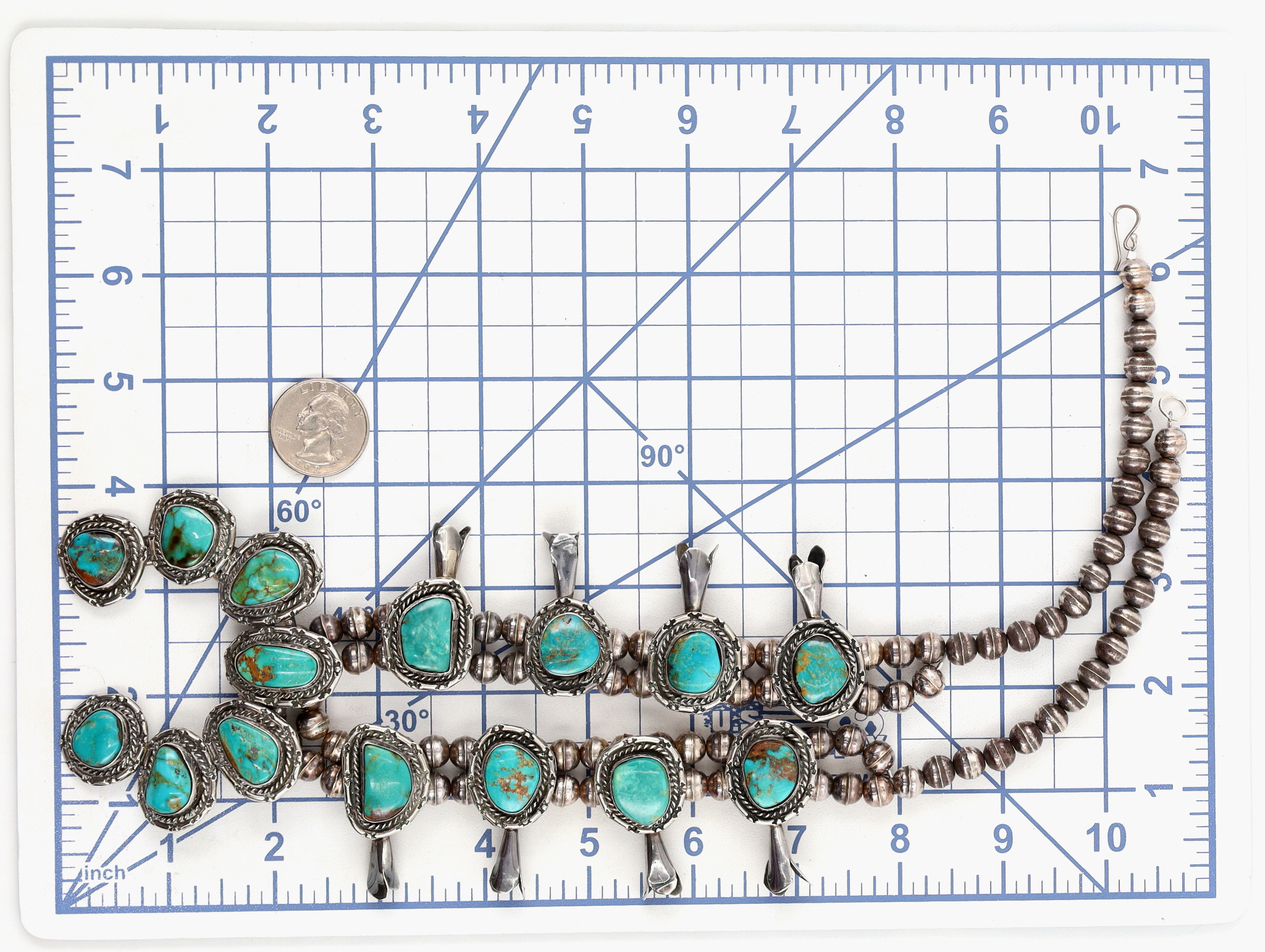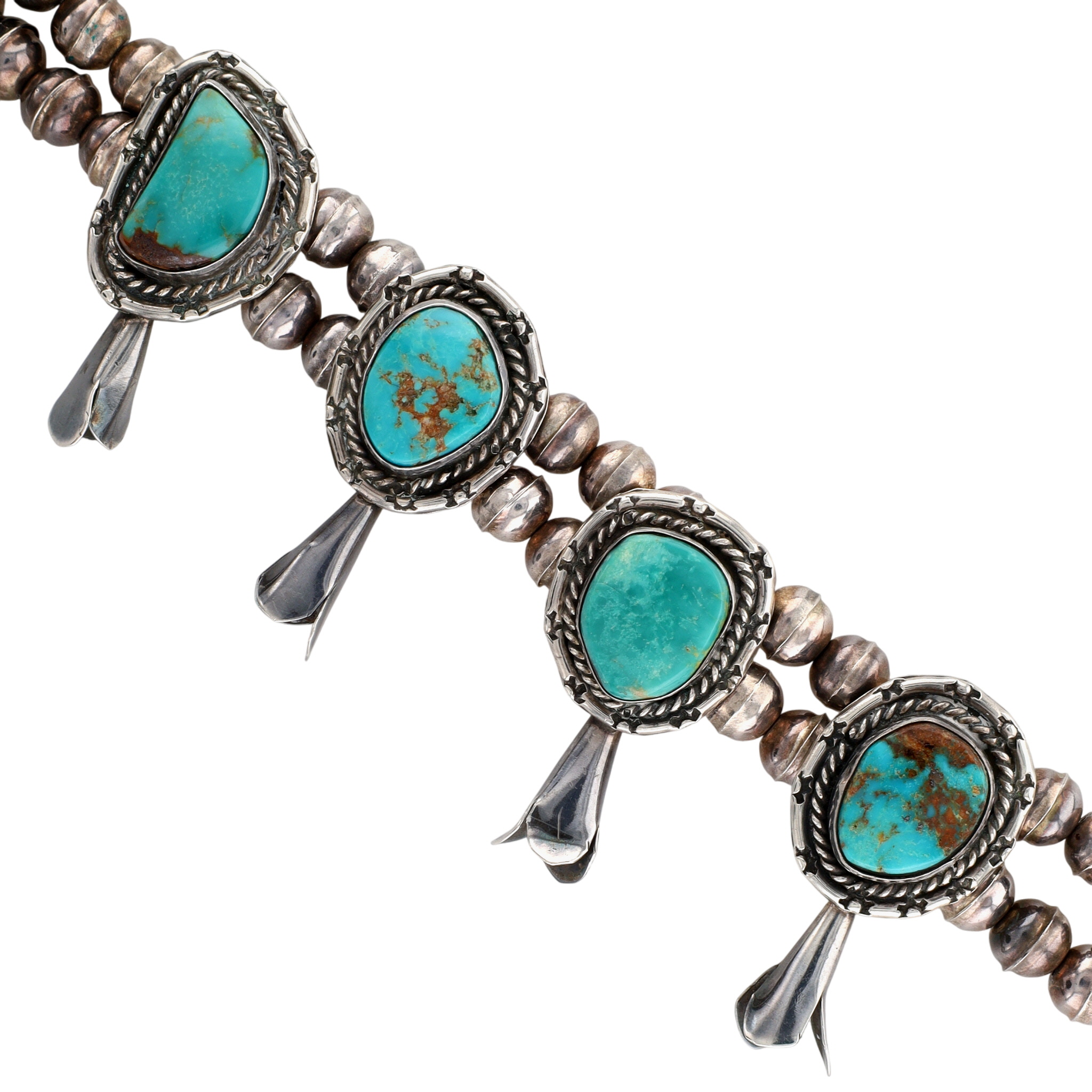 Vintage Navajo Sterling and (Possibly Royston/King’s Manassa?) Turquoise Squash Blossom Necklace – 142g – approx. 23″ long from end to end