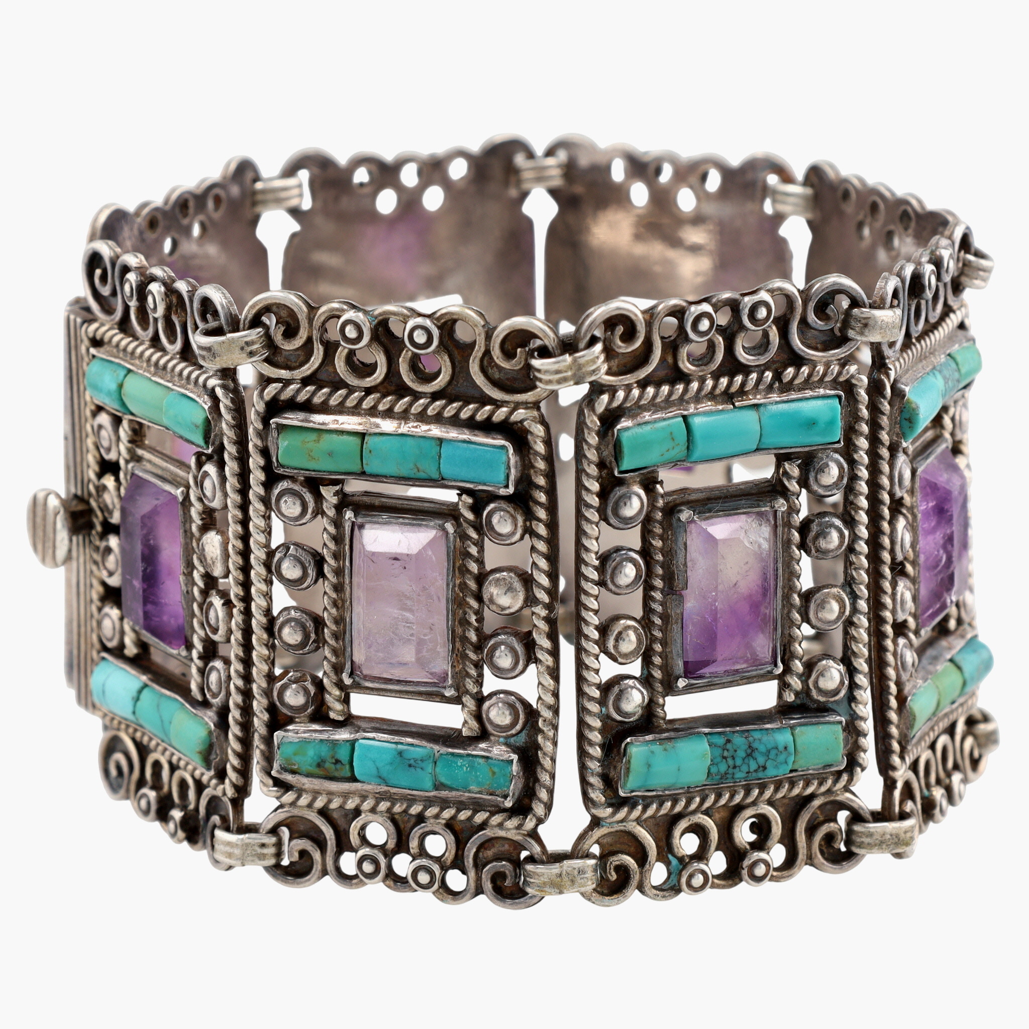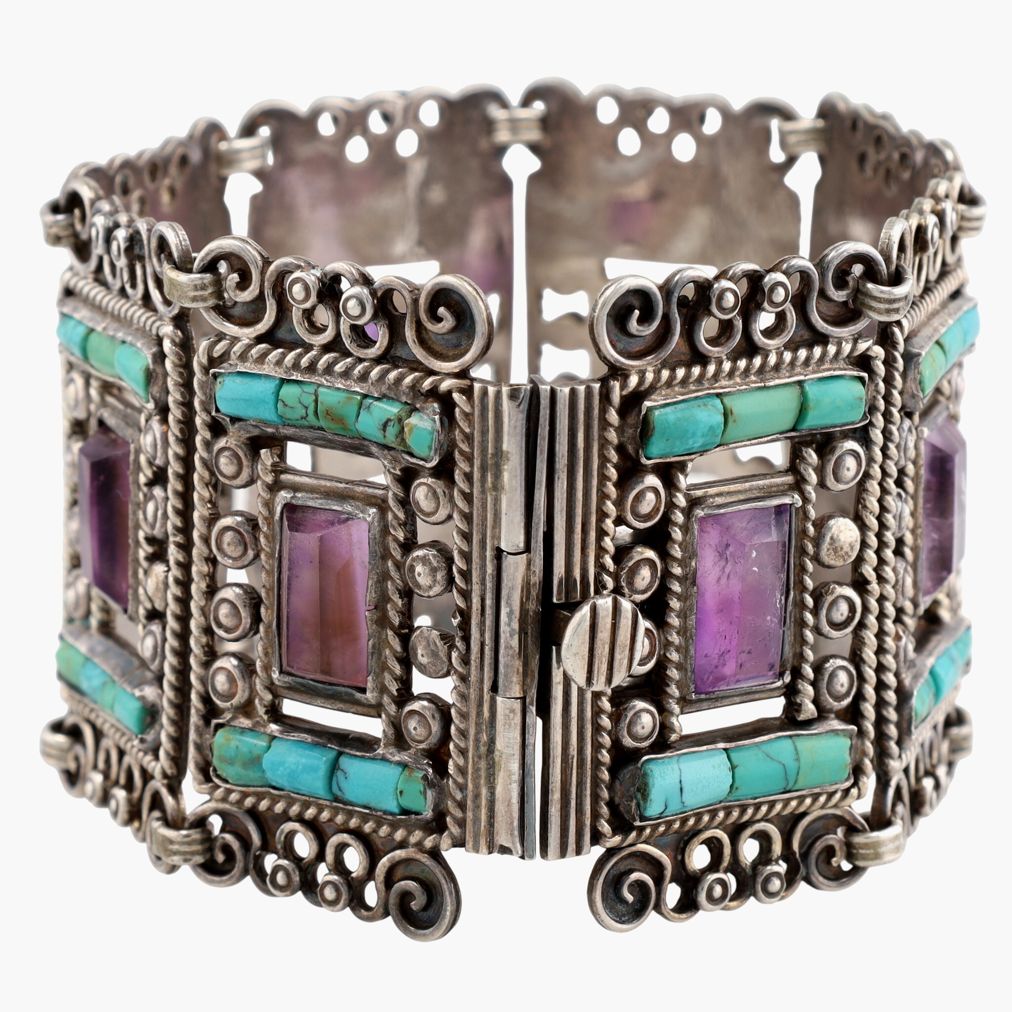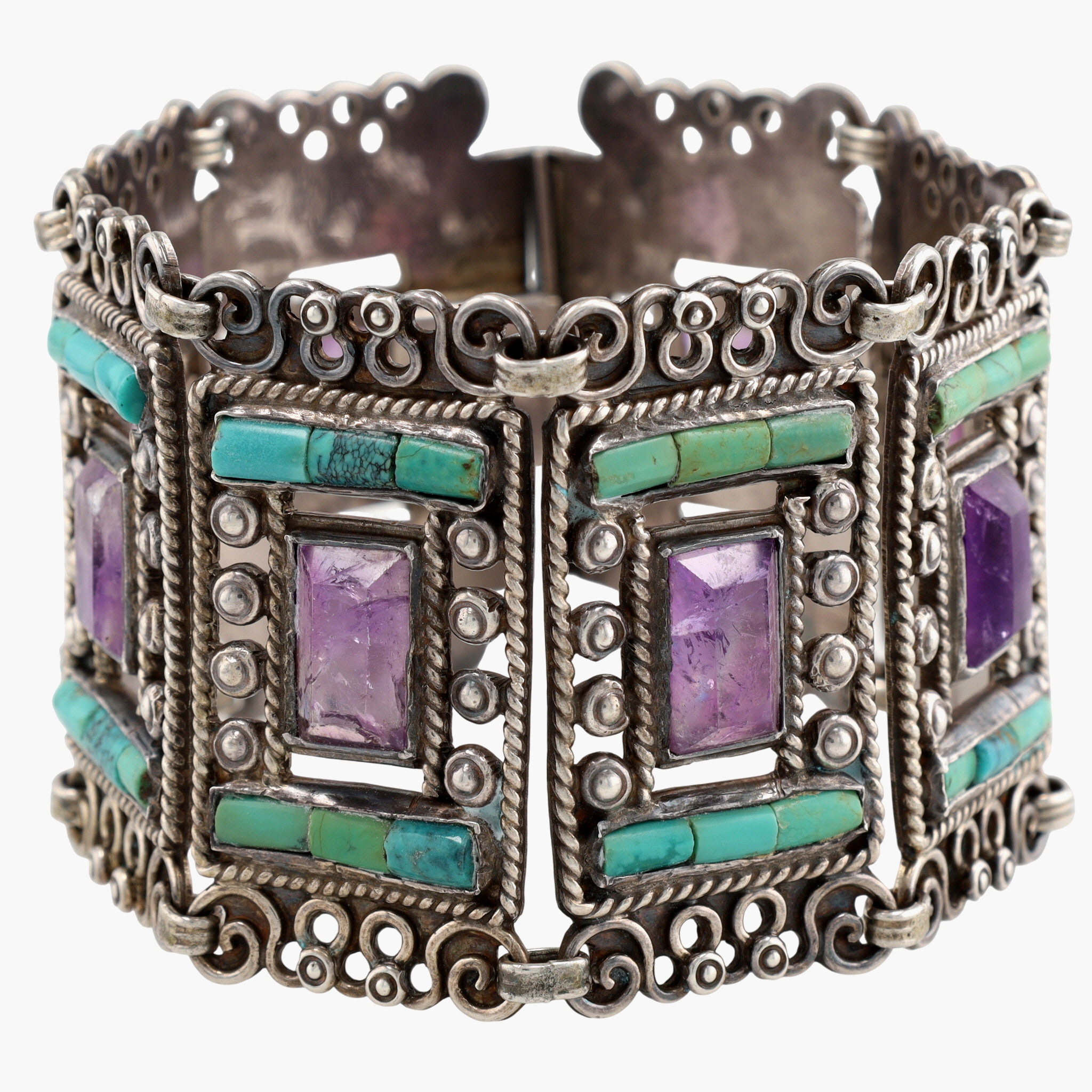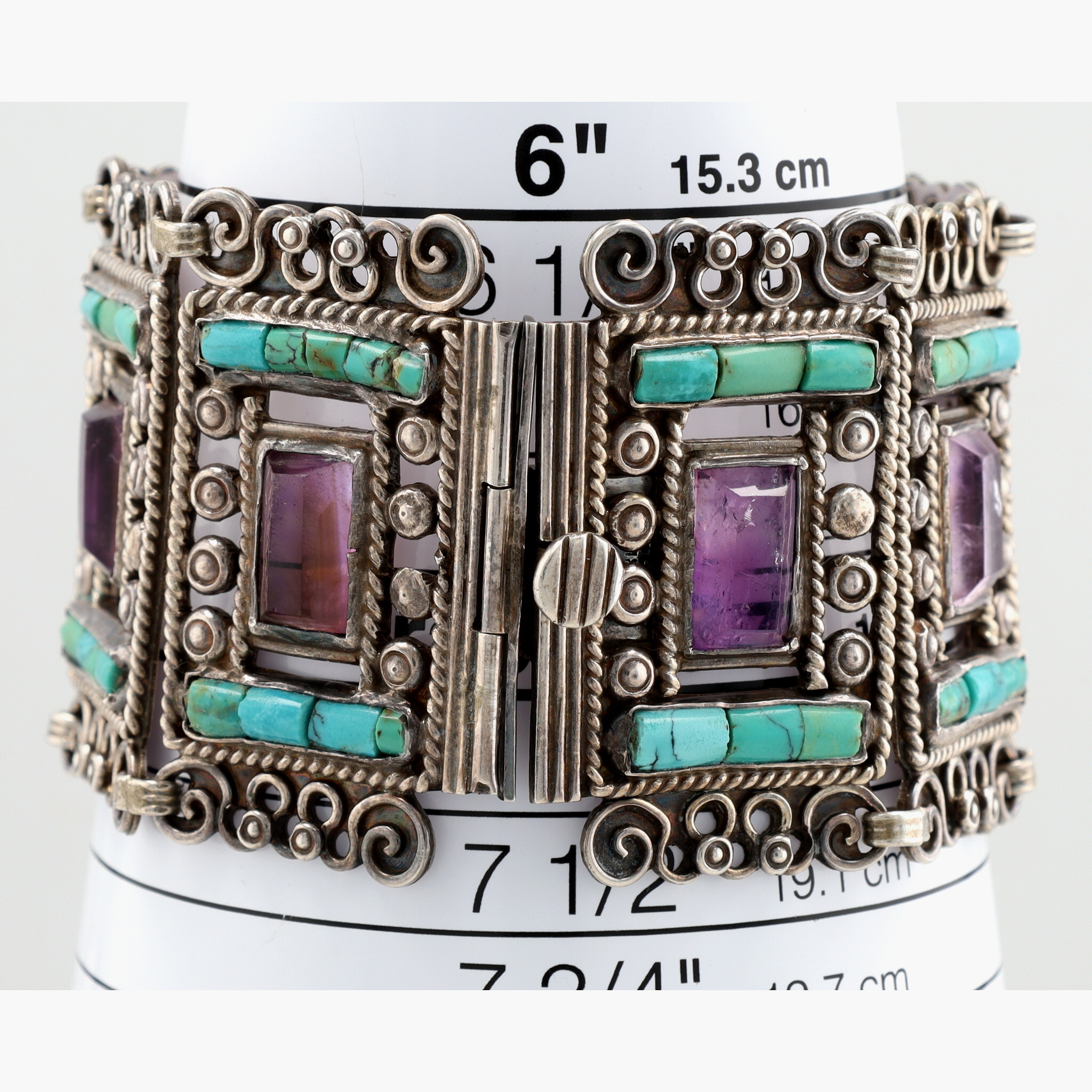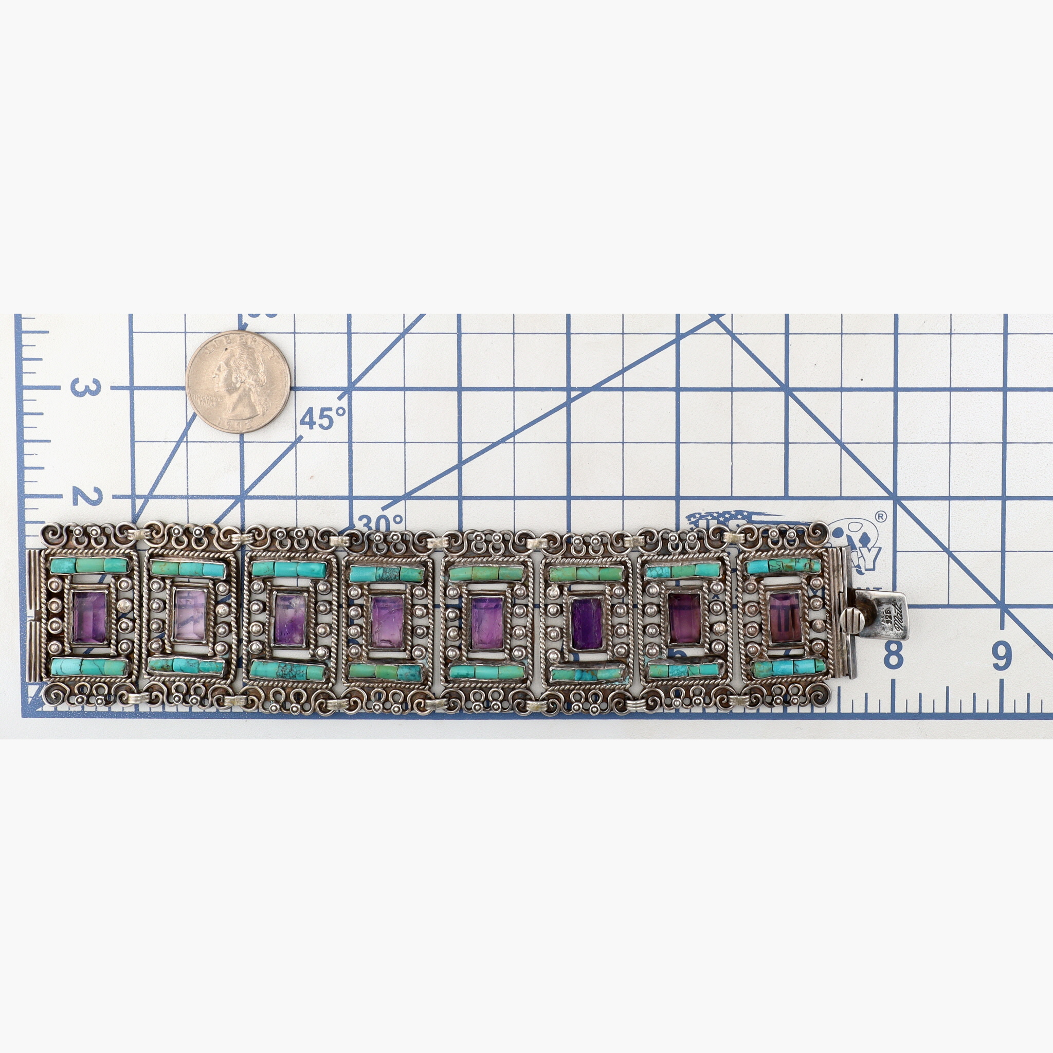 RARE: 1940’s-50’s Matilde Poulat MATL Sterling Amethyst and Turquoise Panel Bracelet – 85.7g – an absolutely stunning piece of art and history! Approx. 1.73″ tall and 7.5″ long.