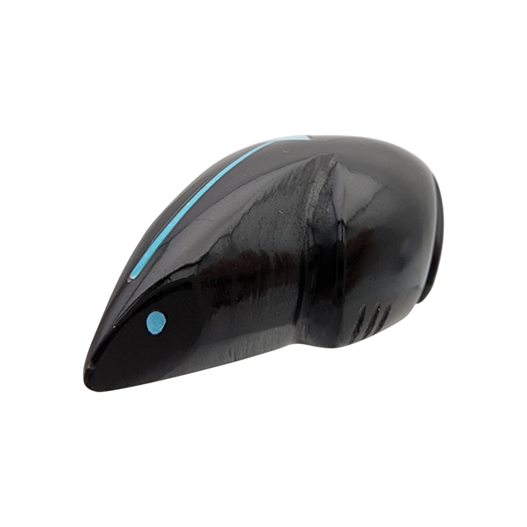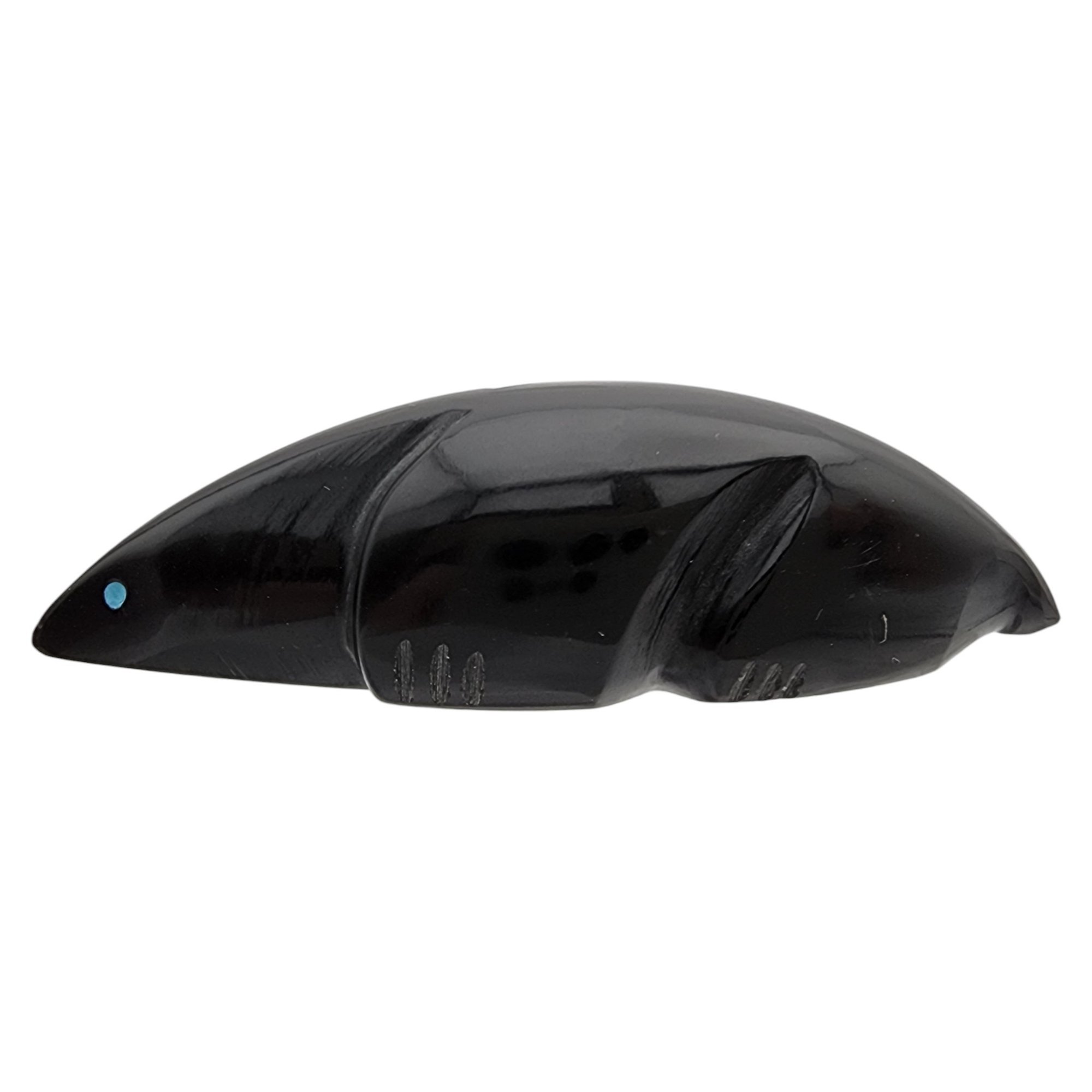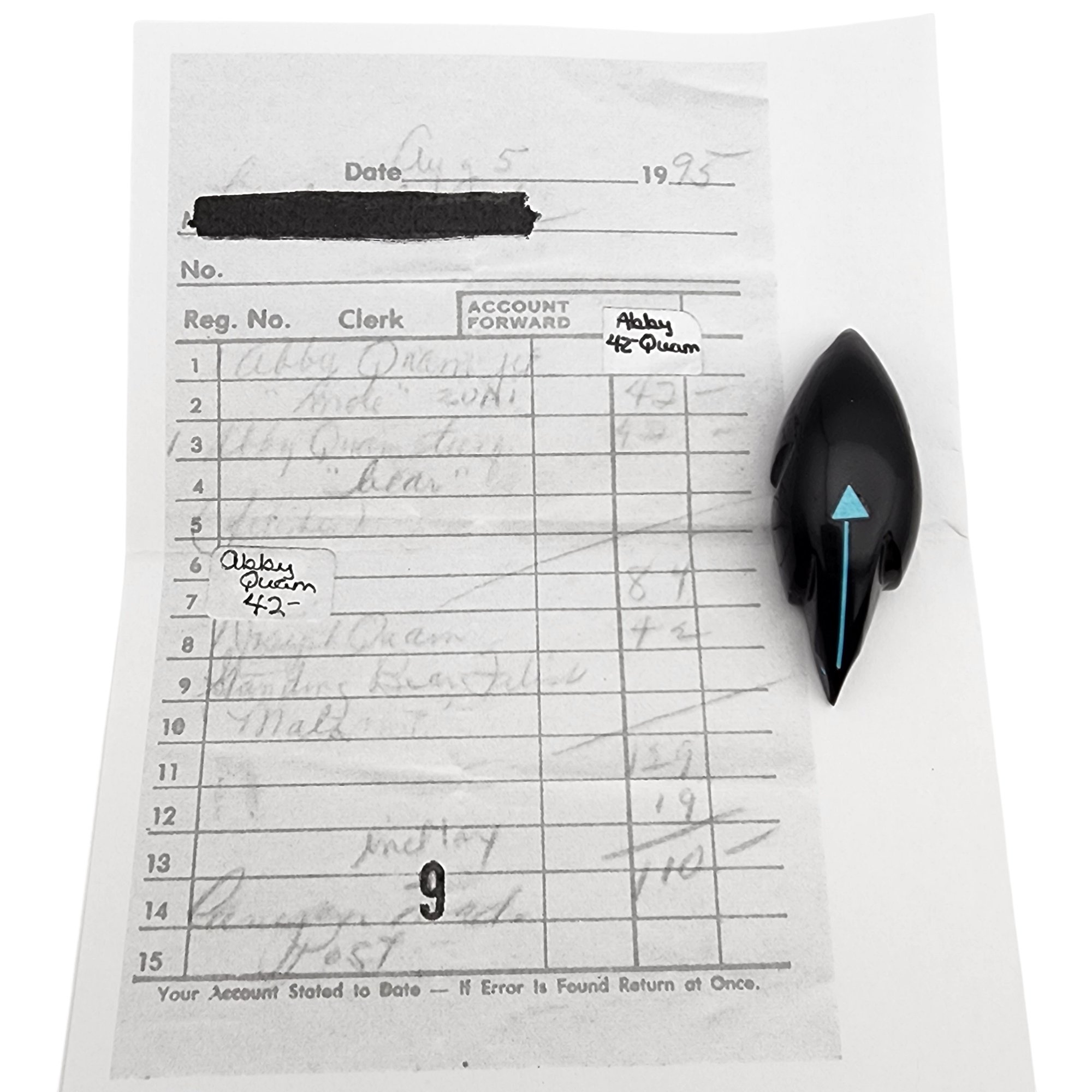 Abby Quam Panteah Zuni Jet and Inlaid Turquoise Heartline Mole Fetish / Approximate Weight: 15g / Approximate measurements: 1.9″ x .7″ / Note 1: Purchased at Canyon Trading Post in August of 1995. Comes with a copy of the receipt from time of purchase. / This item is part of an estate collection of Native American fetishes, pottery, baskets, and rugs acquired by a collector who traveled throughout the Southwest between the 1970s and early 2000s. Many pieces were purchased from trading posts in Arizona and New Mexico. Artist attributions are based on available documentation, including receipts, tags, stickers, and signatures where present. Select items include original or copied receipts and original tags identifying artists pricing at the time of purchase, primarily from the 1970s through the 1990s. Please review our non-jewelry shipping information and reach out with any questions prior to bidding. Thank you!