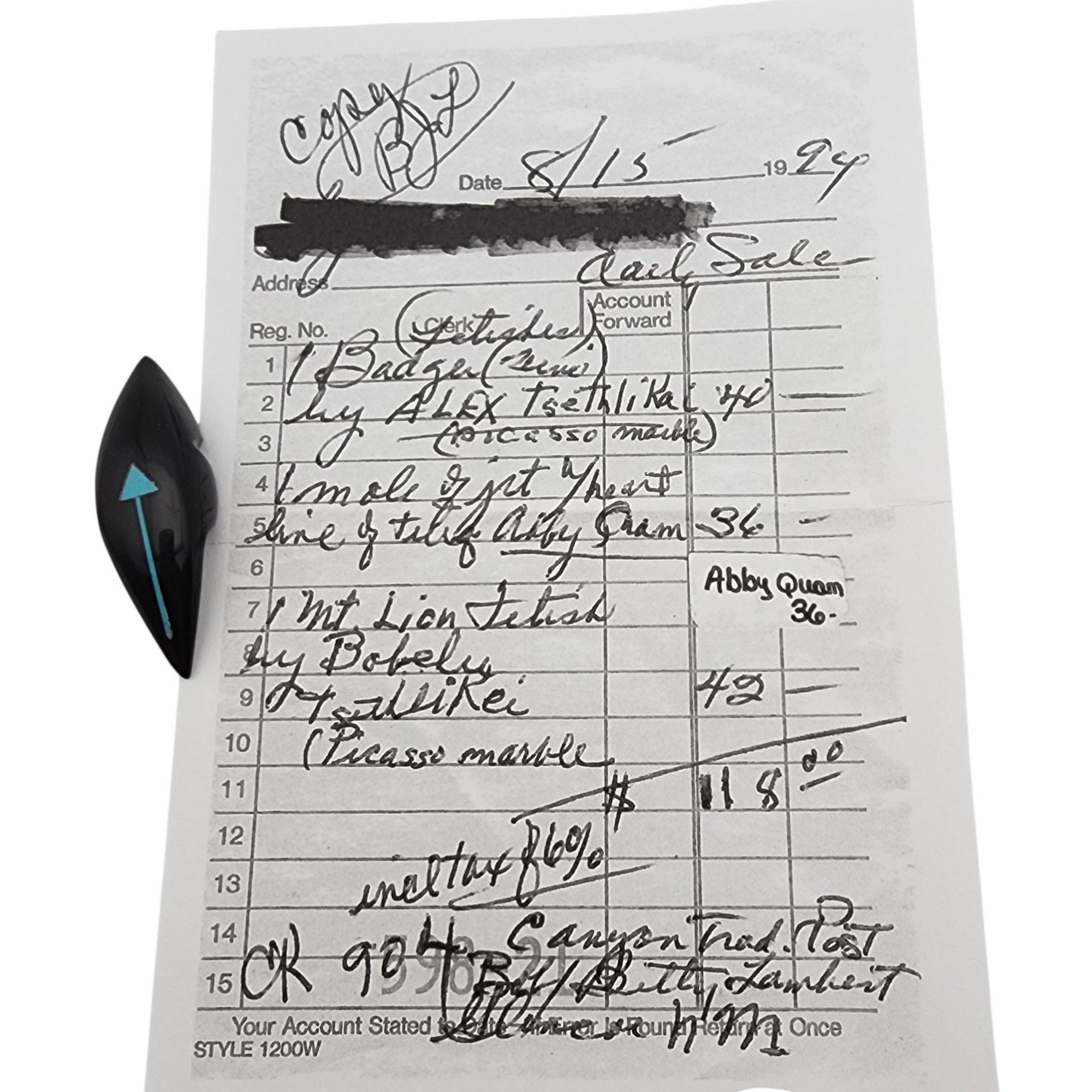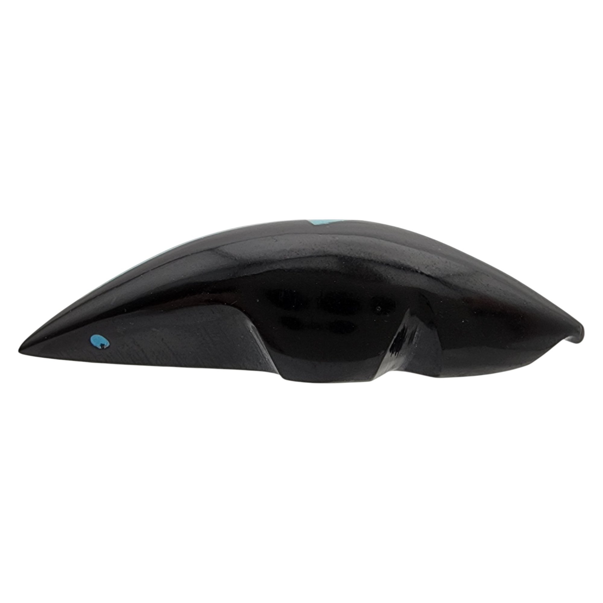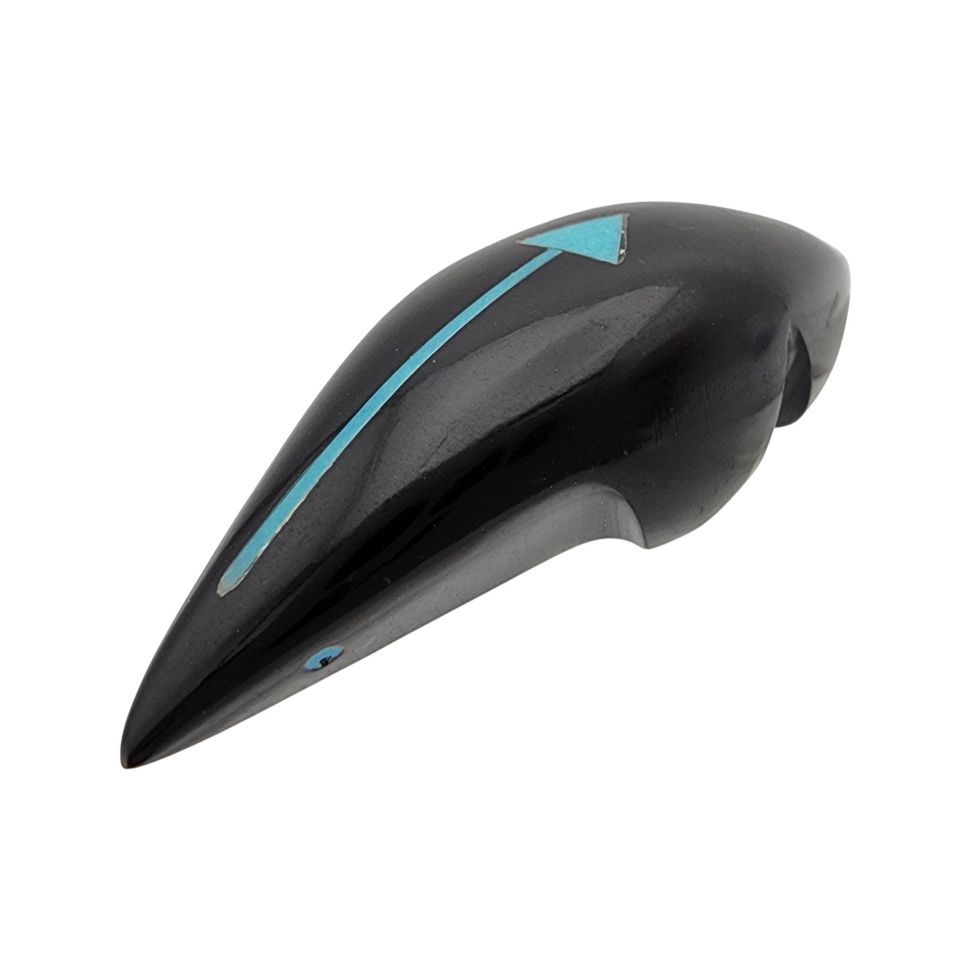Abby Quam Panteah Zuni Jet and Inlaid Turquoise Heartline Mole Fetish / Approximate Weight: 8g / Approximate measurements: 1.66″ x .5″ / Note 1: Purchased at Canyon Trading Post in August of 1994. Comes with copy of the original receipt from time of purchase. / This item is part of an estate collection of Native American fetishes, pottery, baskets, and rugs acquired by a collector who traveled throughout the Southwest between the 1970s and early 2000s. Many pieces were purchased from trading posts in Arizona and New Mexico. Artist attributions are based on available documentation, including receipts, tags, stickers, and signatures where present. Select items include original or copied receipts and original tags identifying artists pricing at the time of purchase, primarily from the 1970s through the 1990s. Please review our non-jewelry shipping information and reach out with any questions prior to bidding. Thank you!