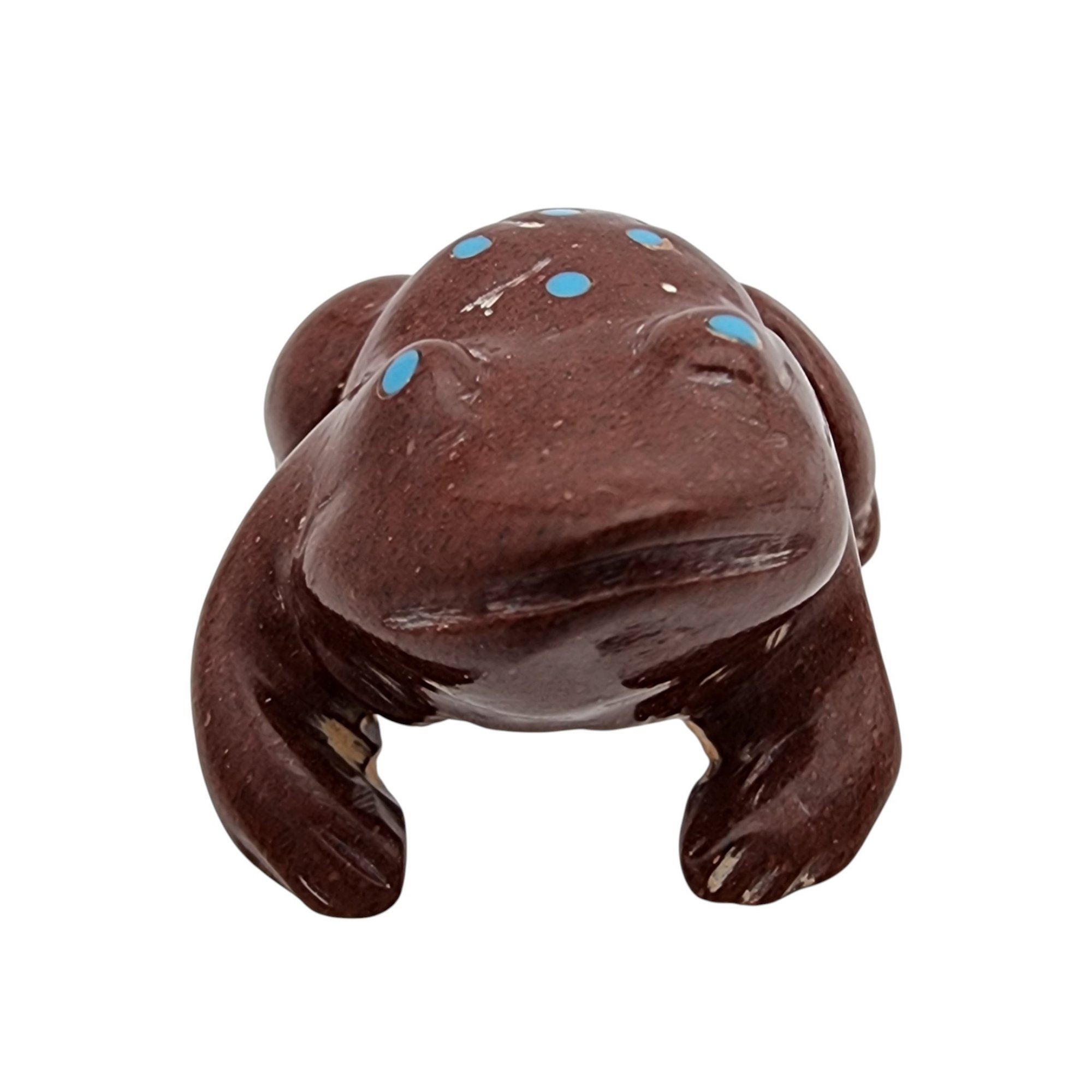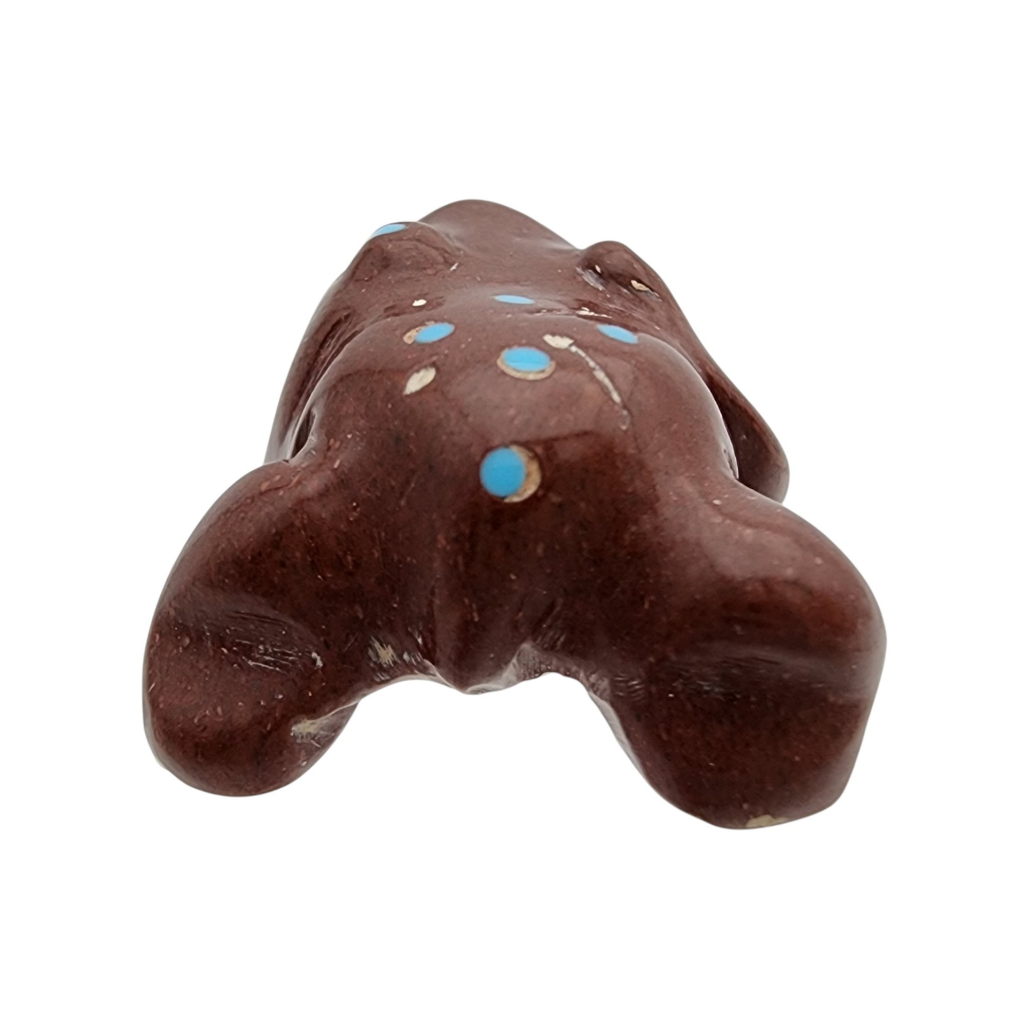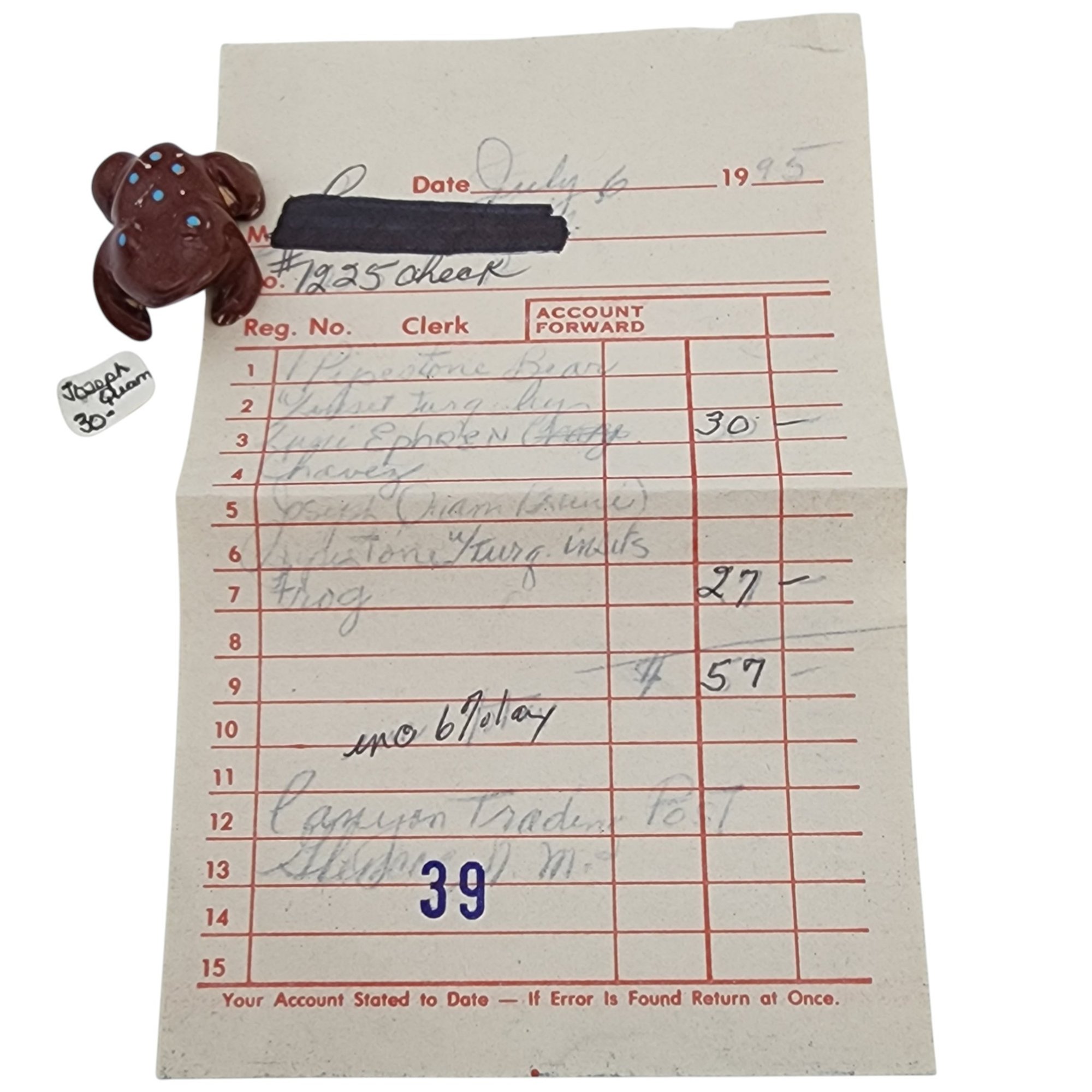 Joseph Quam Zuni Pipestone and Inlaid Turquoise Frog Fetish / Approximate Weight: 8g / Approximate measurements: 1.07″ x .84″ / Note 1: Purchased at Canyon Trading Post in July of 1995. Comes with original receipt at time of purchase and original tag (faded). / This item is part of an estate collection of Native American fetishes, pottery, baskets, and rugs acquired by a collector who traveled throughout the Southwest between the 1970s and early 2000s. Many pieces were purchased from trading posts in Arizona and New Mexico. Artist attributions are based on available documentation, including receipts, tags, stickers, and signatures where present. Select items include original or copied receipts and original tags identifying artists pricing at the time of purchase, primarily from the 1970s through the 1990s. Please review our non-jewelry shipping information and reach out with any questions prior to bidding. Thank you!