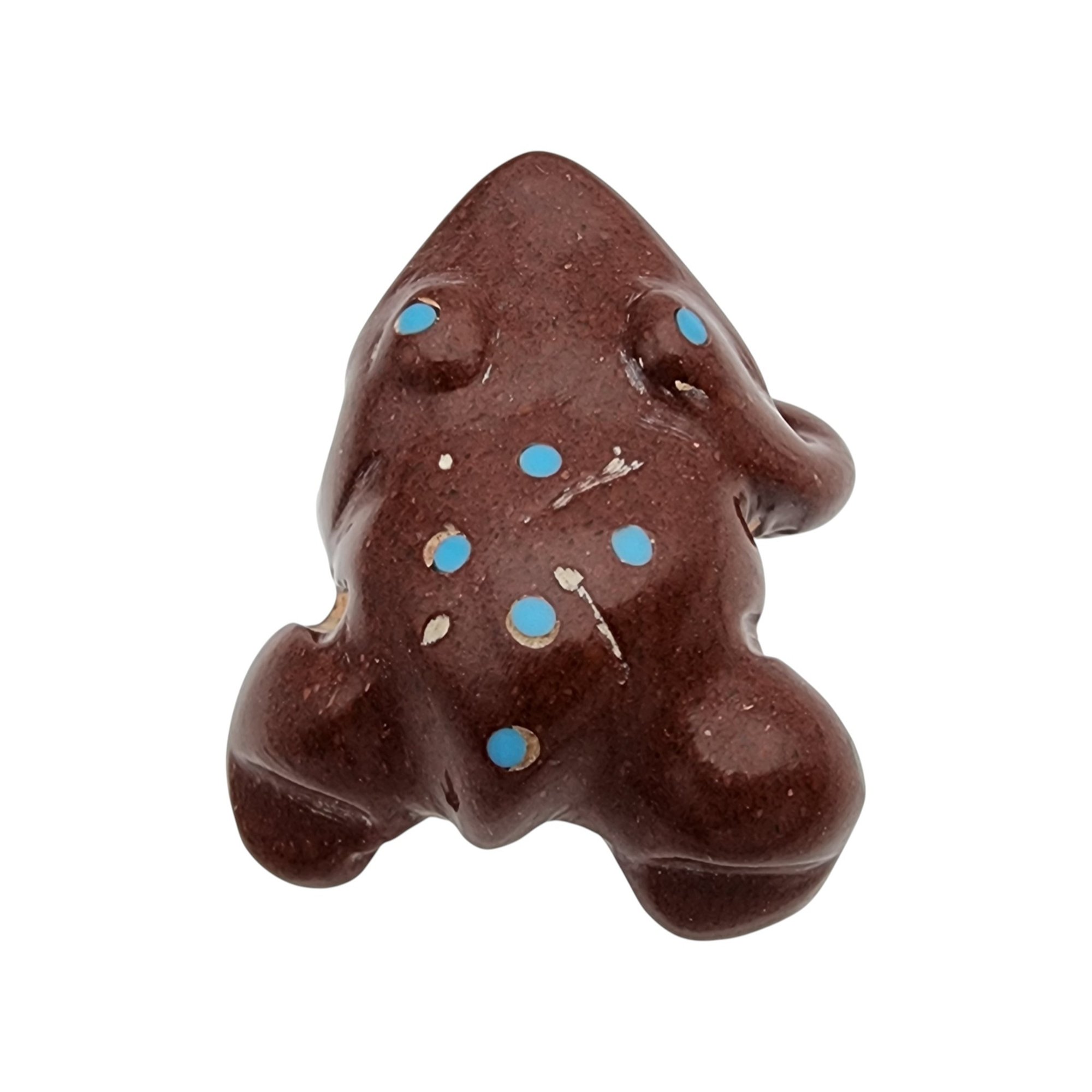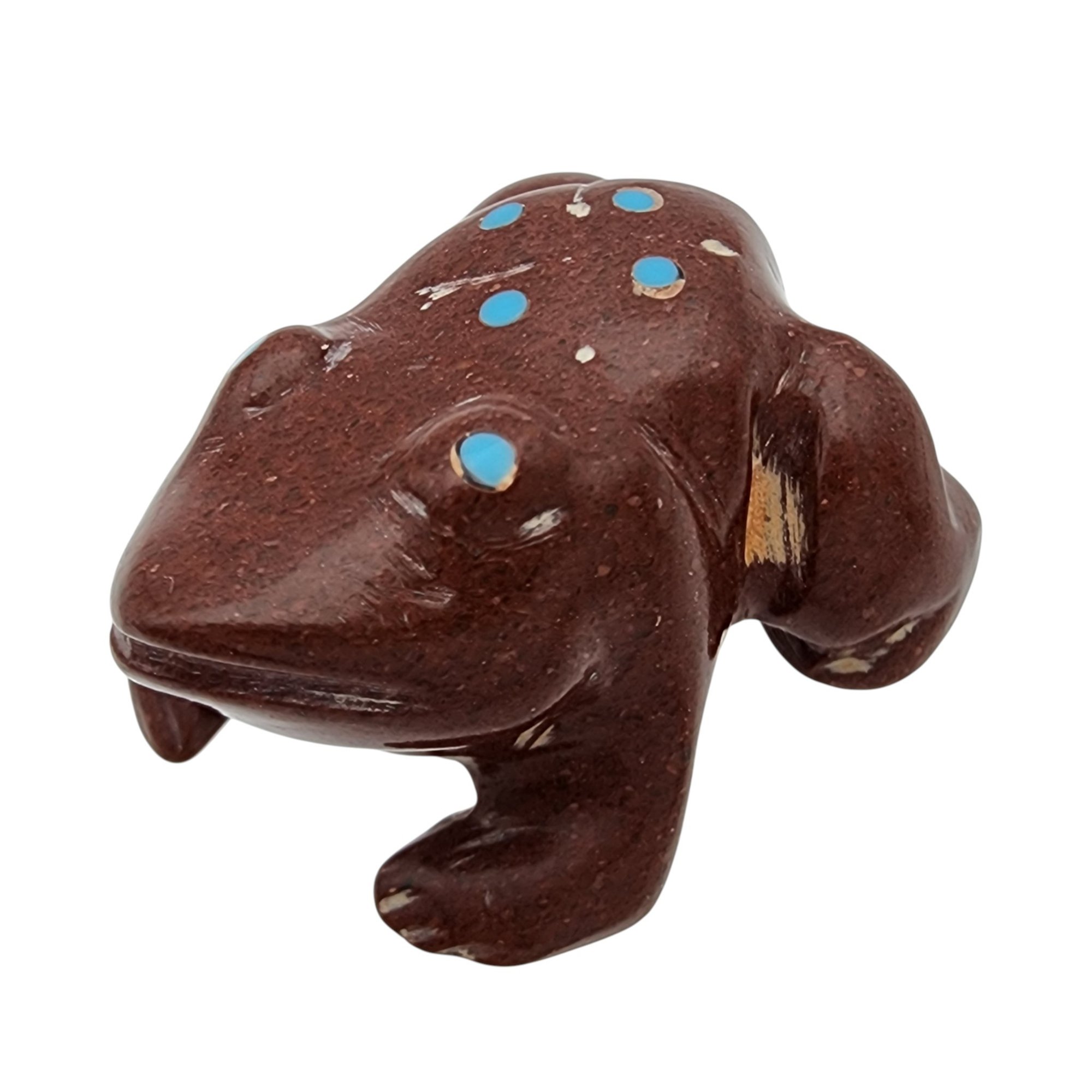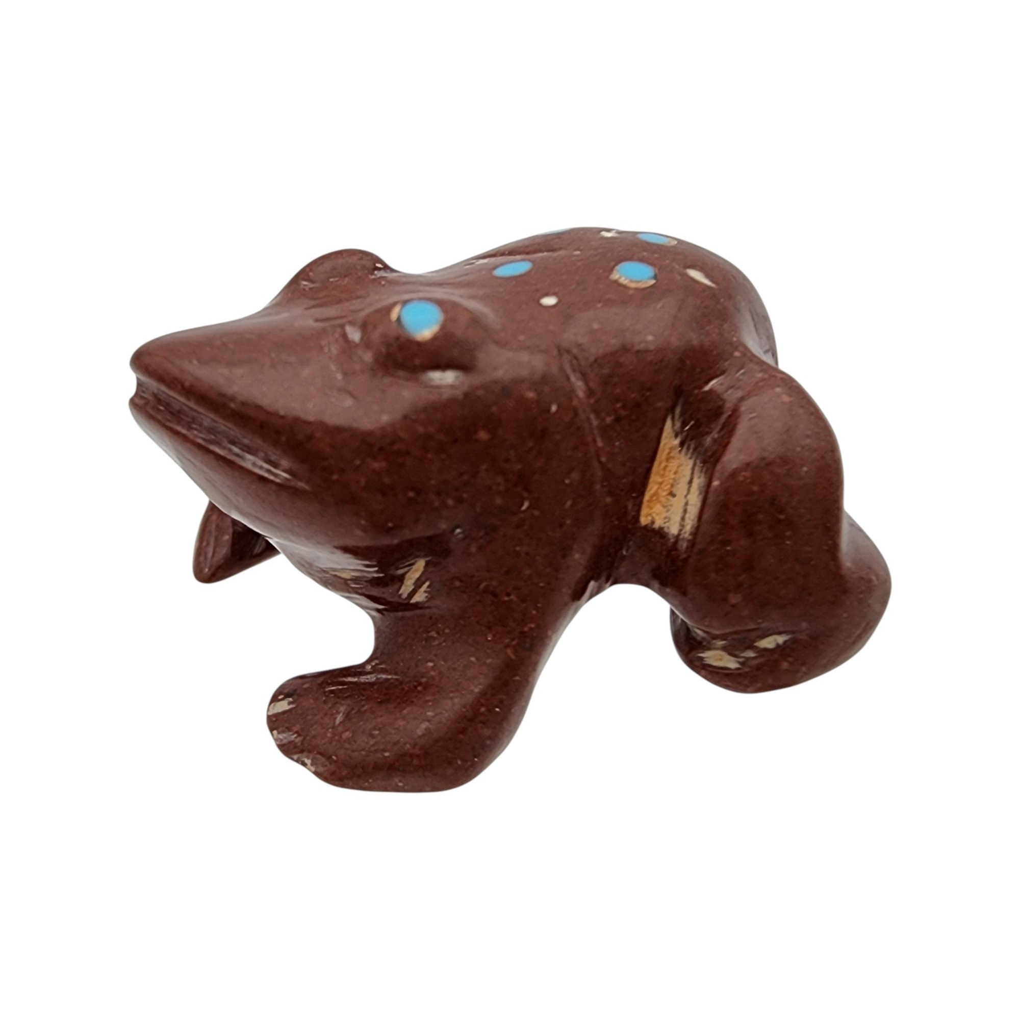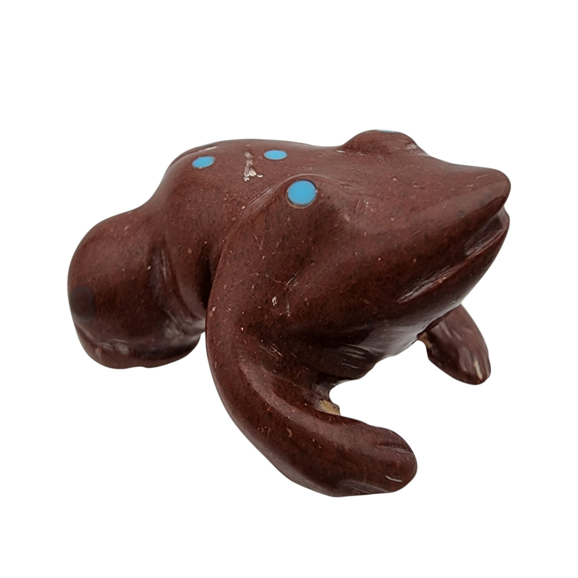 Joseph Quam Zuni Pipestone and Inlaid Turquoise Frog Fetish / Approximate Weight: 8g / Approximate measurements: 1.07″ x .84″ / Note 1: Purchased at Canyon Trading Post in July of 1995. Comes with original receipt at time of purchase and original tag (faded). / This item is part of an estate collection of Native American fetishes, pottery, baskets, and rugs acquired by a collector who traveled throughout the Southwest between the 1970s and early 2000s. Many pieces were purchased from trading posts in Arizona and New Mexico. Artist attributions are based on available documentation, including receipts, tags, stickers, and signatures where present. Select items include original or copied receipts and original tags identifying artists pricing at the time of purchase, primarily from the 1970s through the 1990s. Please review our non-jewelry shipping information and reach out with any questions prior to bidding. Thank you!