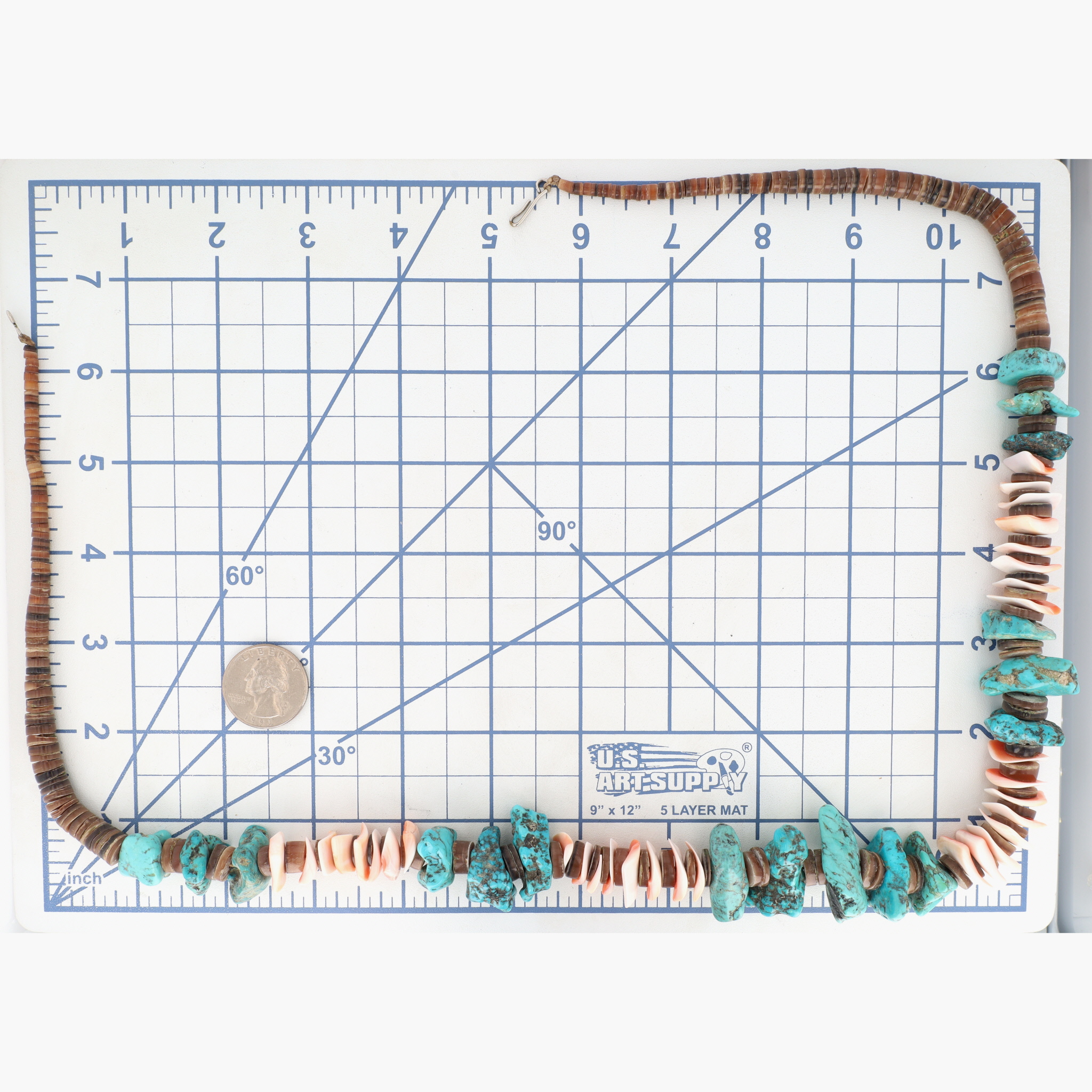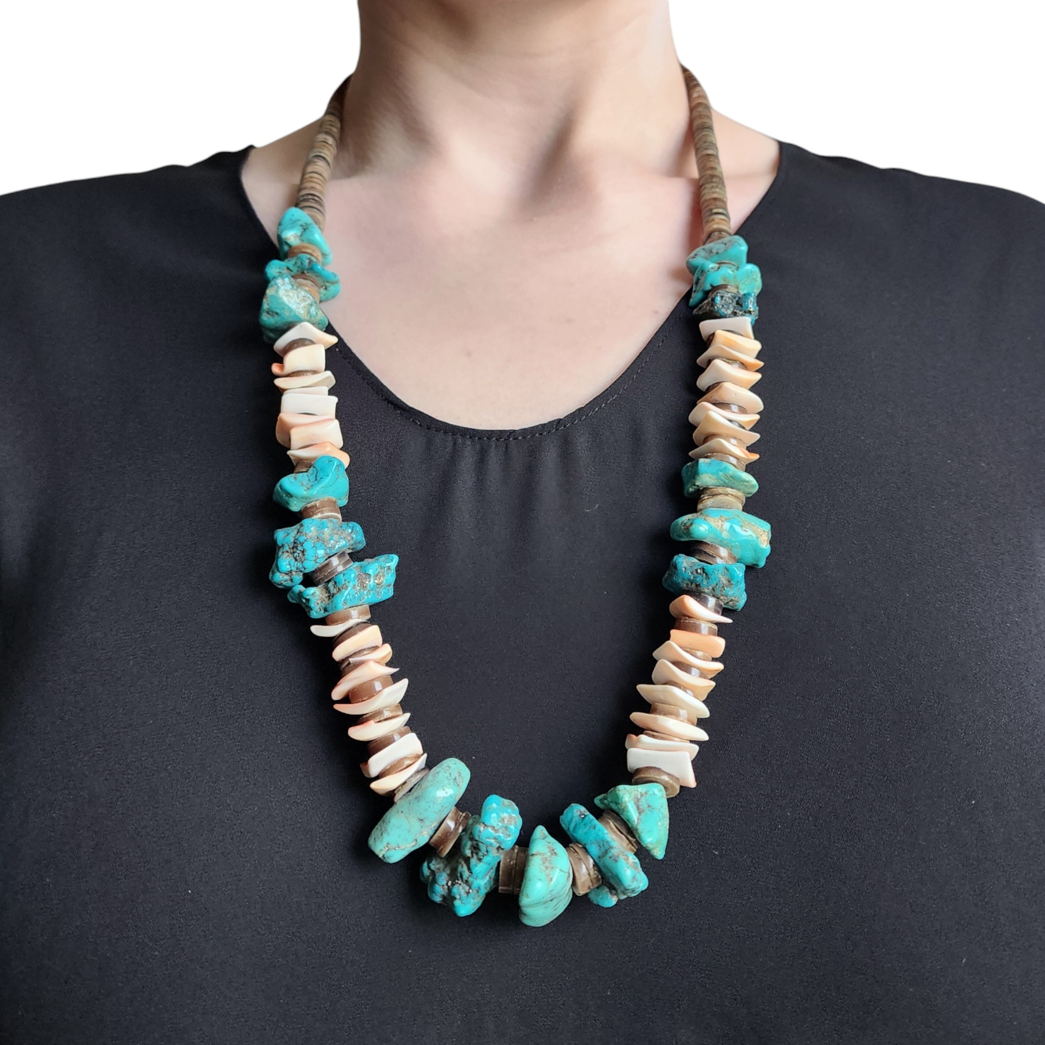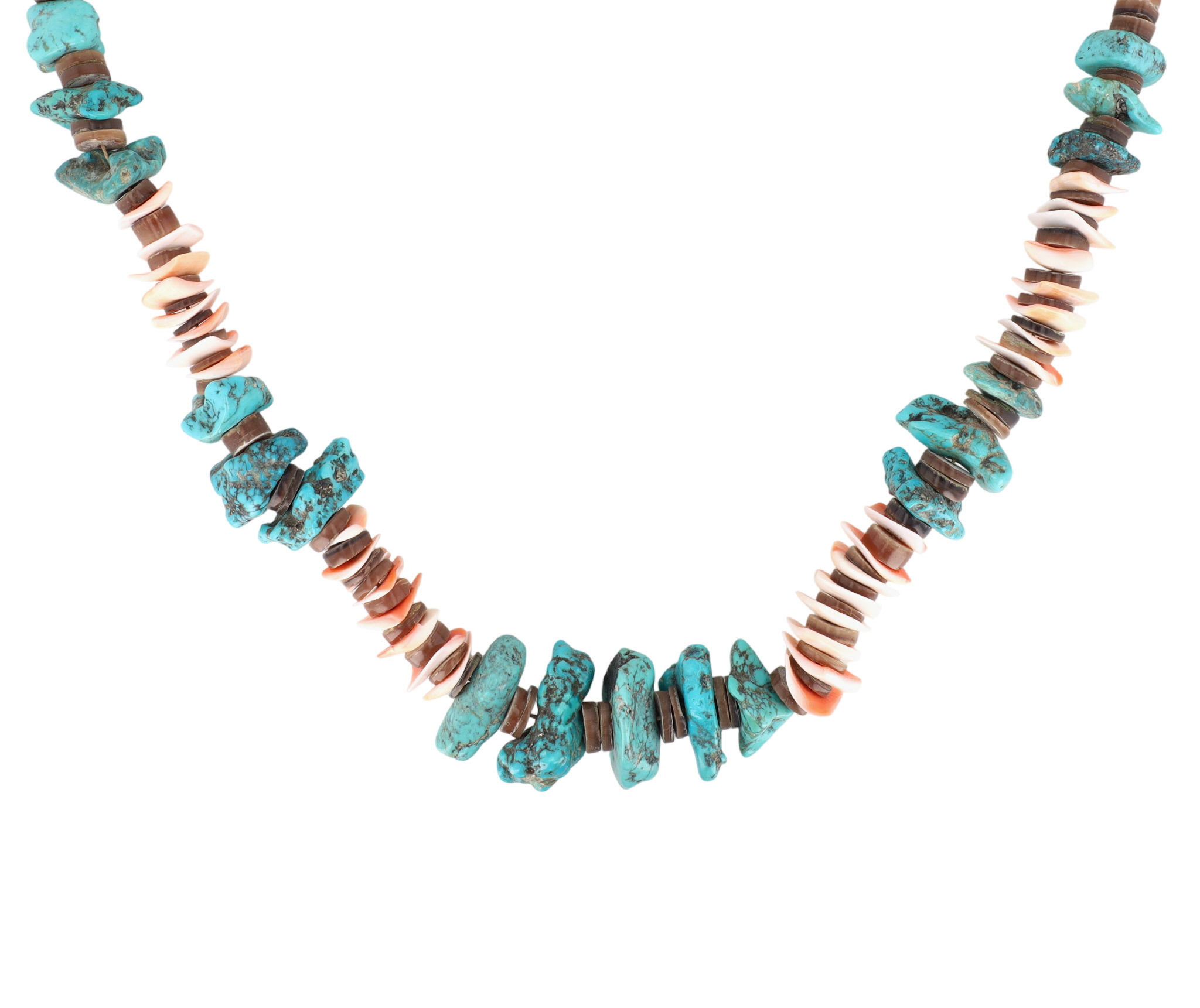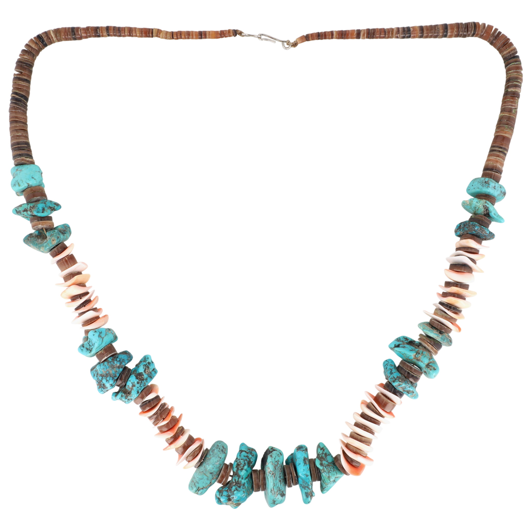 Vintage Edward Coriz (attr., unsigned, artist per consignor report) Santo Domingo Kewa Turquoise Chunk and Shell Heishi Necklace – 143g – approx 16.5″ – beautiful, unique design/combination of materials.
