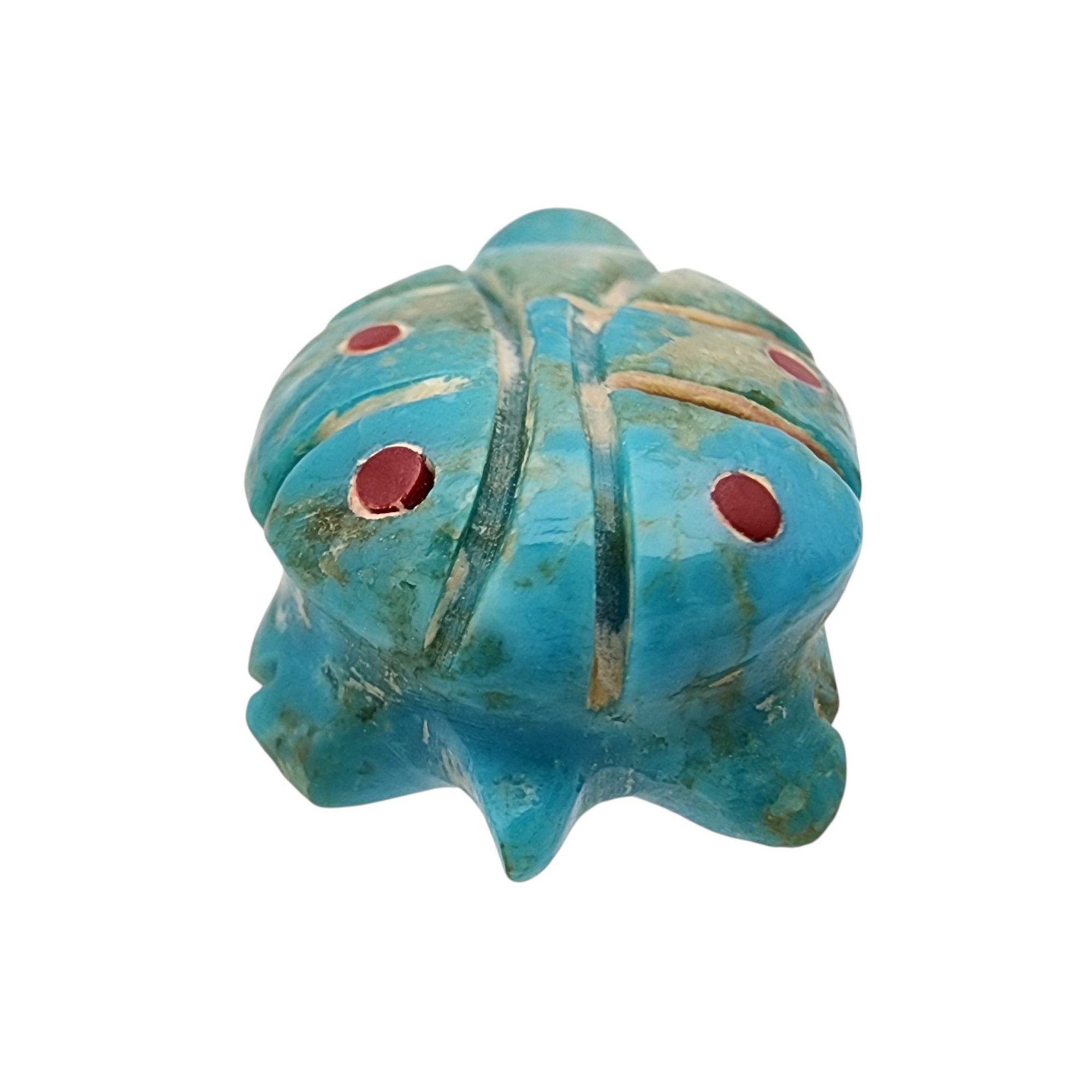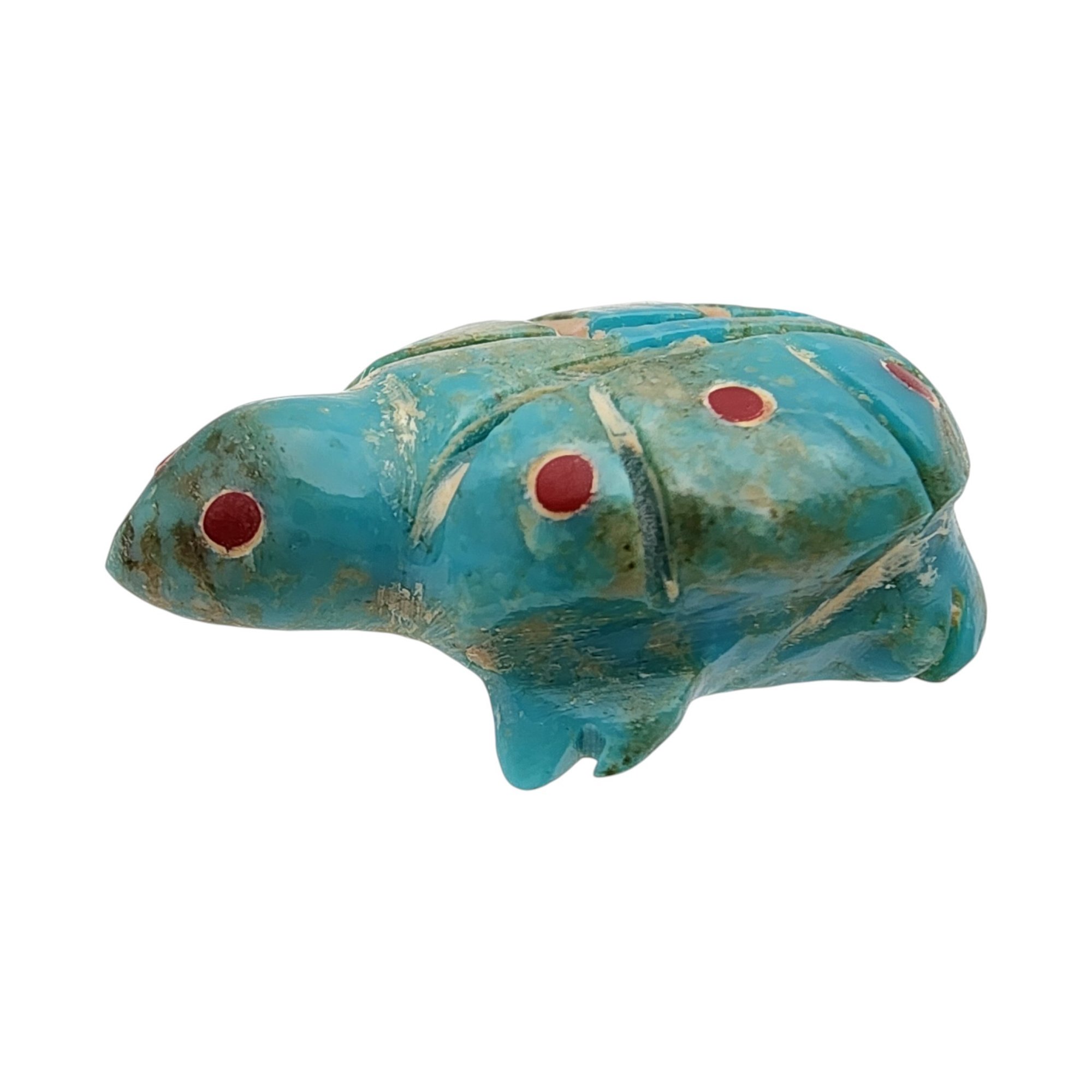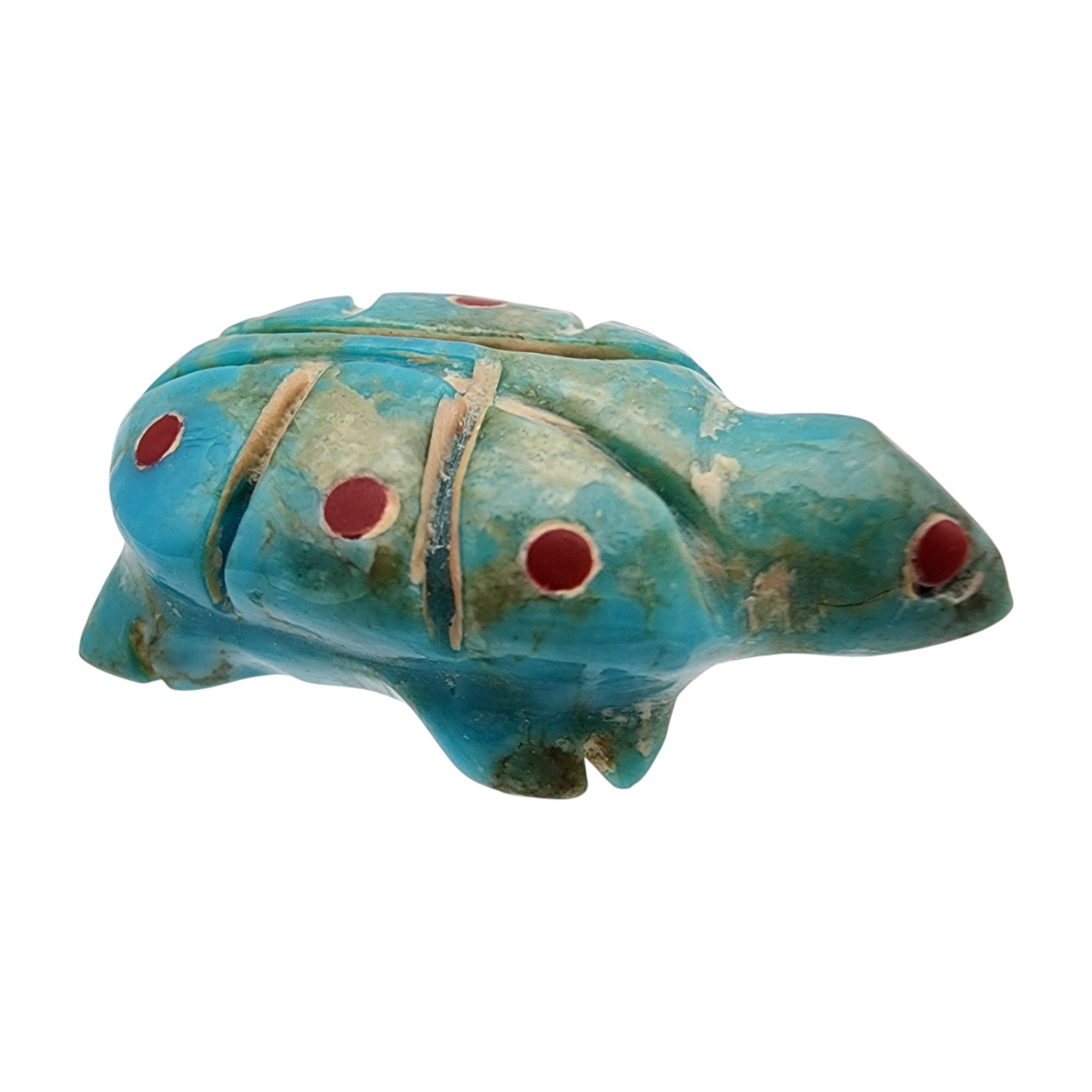Leroy Ukestine Zuni Turquoise and Inlaid Coral Turtle Fetish / Approximate Weight: 2.6g / Approximate measurements: .9″ x .5″ / Note 1: Purchased at Canyon Trading Post in 1994. Comes with copy of original receipt at time of purchase. / This item is part of an estate collection of Native American fetishes, pottery, baskets, and rugs acquired by a collector who traveled throughout the Southwest between the 1970s and early 2000s. Many pieces were purchased from trading posts in Arizona and New Mexico. Artist attributions are based on available documentation, including receipts, tags, stickers, and signatures where present. Select items include original or copied receipts and original tags identifying artists pricing at the time of purchase, primarily from the 1970s through the 1990s. Please review our non-jewelry shipping information and reach out with any questions prior to bidding. Thank you!
