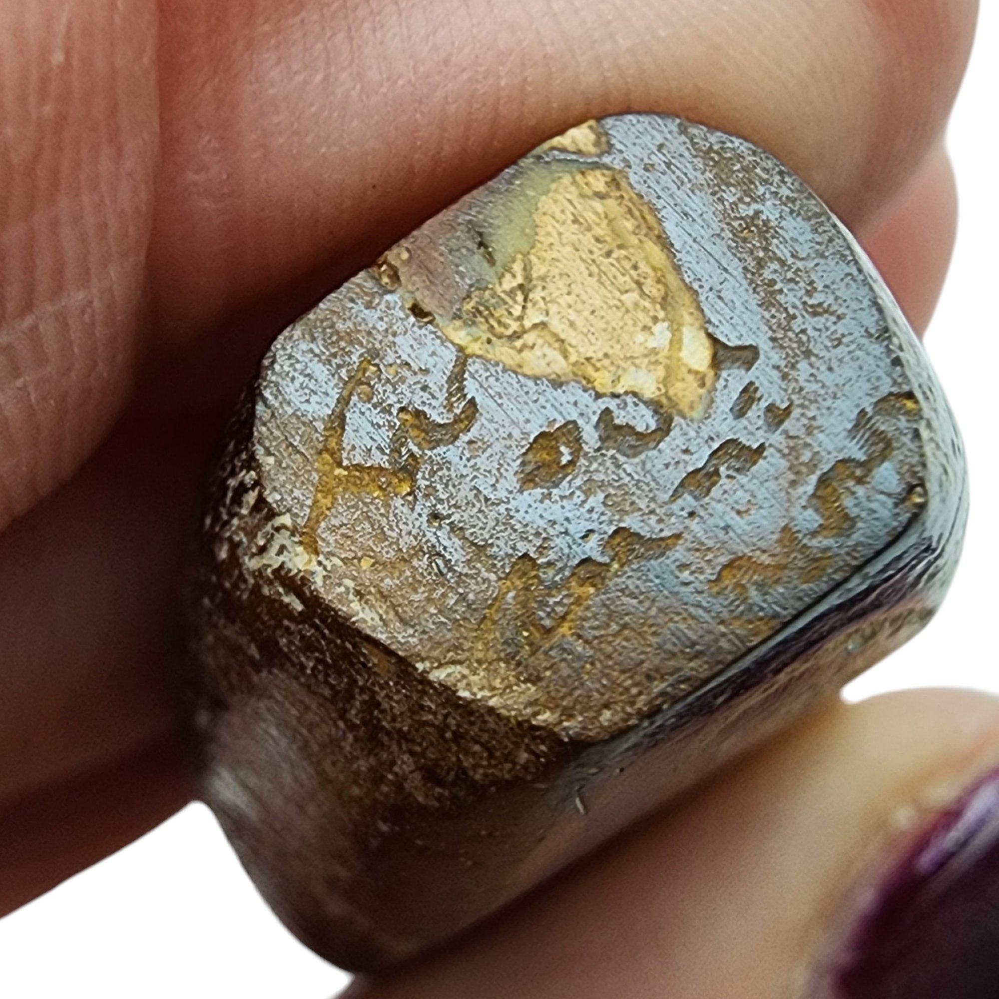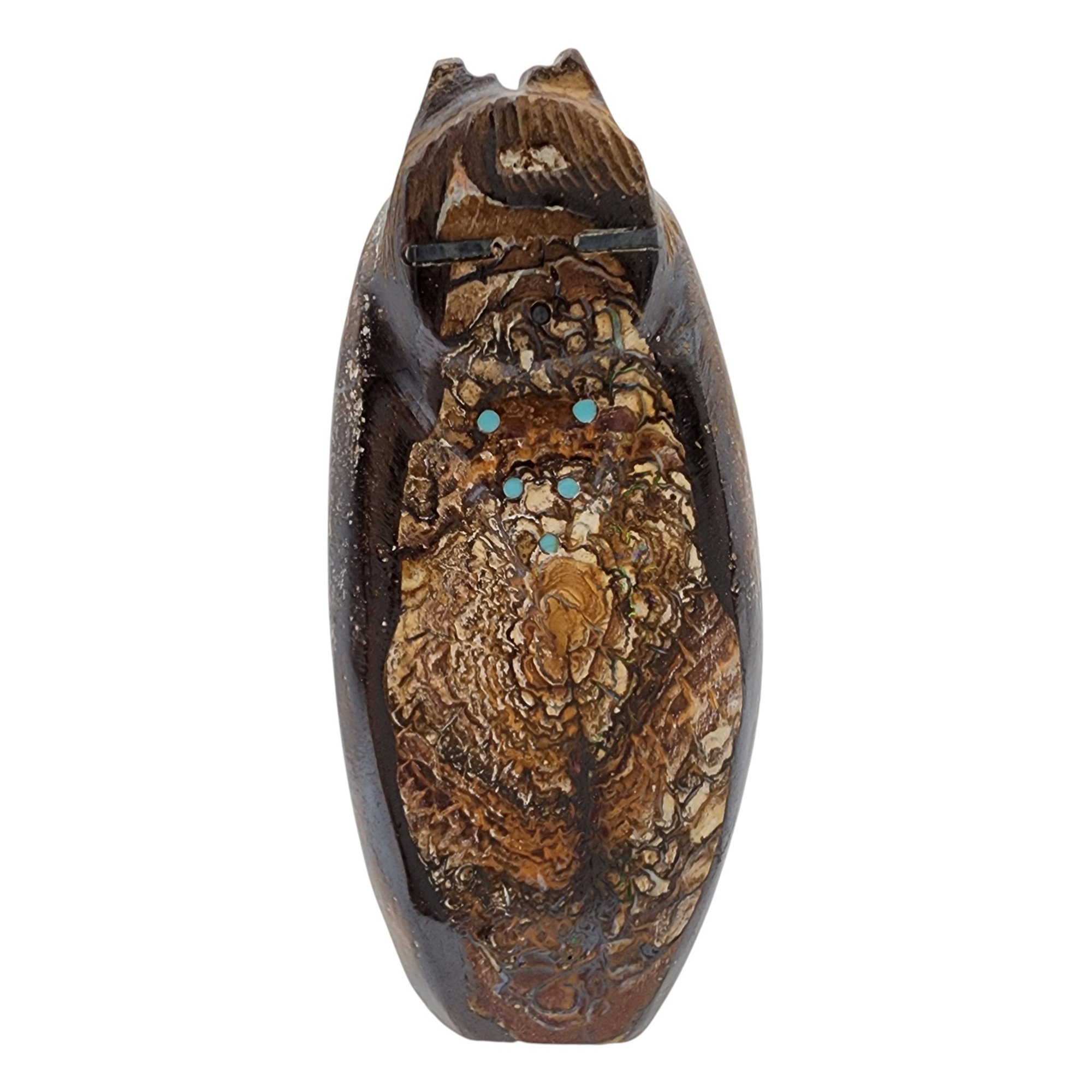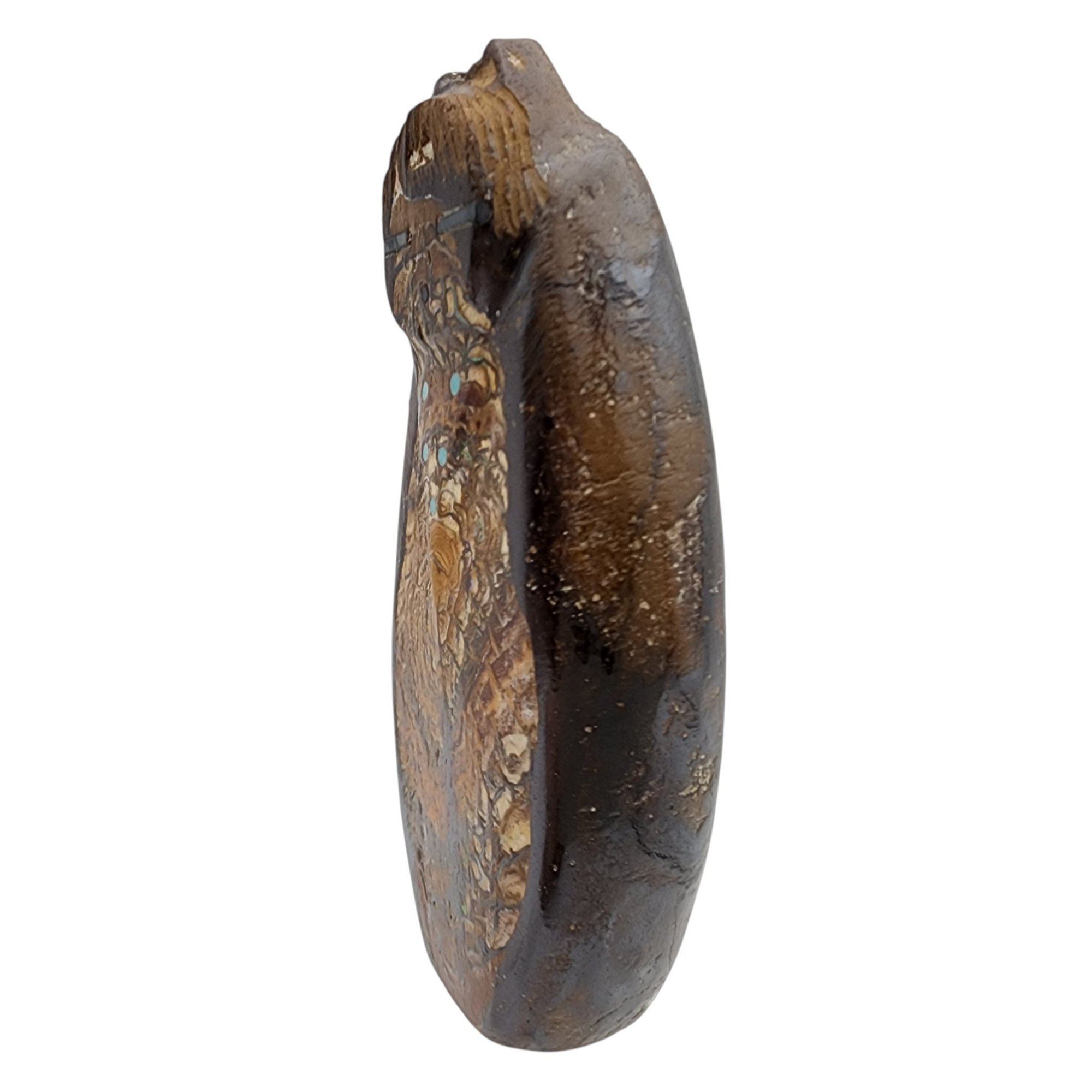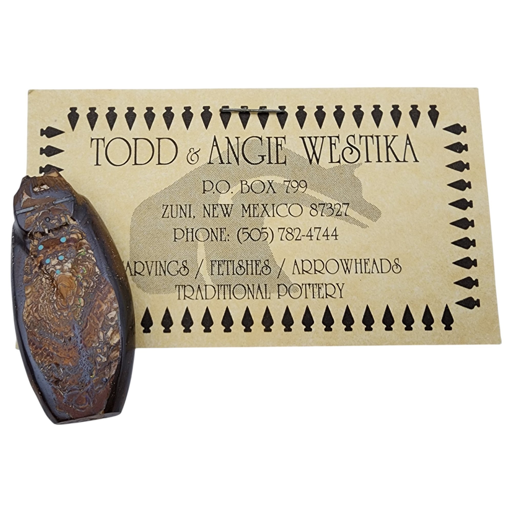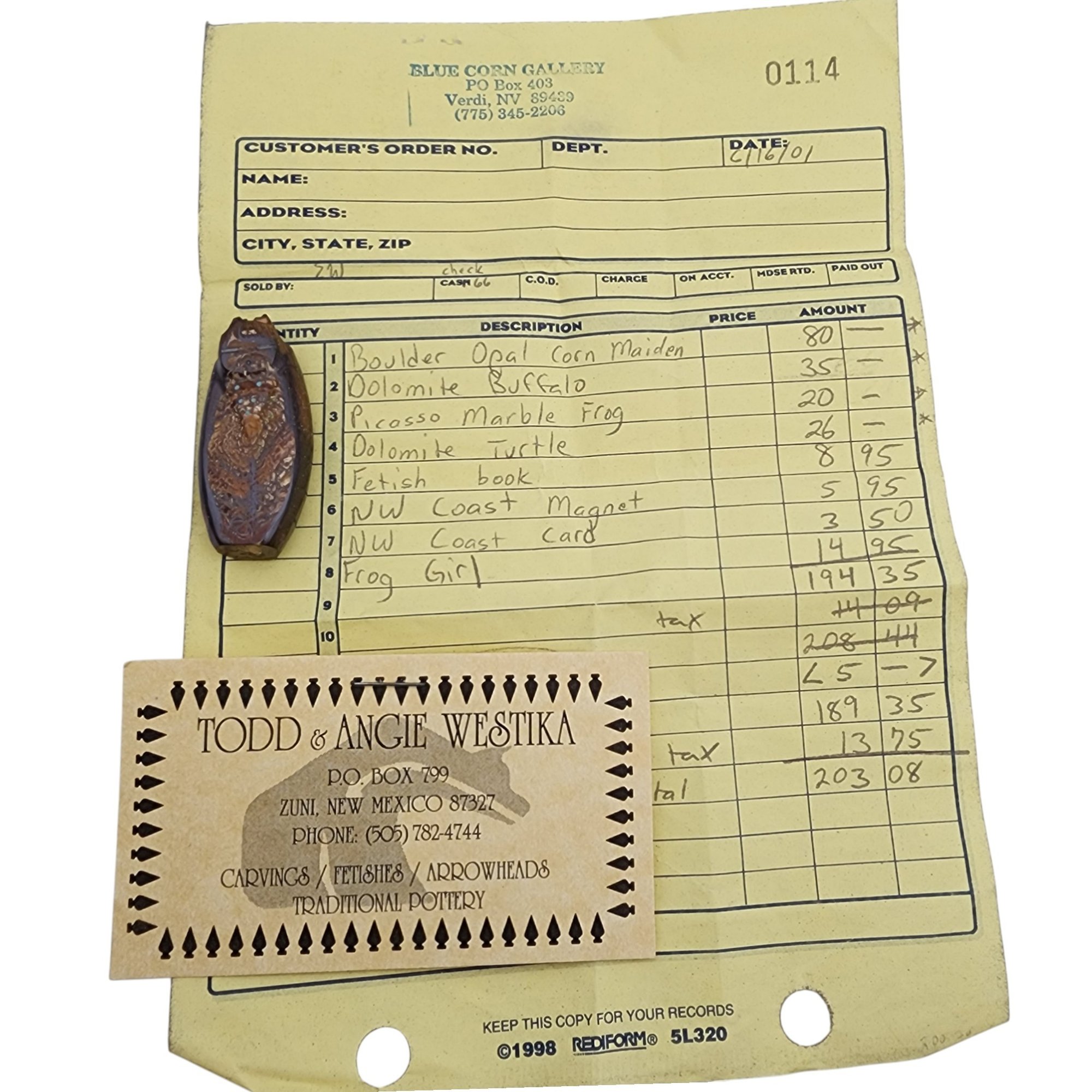 Todd & Angie Westika Zuni Boulder Opal Corn Maiden Fetish with Inlaid Turquoise Dots / Approximate Weight: 16g / Approximate measurements: 1.8″ x .8″ / Note 1: Purchased at Blue Corn Galley in 2001. Comes with original receipt at time of purchase and artist info business card from time of purchase. / This item is part of an estate collection of Native American fetishes, pottery, baskets, and rugs acquired by a collector who traveled throughout the Southwest between the 1970s and early 2000s. Many pieces were purchased from trading posts in Arizona and New Mexico. Artist attributions are based on available documentation, including receipts, tags, stickers, and signatures where present. Select items include original or copied receipts and original tags identifying artists pricing at the time of purchase, primarily from the 1970s through the 1990s. Please review our non-jewelry shipping information and reach out with any questions prior to bidding. Thank you!