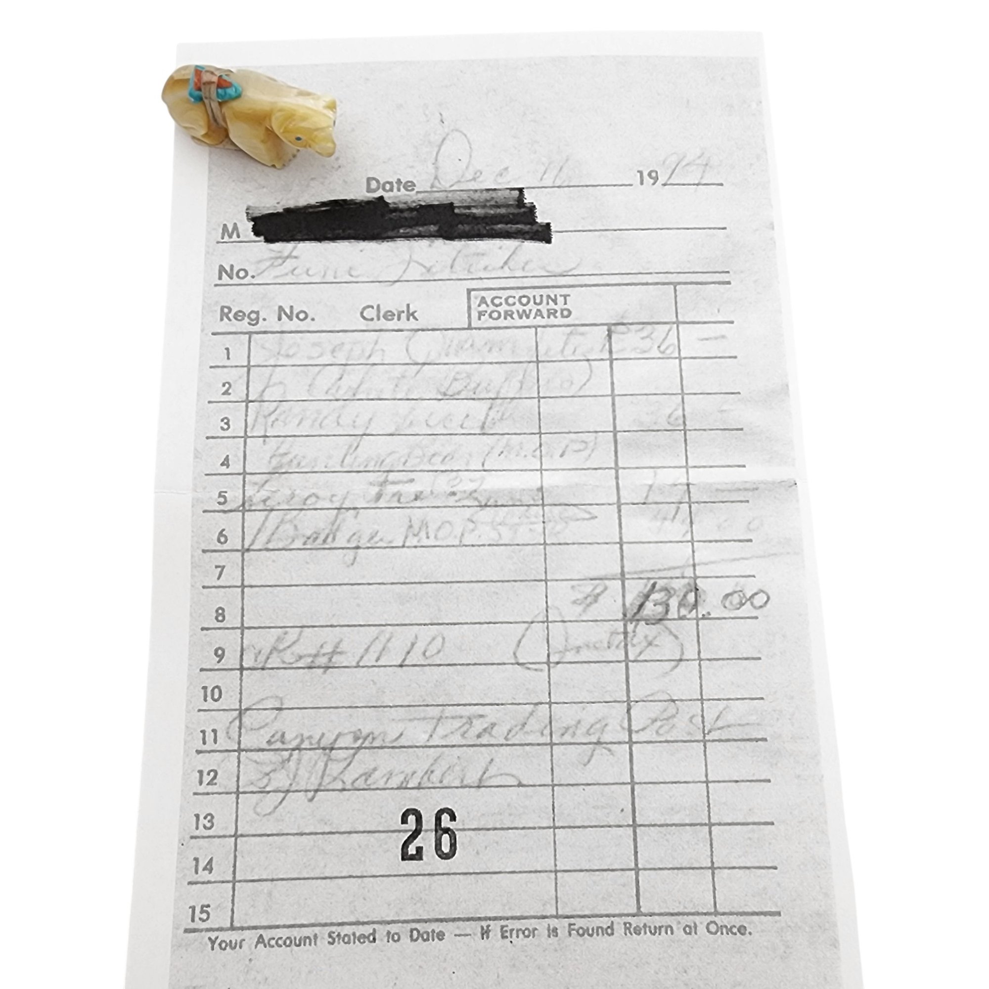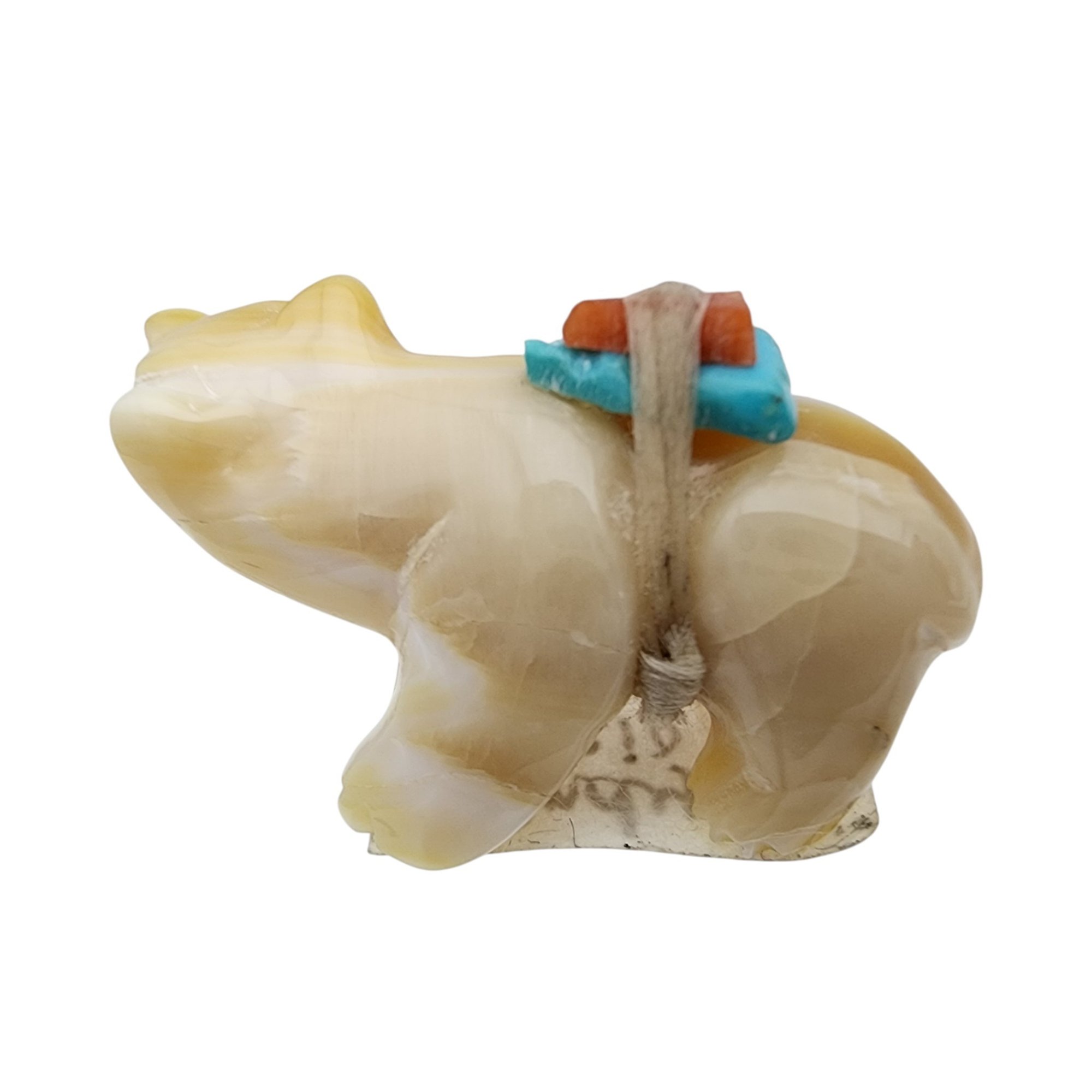 Randy Lucio Zuni Mother of Pearl, Turquoise, and Coral Offering Bear Fetish / Approximate Weight: 5g / Approximate measurements: 1.1″ x .5″ x .6″ / Note 1: Comes with copy of the original receipt and the artist/price sticker from time of purchase. This item is part of an estate collection of Native American fetishes, pottery, baskets, and rugs acquired by a collector who traveled throughout the Southwest between the 1970s and early 2000s. Many pieces were purchased from trading posts in Arizona and New Mexico. Artist attributions are based on available documentation, including receipts, tags, stickers, and signatures where present. Select items include original or copied receipts and original tags identifying artists pricing at the time of purchase, primarily from the 1970s through the 1990s. Please review our non-jewelry shipping information and reach out with any questions prior to bidding. Thank you!