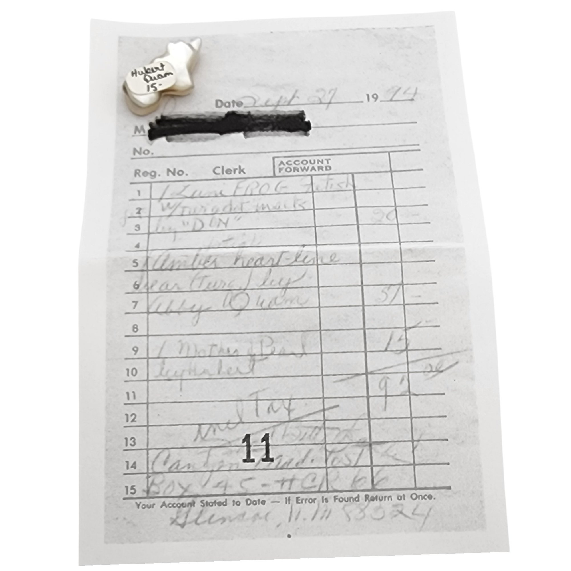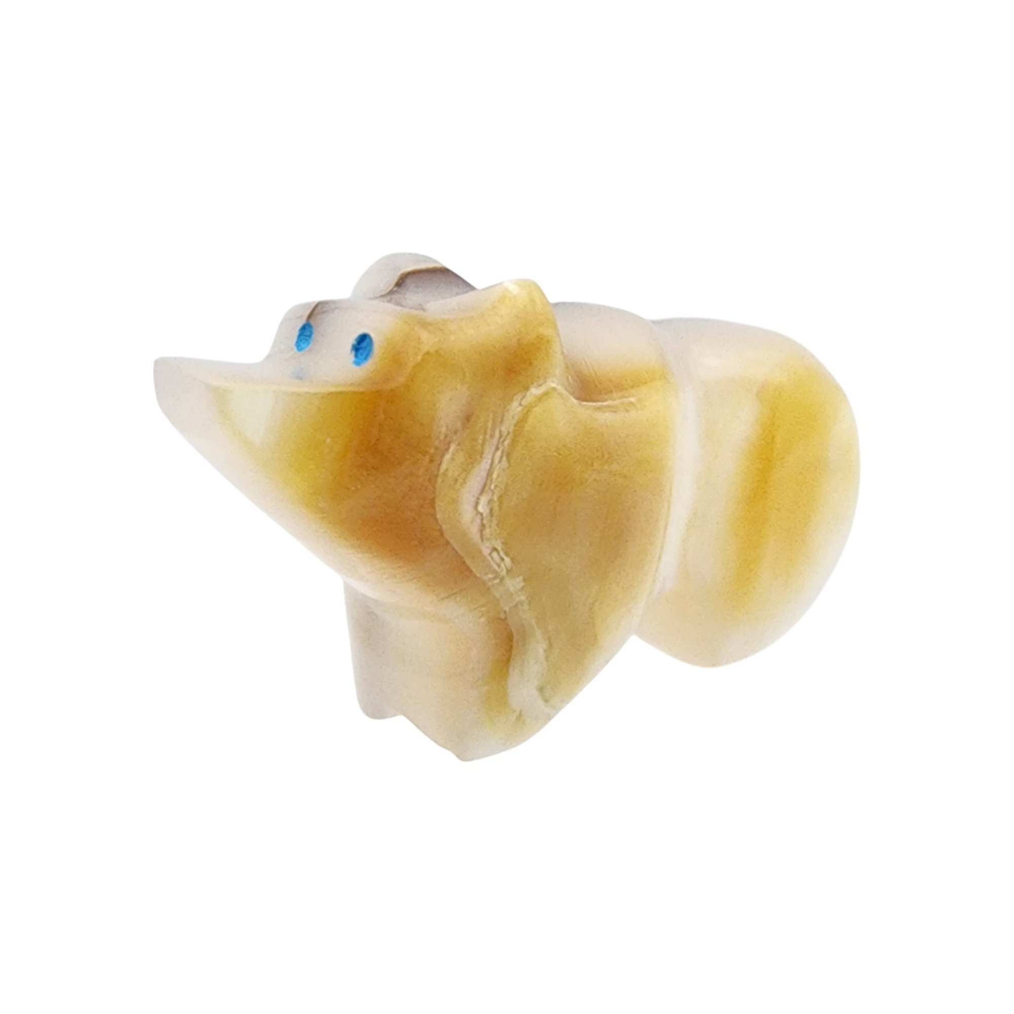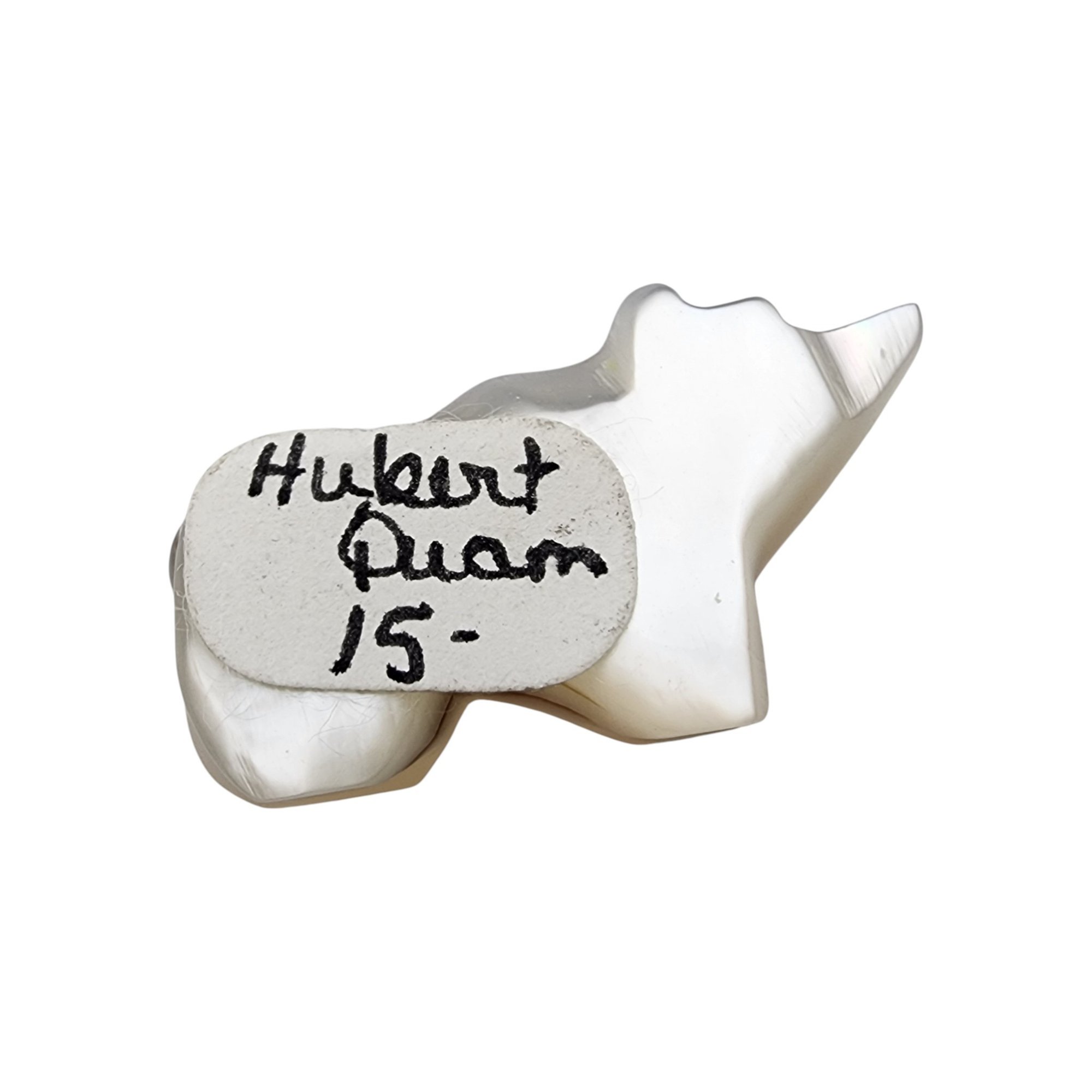 Hubert Quam Zuni Mother of Pearl and Inlaid Turquoise Bear Fetish / Approximate Weight: 3.6g / Approximate measurements: 1″ x .3″ x .5″ / Note 1: Purchased at Canyon Trading Post in 1996. Comes with copy of original receipt and original artist/price sticker at time of purchase. / This item is part of an estate collection of Native American fetishes, pottery, baskets, and rugs acquired by a collector who traveled throughout the Southwest between the 1970s and early 2000s. Many pieces were purchased from trading posts in Arizona and New Mexico. Artist attributions are based on available documentation, including receipts, tags, stickers, and signatures where present. Select items include original or copied receipts and original tags identifying artists pricing at the time of purchase, primarily from the 1970s through the 1990s. Please review our non-jewelry shipping information and reach out with any questions prior to bidding. Thank you!