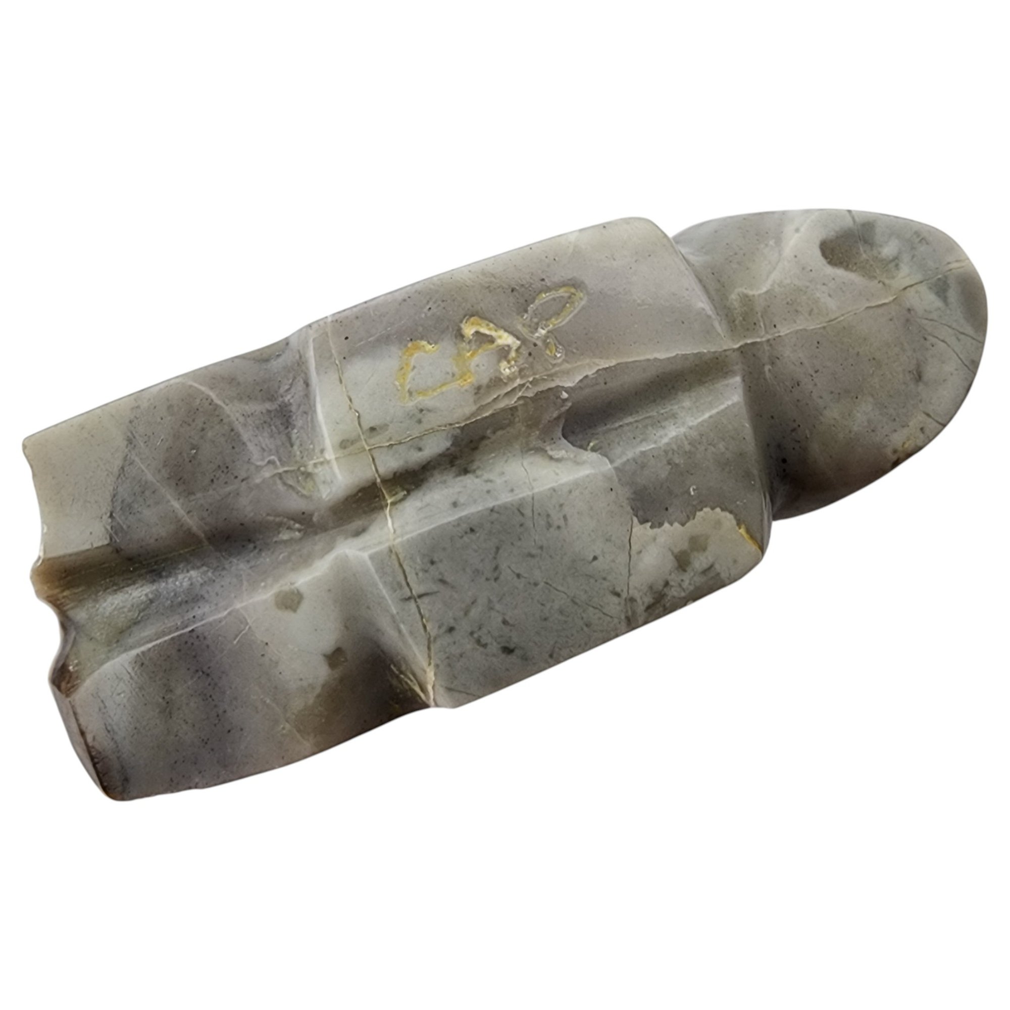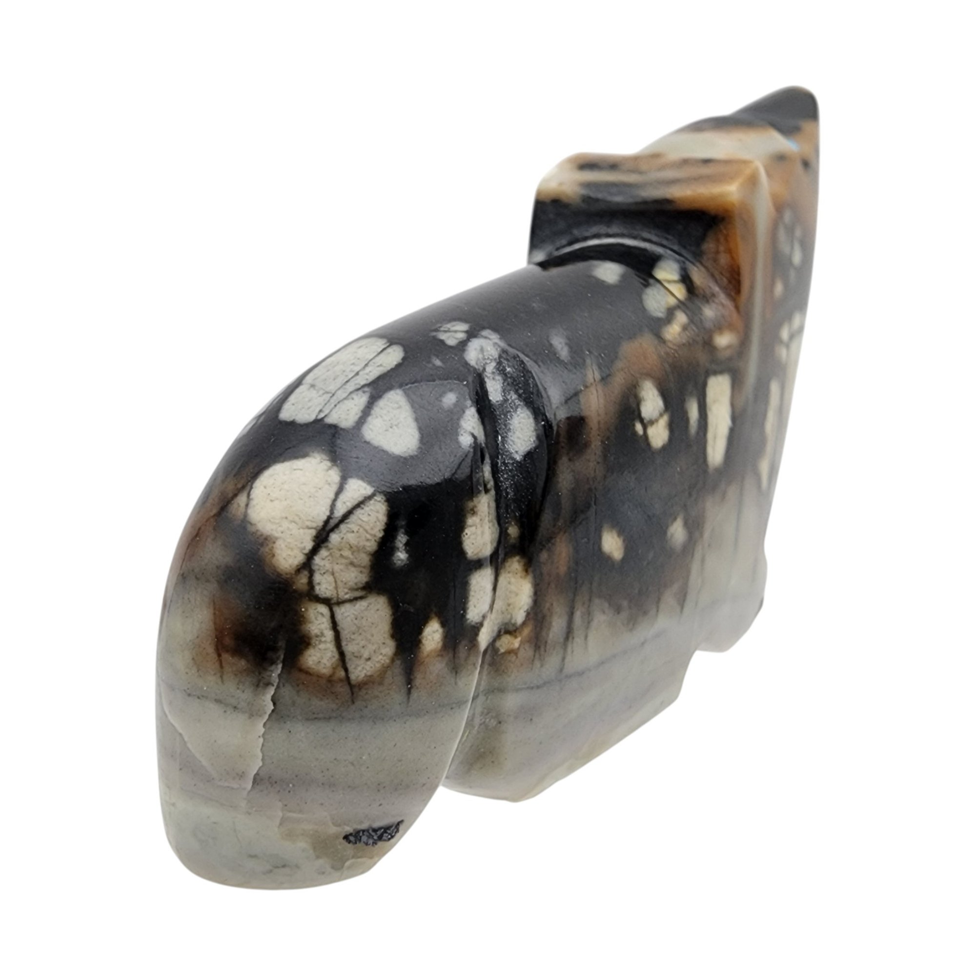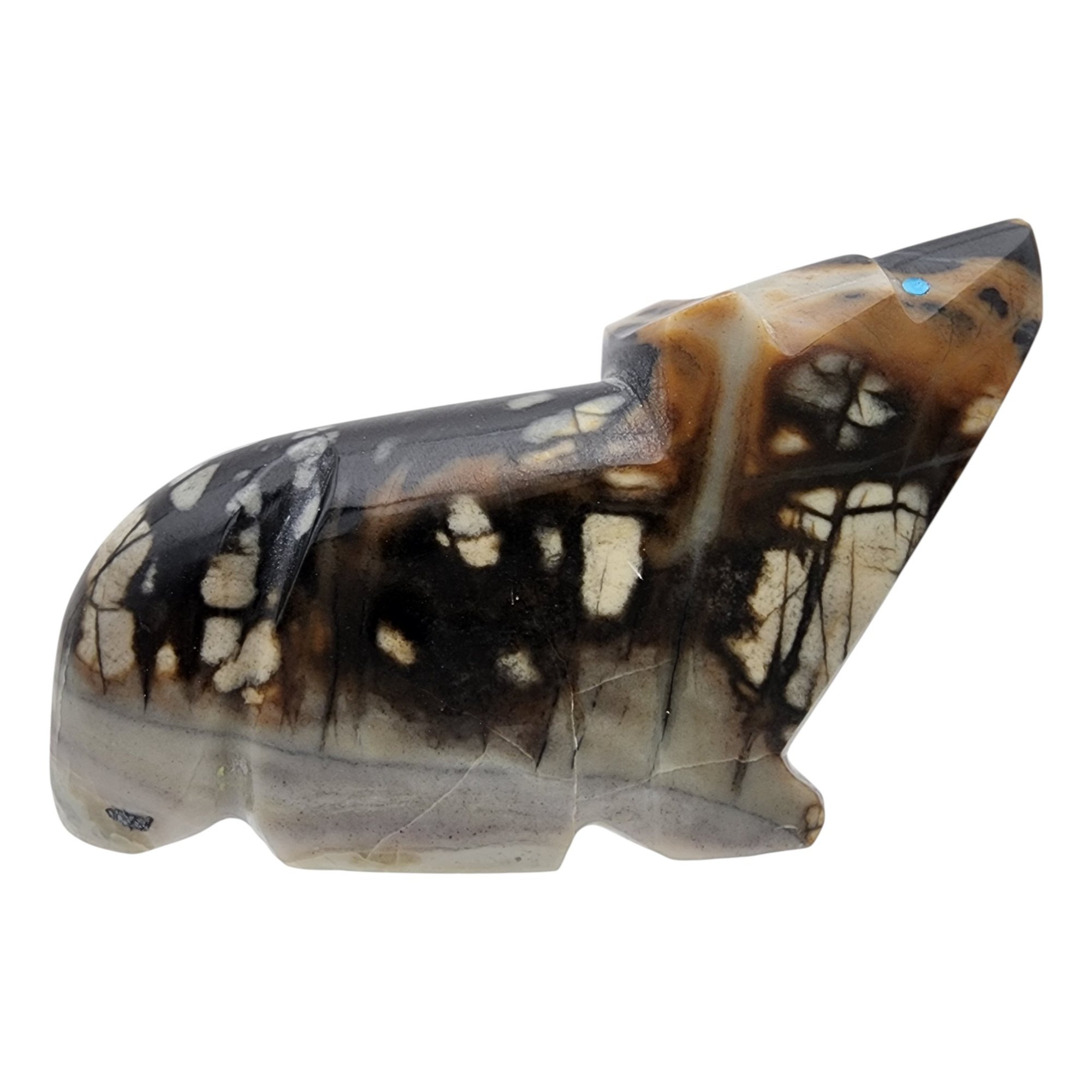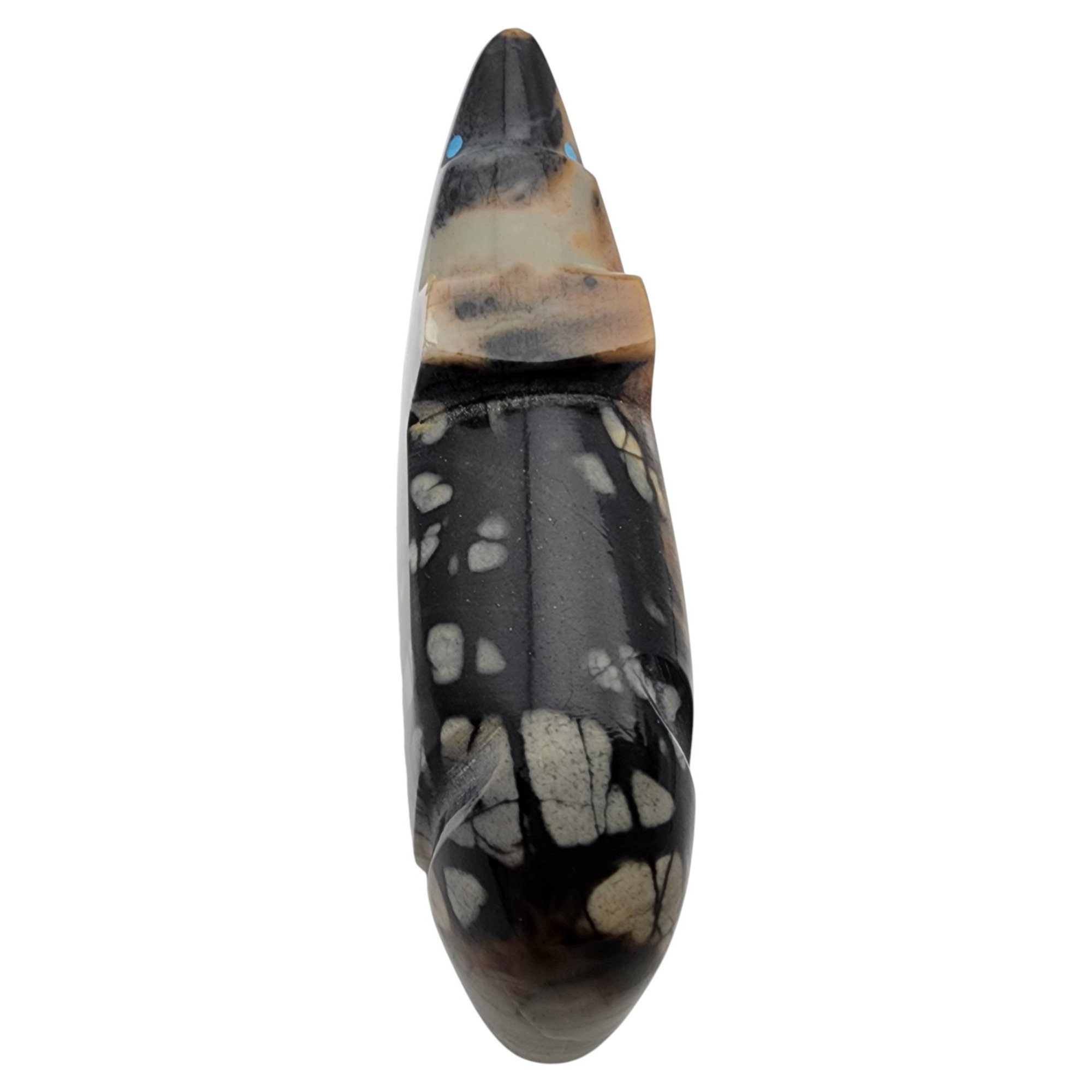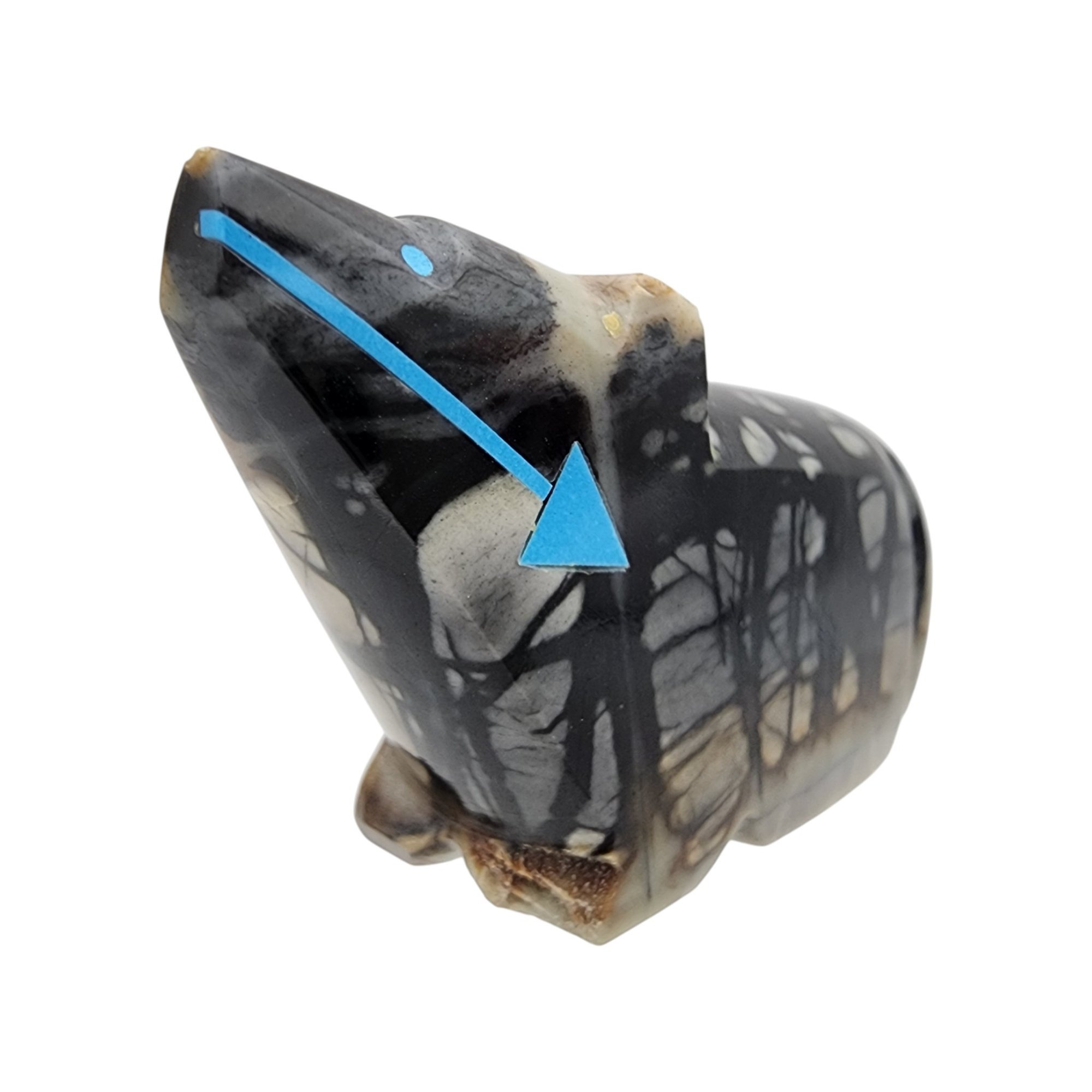 Clayton & Abby (Quam) Panteah Zuni Picasso Marble and Inlaid Turquoise Heartline Bear Fetish / Approximate Weight: 27g / Approximate measurements: 2.1″x .6″ x .1.2″ / Note 1: Signed CAP on foot. Comes with copy of the original receipt from time of purchase. / This item is part of an estate collection of Native American fetishes, pottery, baskets, and rugs acquired by a collector who traveled throughout the Southwest between the 1970s and early 2000s. Many pieces were purchased from trading posts in Arizona and New Mexico. Artist attributions are based on available documentation, including receipts, tags, stickers, and signatures where present. Select items include original or copied receipts and original tags identifying artists pricing at the time of purchase, primarily from the 1970s through the 1990s. Please review our non-jewelry shipping information and reach out with any questions prior to bidding. Thank you!