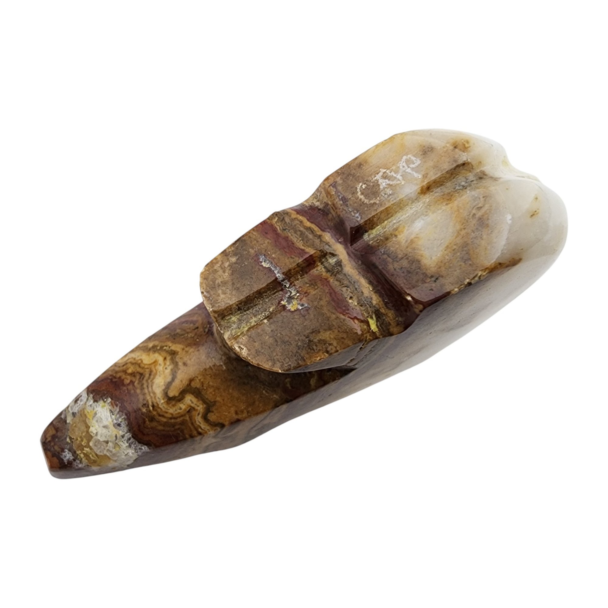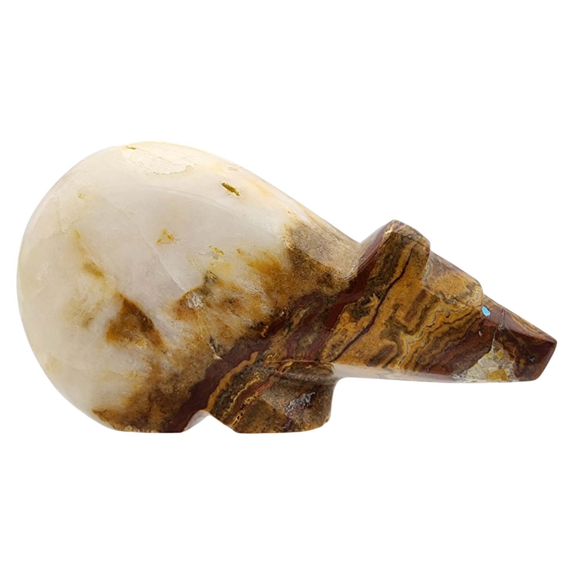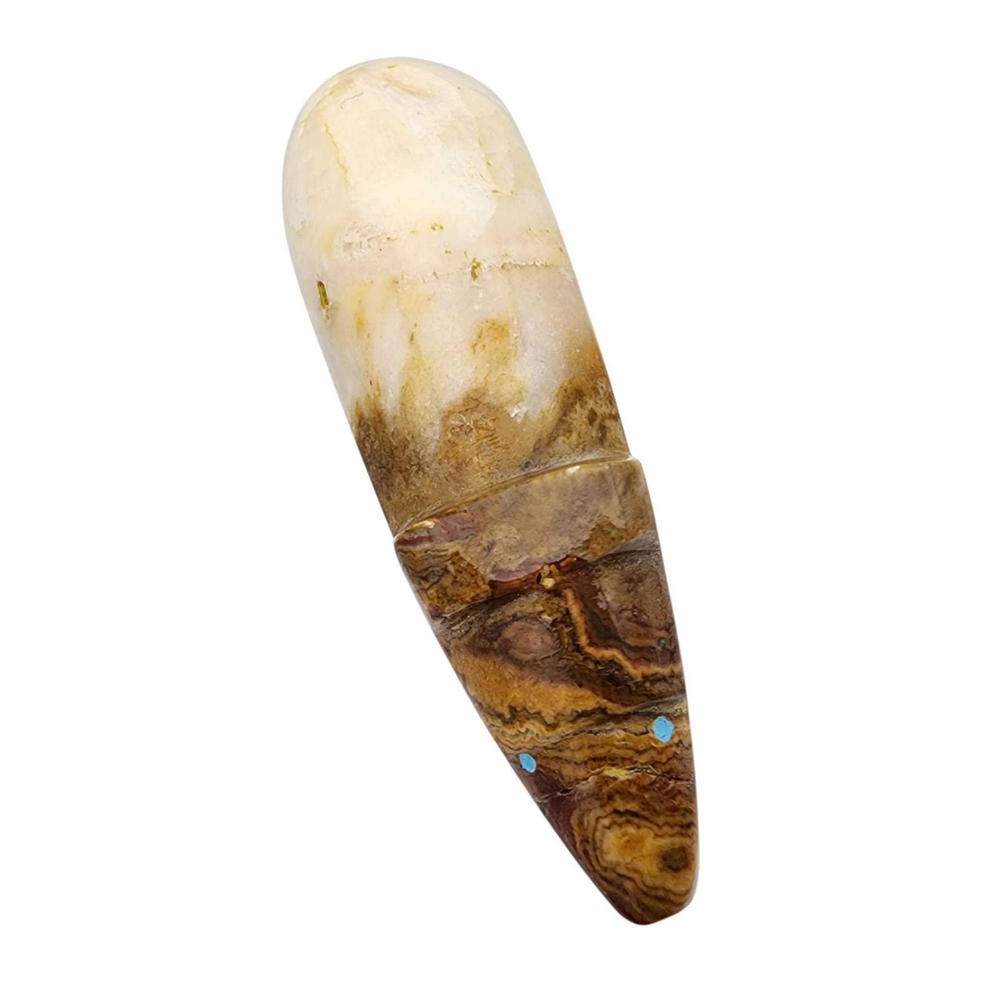 Clayton & Abby (Quam) Panteah Zuni Banded Onyx and Inlaid Turquoise Heartline Bear Fetish / Approximate Weight: 40g / Approximate measurements: 2.25″ x .62″ x .1.2″ / Note 1: Signed CAP on foot / Note 2: Break in stone on the back of the bear / This item is part of an estate collection of Native American fetishes, pottery, baskets, and rugs acquired by a collector who traveled throughout the Southwest between the 1970s and early 2000s. Many pieces were purchased from trading posts in Arizona and New Mexico. Artist attributions are based on available documentation, including receipts, tags, stickers, and signatures where present. Select items include original or copied receipts and original tags identifying artists pricing at the time of purchase, primarily from the 1970s through the 1990s. Please review our non-jewelry shipping information and reach out with any questions prior to bidding. Thank you!