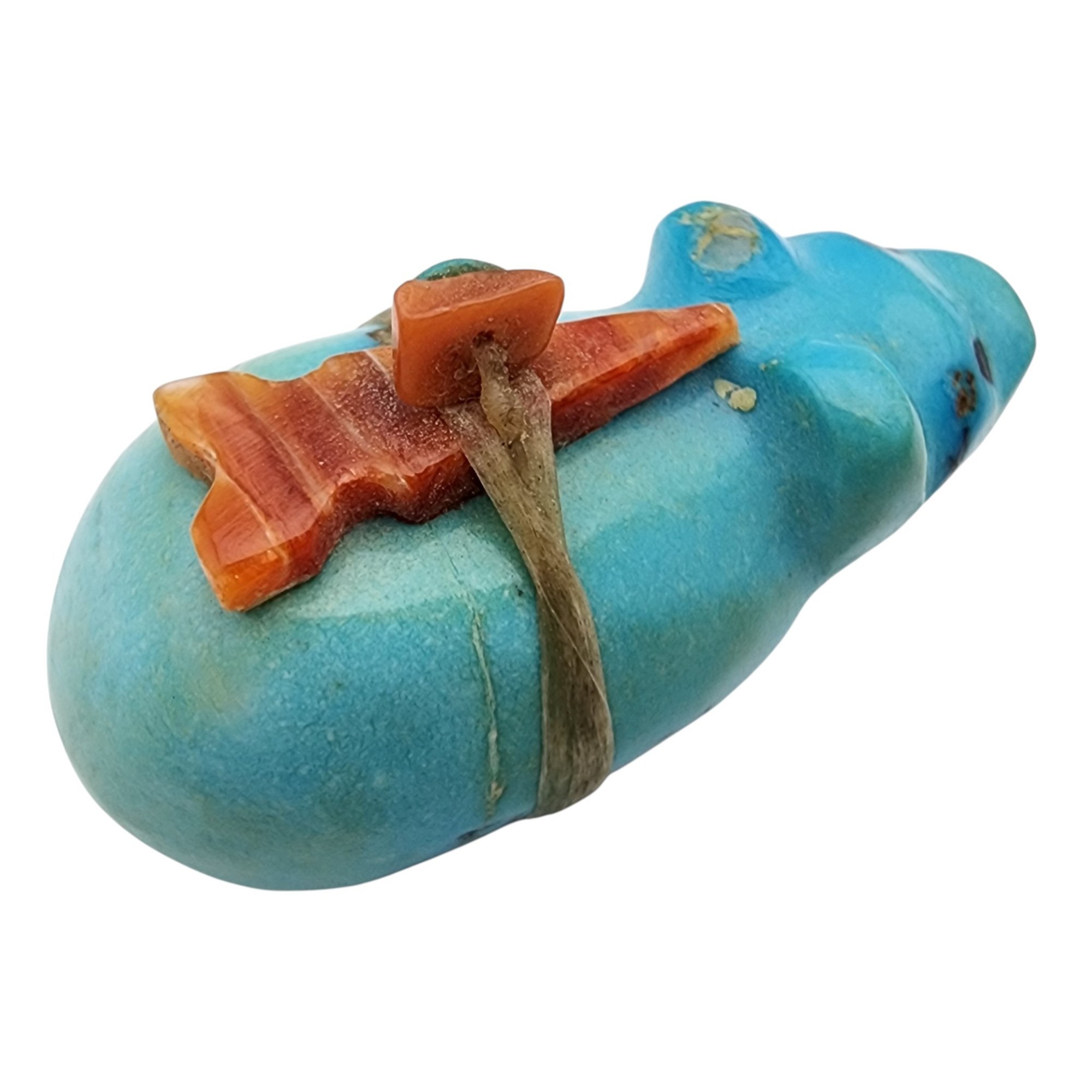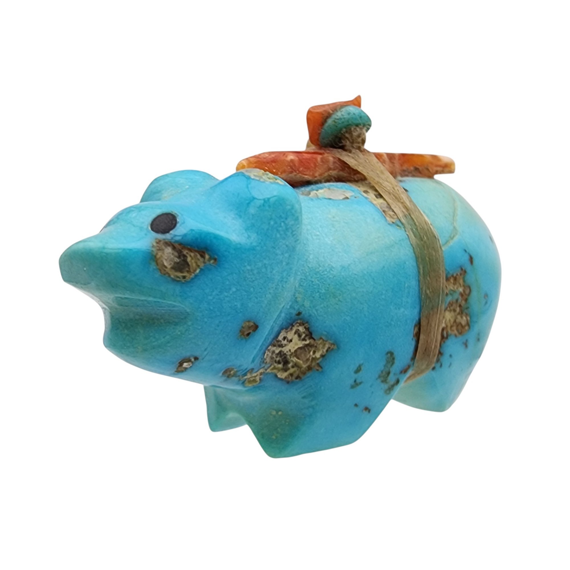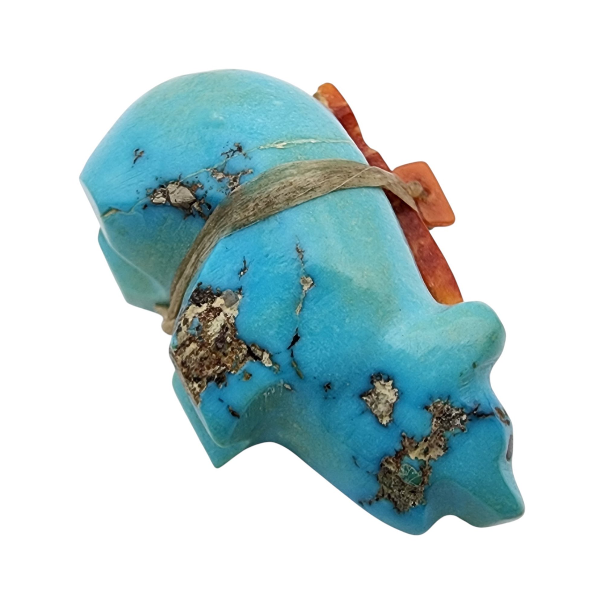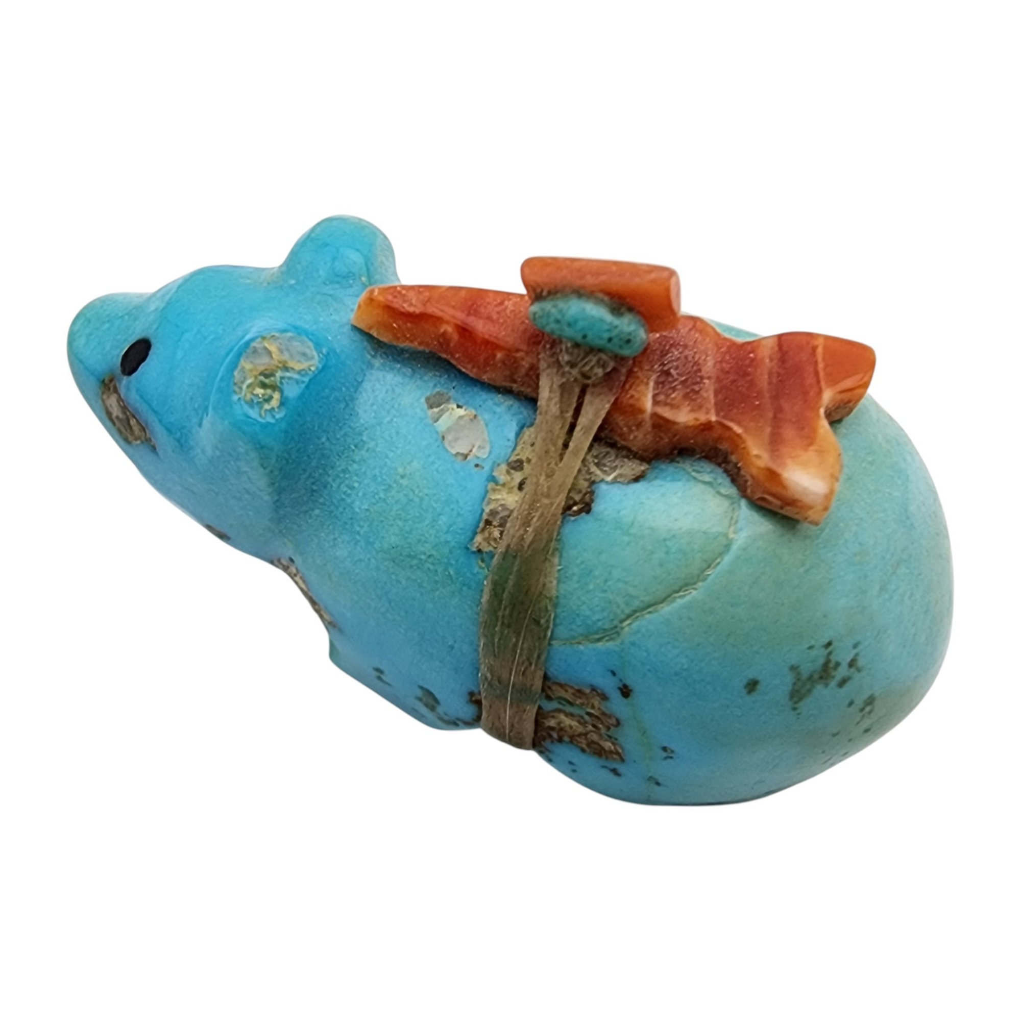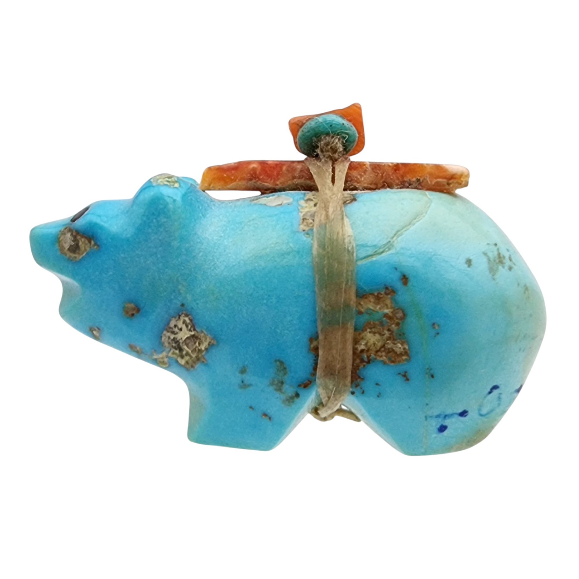 Native American Turquoise and Coral Offering Bear Fetish / Approximate Weight: 11g / Approximate measurements: 1.25″ x .6″ x .7″ / This item is part of an estate collection of Native American fetishes, pottery, baskets, and rugs acquired by a collector who traveled throughout the Southwest between the 1970s and early 2000s. Many pieces were purchased from trading posts in Arizona and New Mexico. Artist attributions are based on available documentation, including receipts, tags, stickers, and signatures where present. Select items include original or copied receipts and original tags identifying artists pricing at the time of purchase, primarily from the 1970s through the 1990s. Please review our non-jewelry shipping information and reach out with any questions prior to bidding. Thank you!
